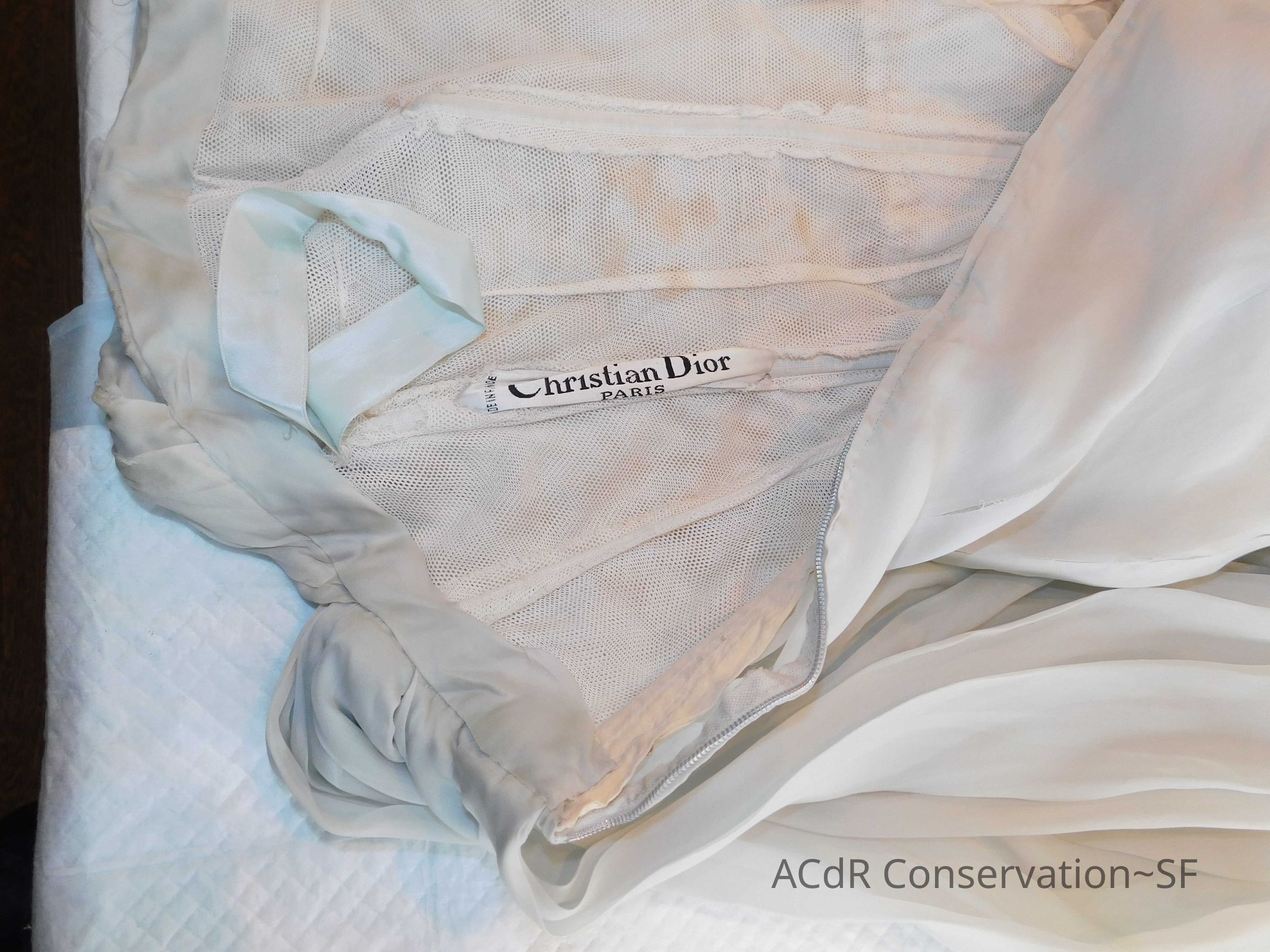 Staining drips throughout inner and outer layers. Seams on front undone in sports with holes visible. Eye closure on back missing. 3 blue outer layers + 1 multi-layered lining. Planned wash and dye.