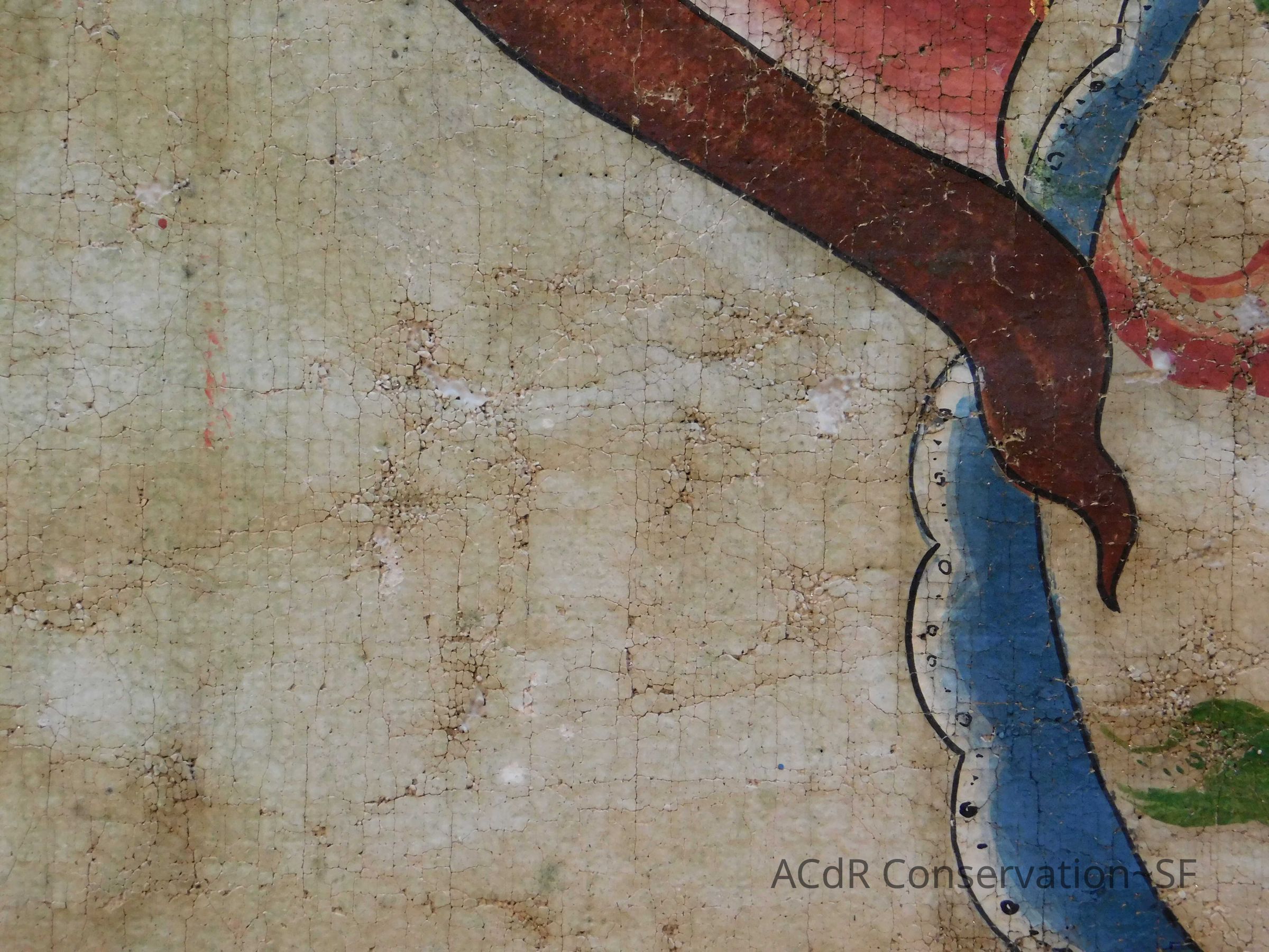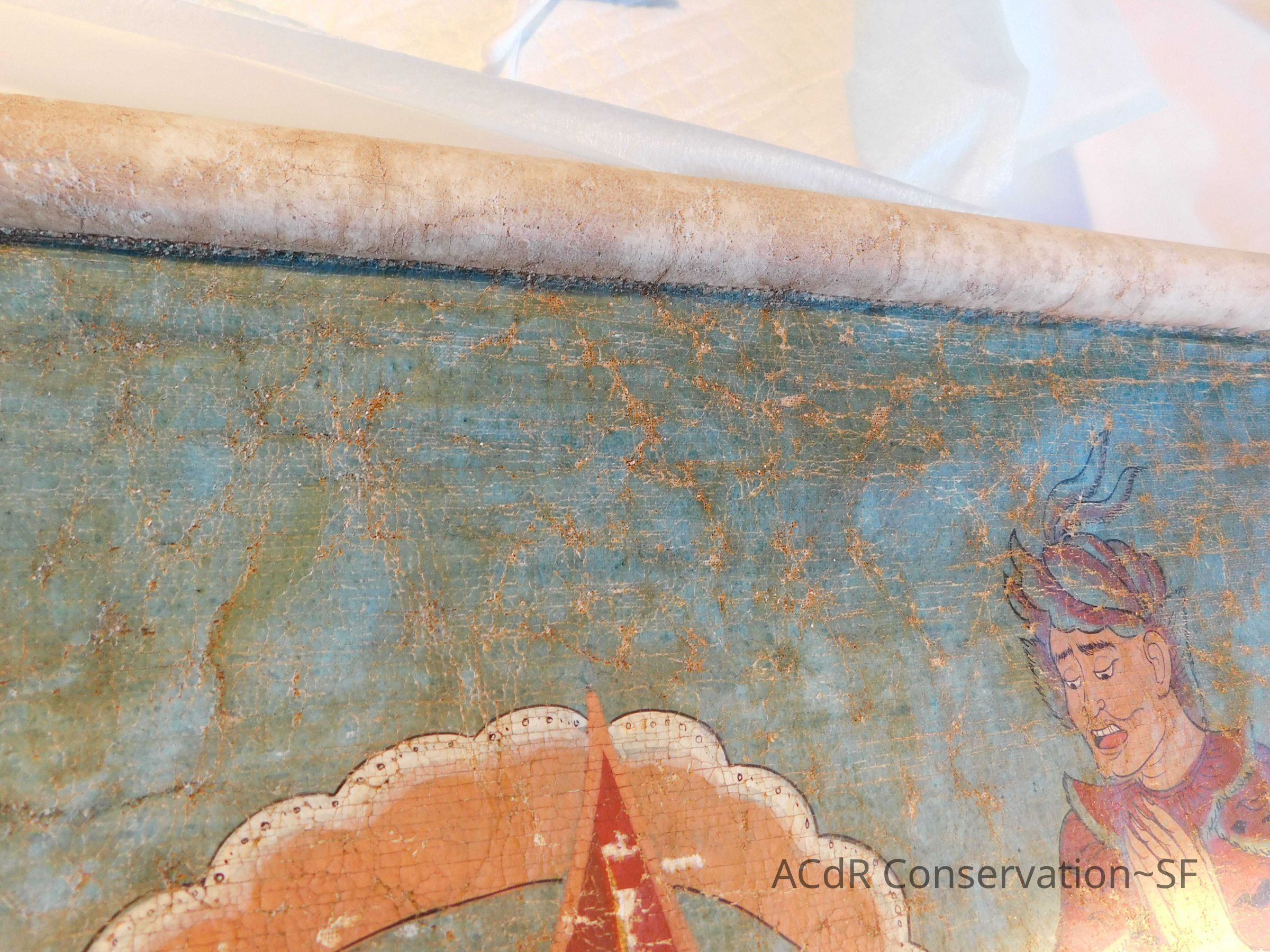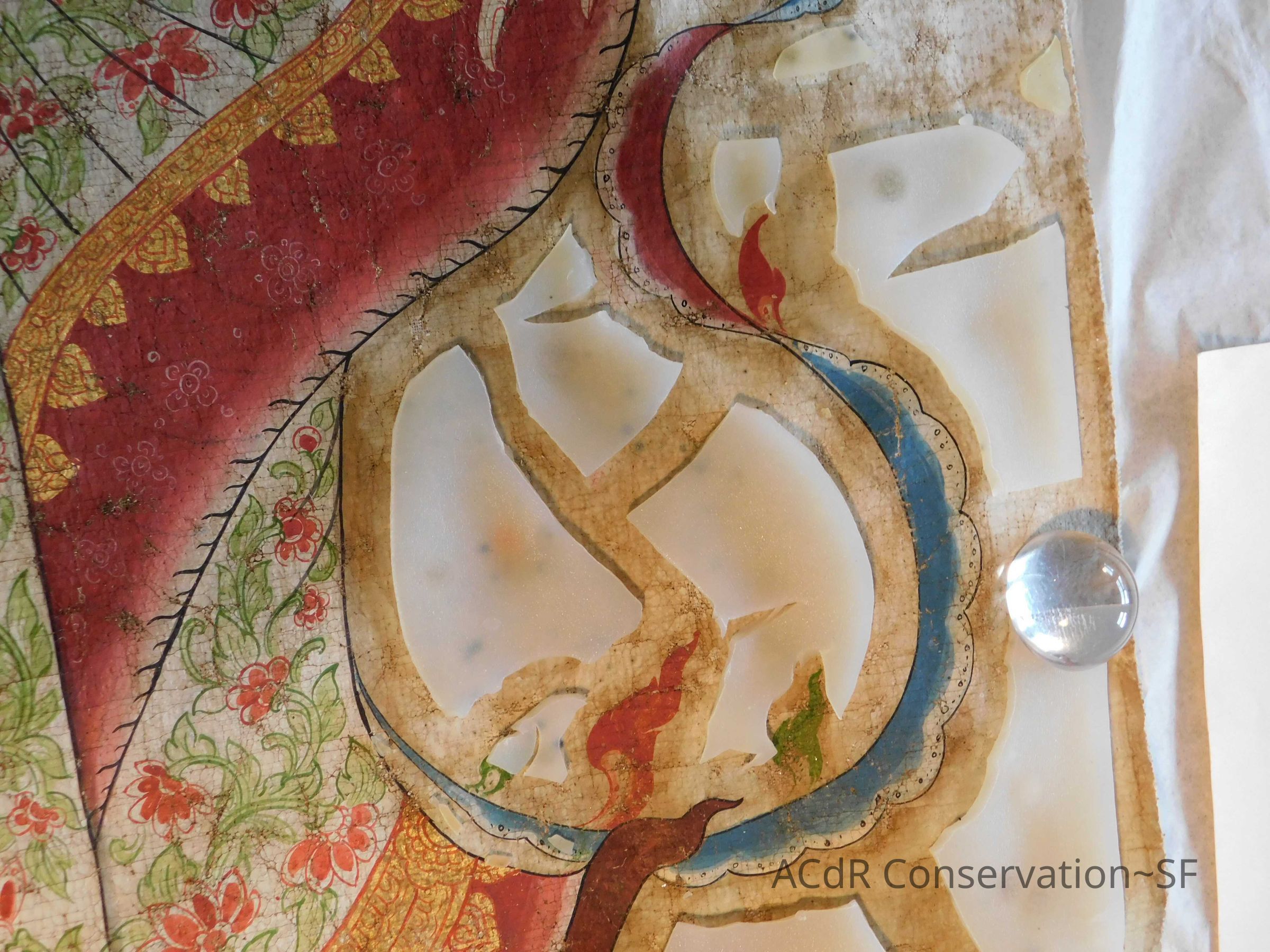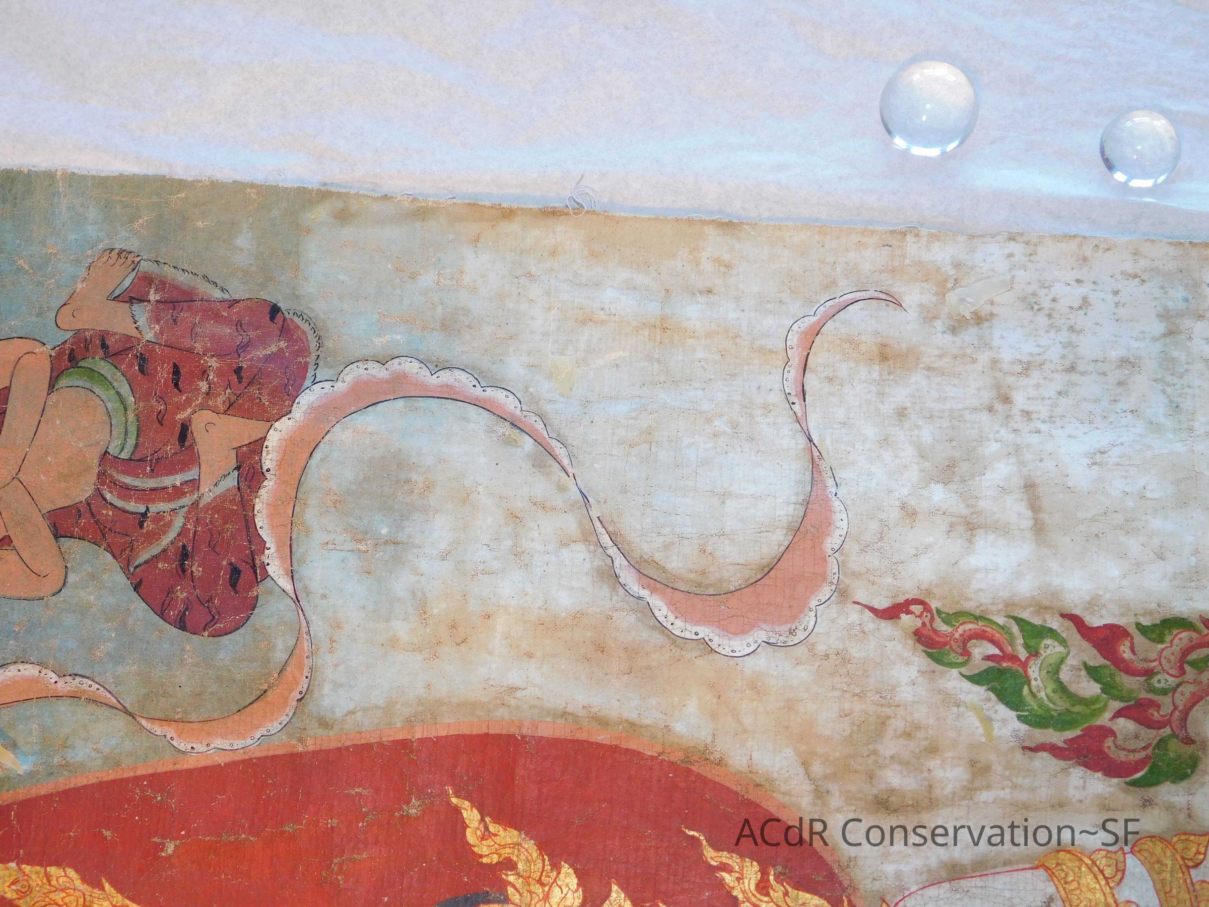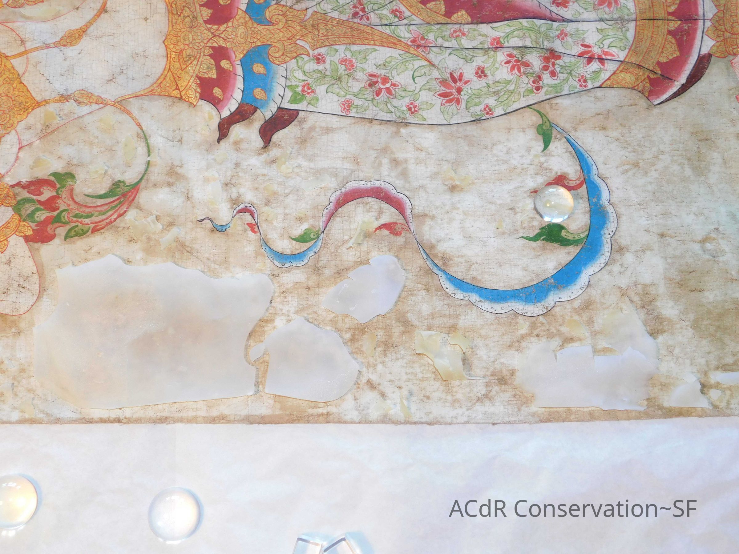 Precise consolidation of the flaking paint with a brush using 4% methylcellulose in water.