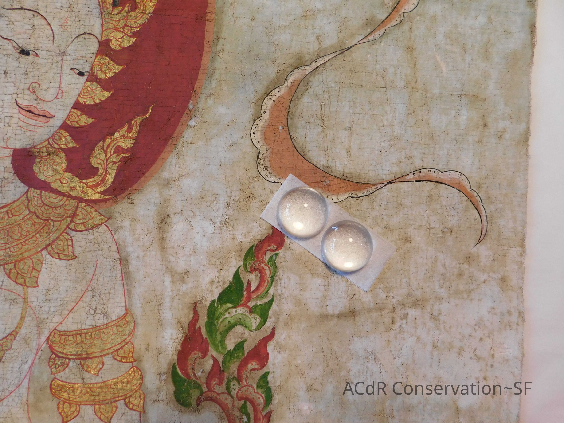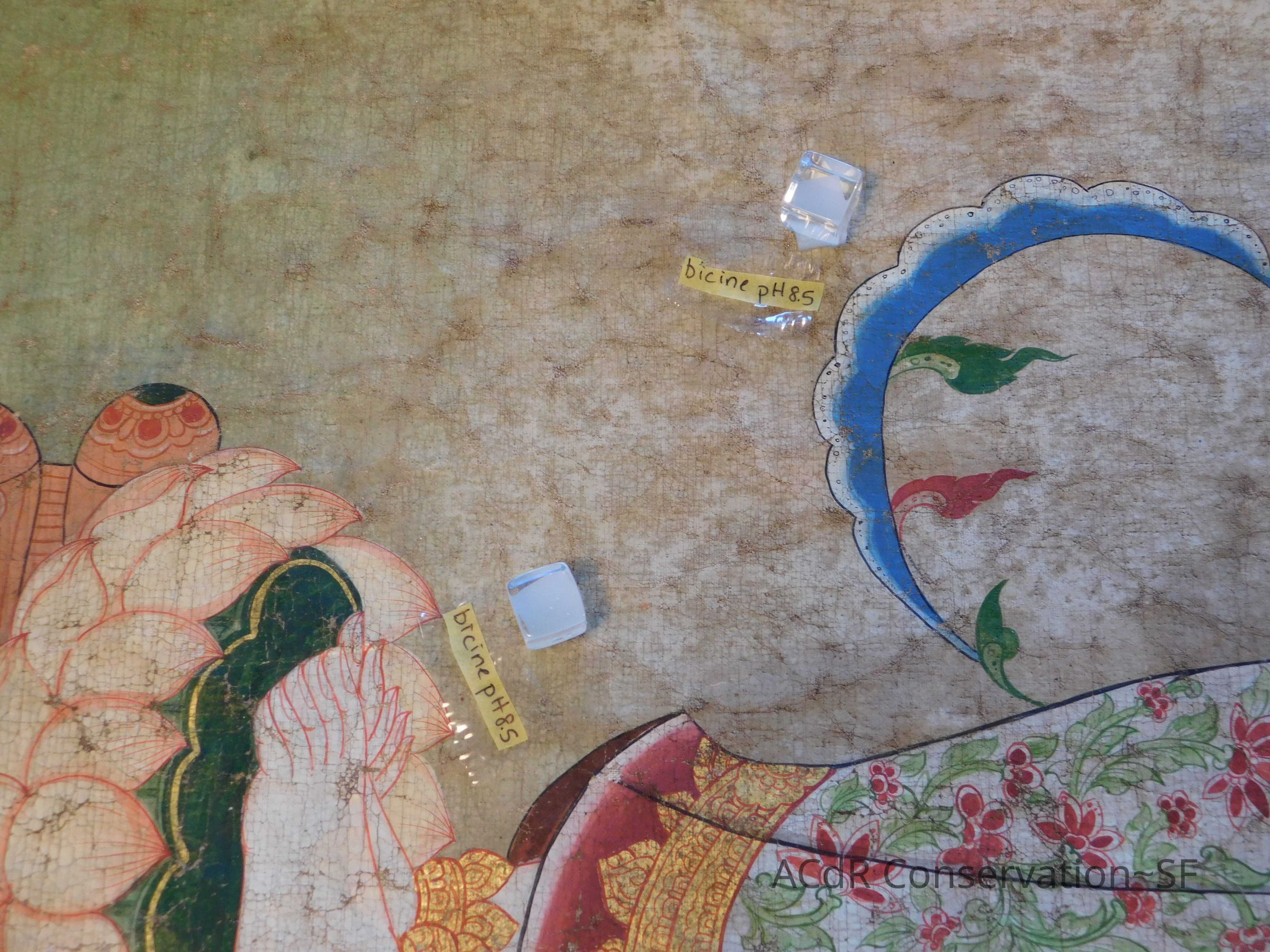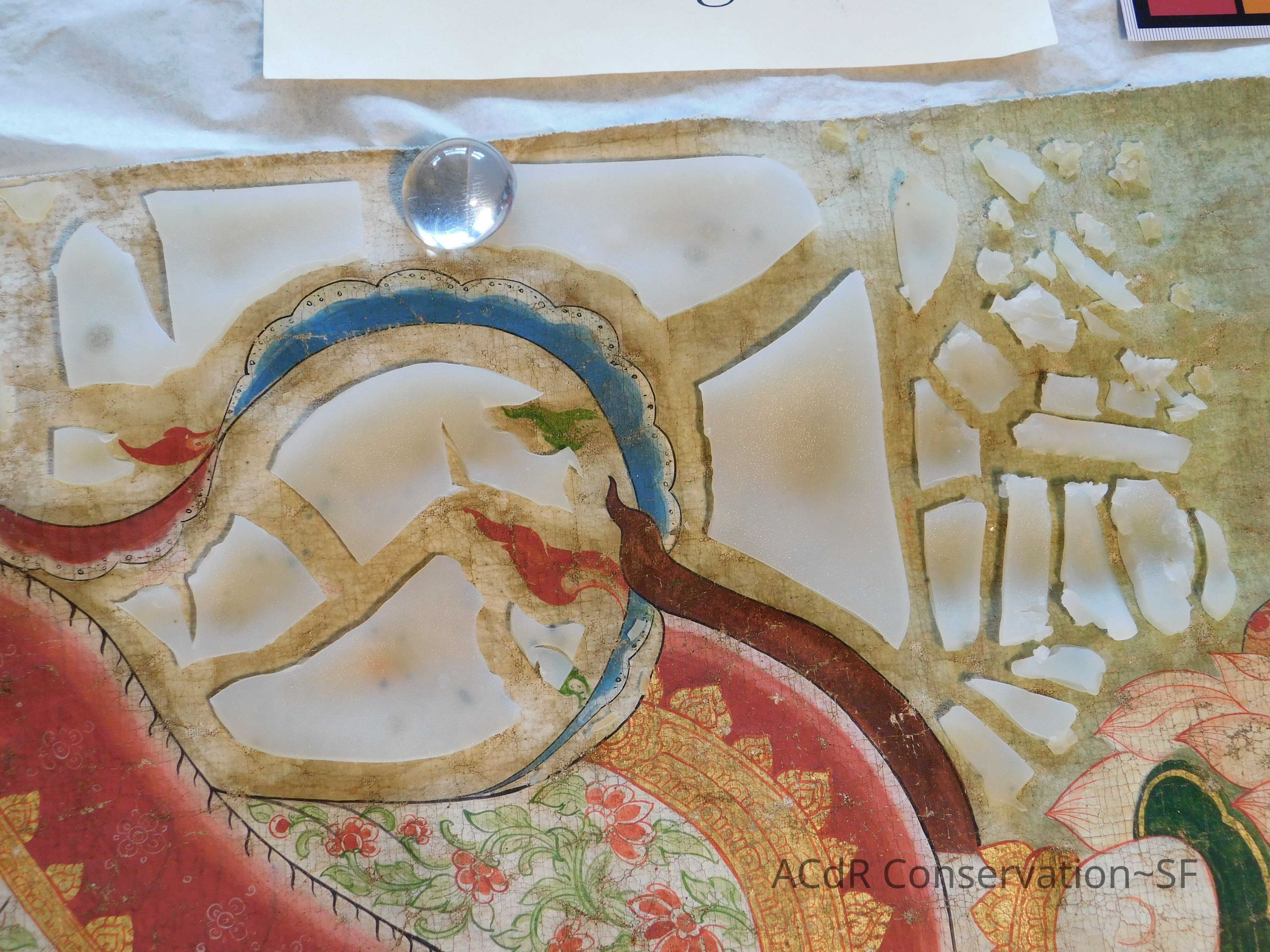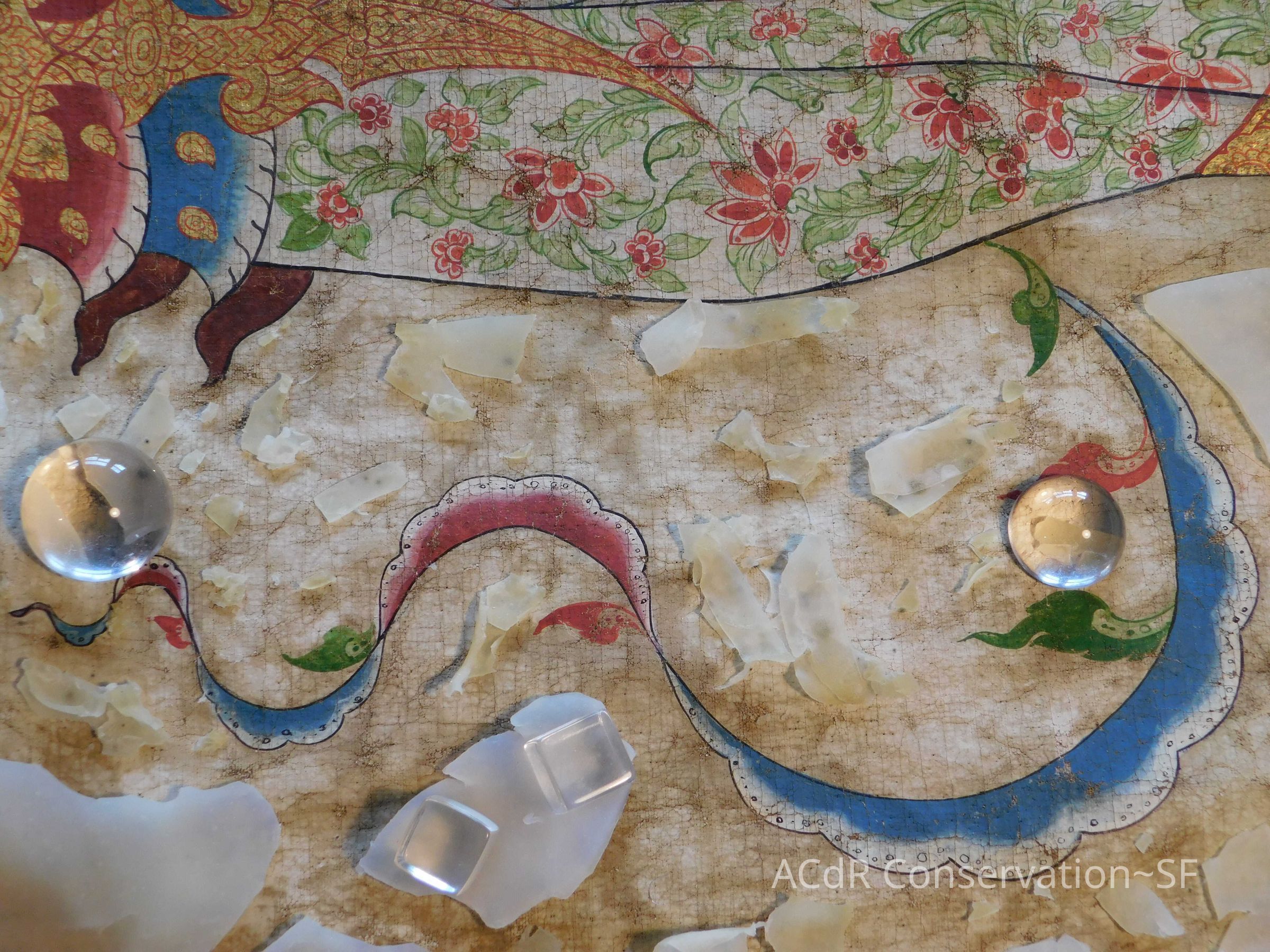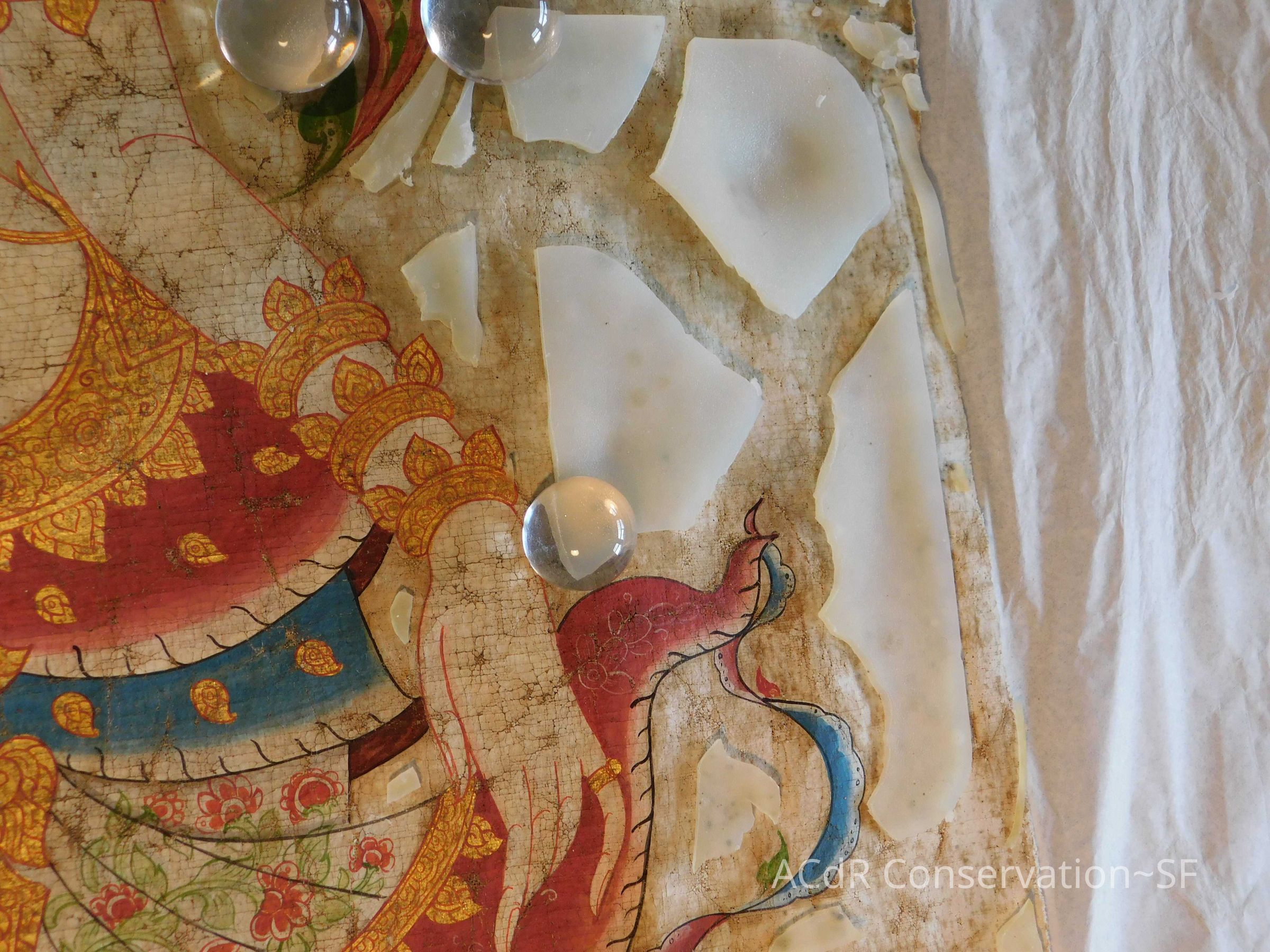 Precise consolidation of the flaking paint with a brush using 4% methylcellulose in water.