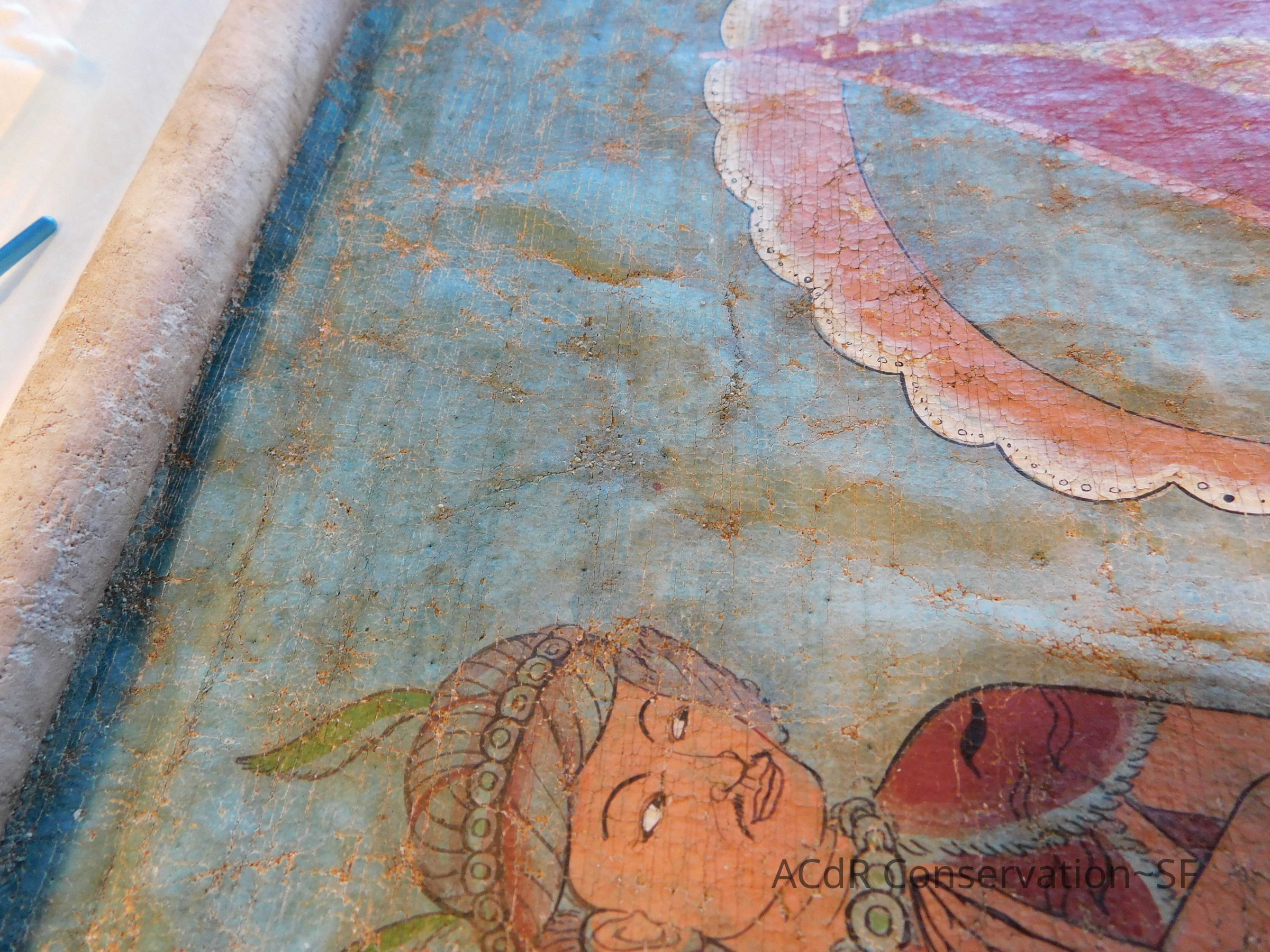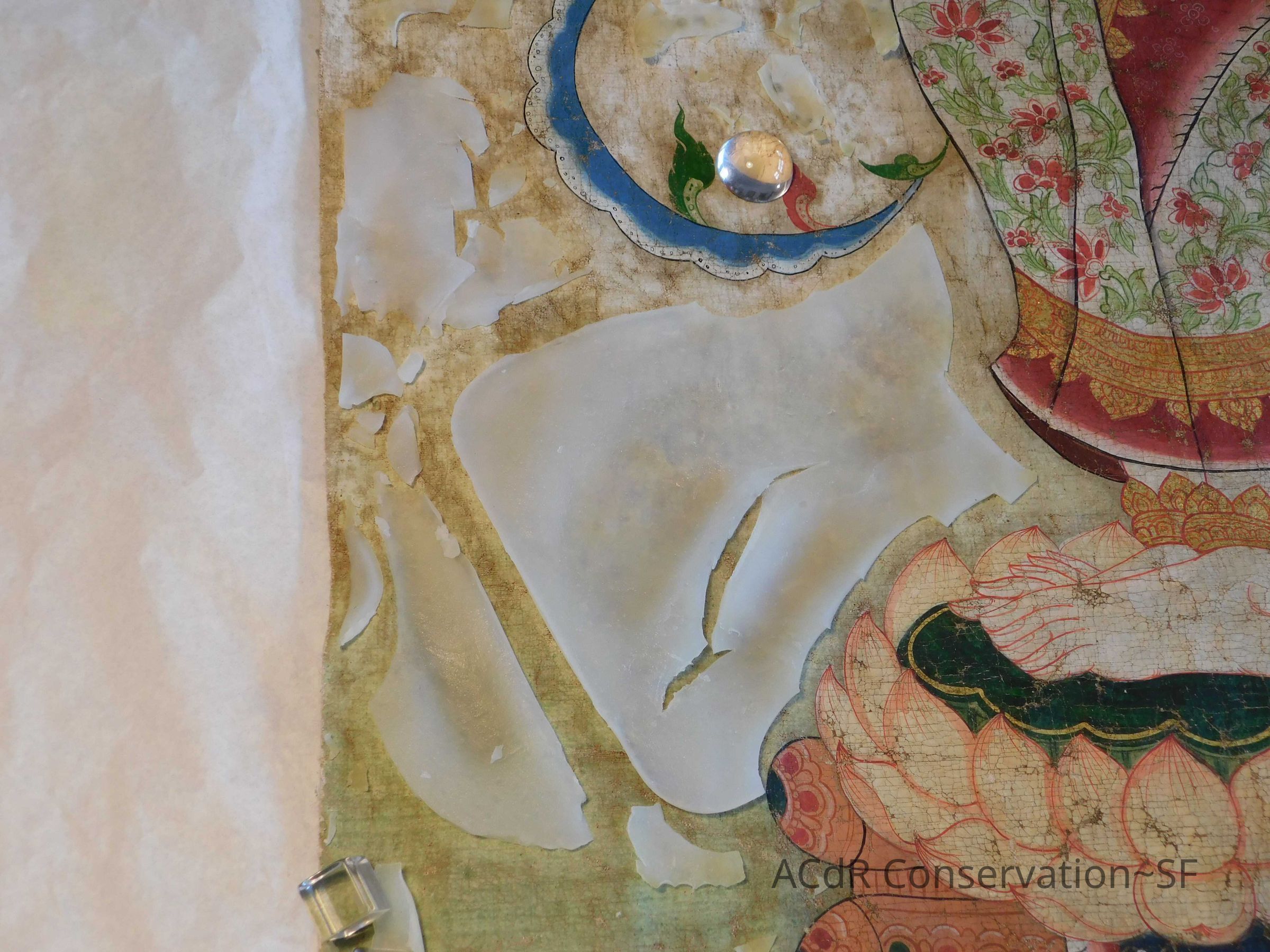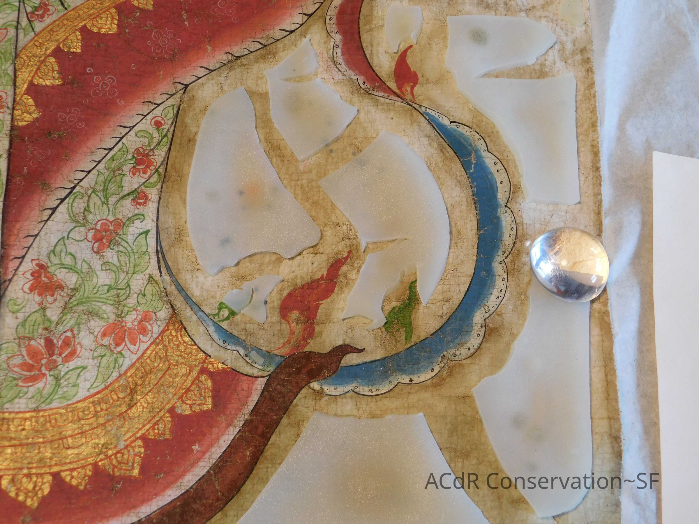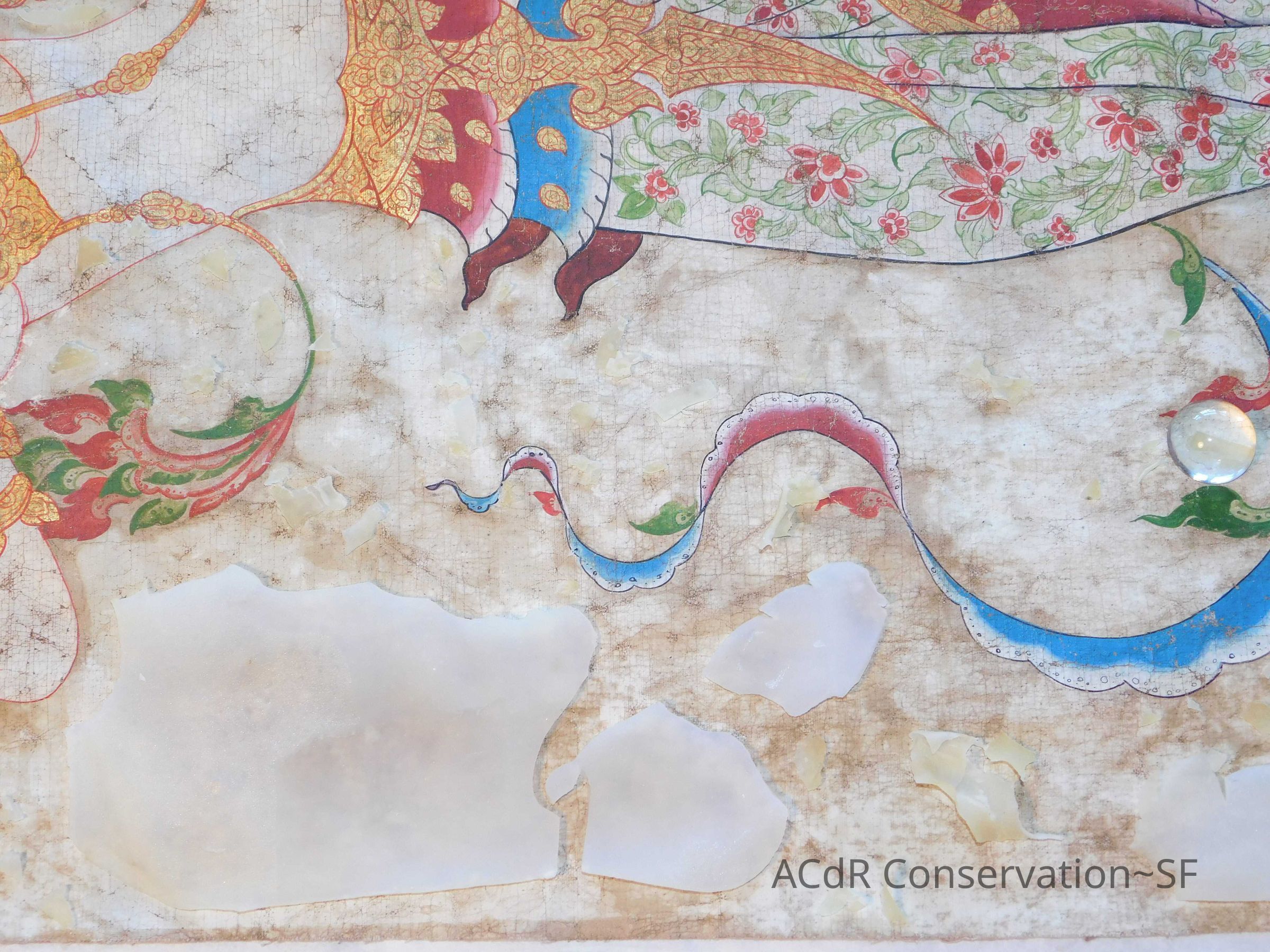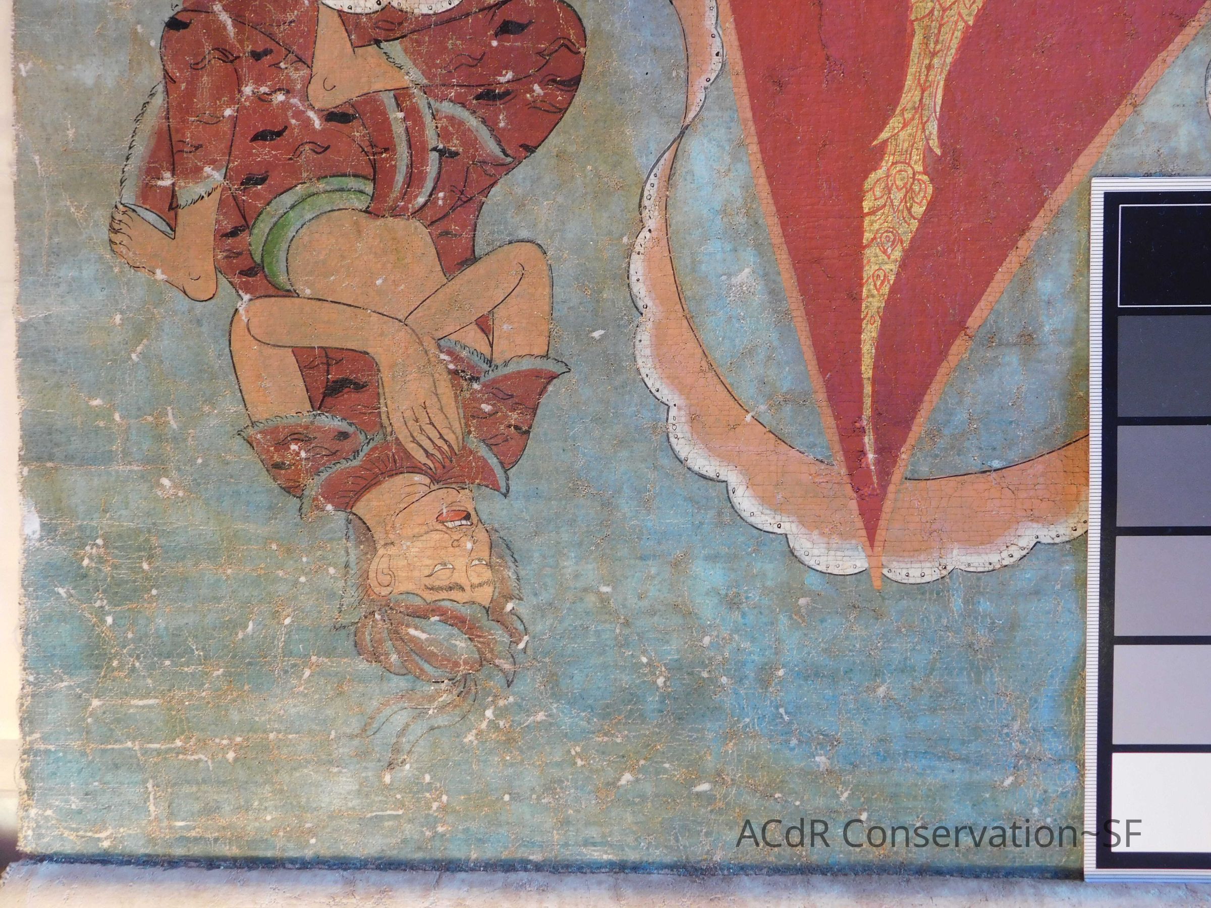 Precise consolidation of the flaking paint with a brush using 4% methylcellulose in water.