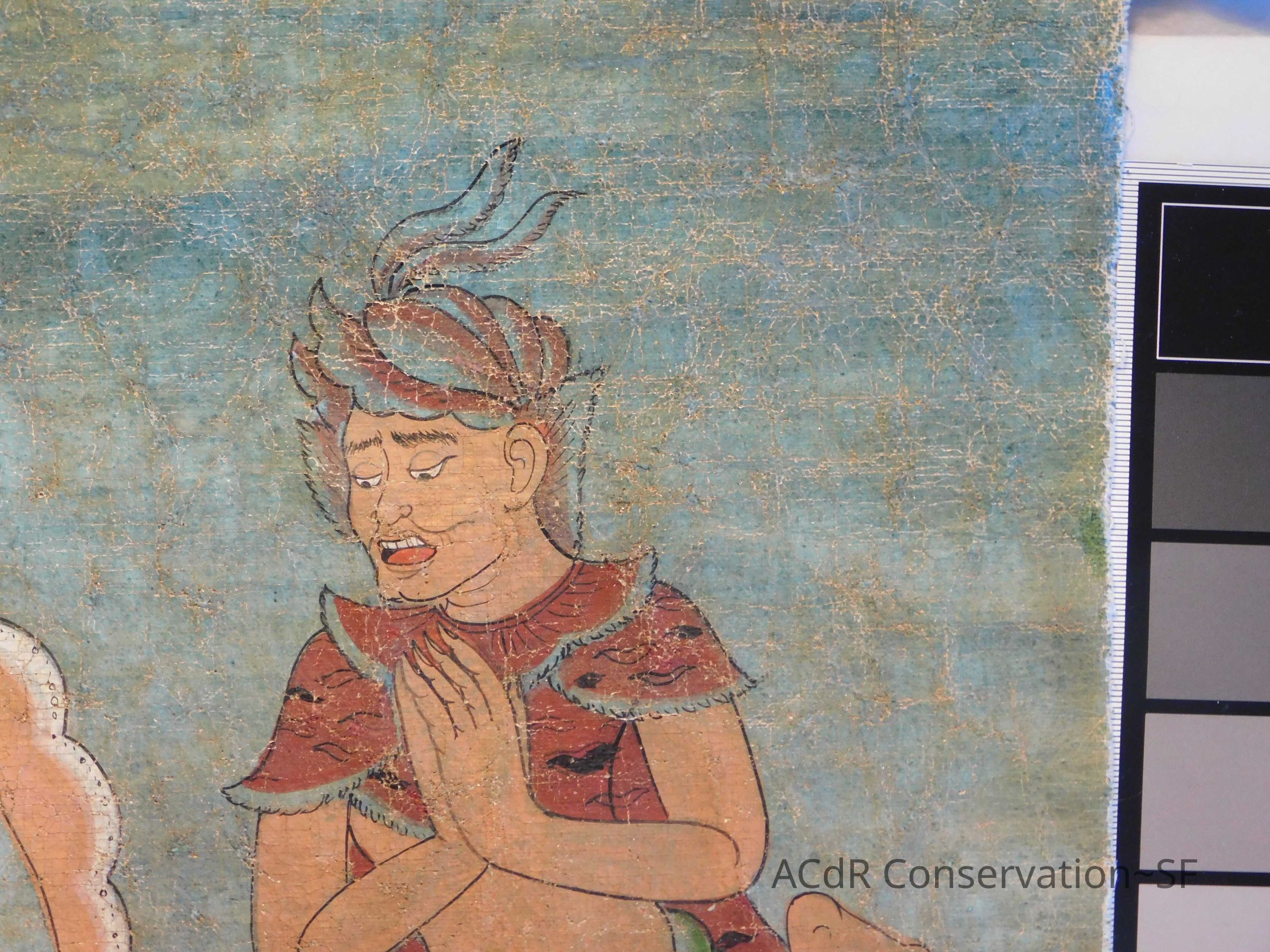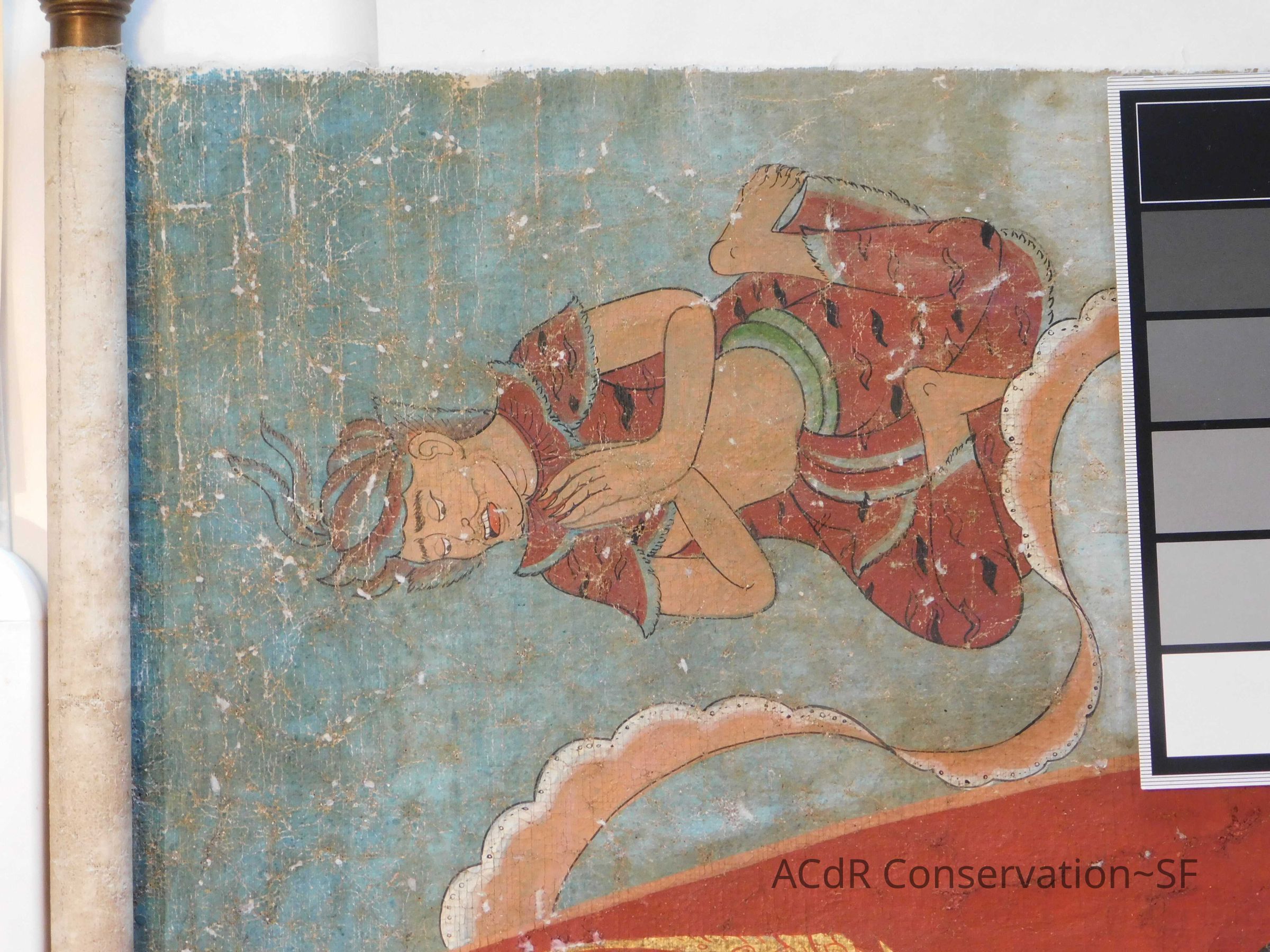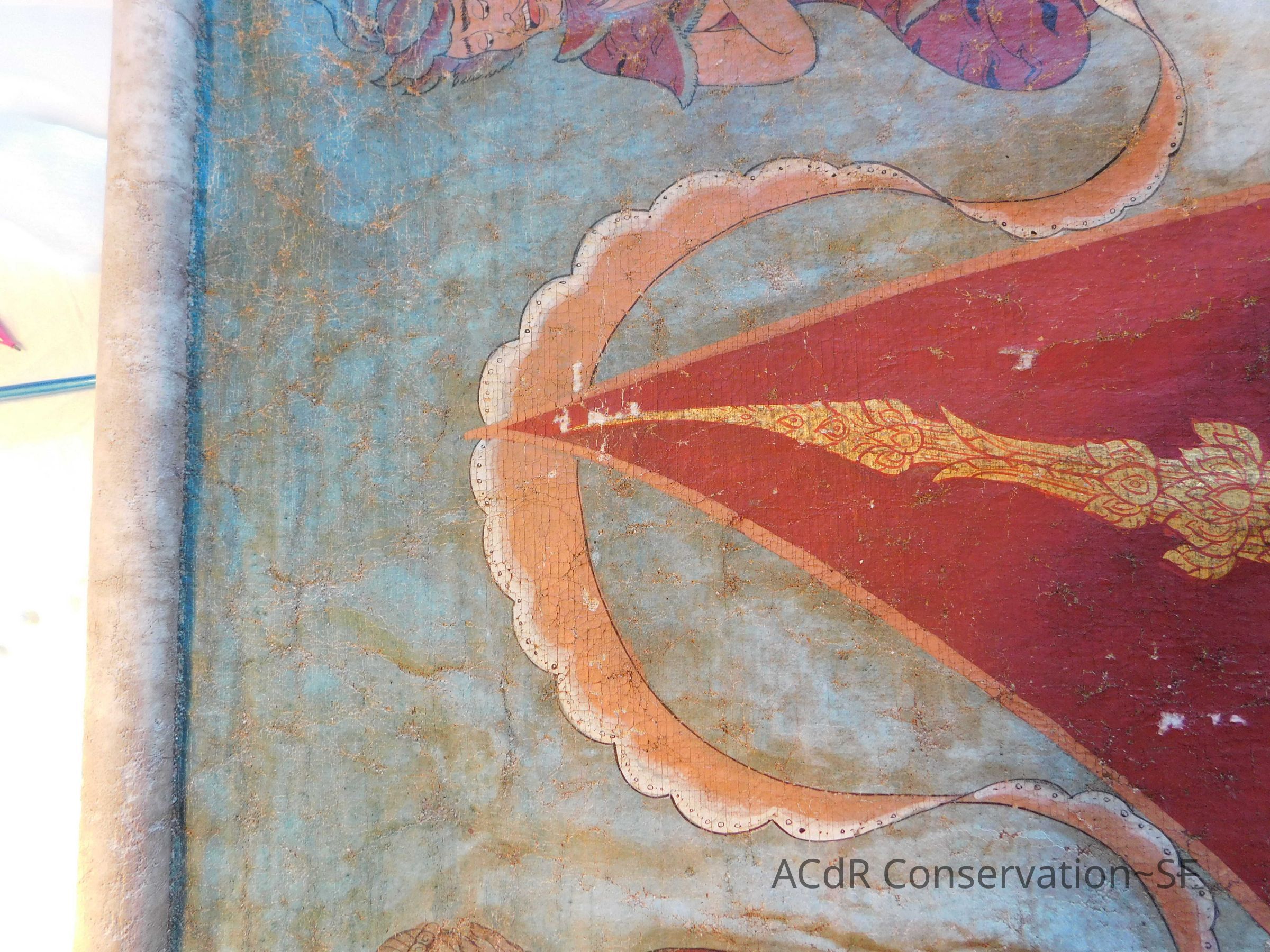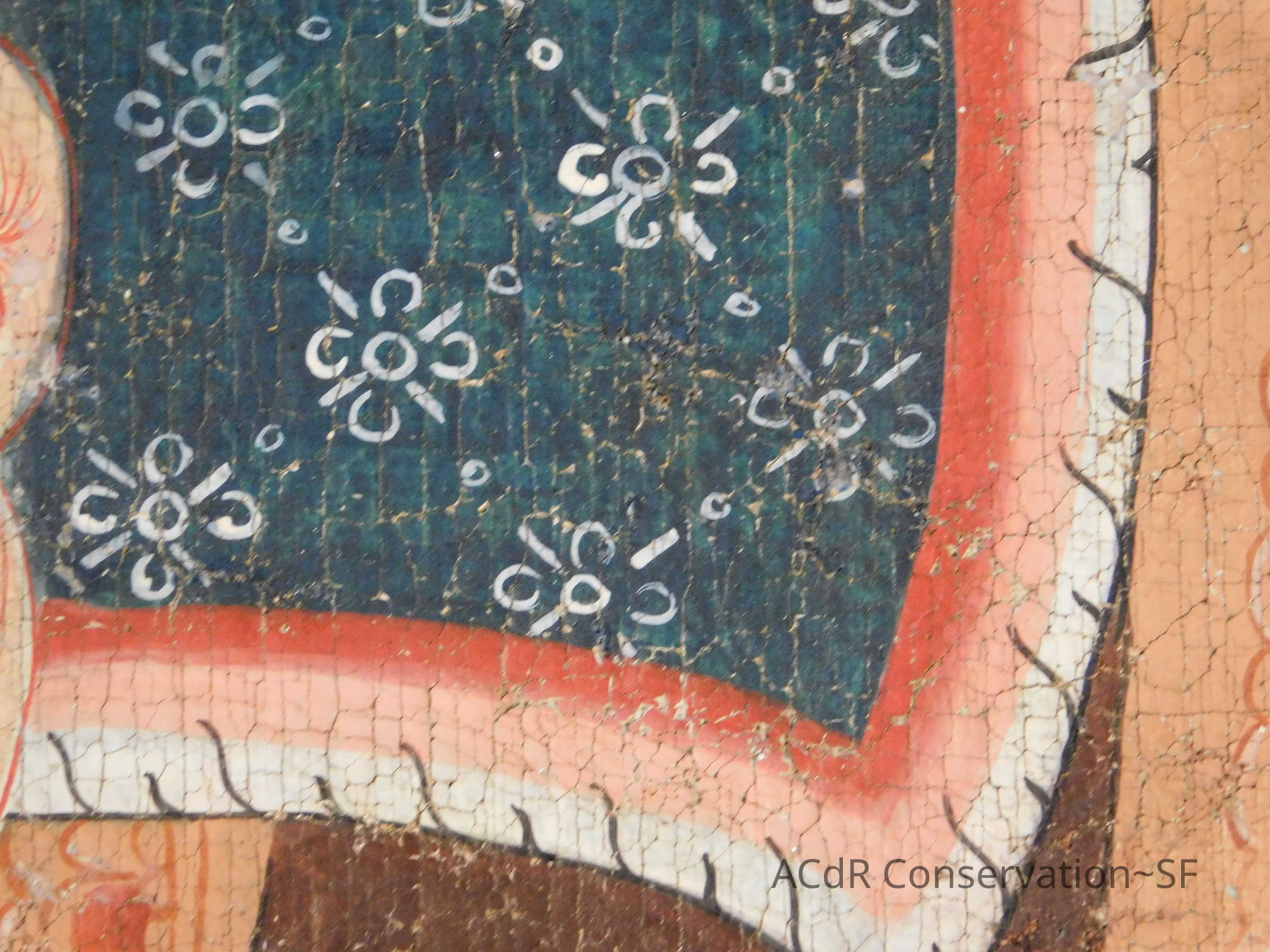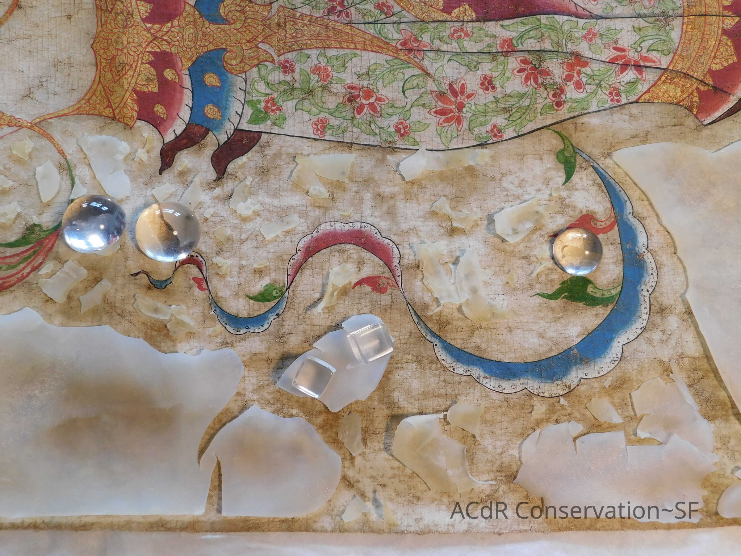 Precise consolidation of the flaking paint with a brush using 4% methylcellulose in water.
