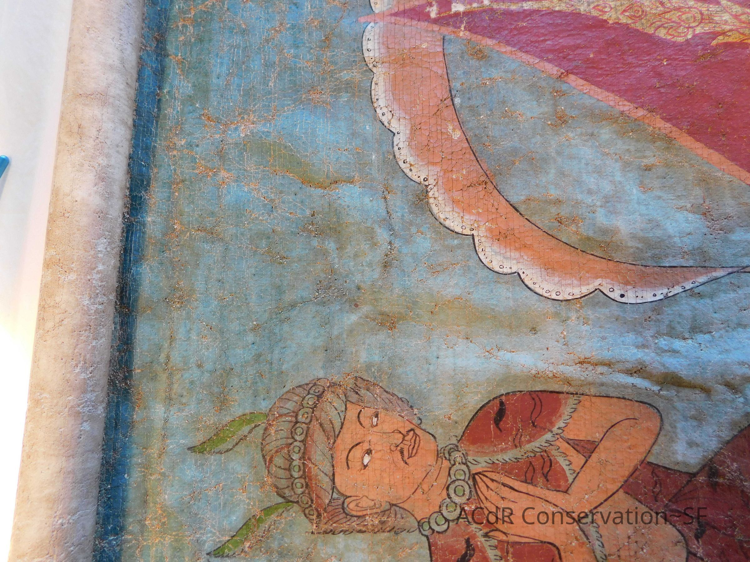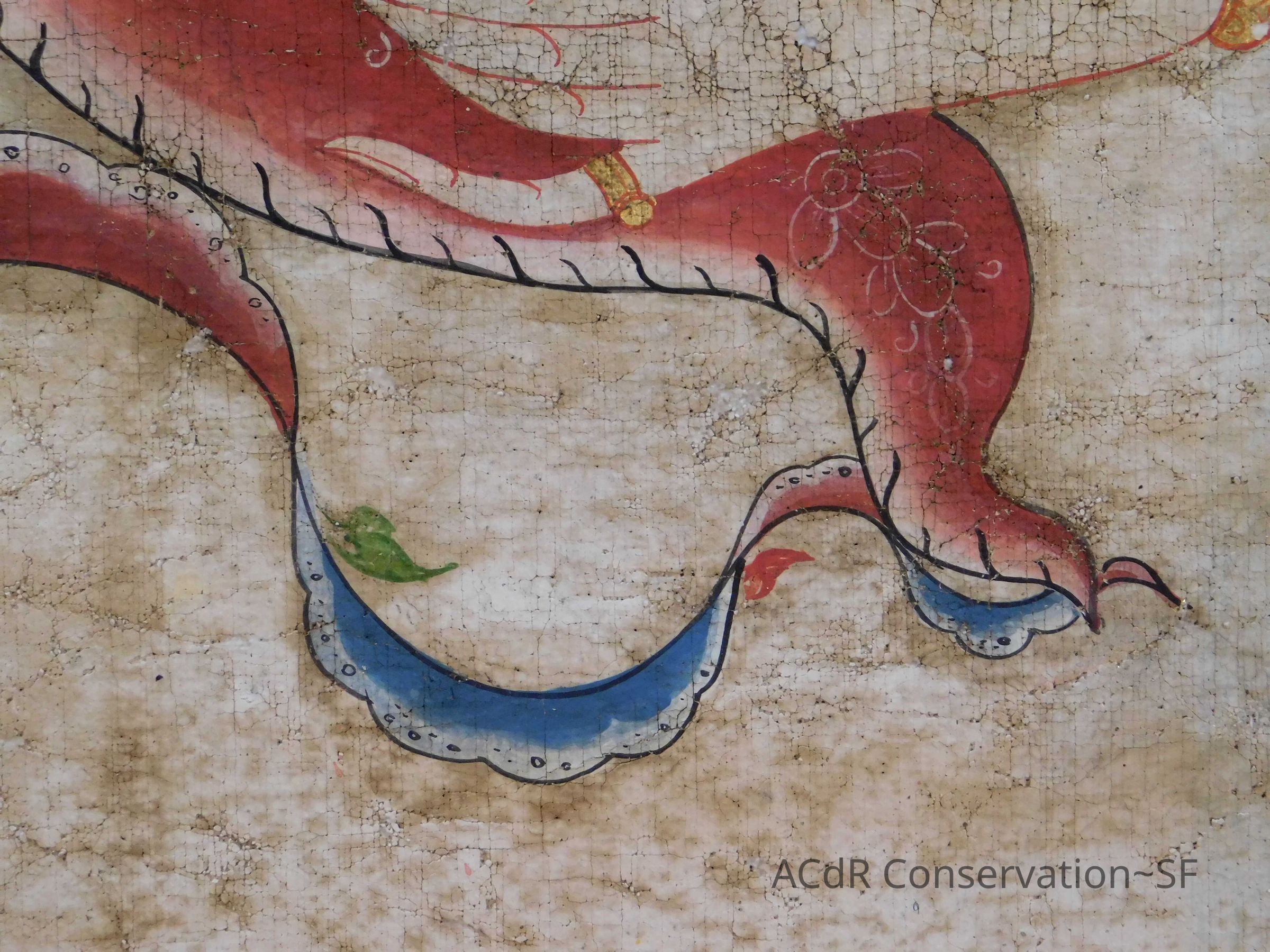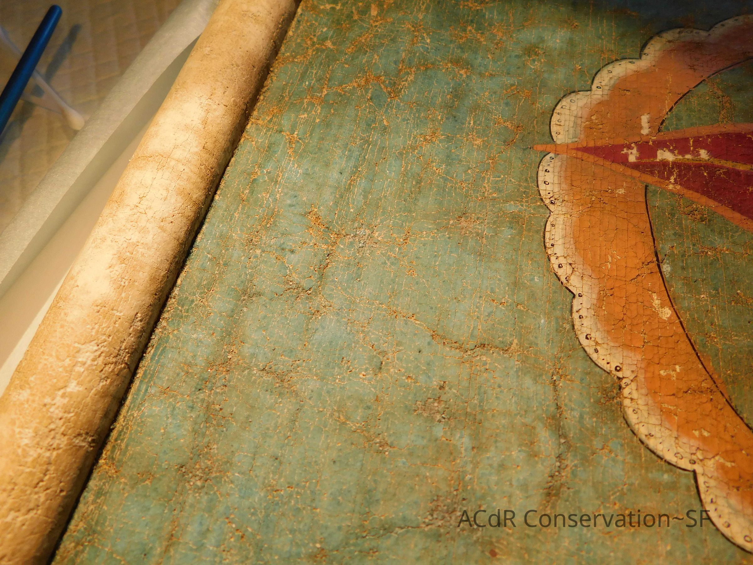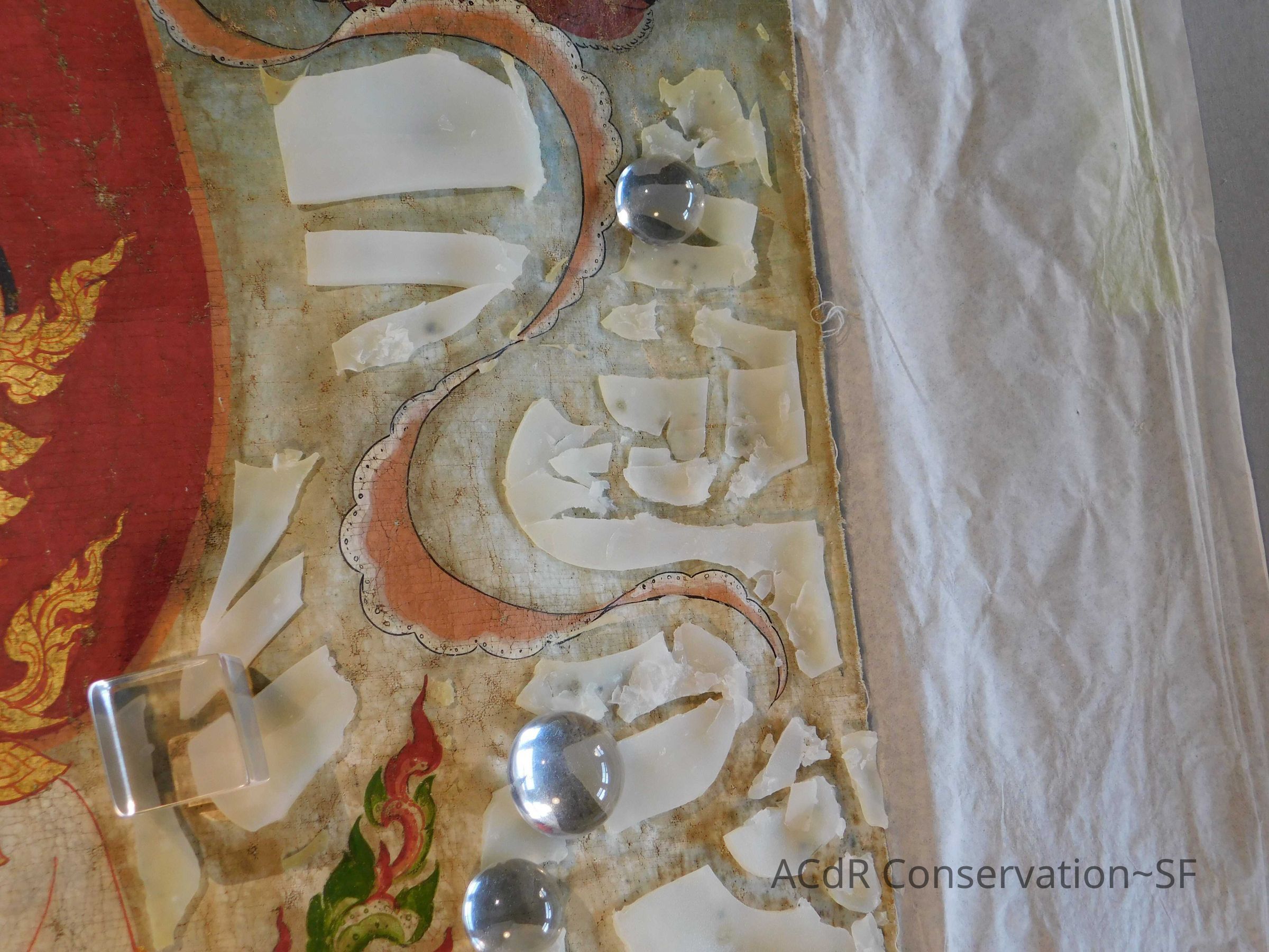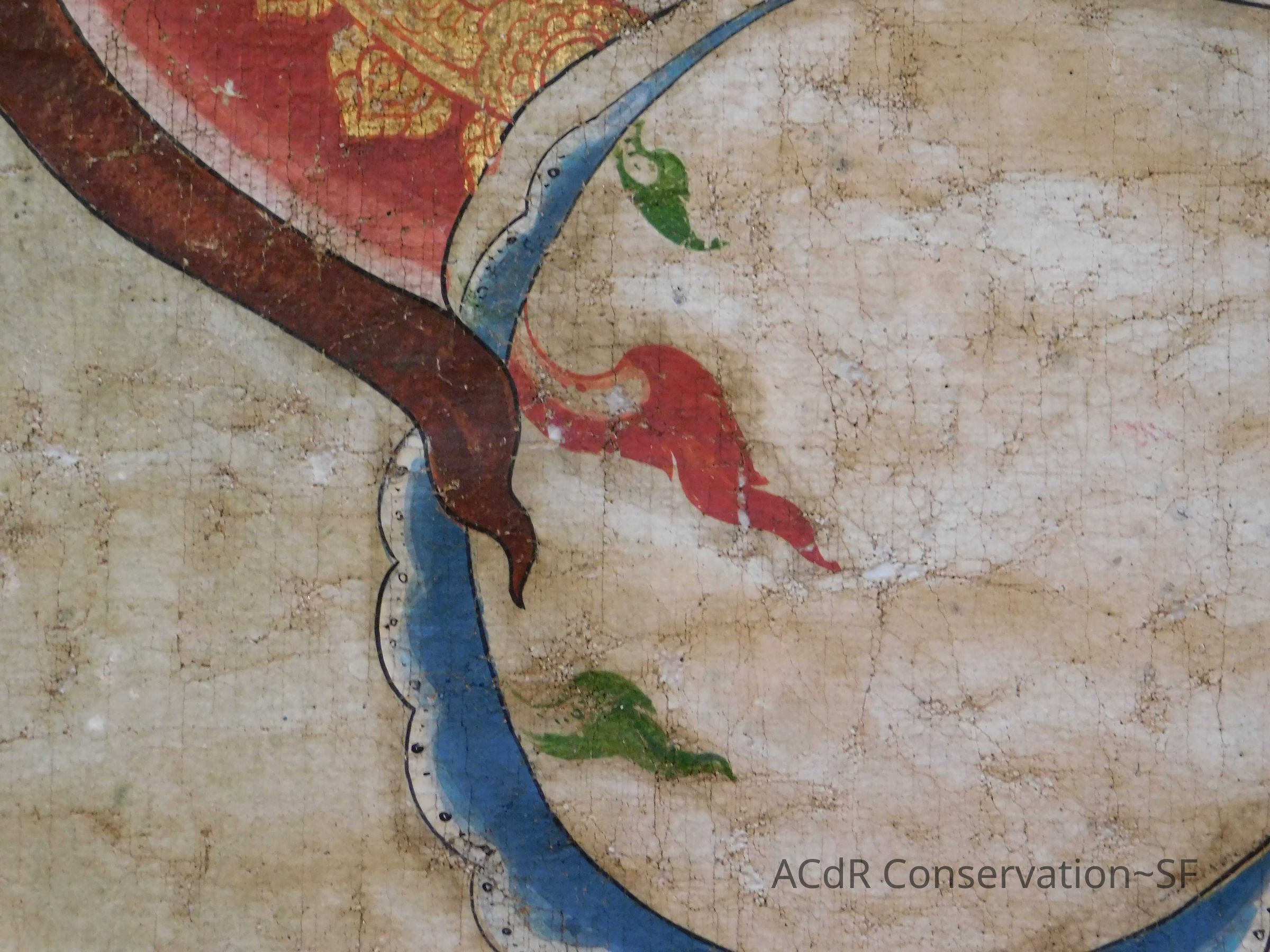 Precise consolidation of the flaking paint with a brush using 4% methylcellulose in water.