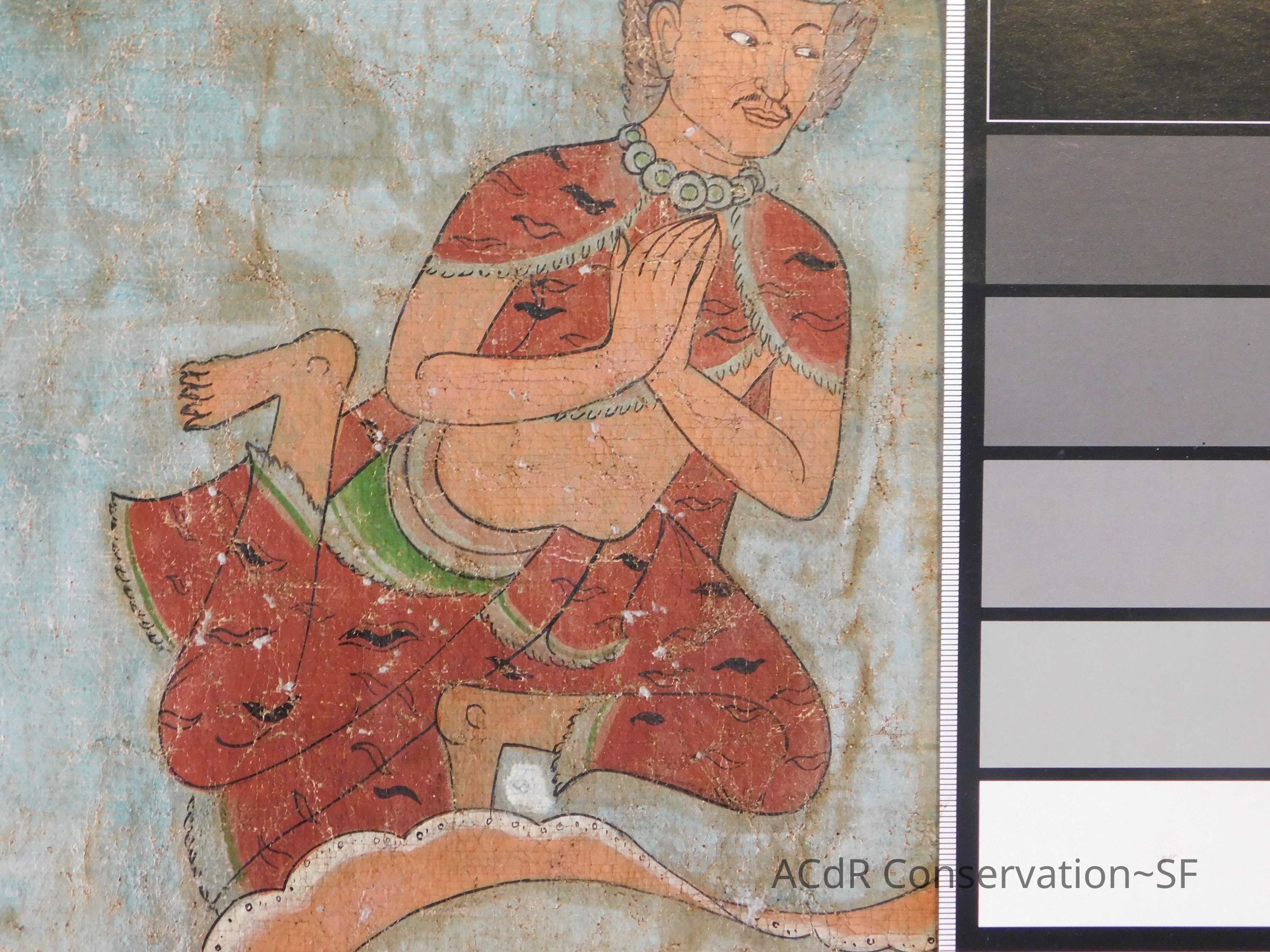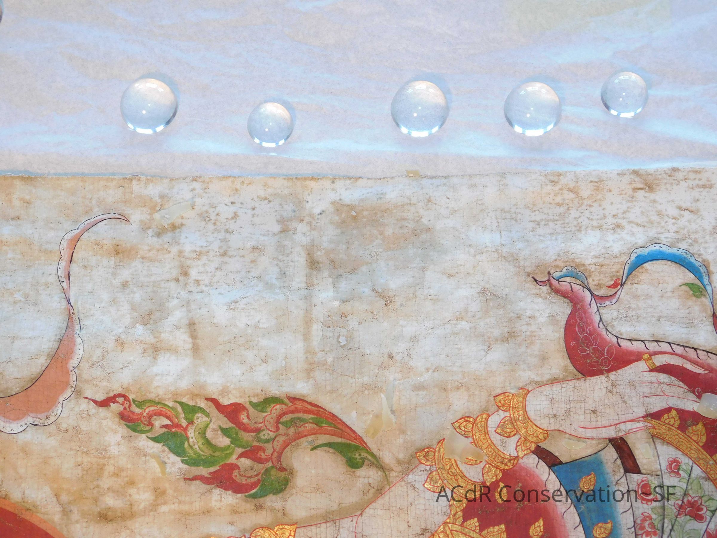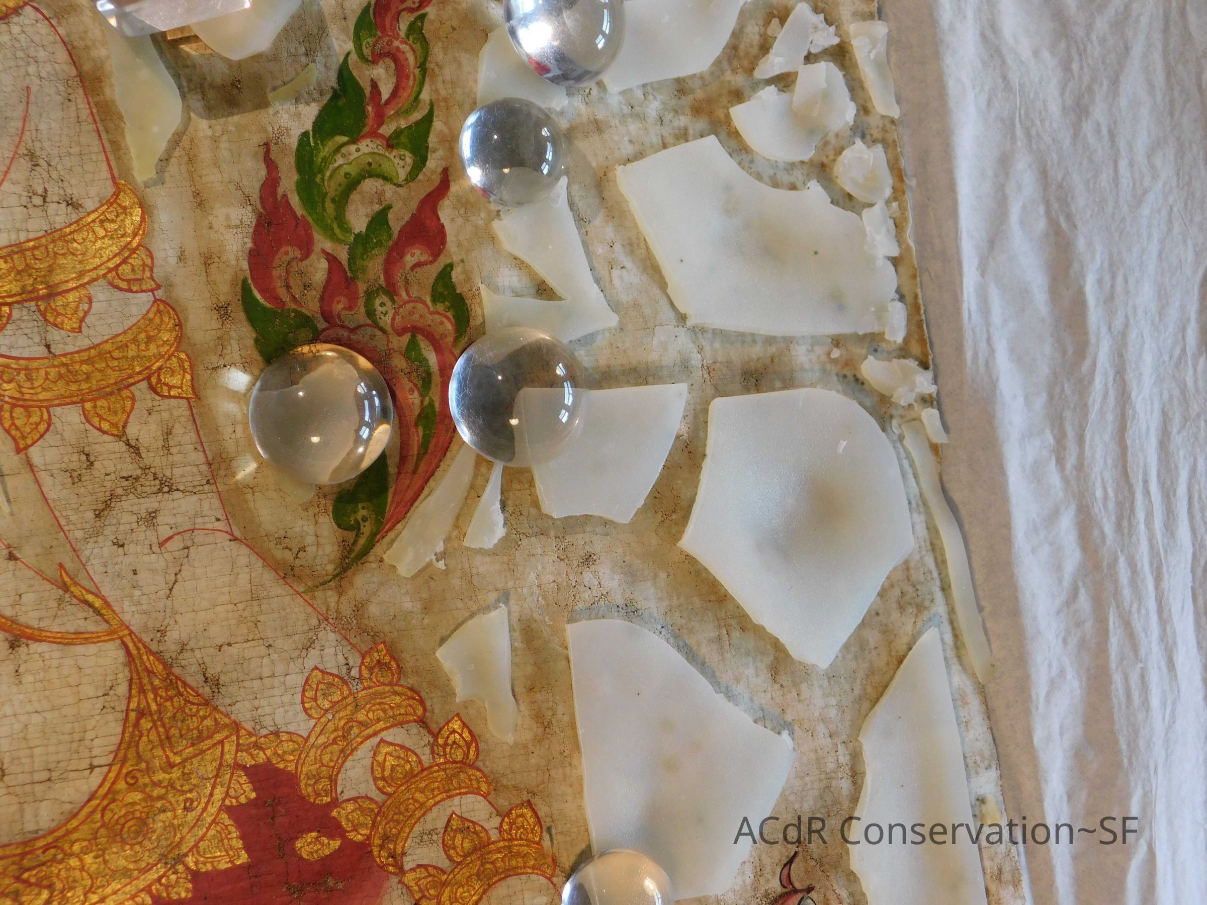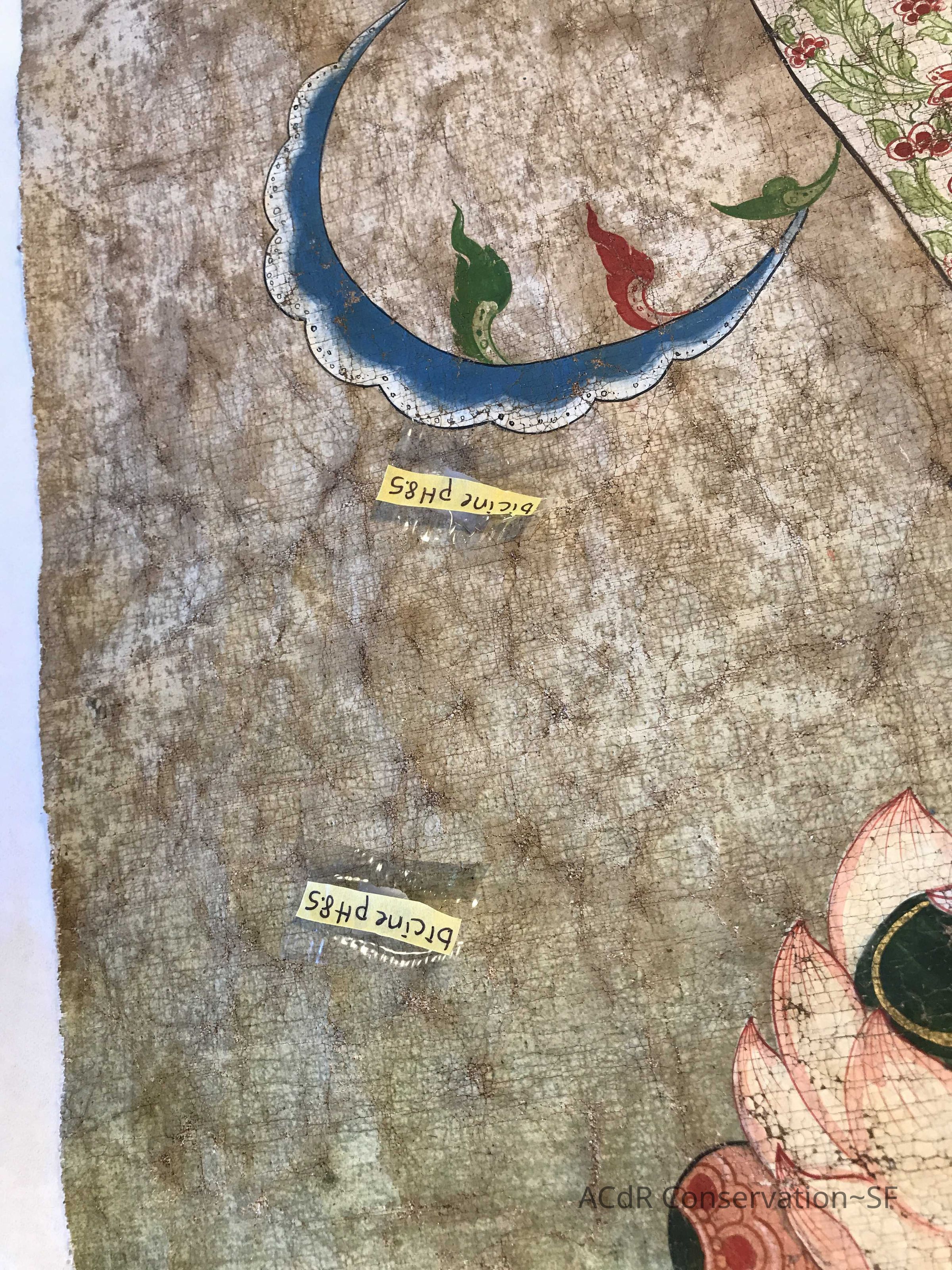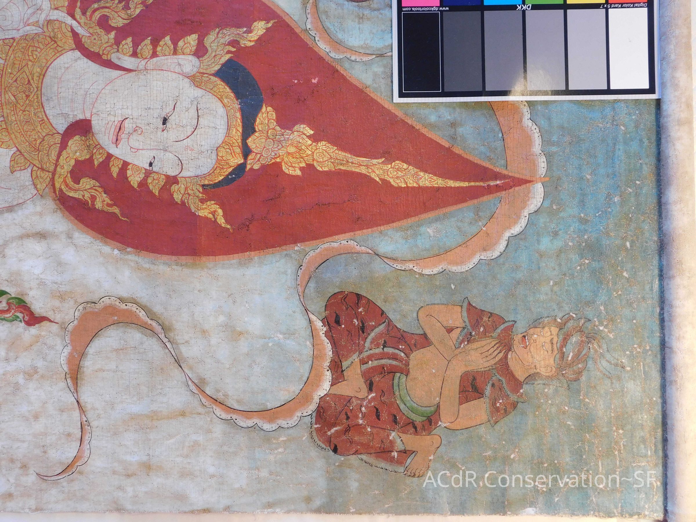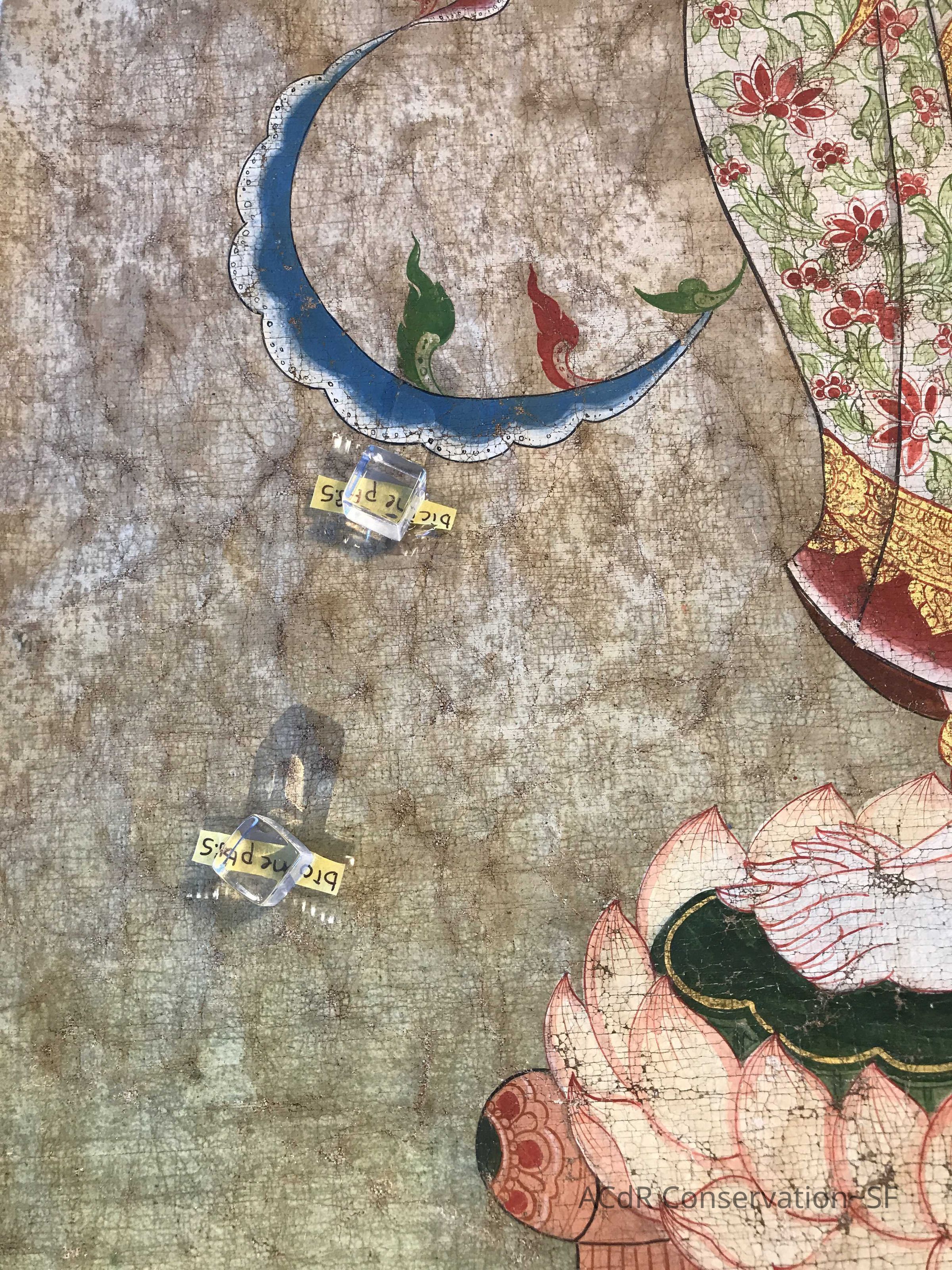 Precise consolidation of the flaking paint with a brush using 4% methylcellulose in water.