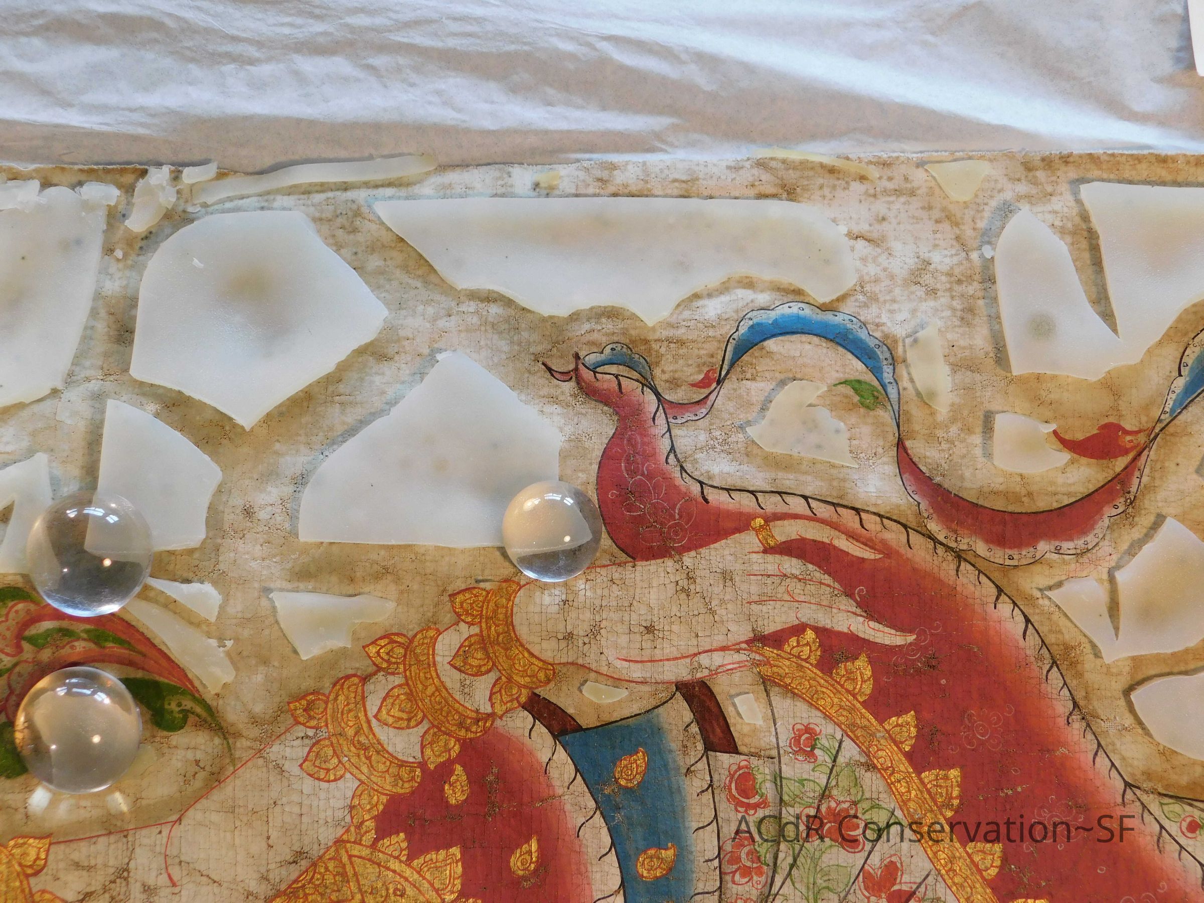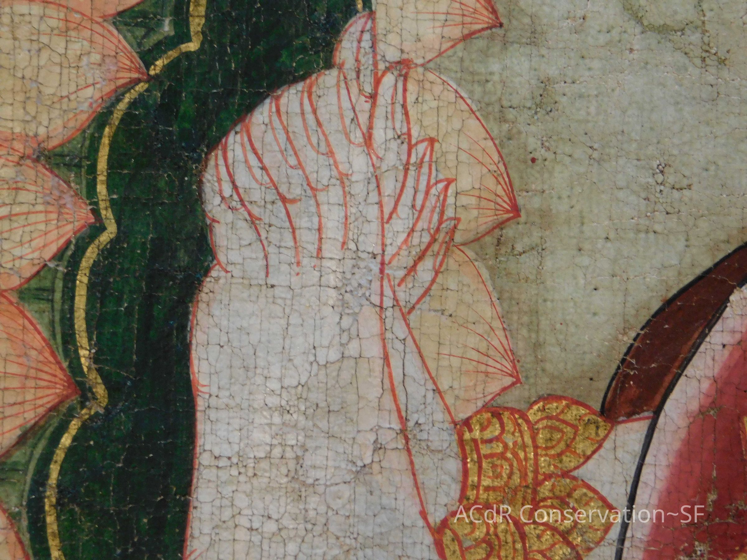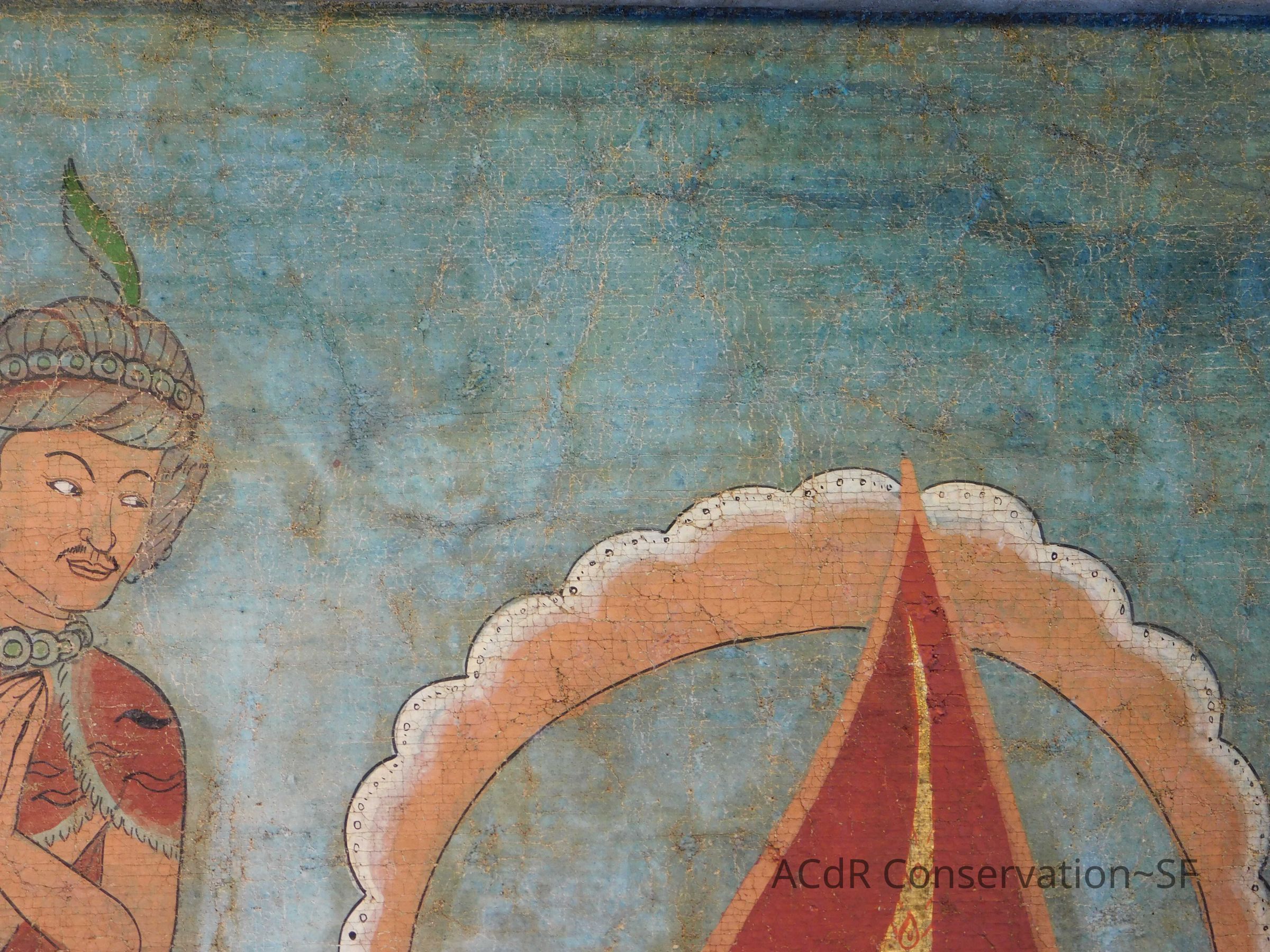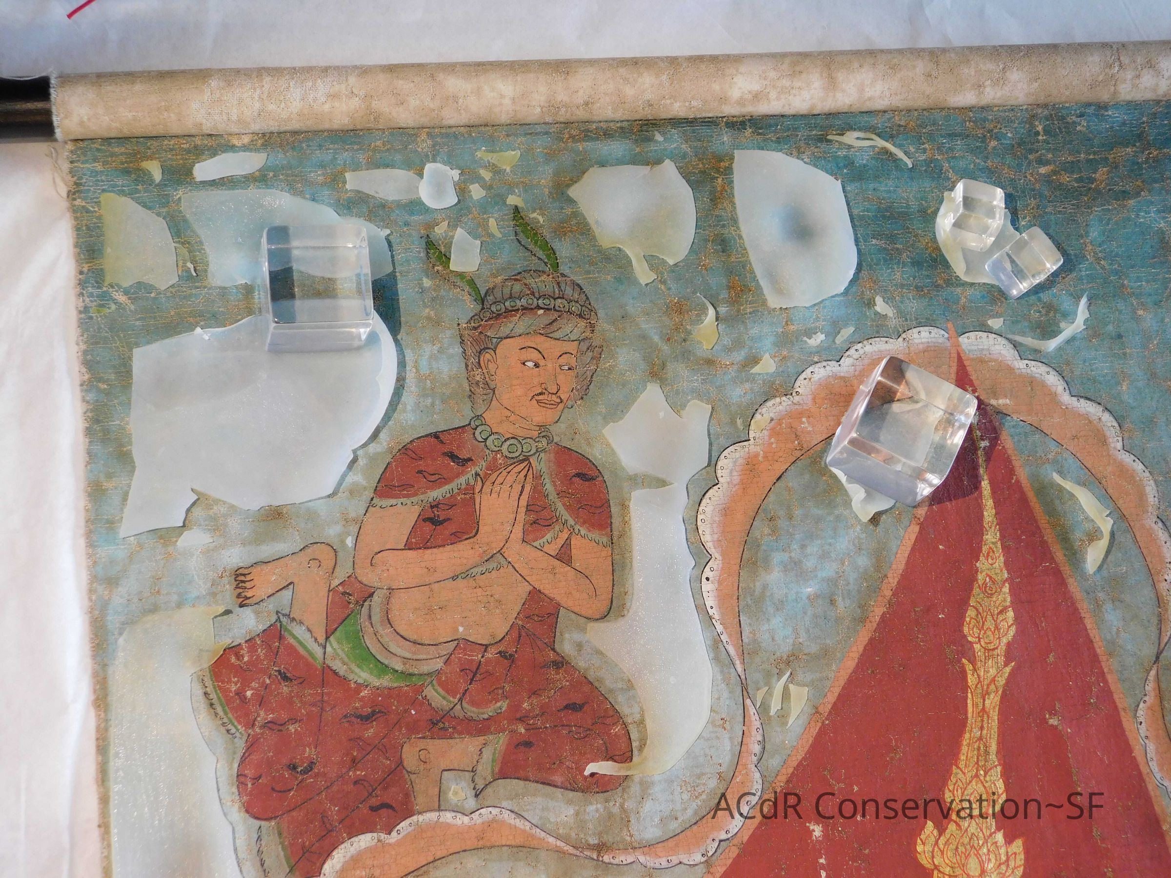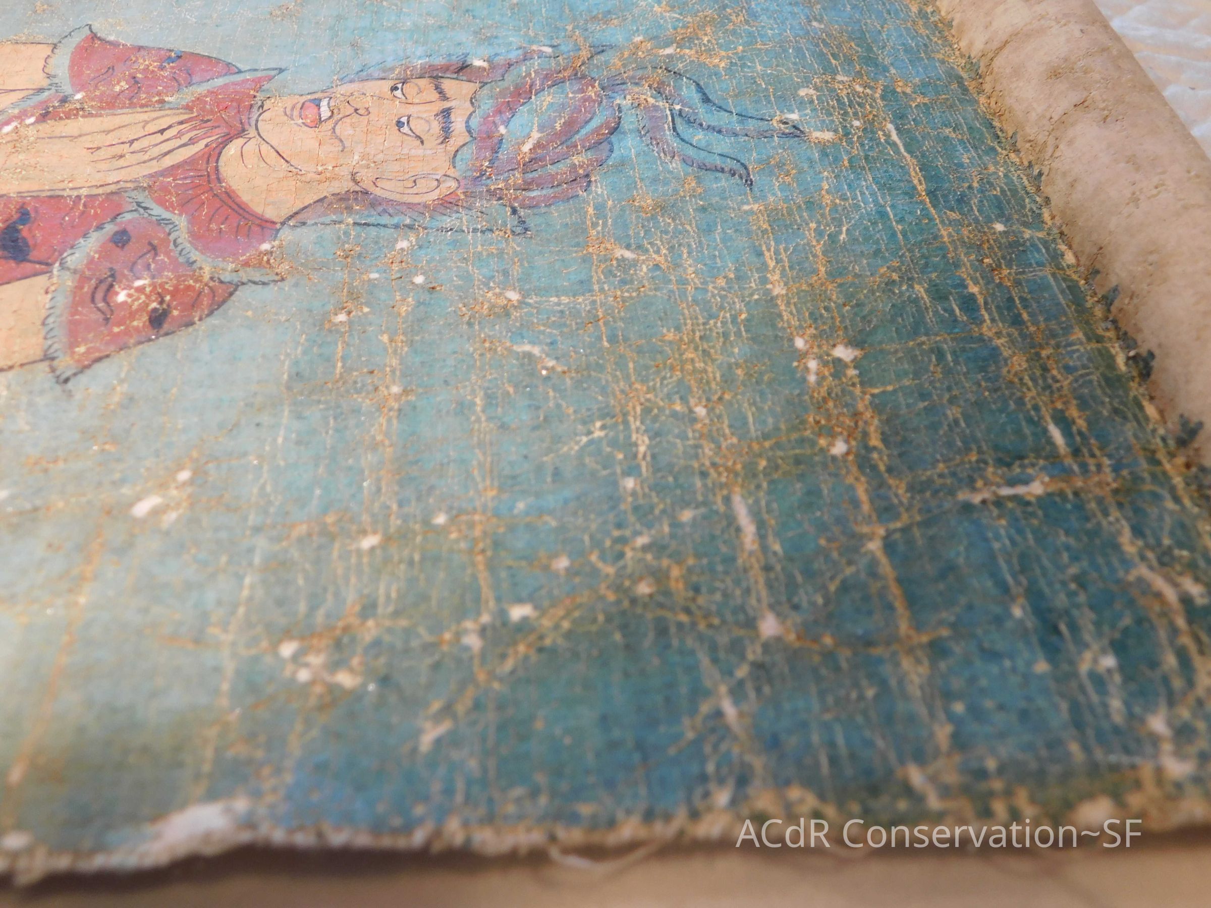 Precise consolidation of the flaking paint with a brush using 4% methylcellulose in water.
