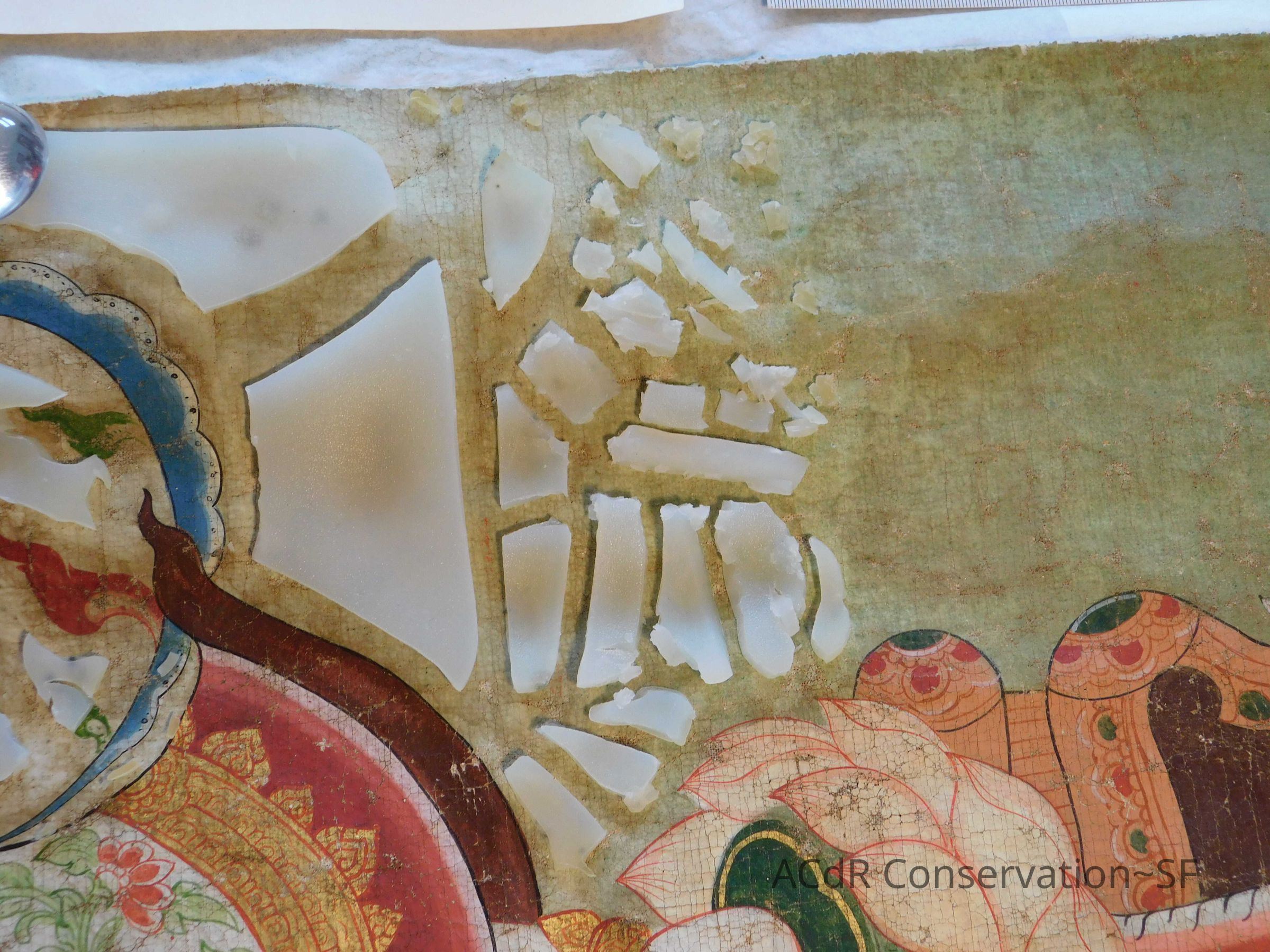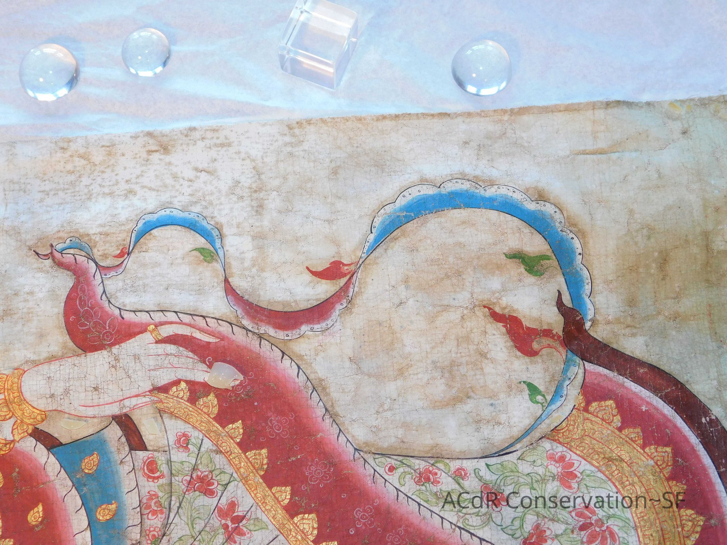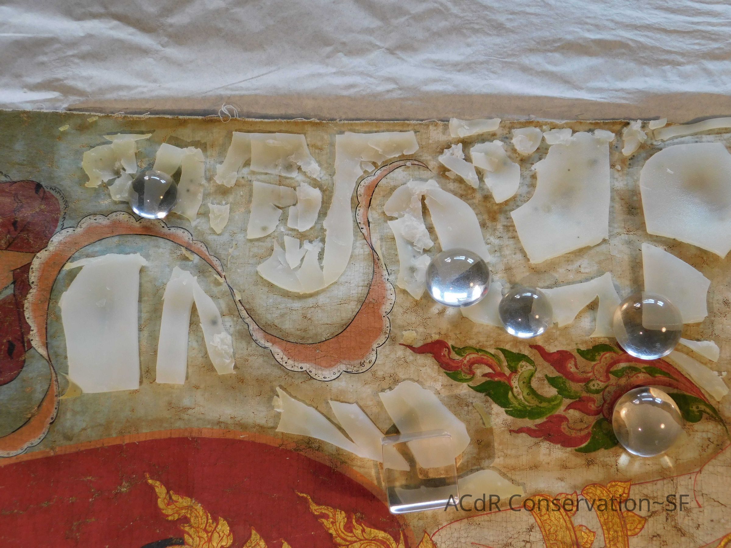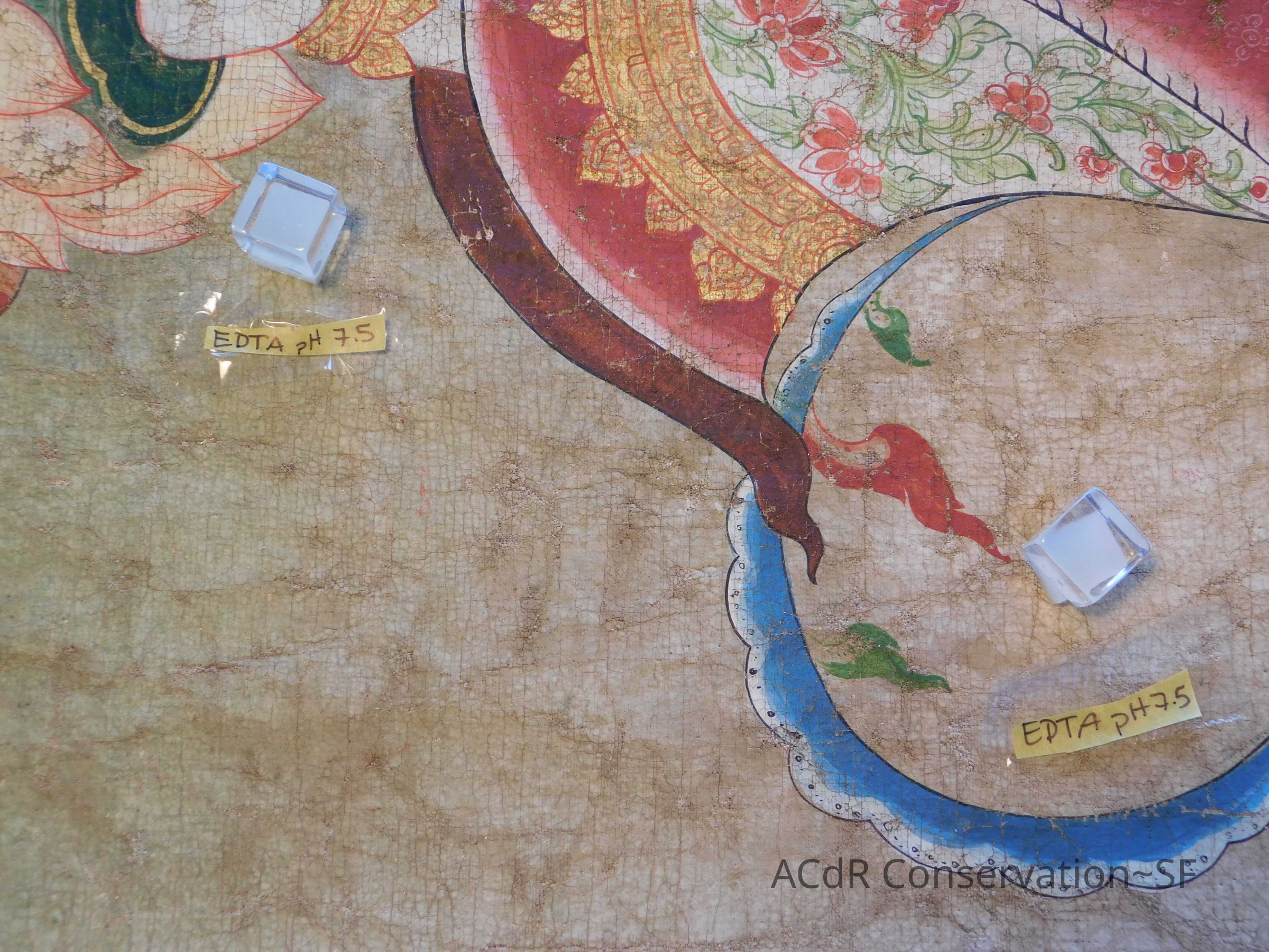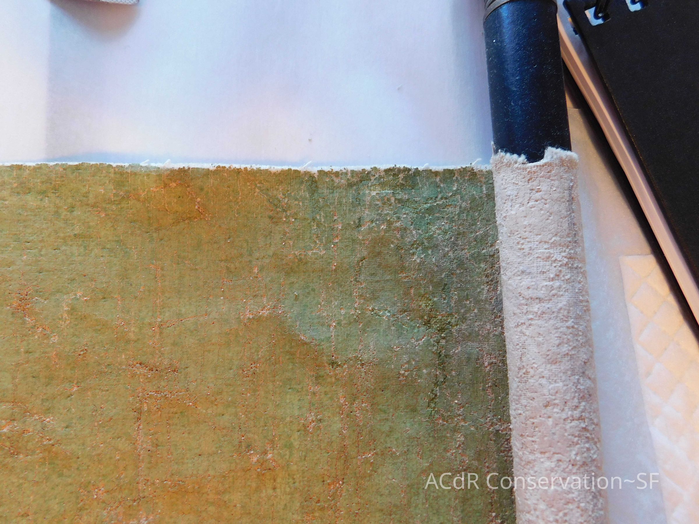 Precise consolidation of the flaking paint with a brush using 4% methylcellulose in water.