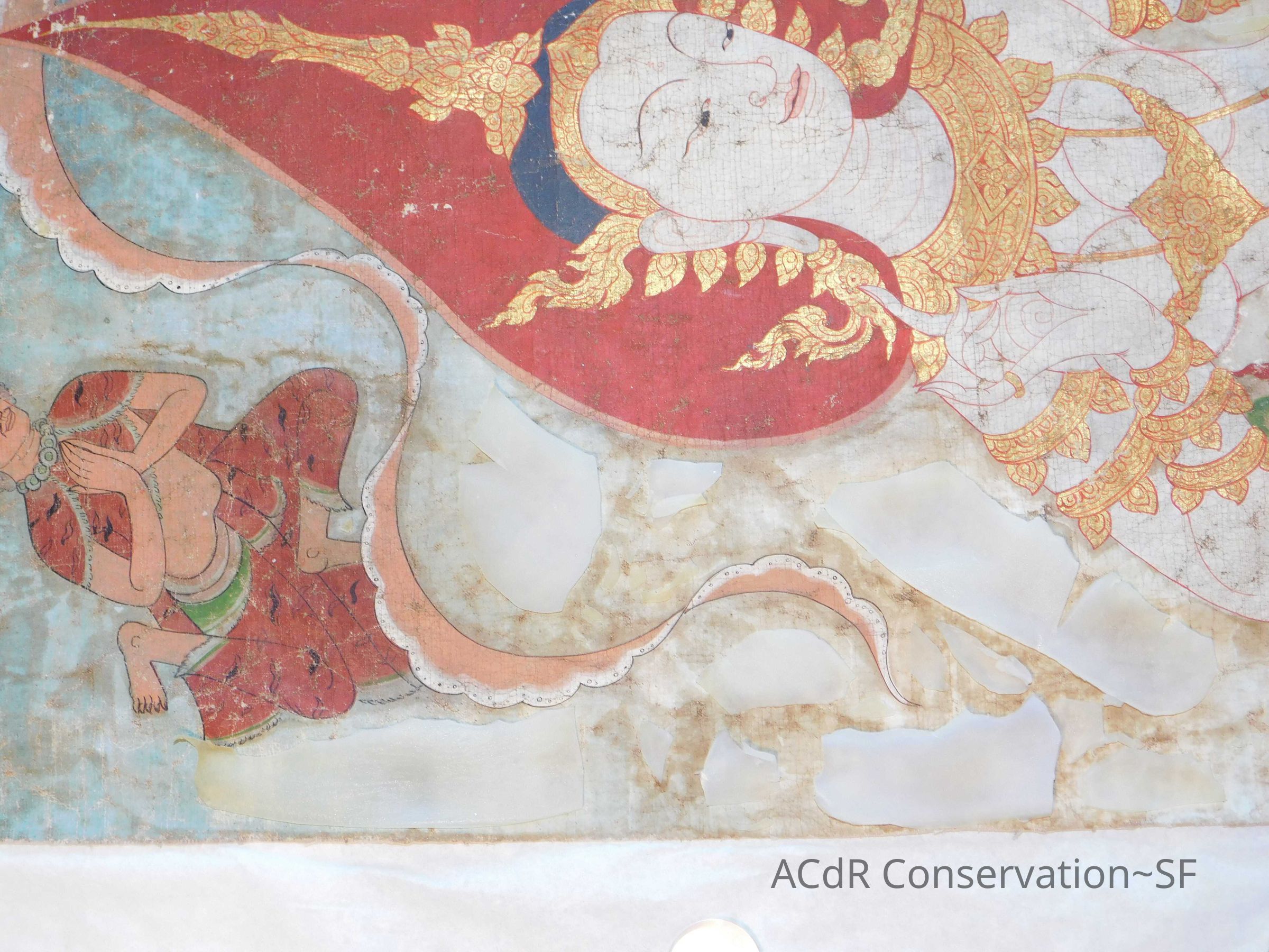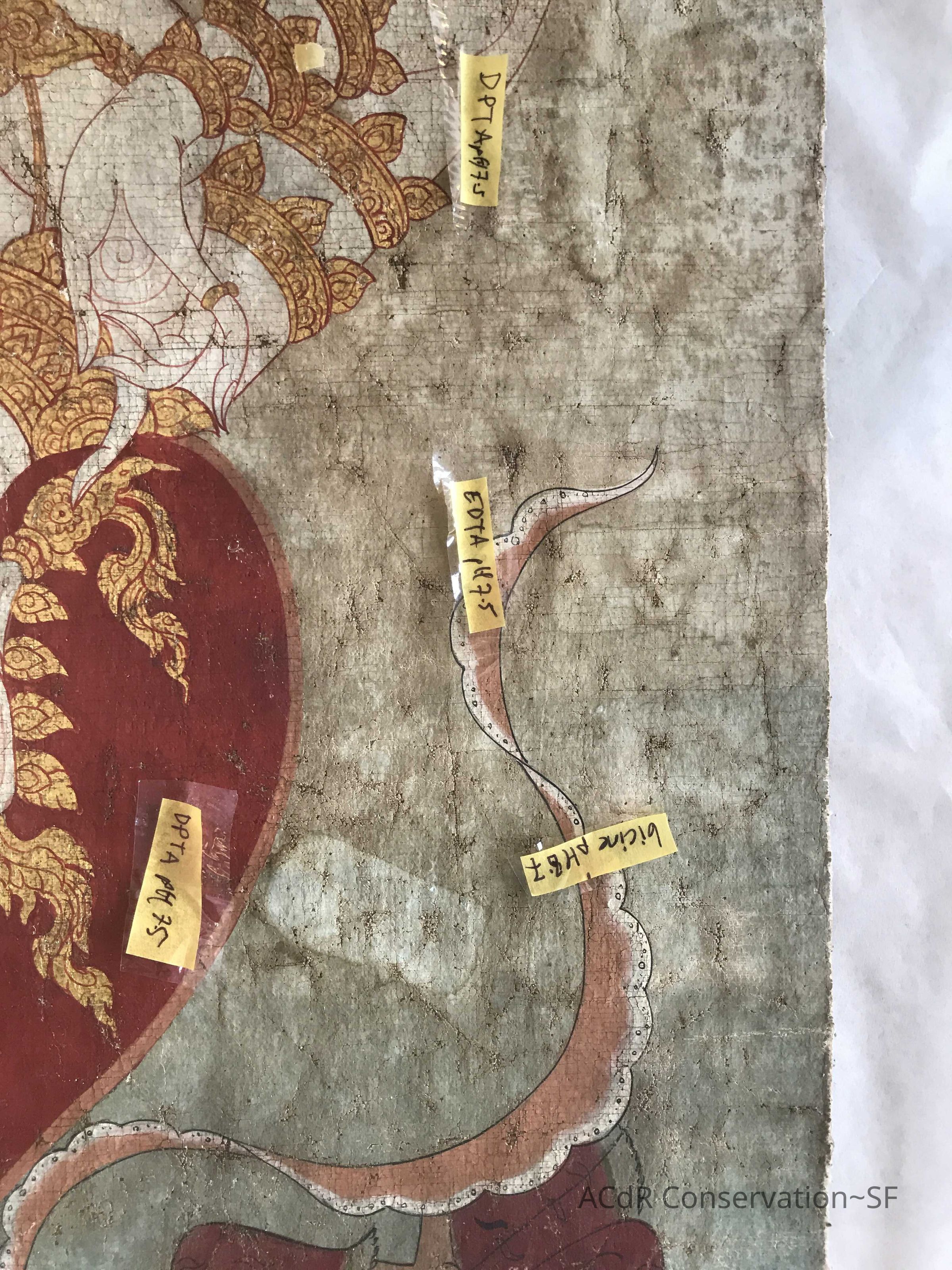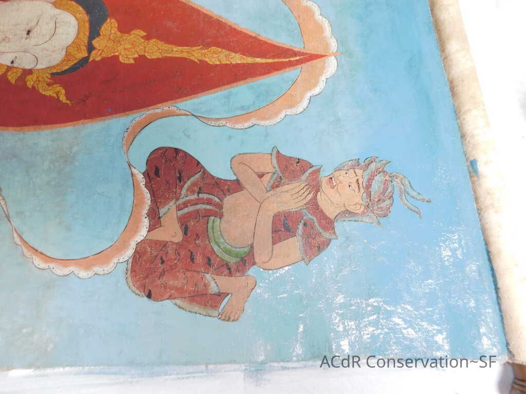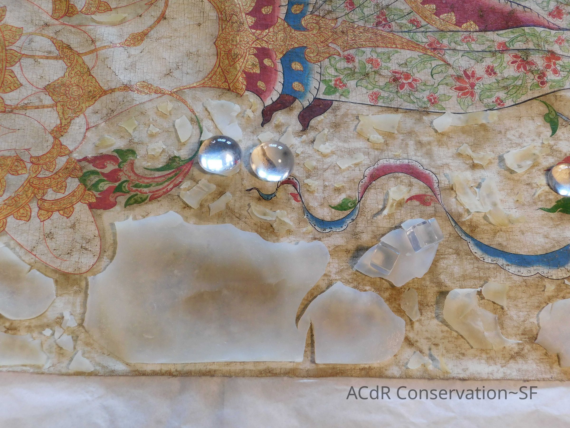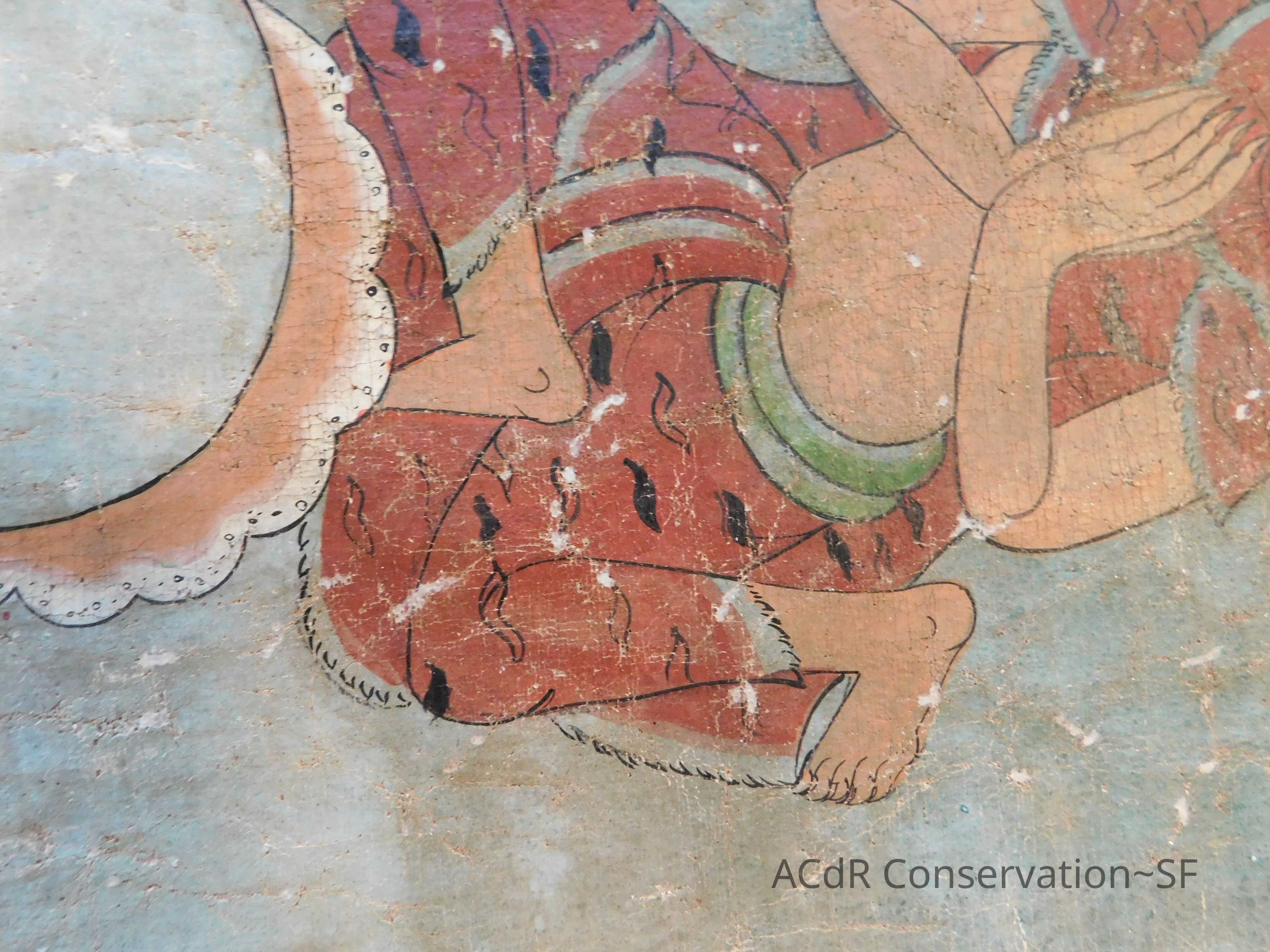Precise consolidation of the flaking paint with a brush using 4% methylcellulose in water.