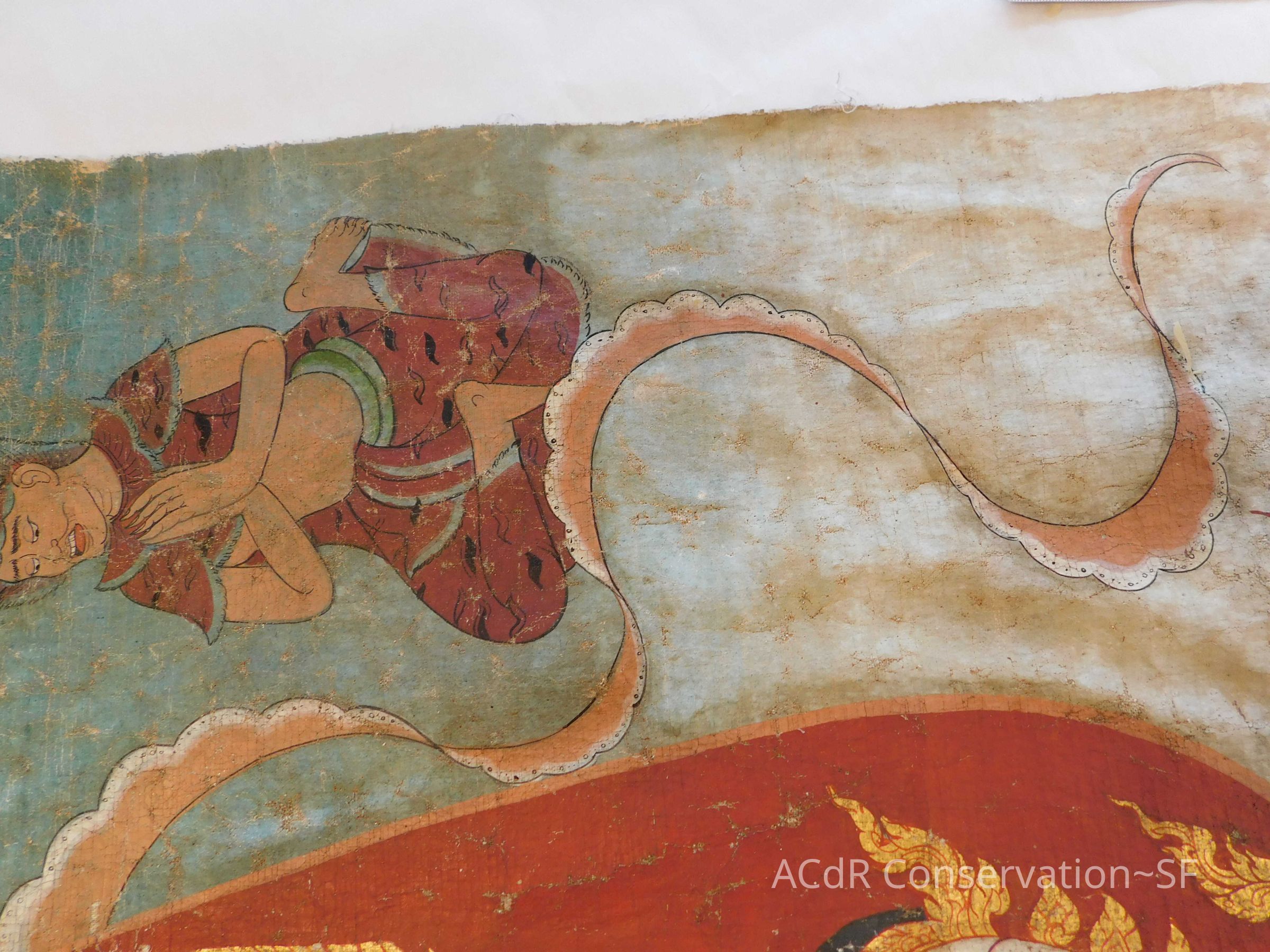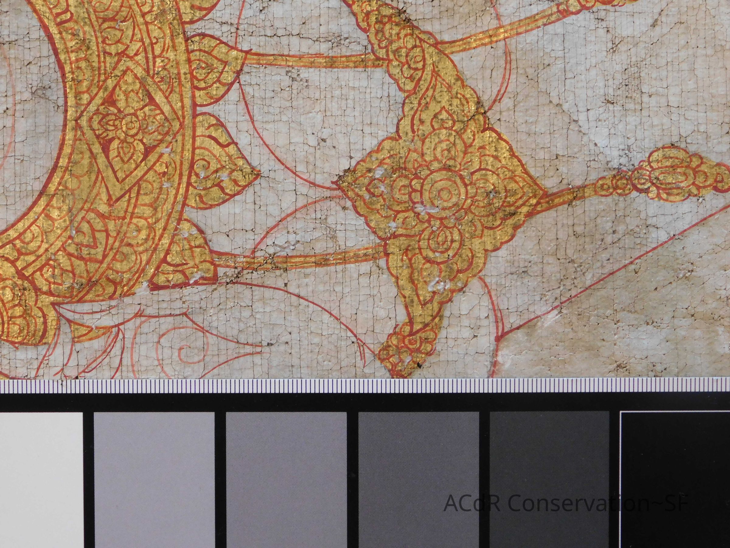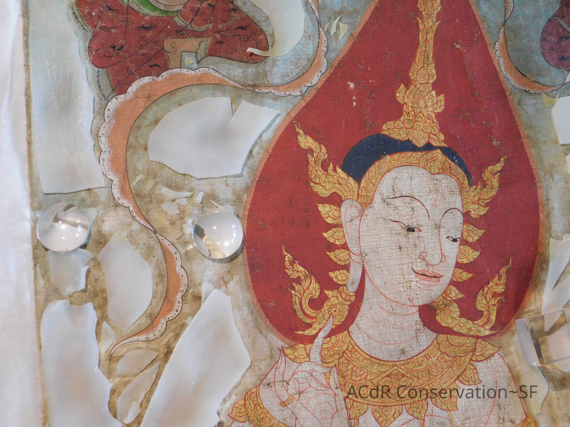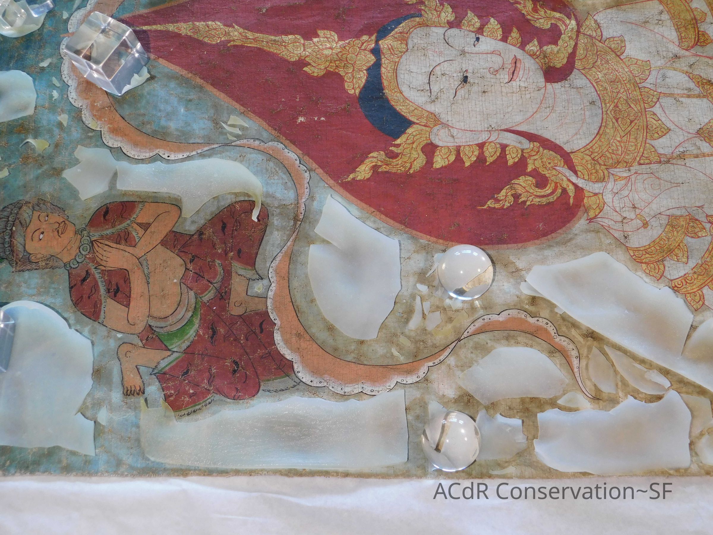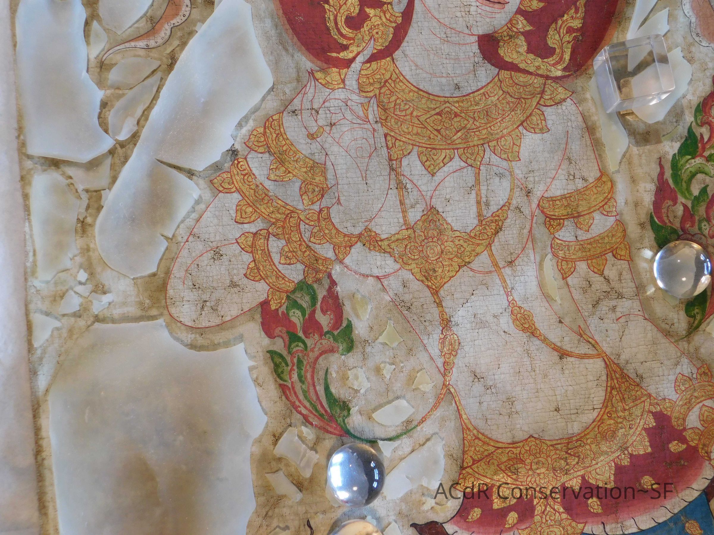 Precise consolidation of the flaking paint with a brush using 4% methylcellulose in water.