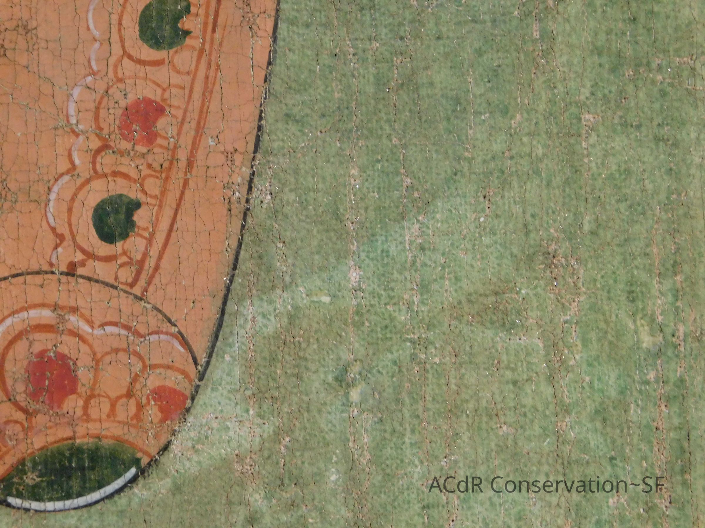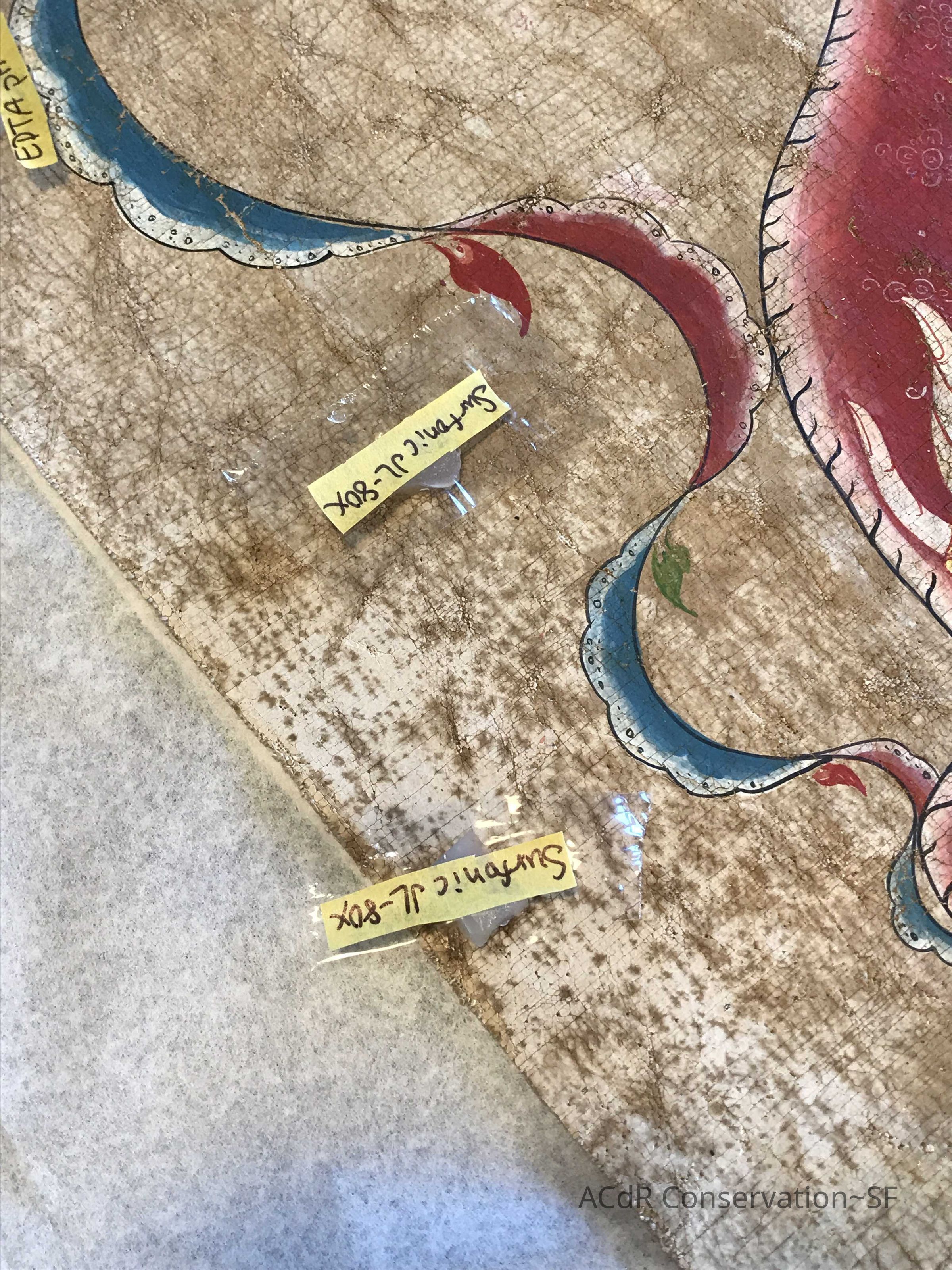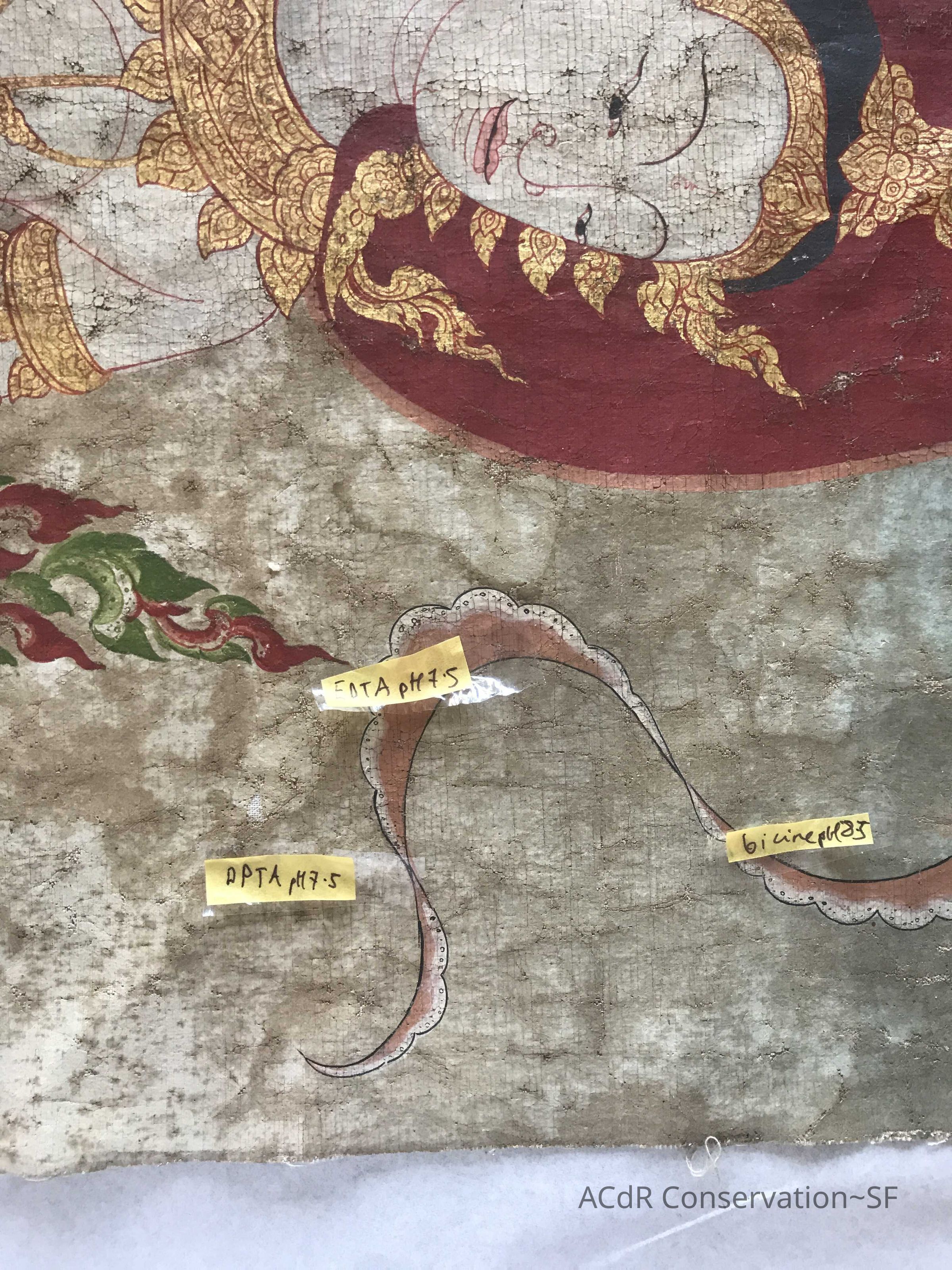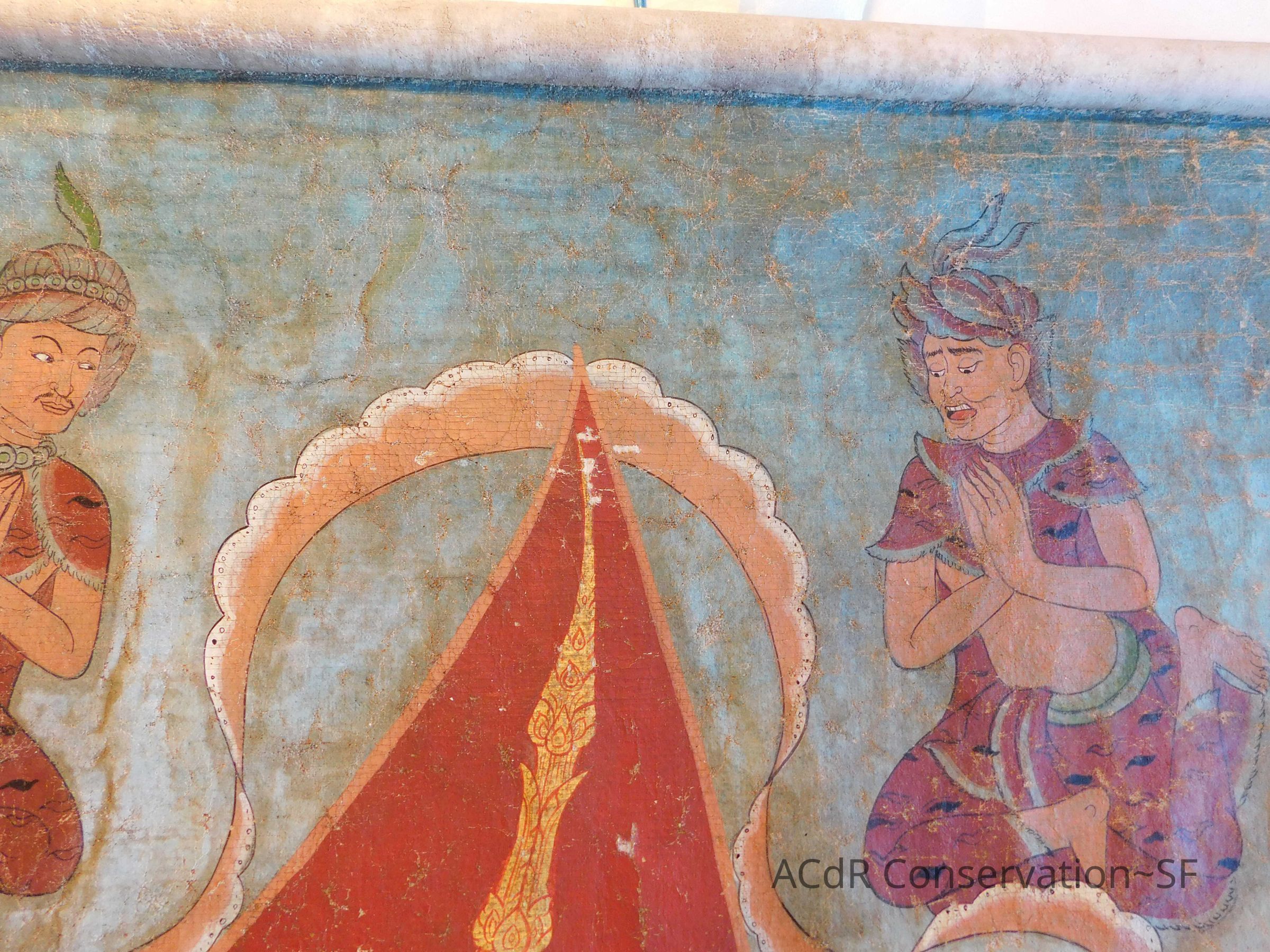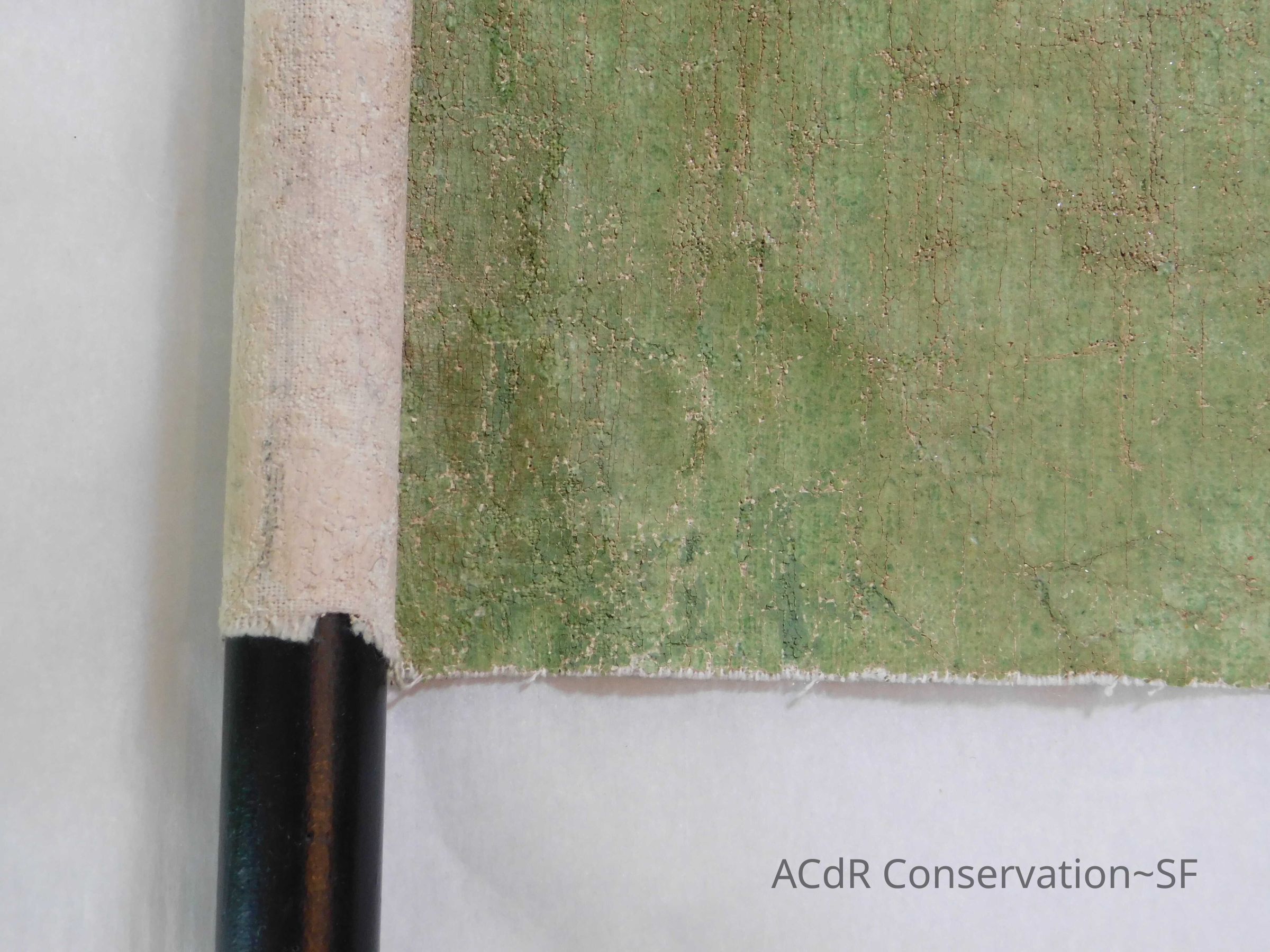 Precise consolidation of the flaking paint with a brush using 4% methylcellulose in water.