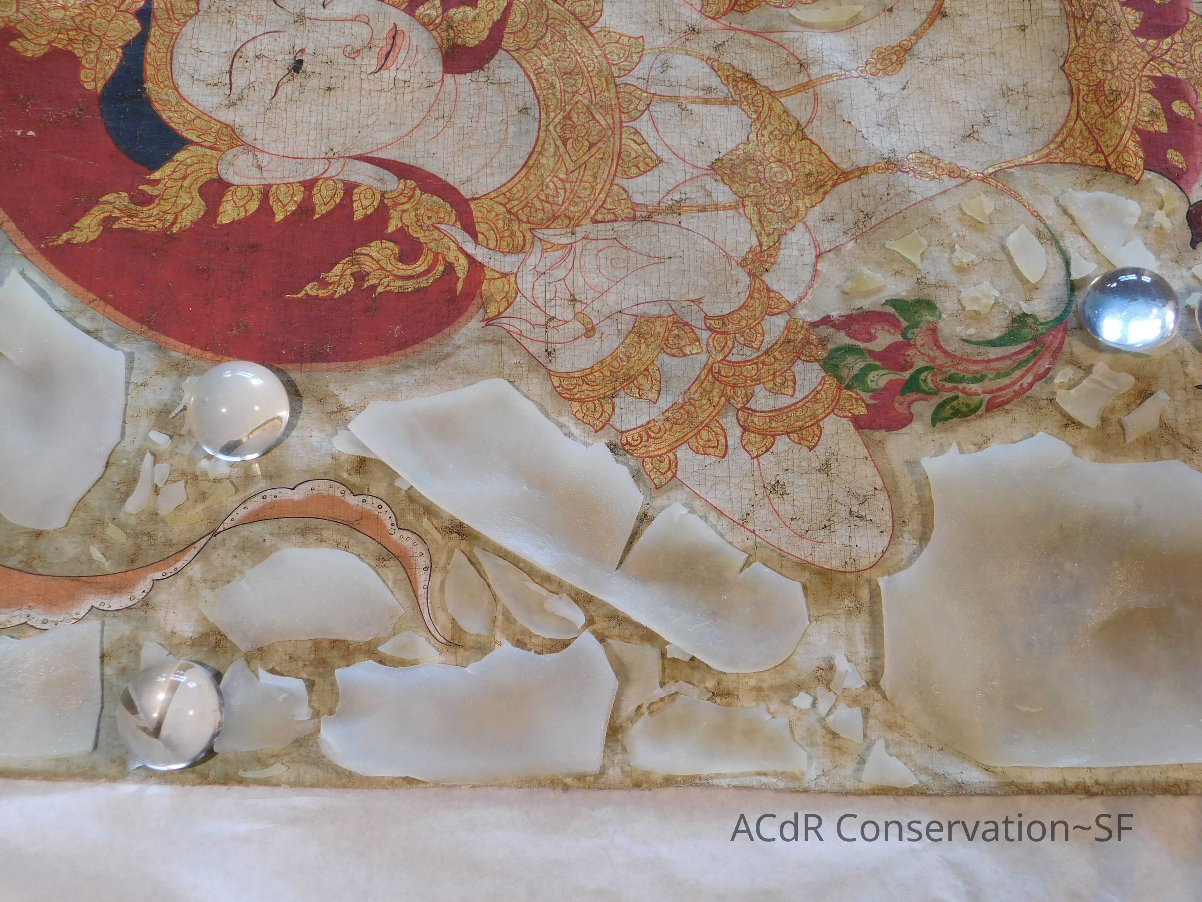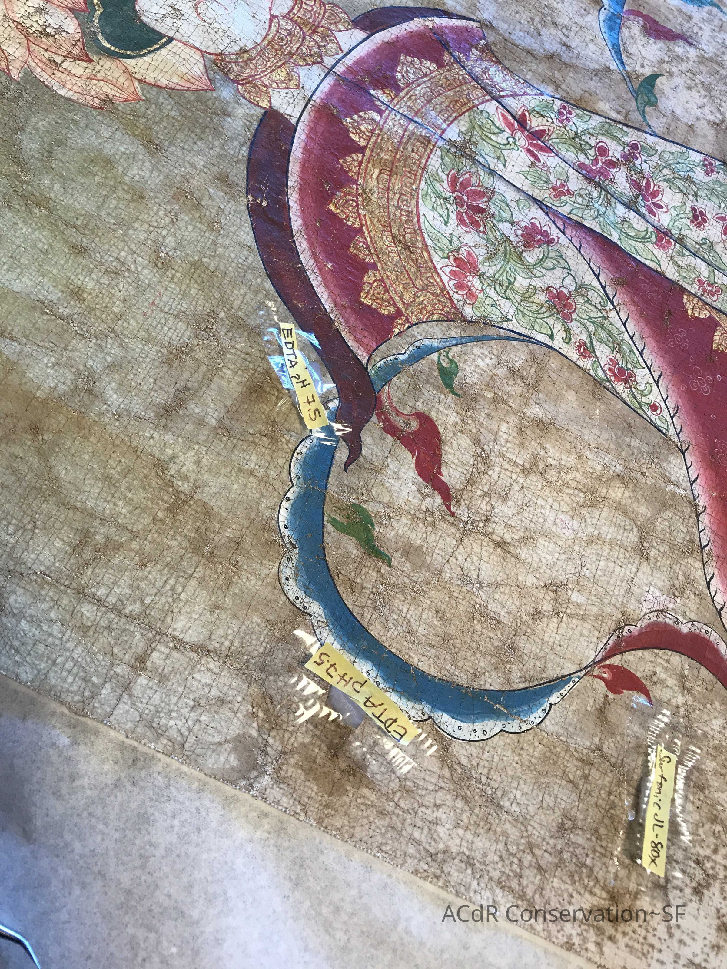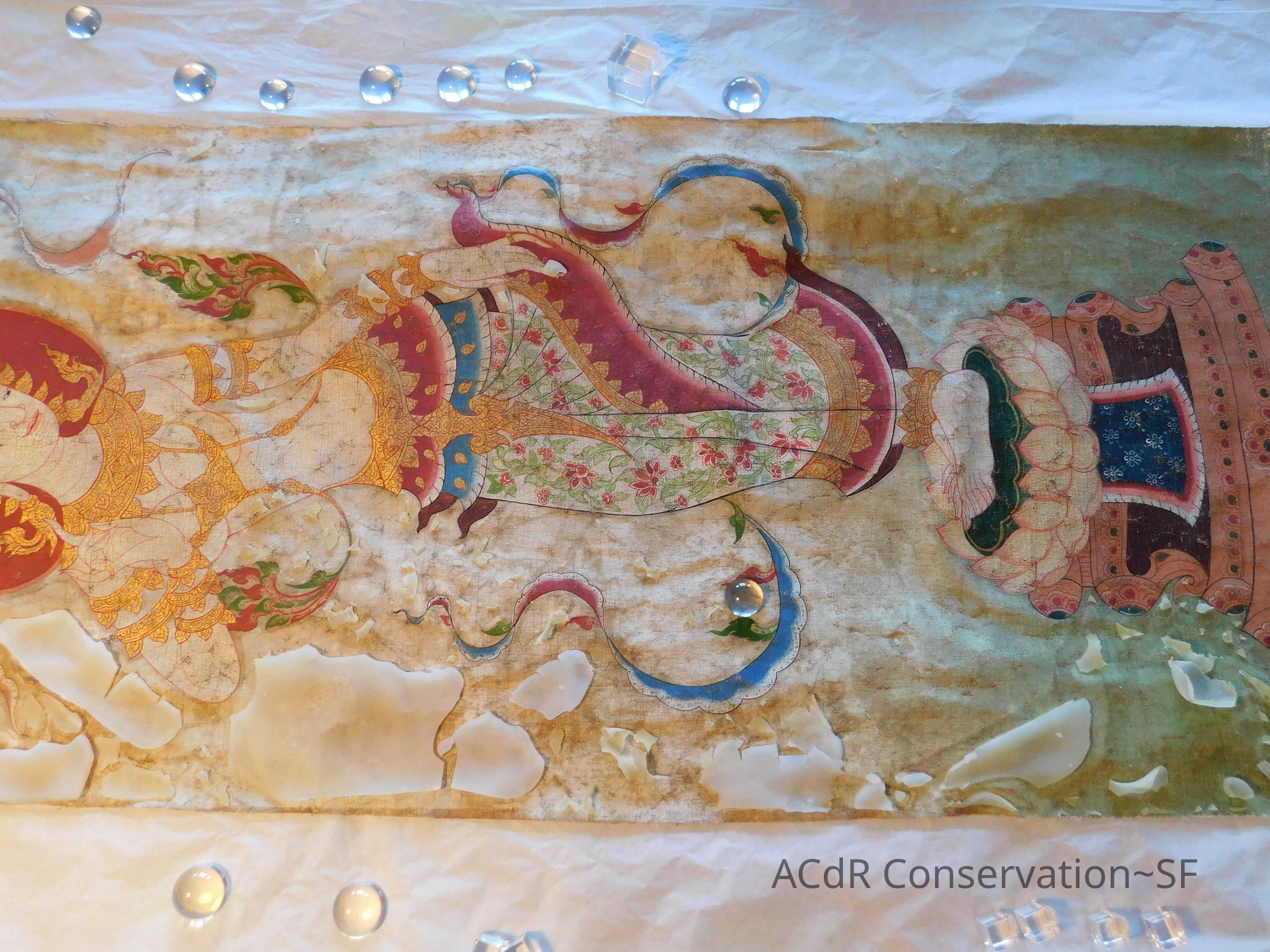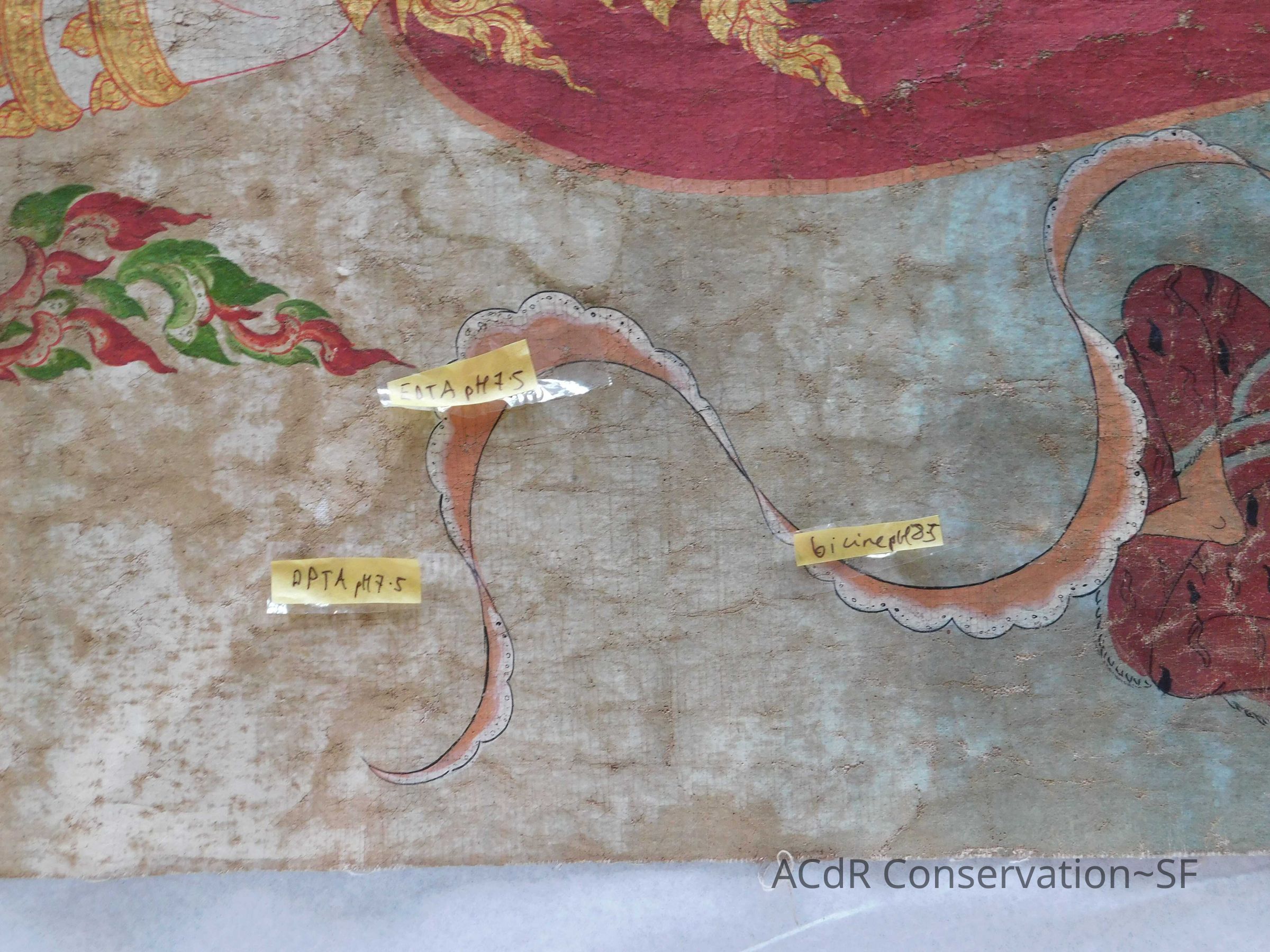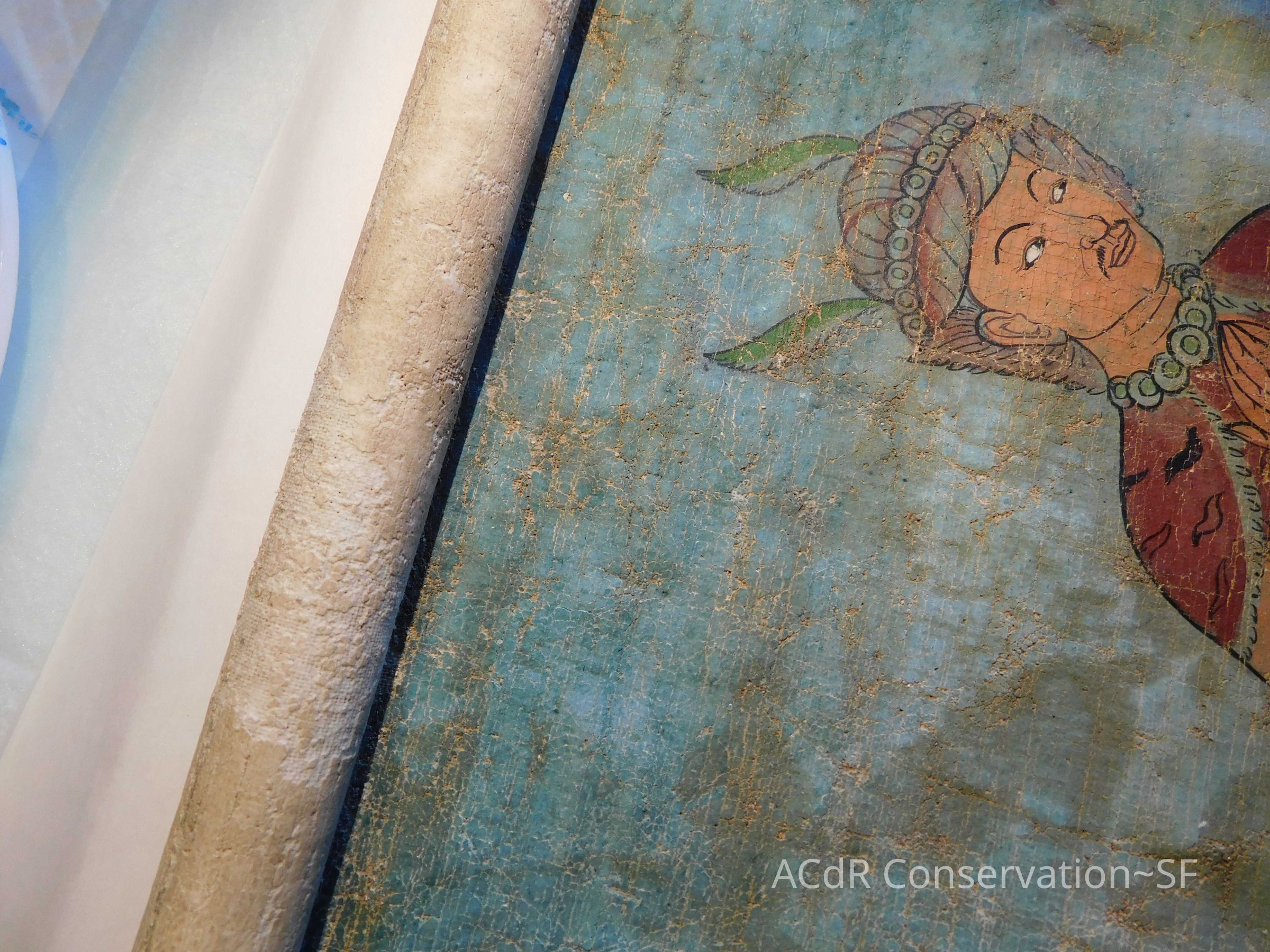 Precise consolidation of the flaking paint with a brush using 4% methylcellulose in water.