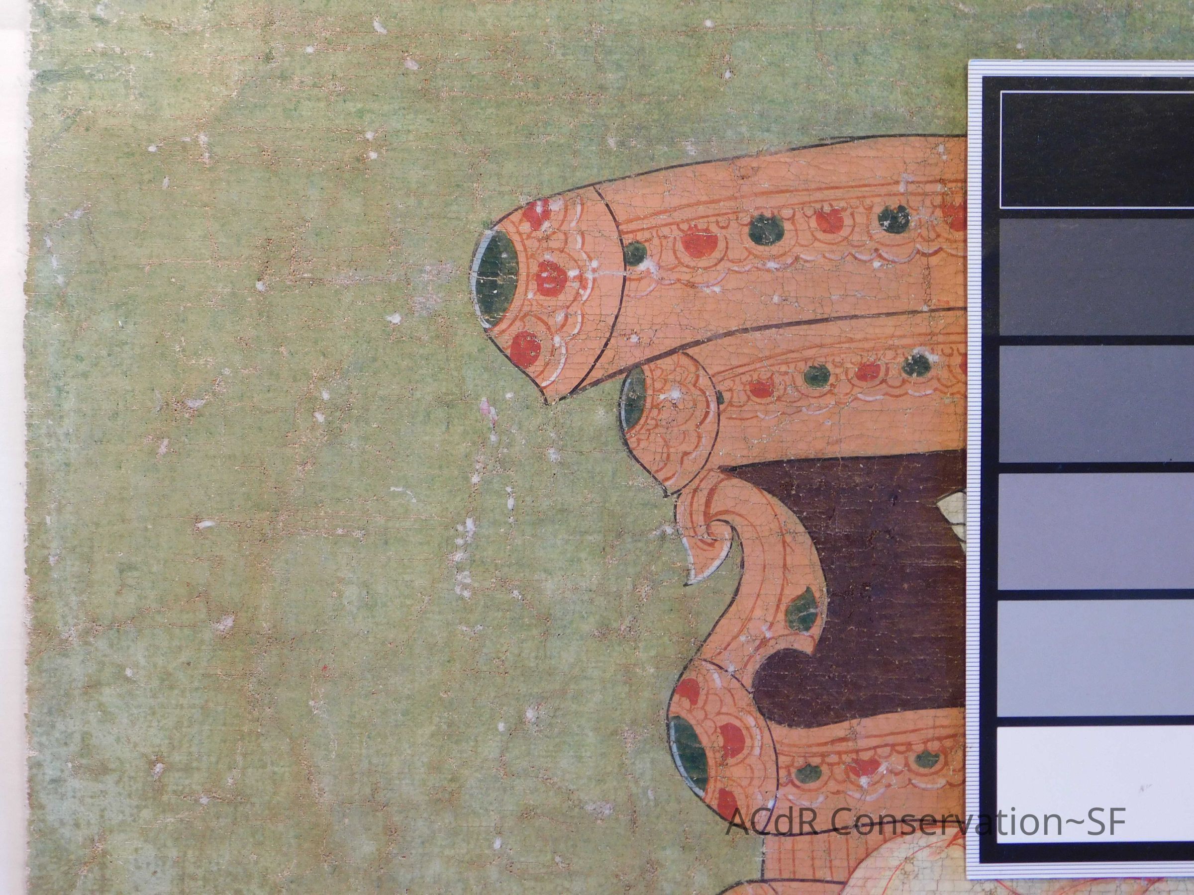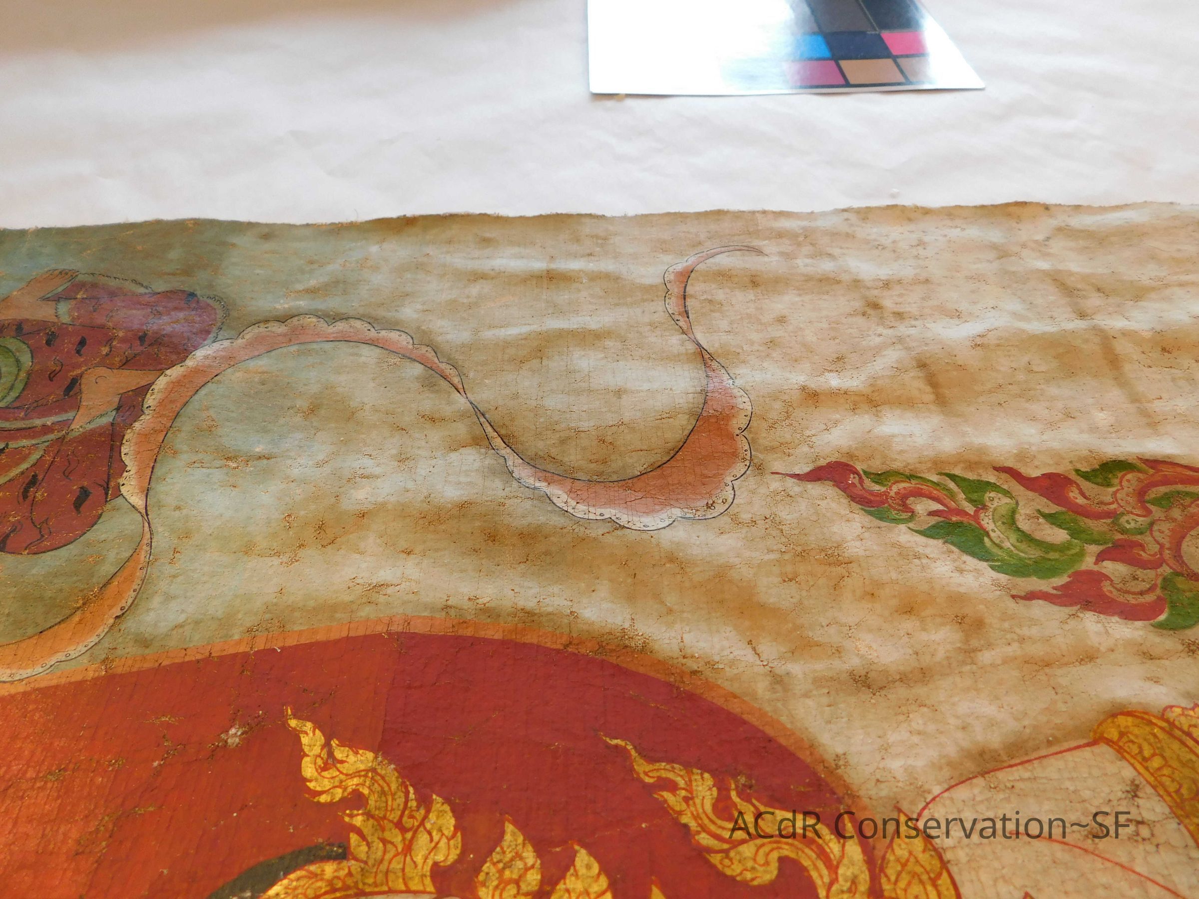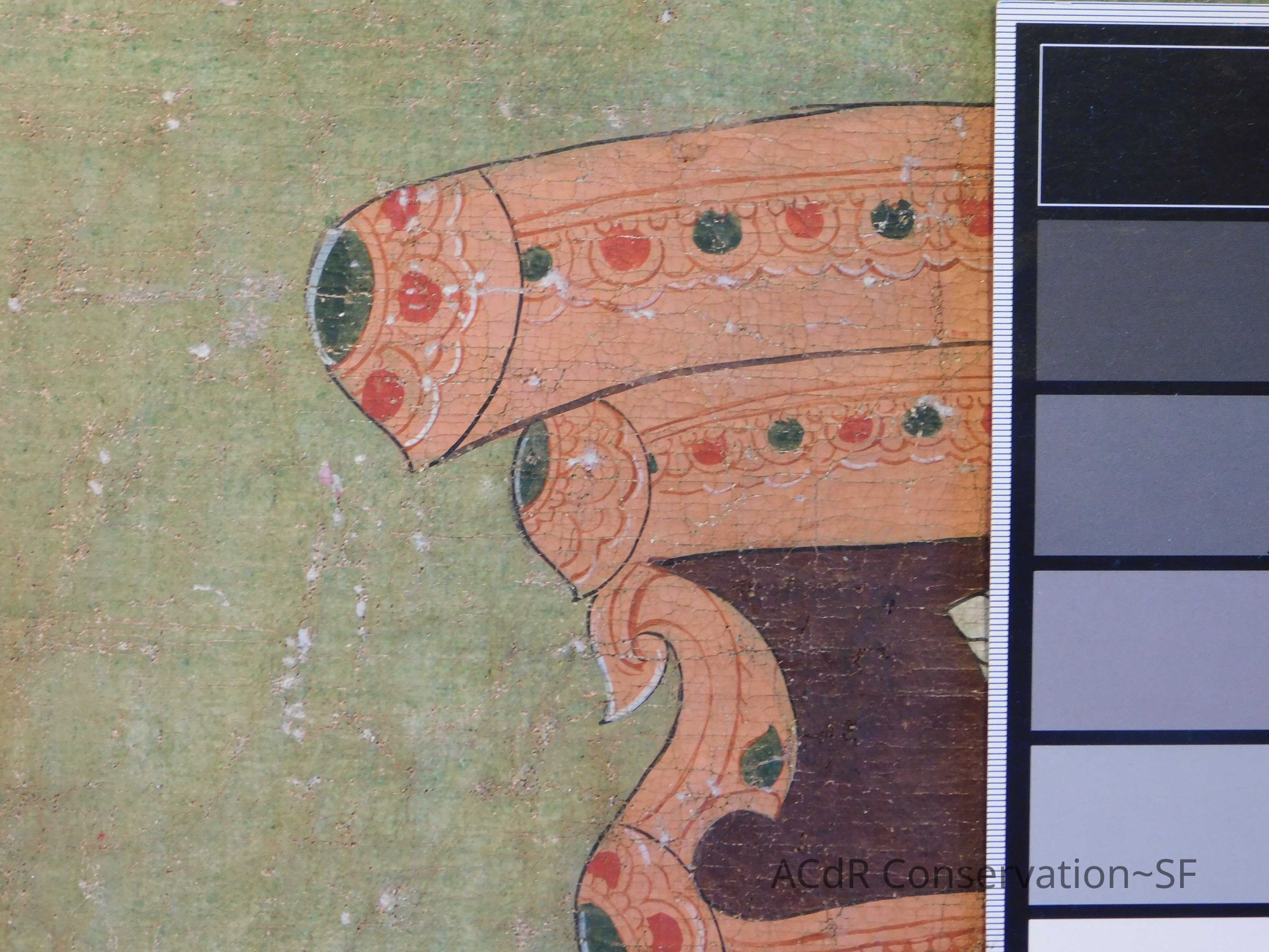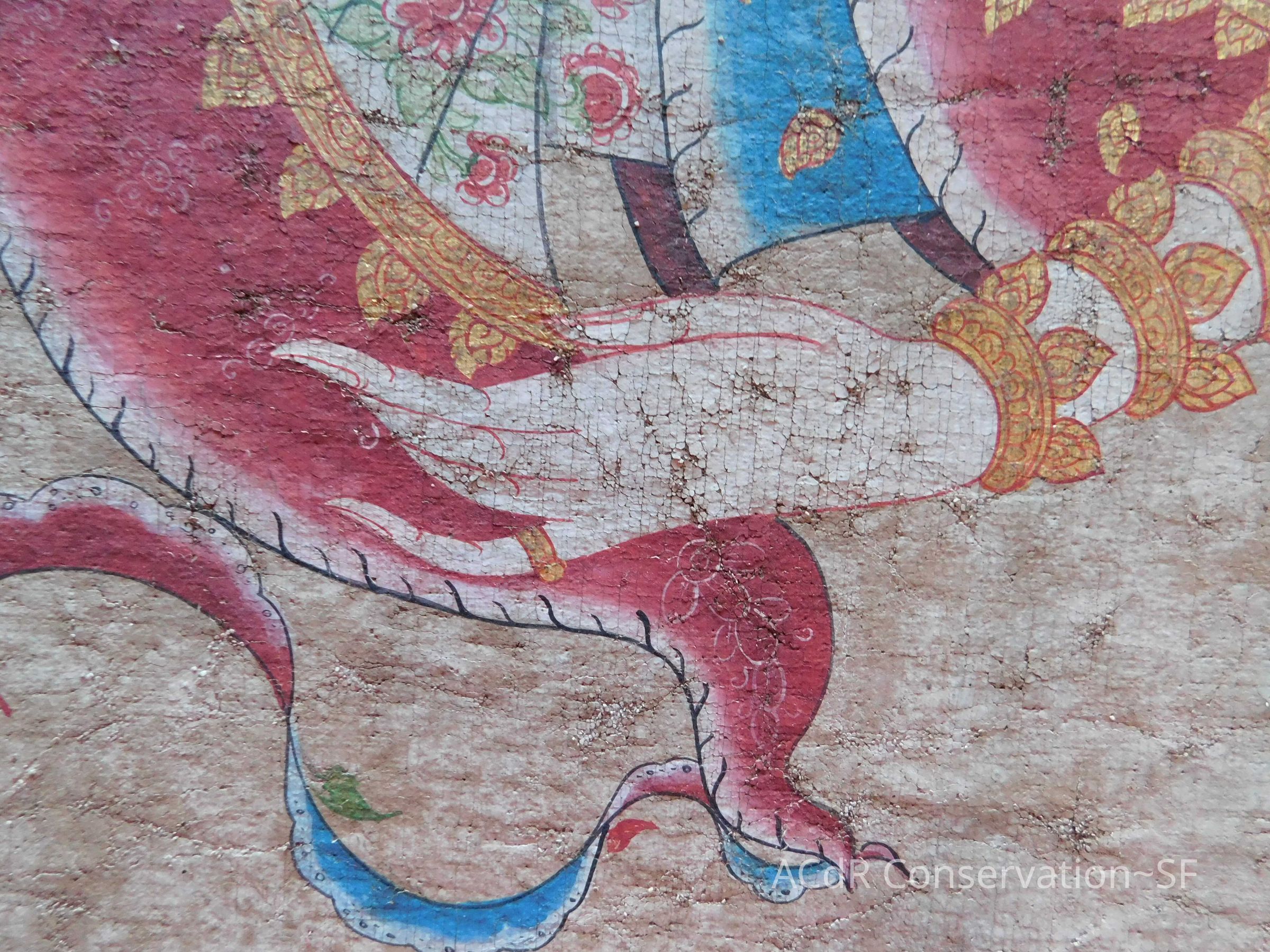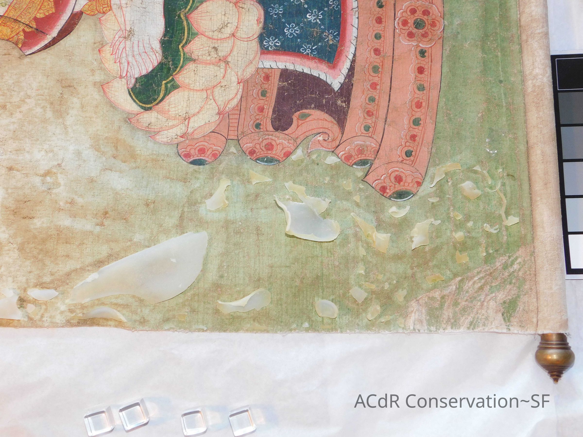 Precise consolidation of the flaking paint with a brush using 4% methylcellulose in water.