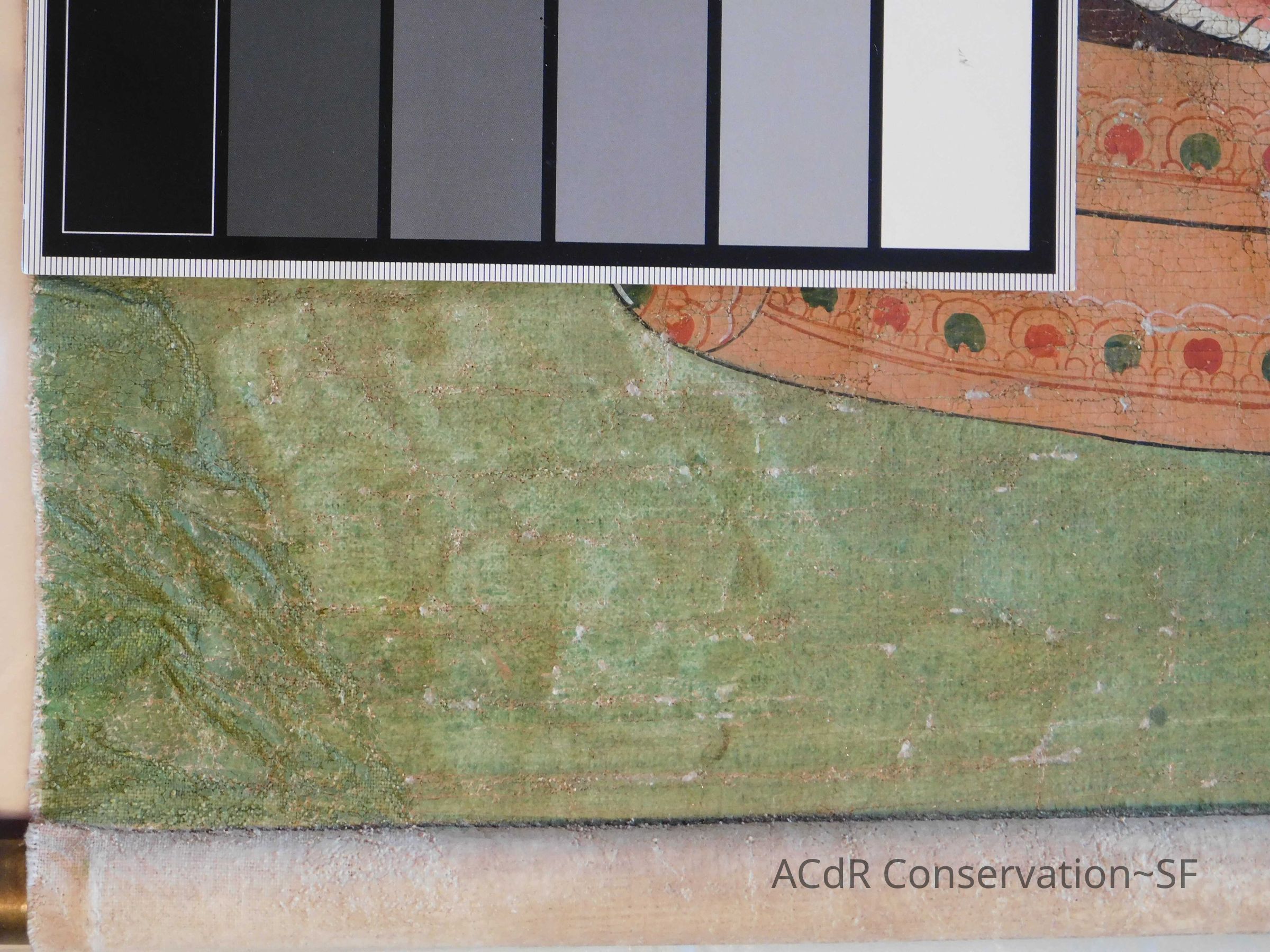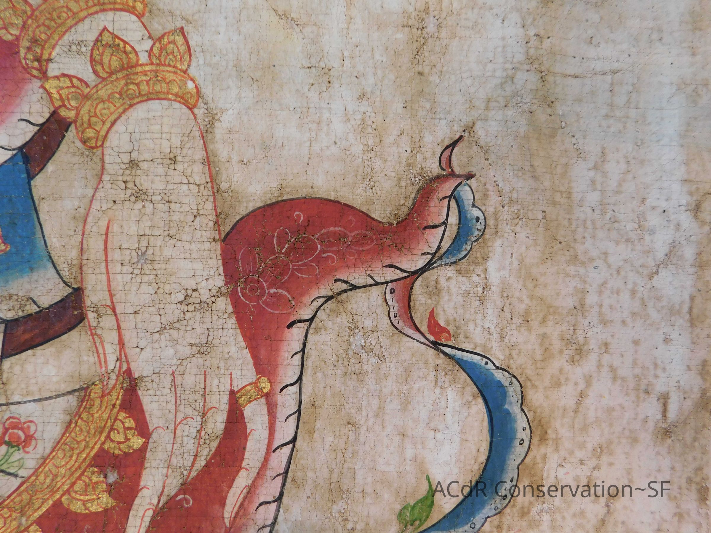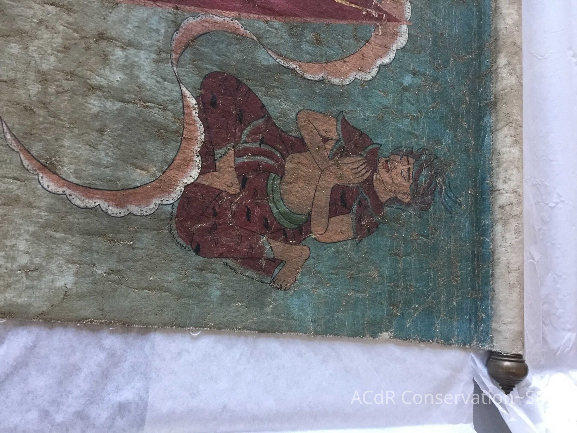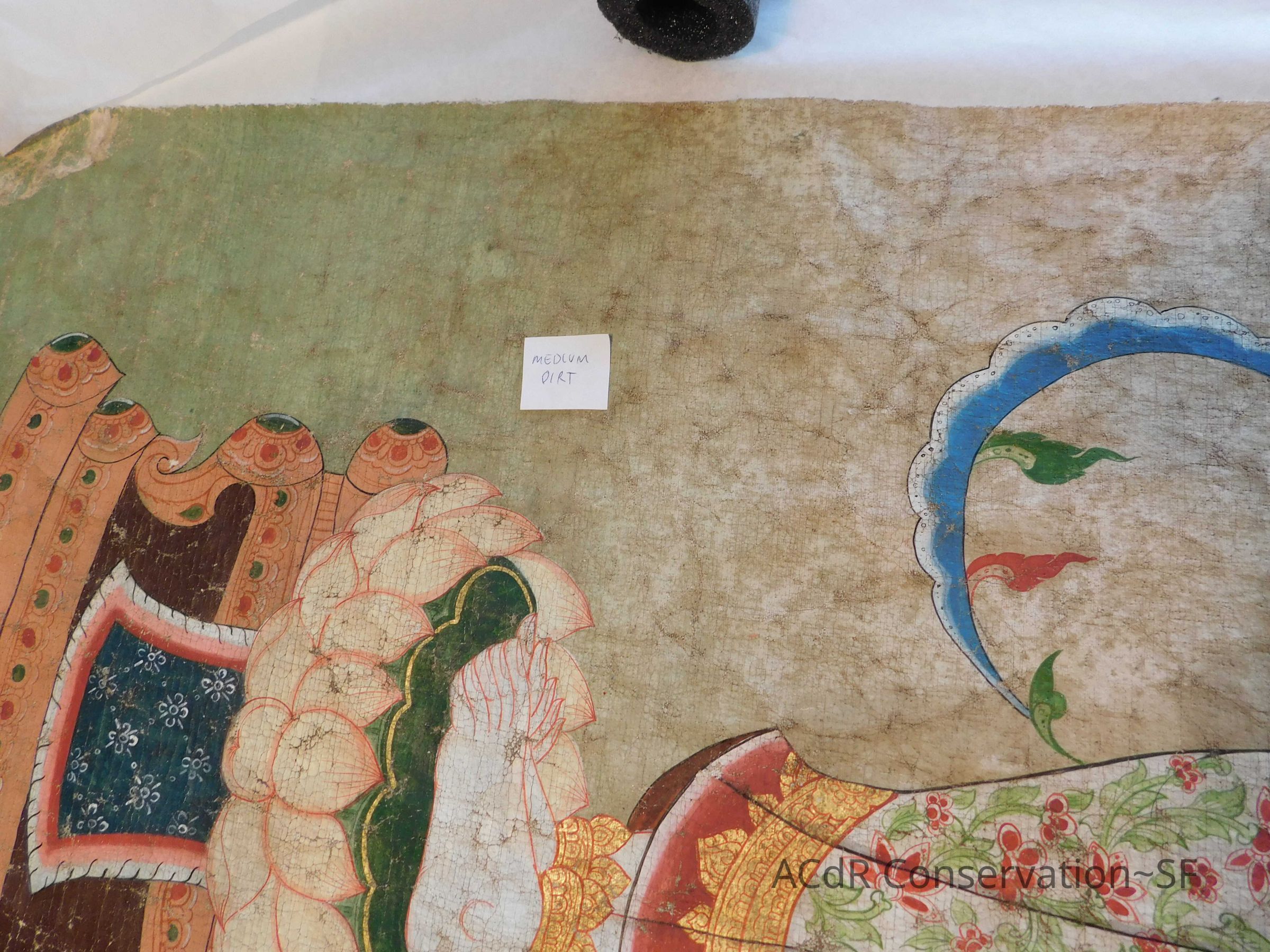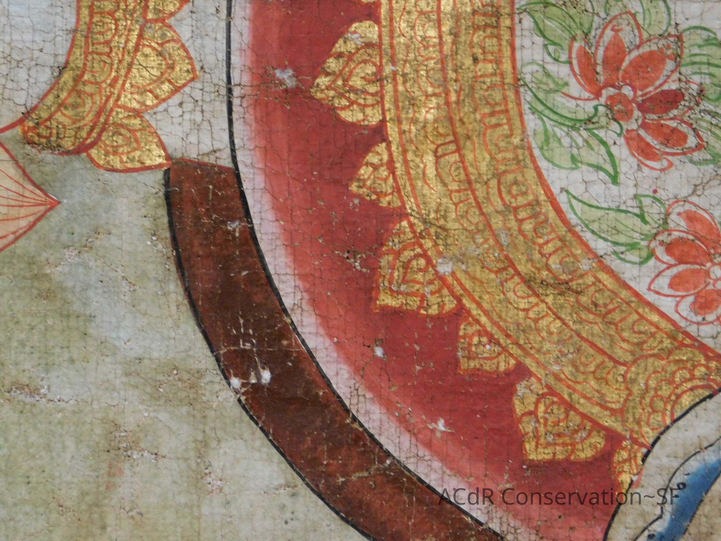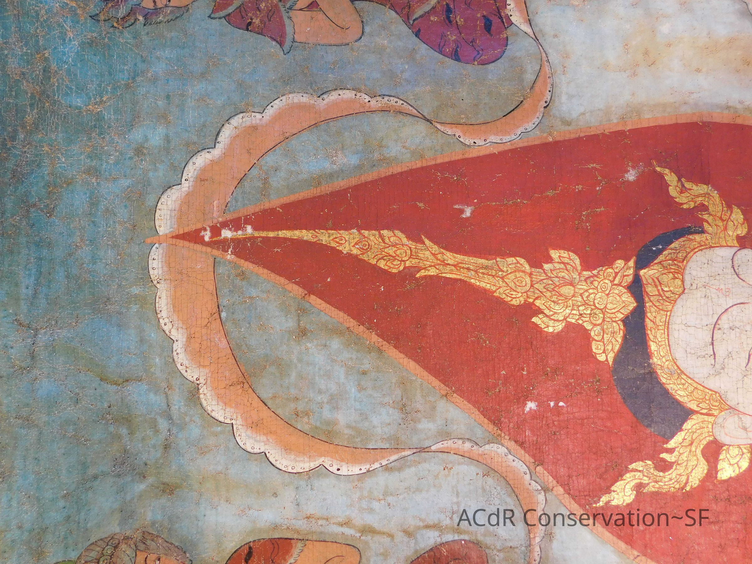 Precise consolidation of the flaking paint with a brush using 4% methylcellulose in water.