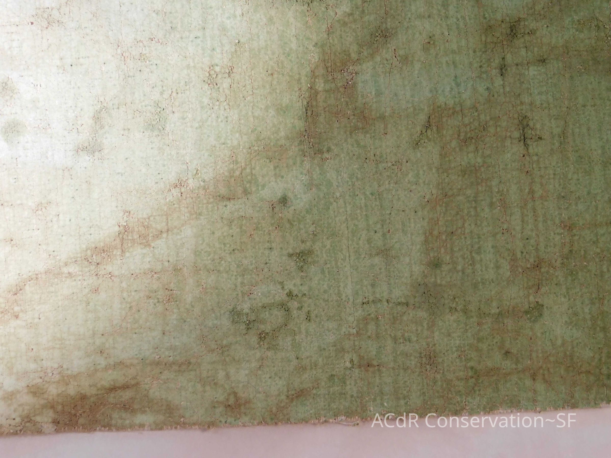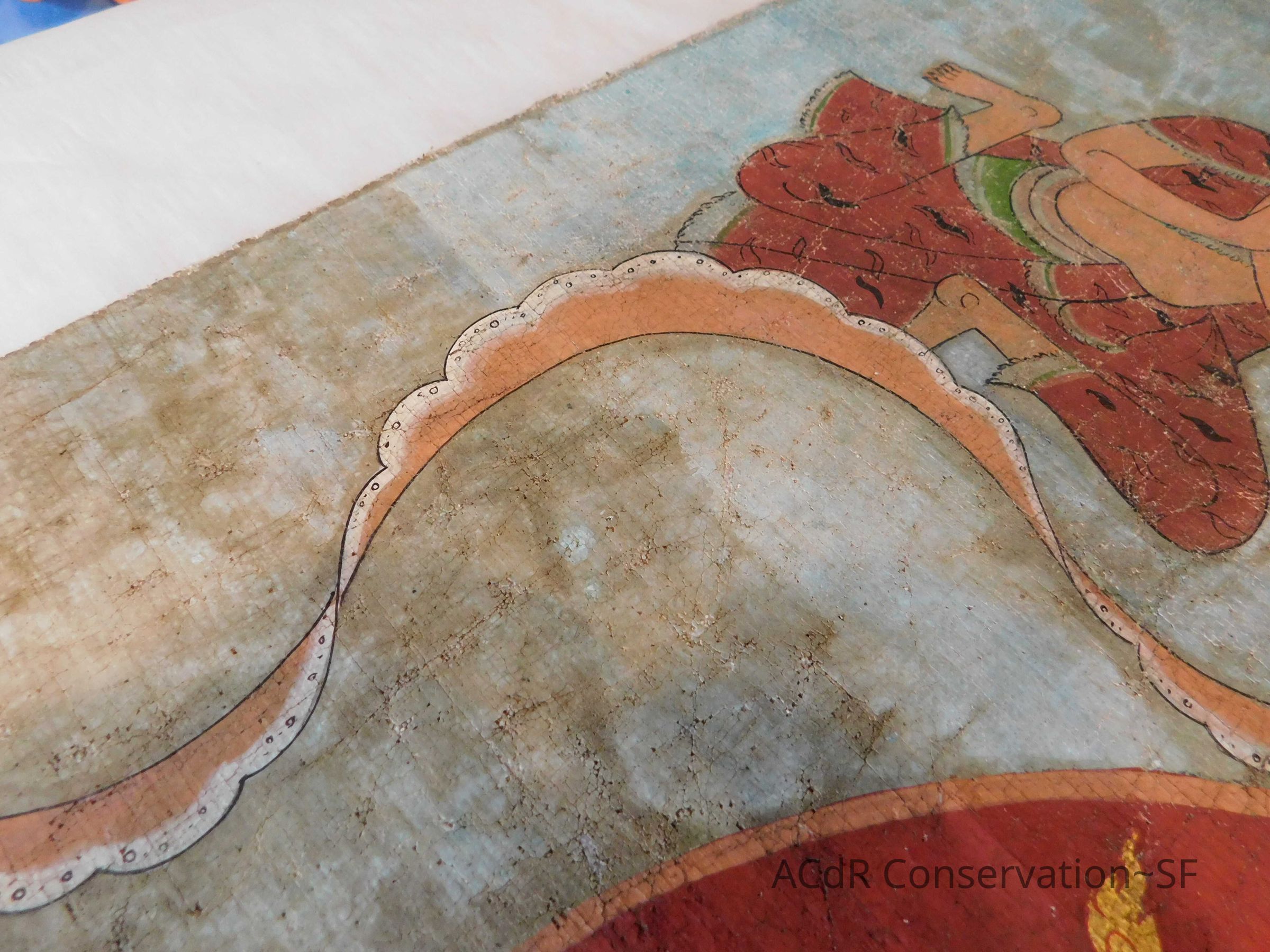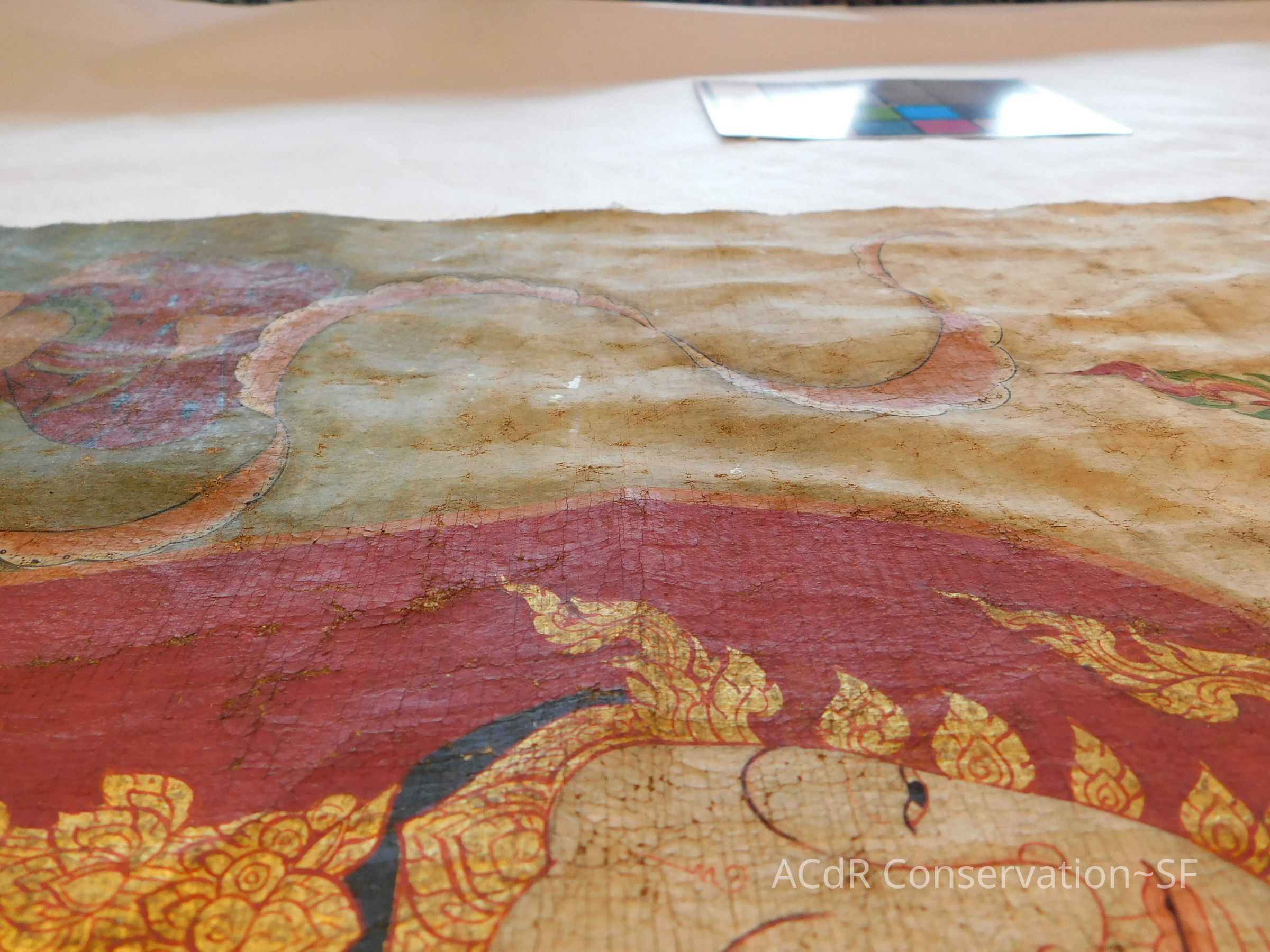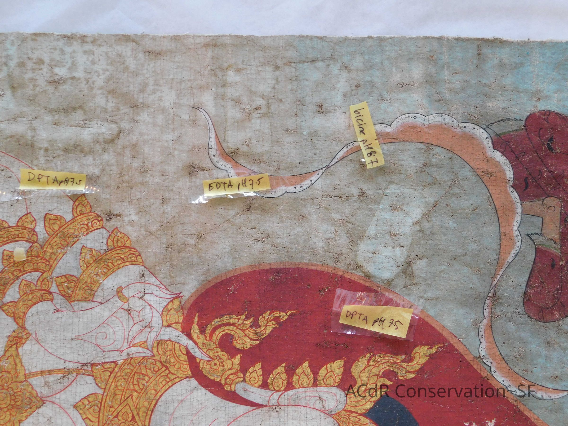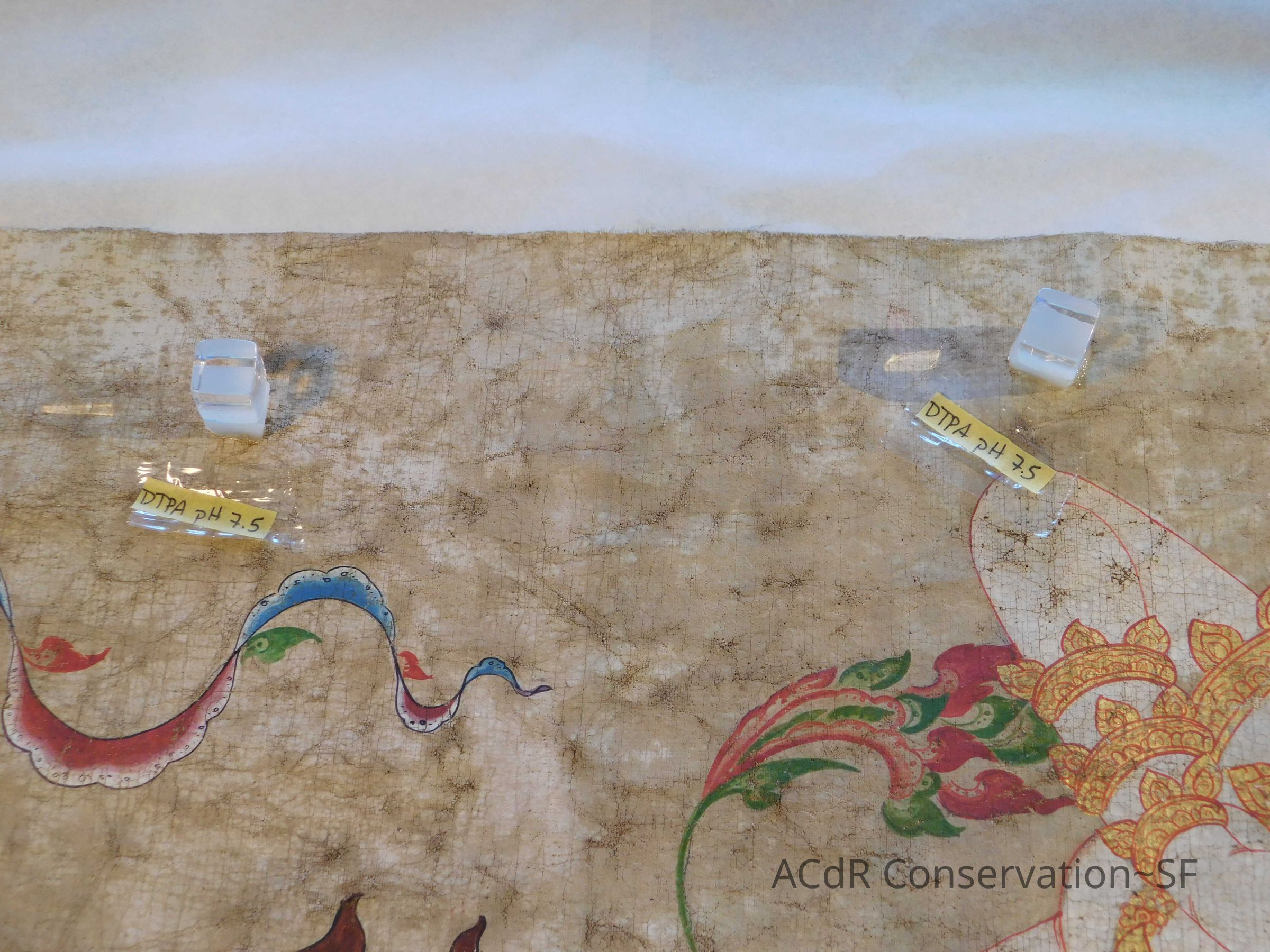Precise consolidation of the flaking paint with a brush using 4% methylcellulose in water.