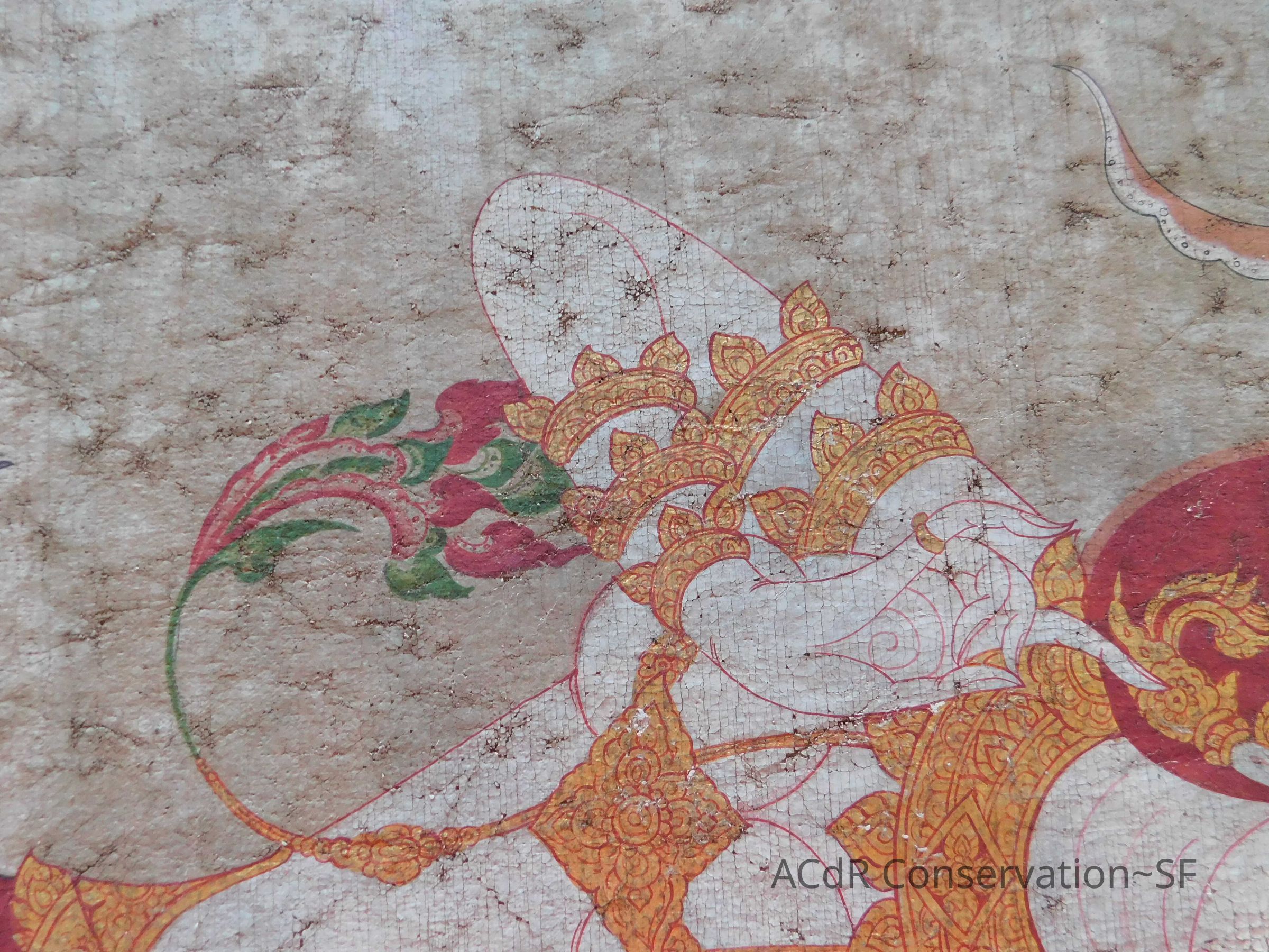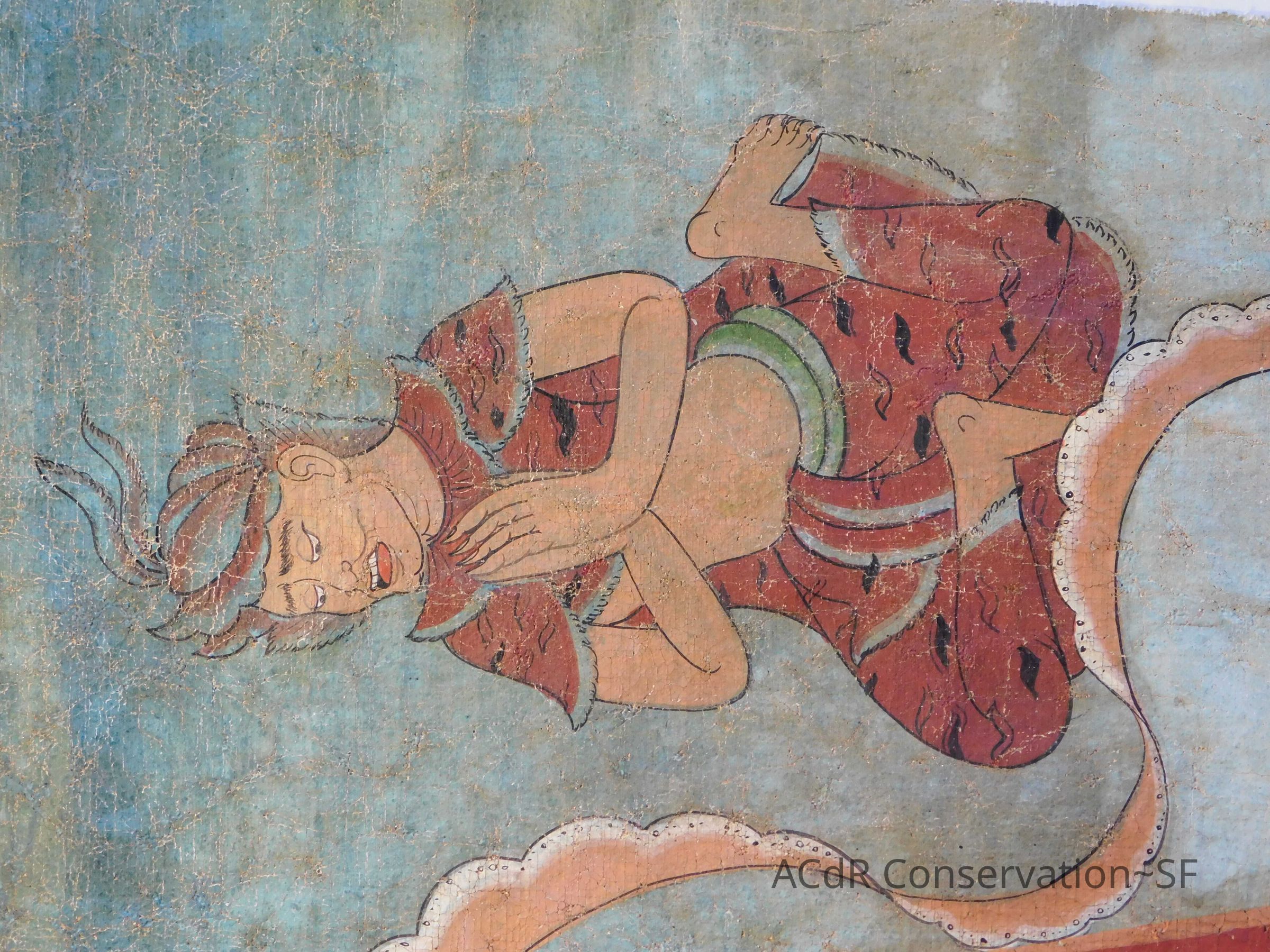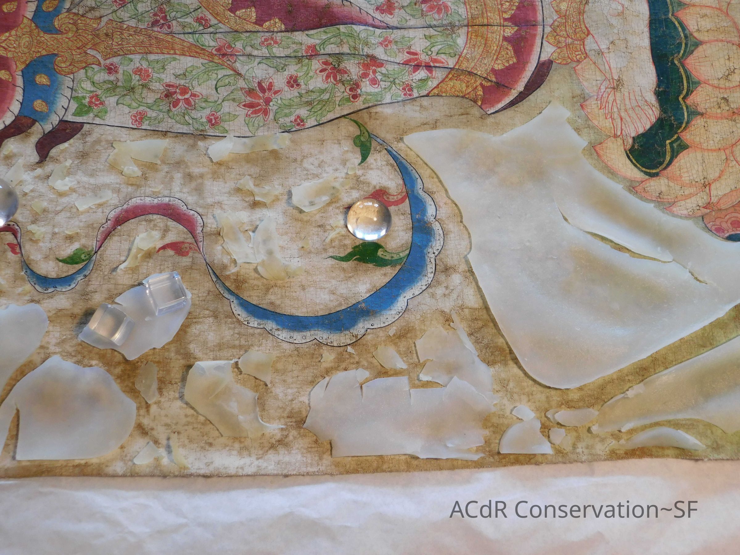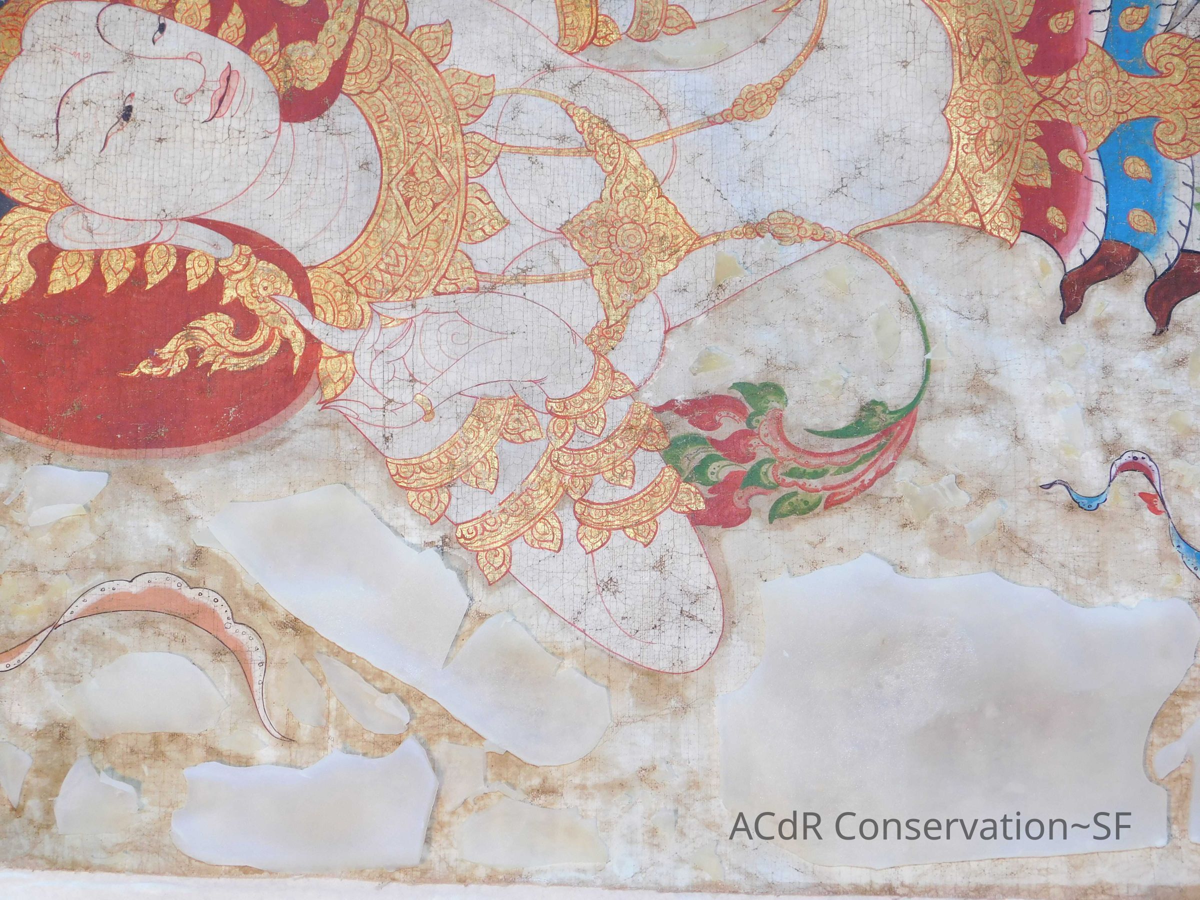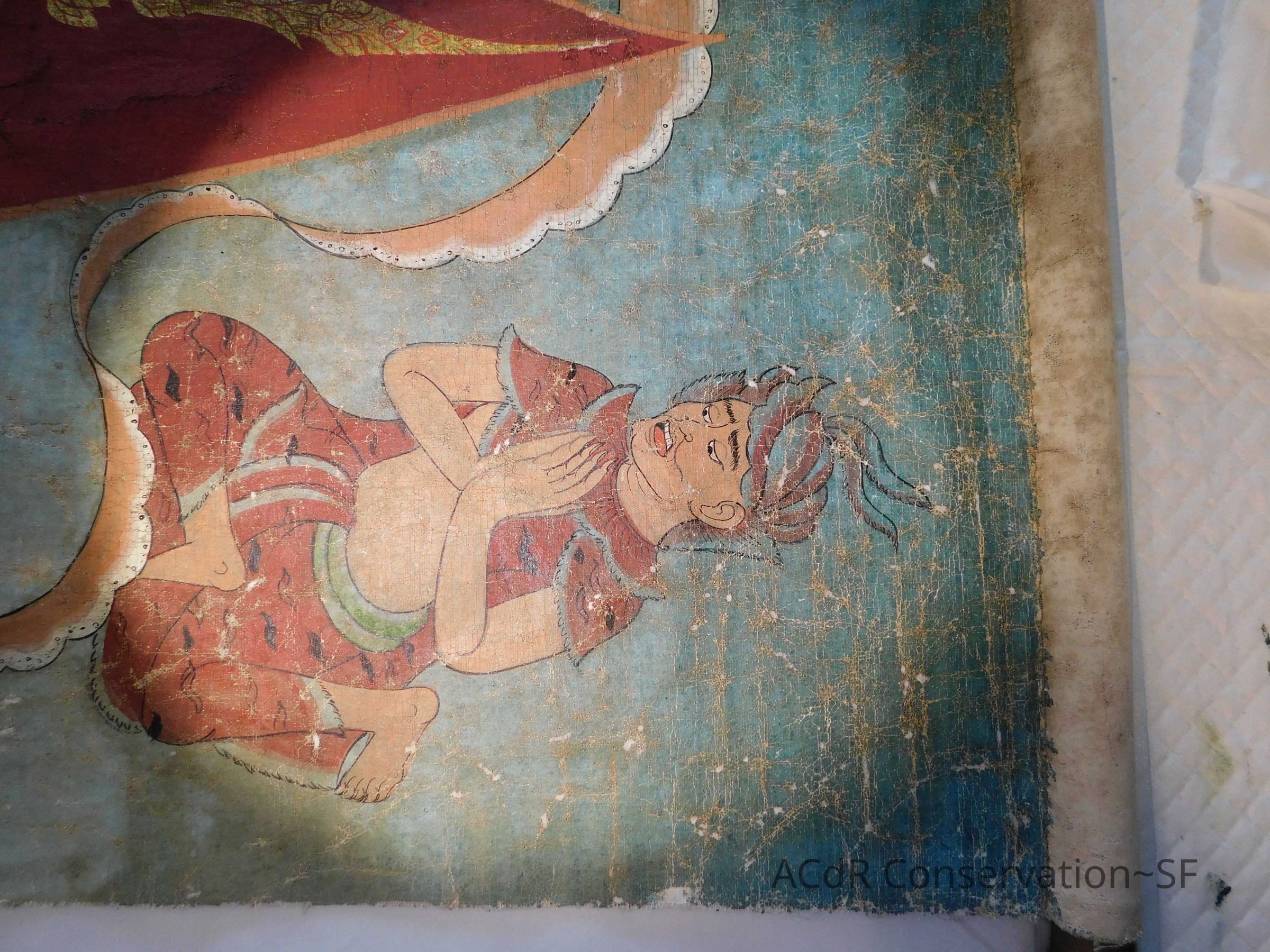 Precise consolidation of the flaking paint with a brush using 4% methylcellulose in water.