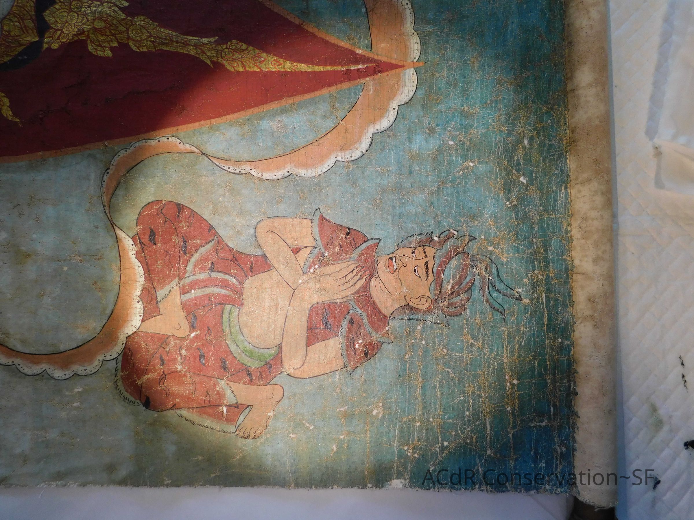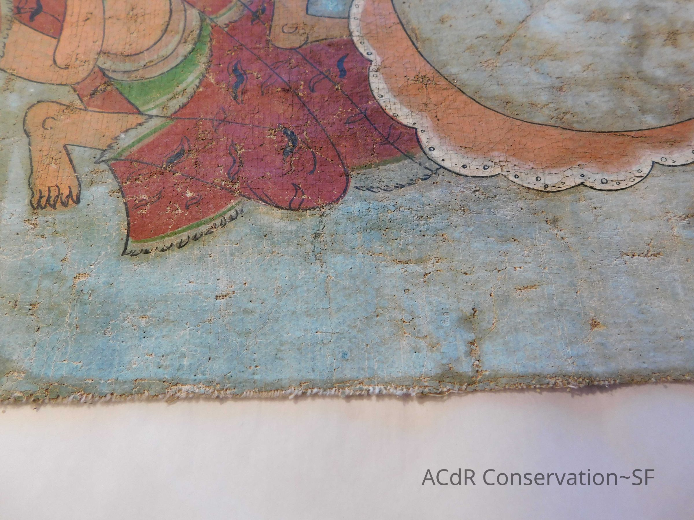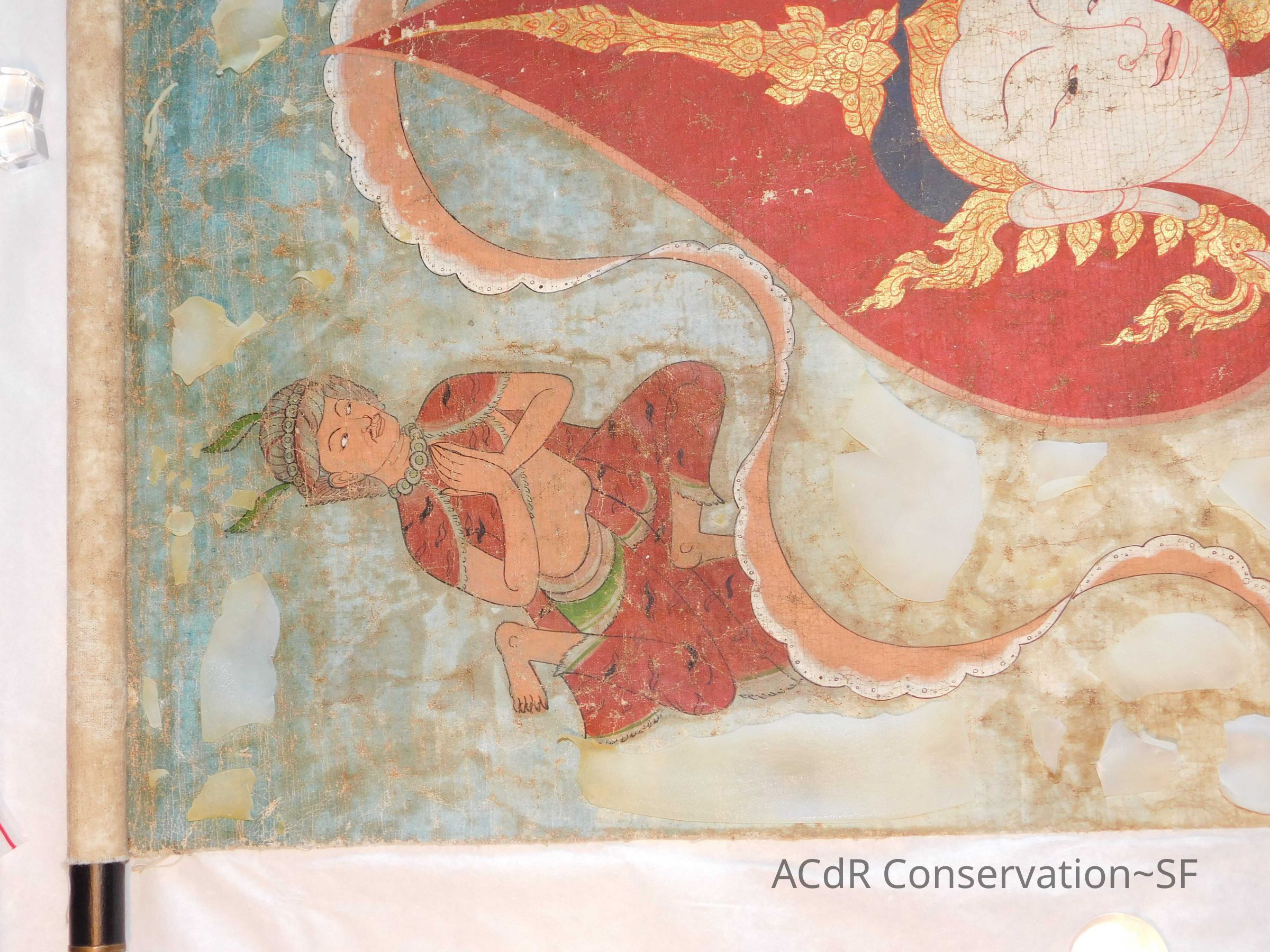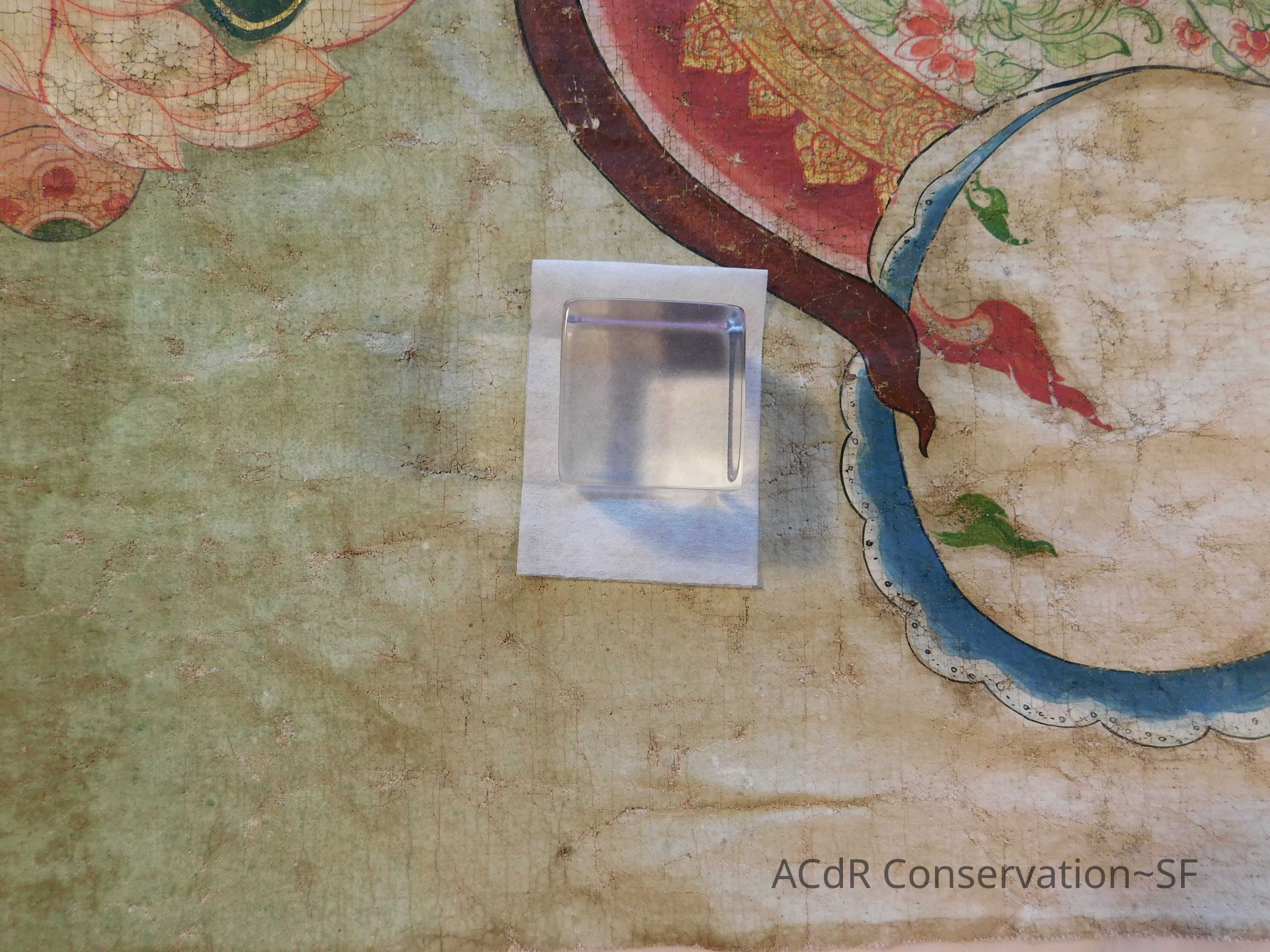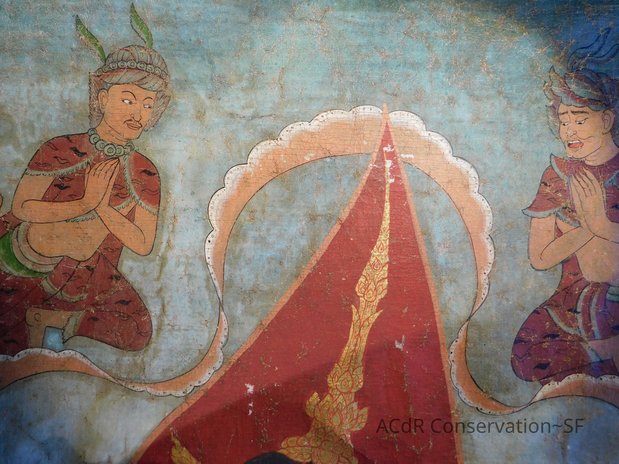 Precise consolidation of the flaking paint with a brush using 4% methylcellulose in water.