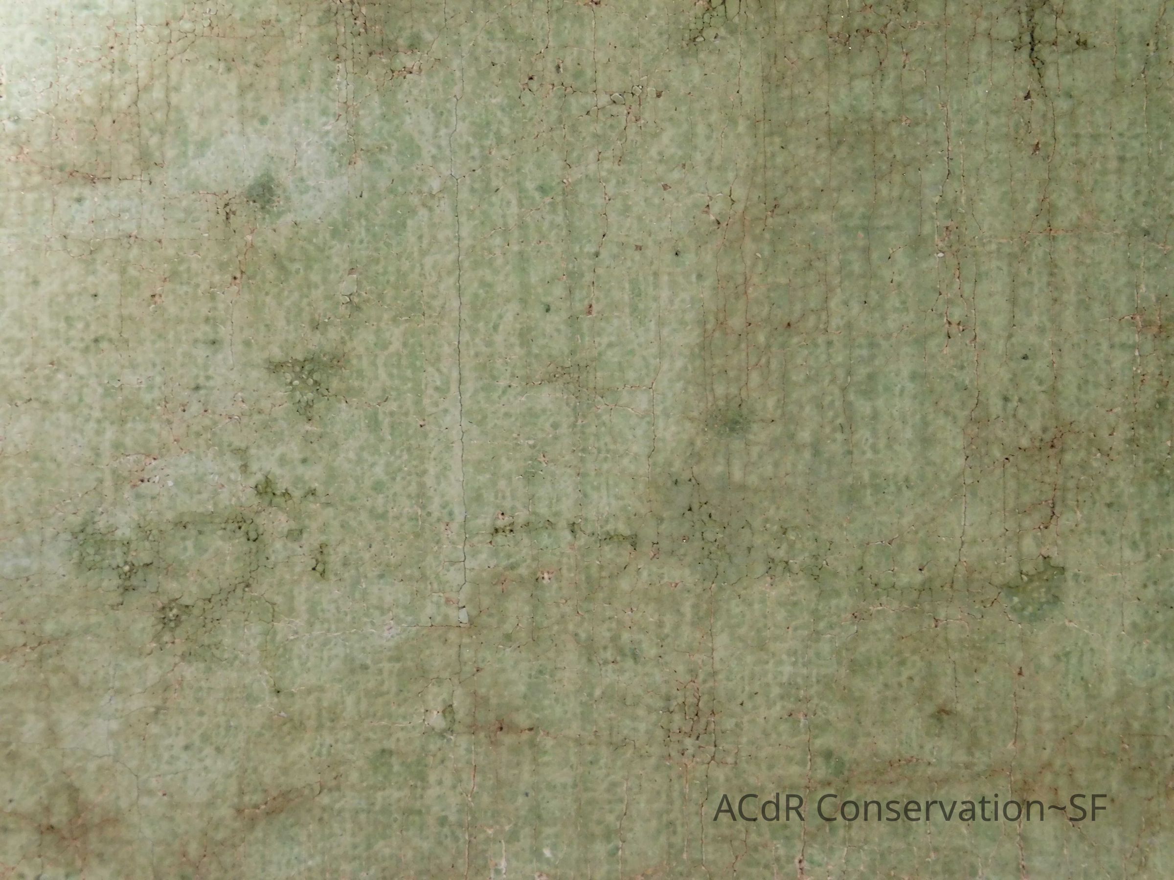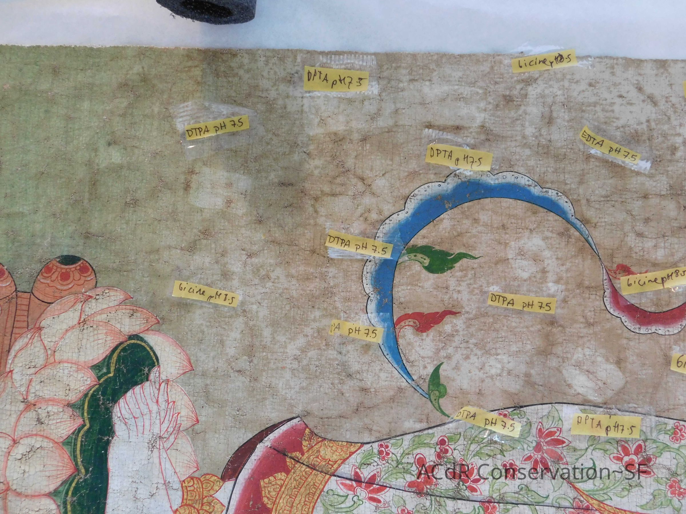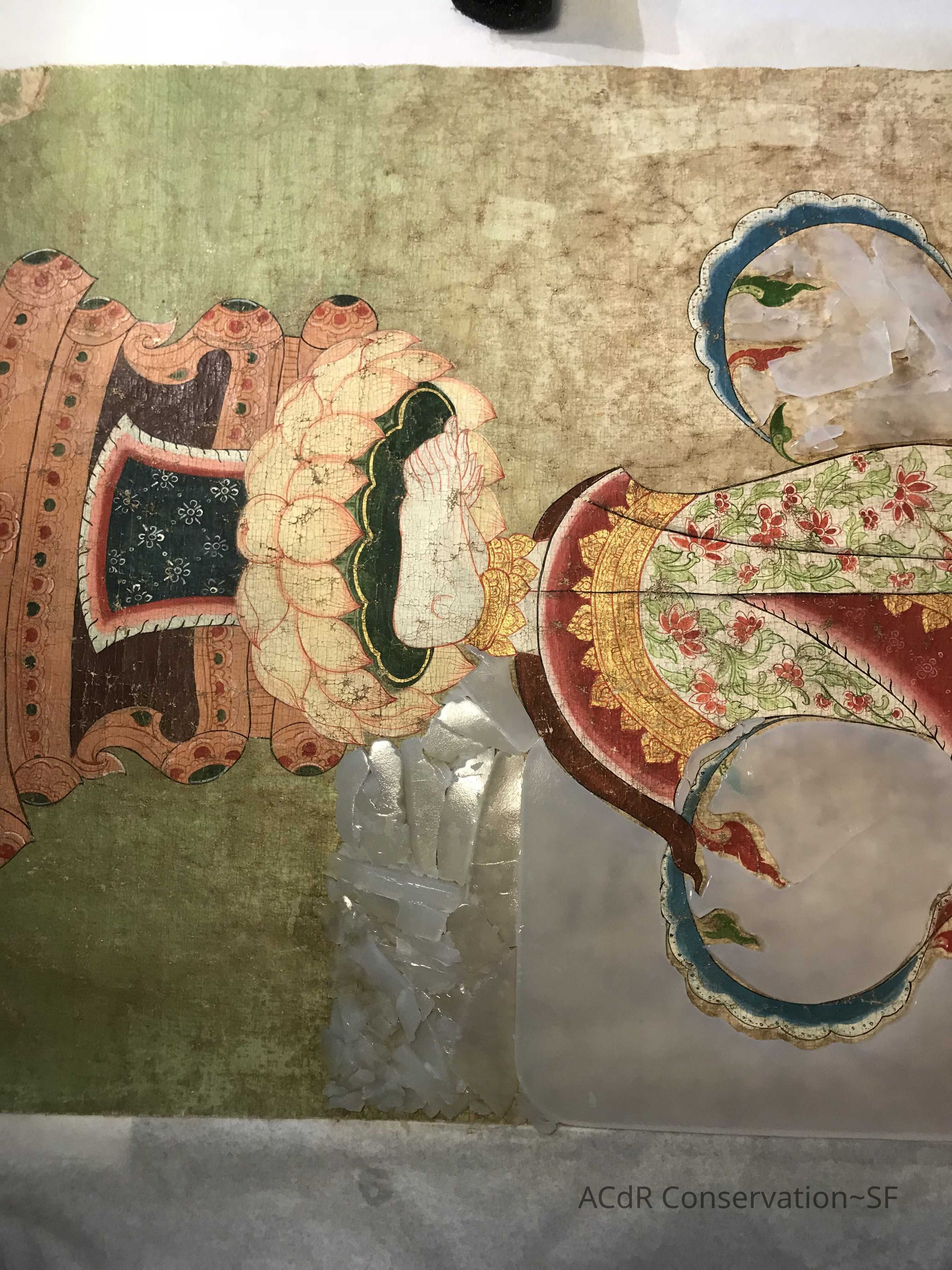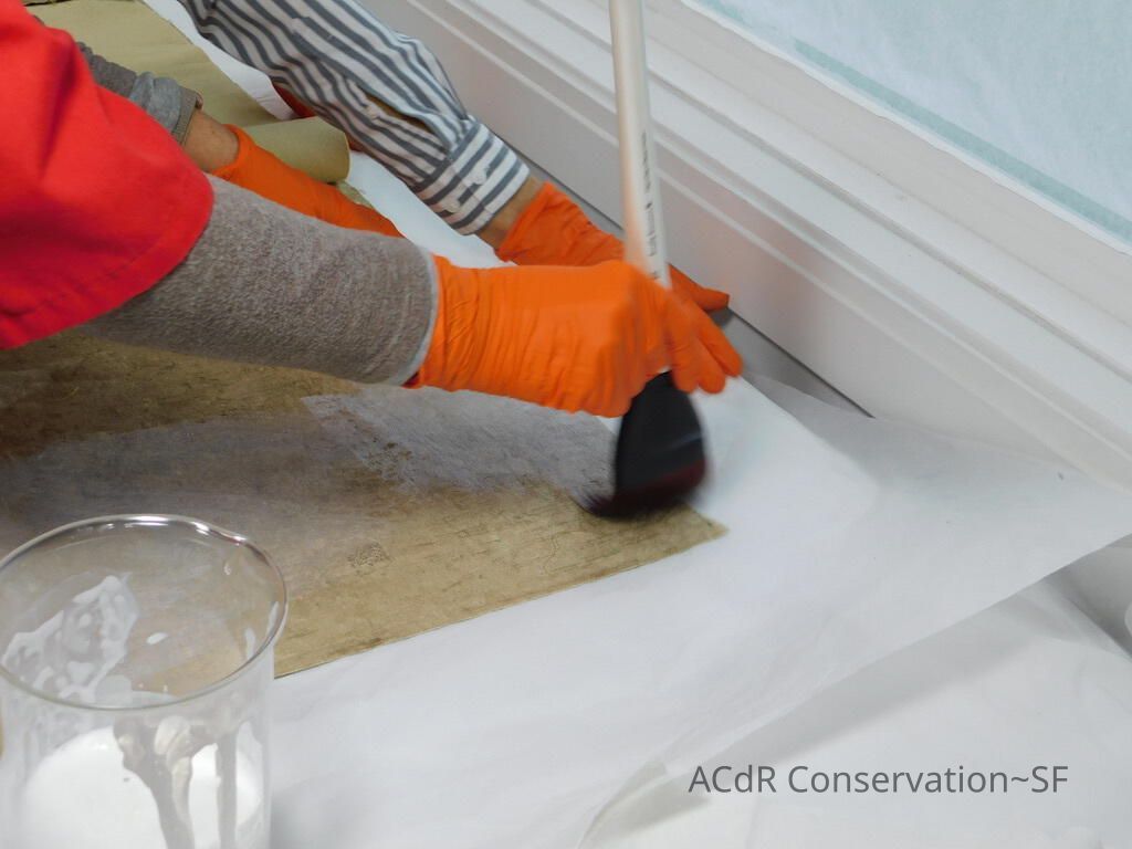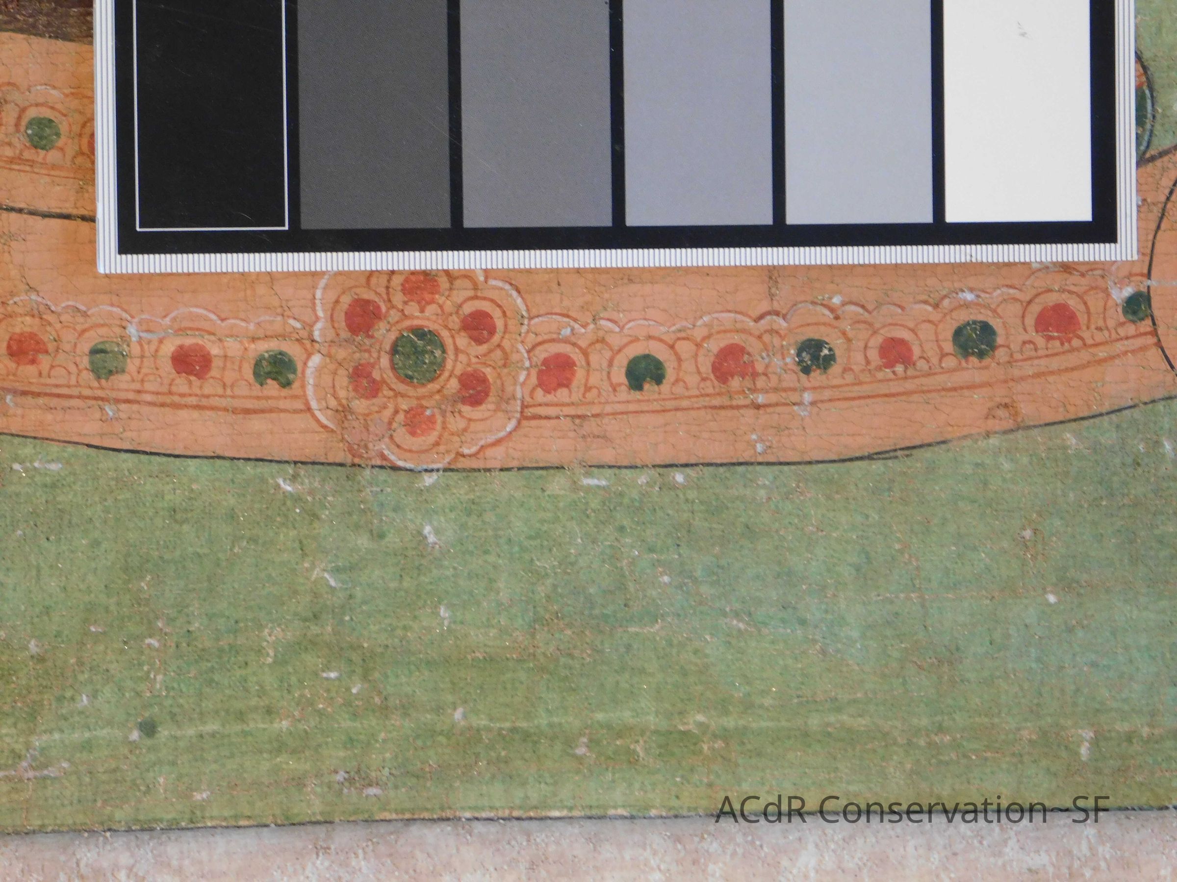 Precise consolidation of the flaking paint with a brush using 4% methylcellulose in water.