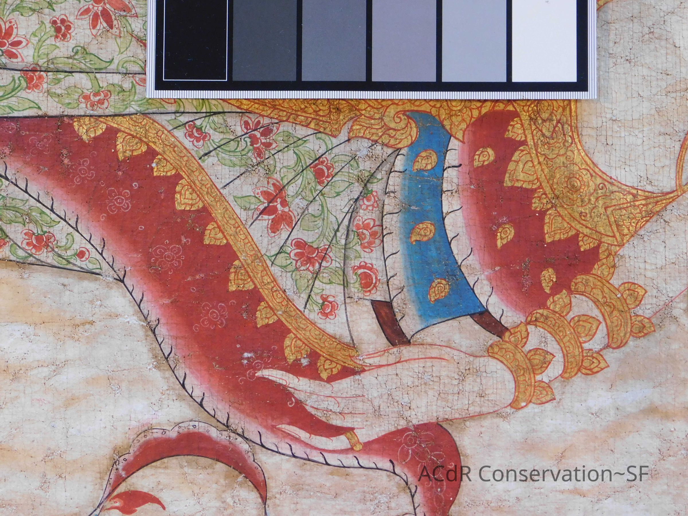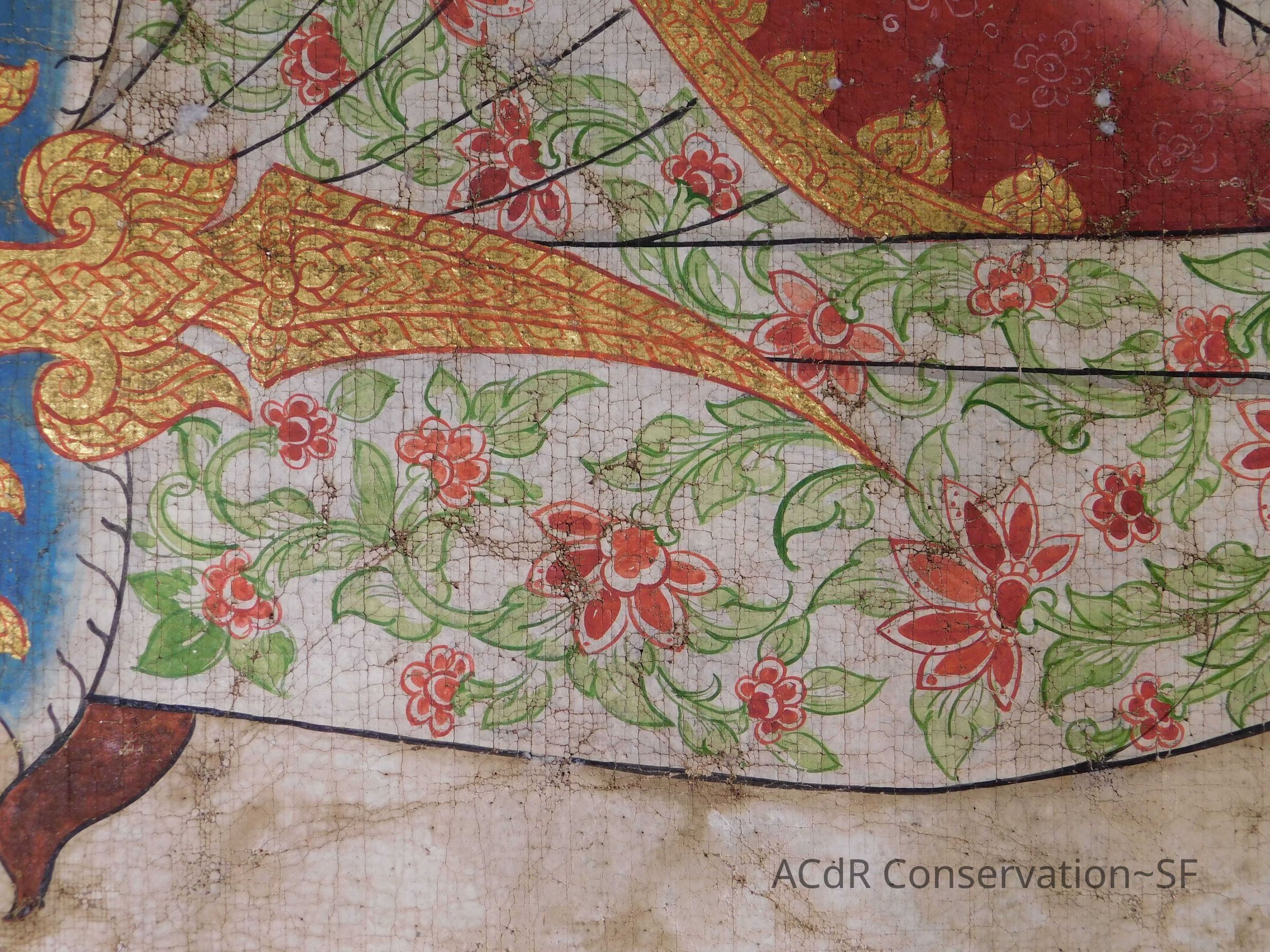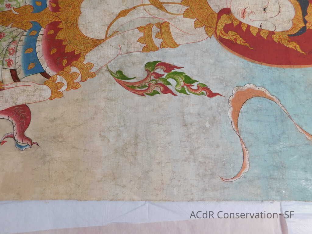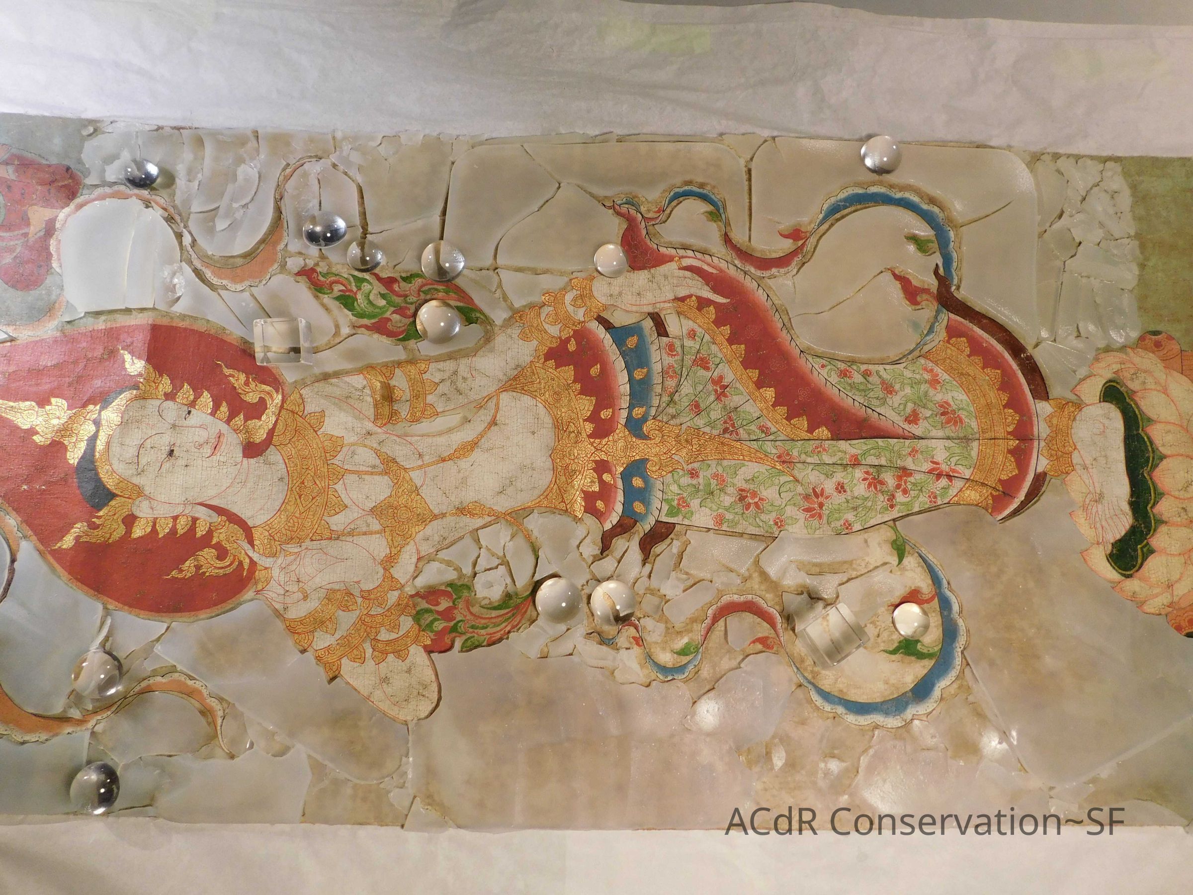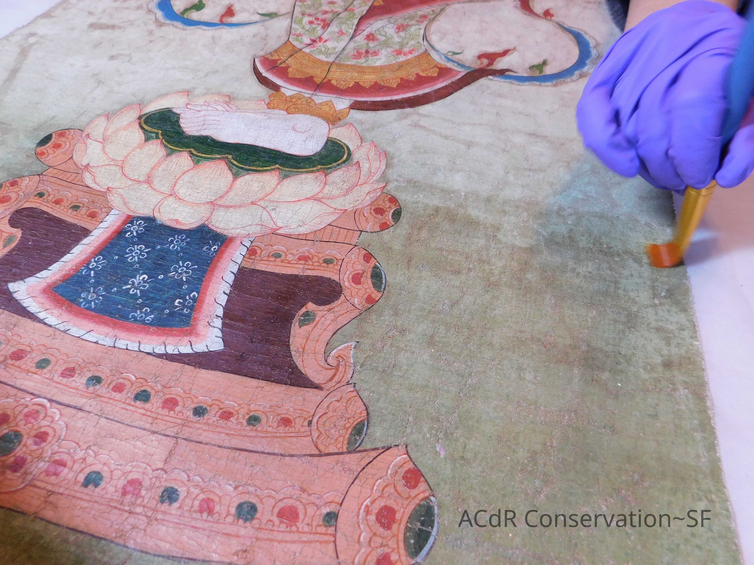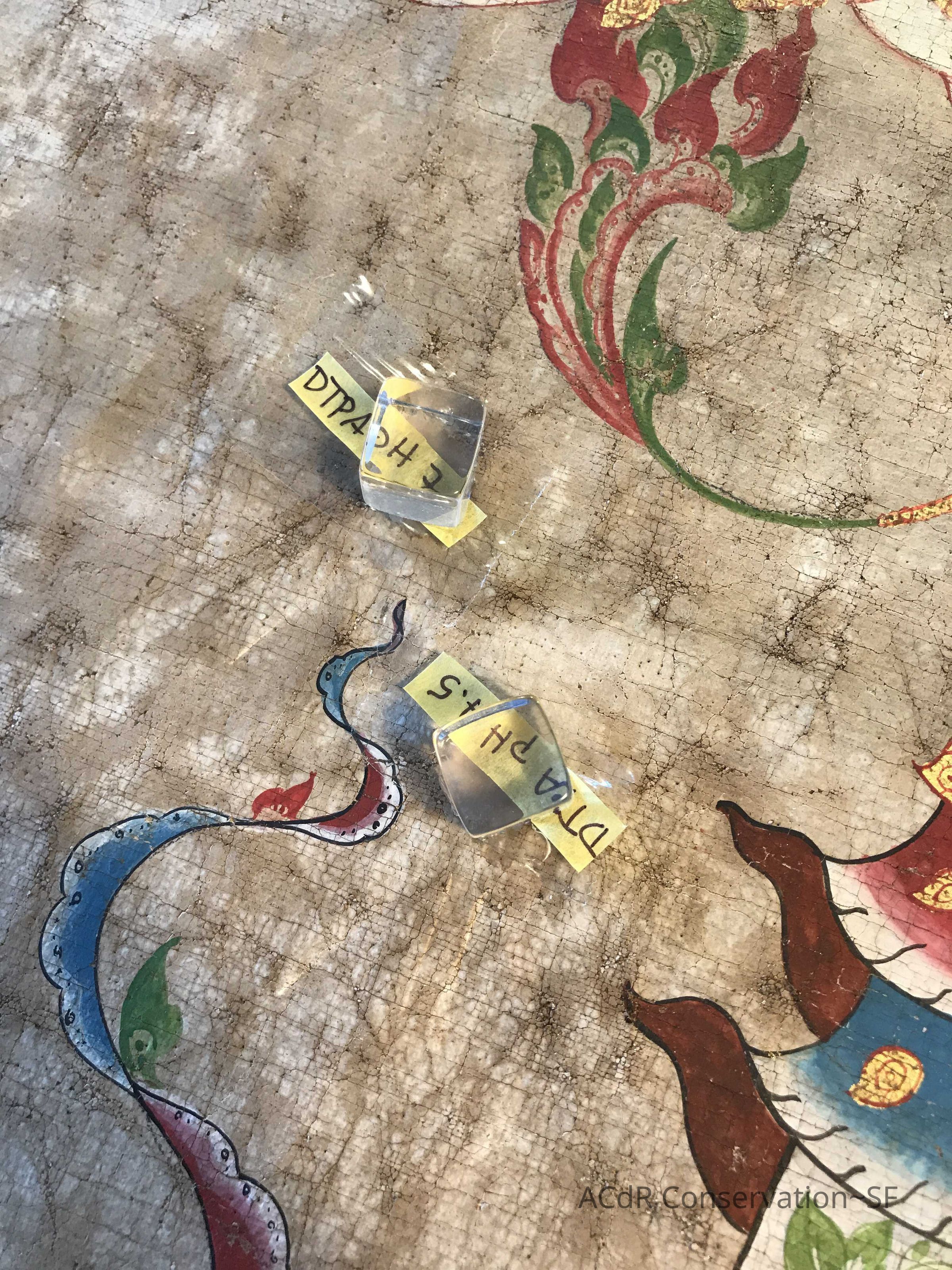 Precise consolidation of the flaking paint with a brush using 4% methylcellulose in water.