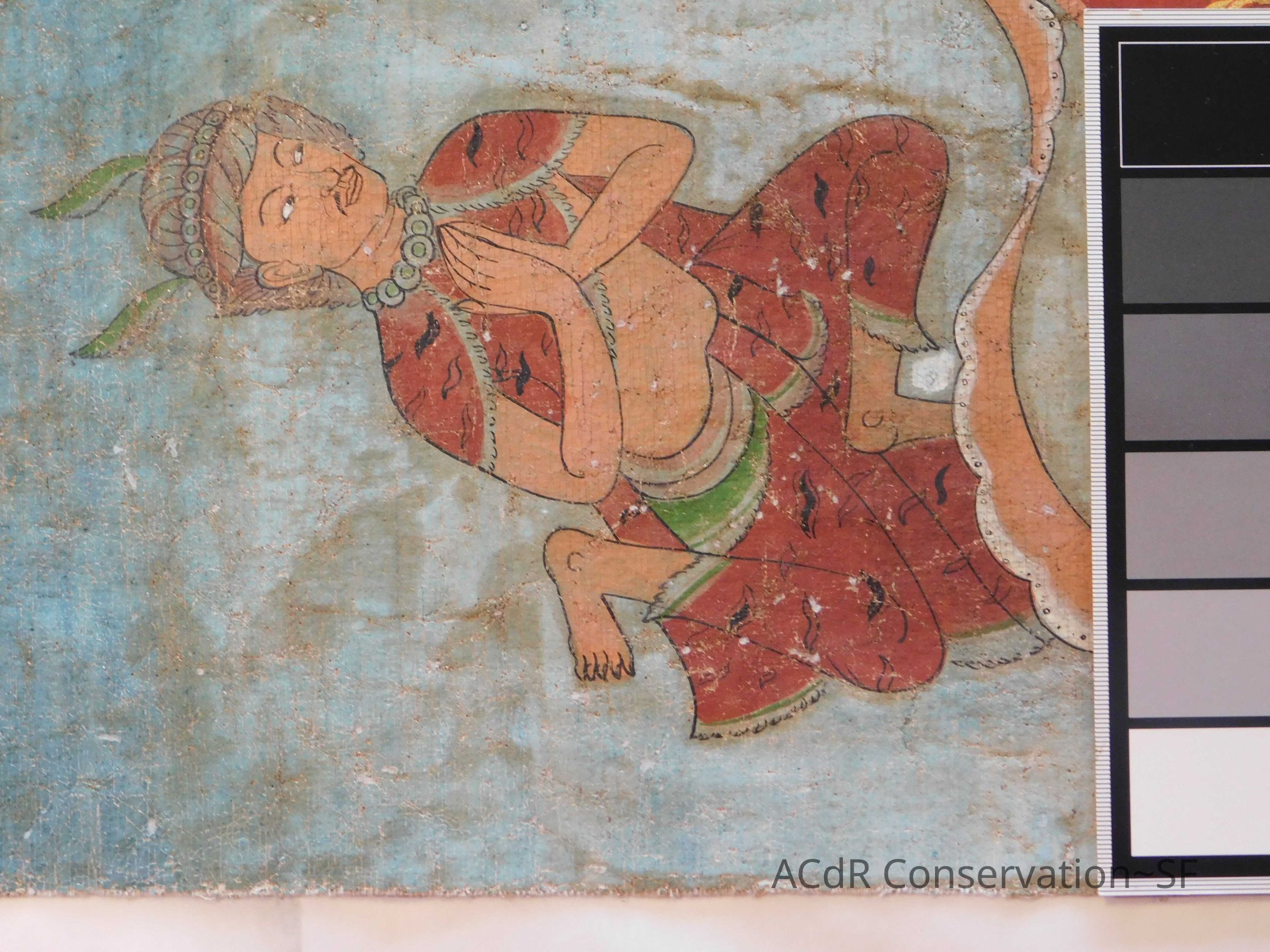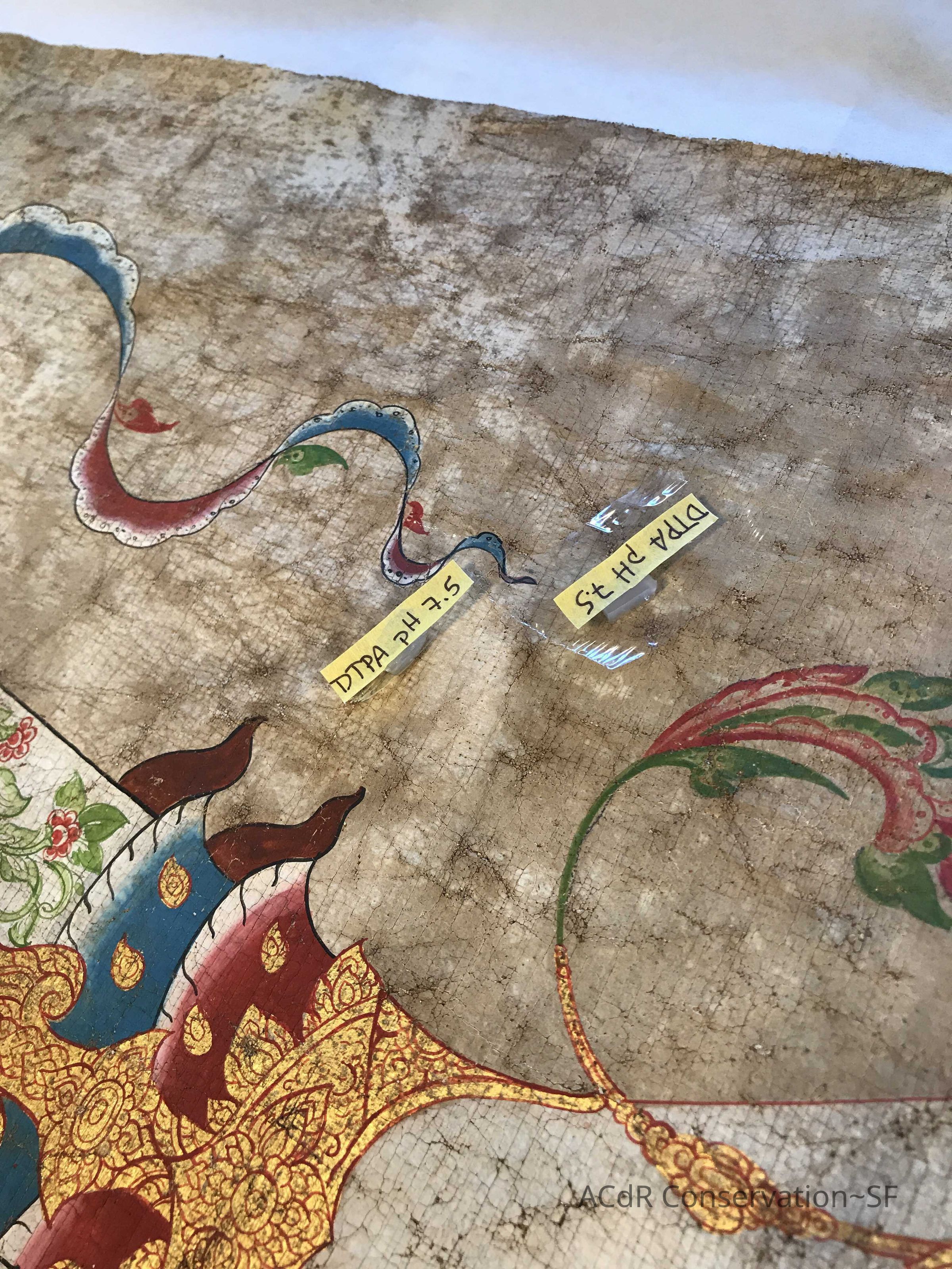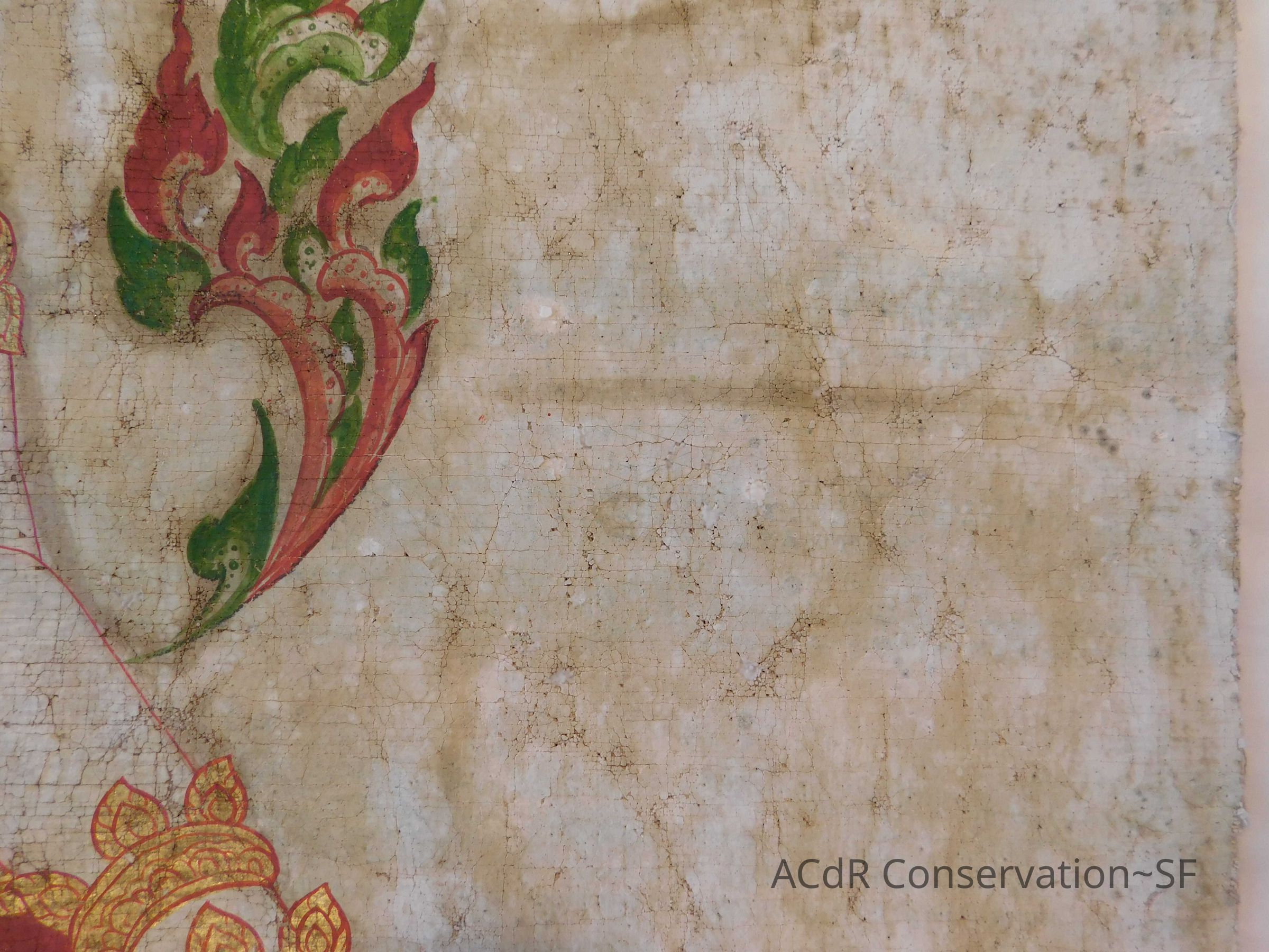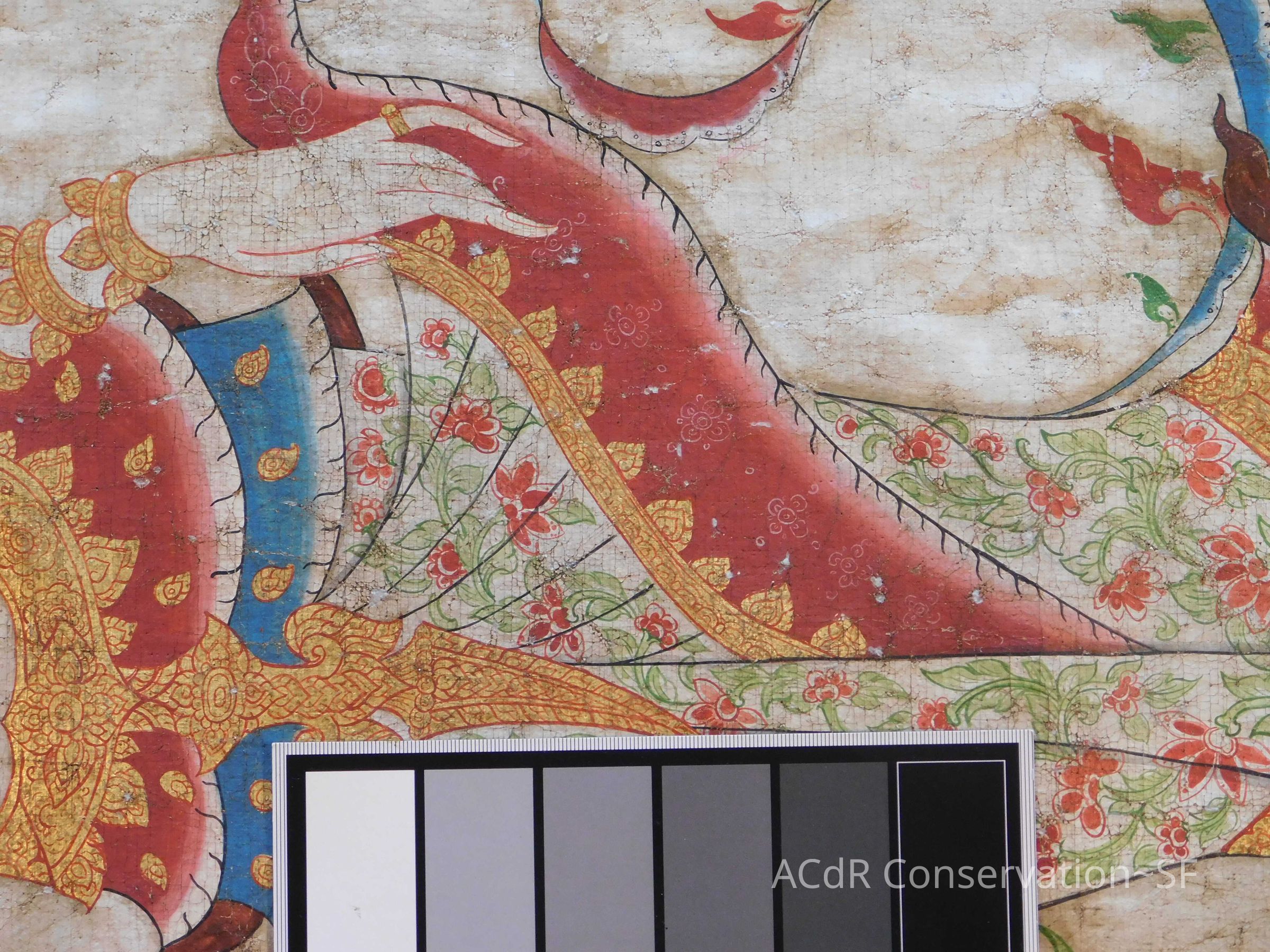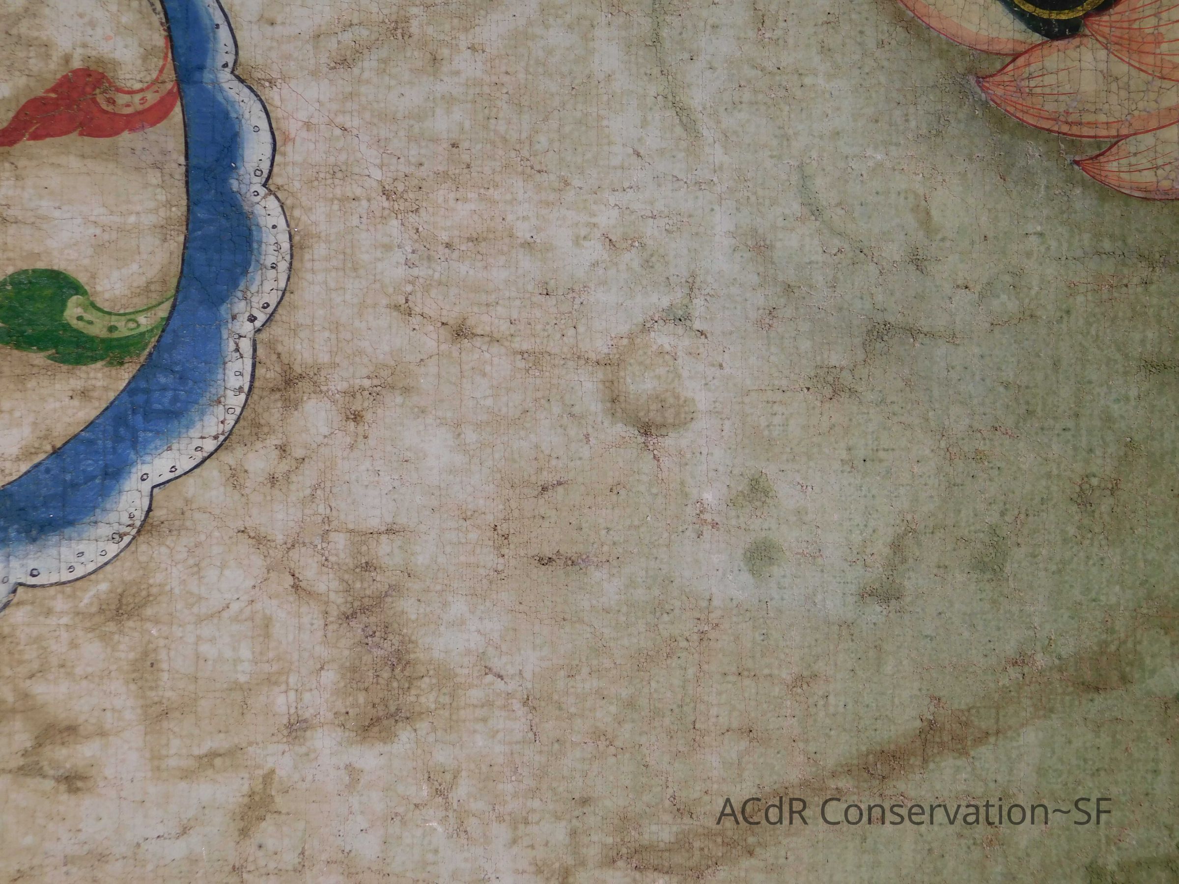 Precise consolidation of the flaking paint with a brush using 4% methylcellulose in water.