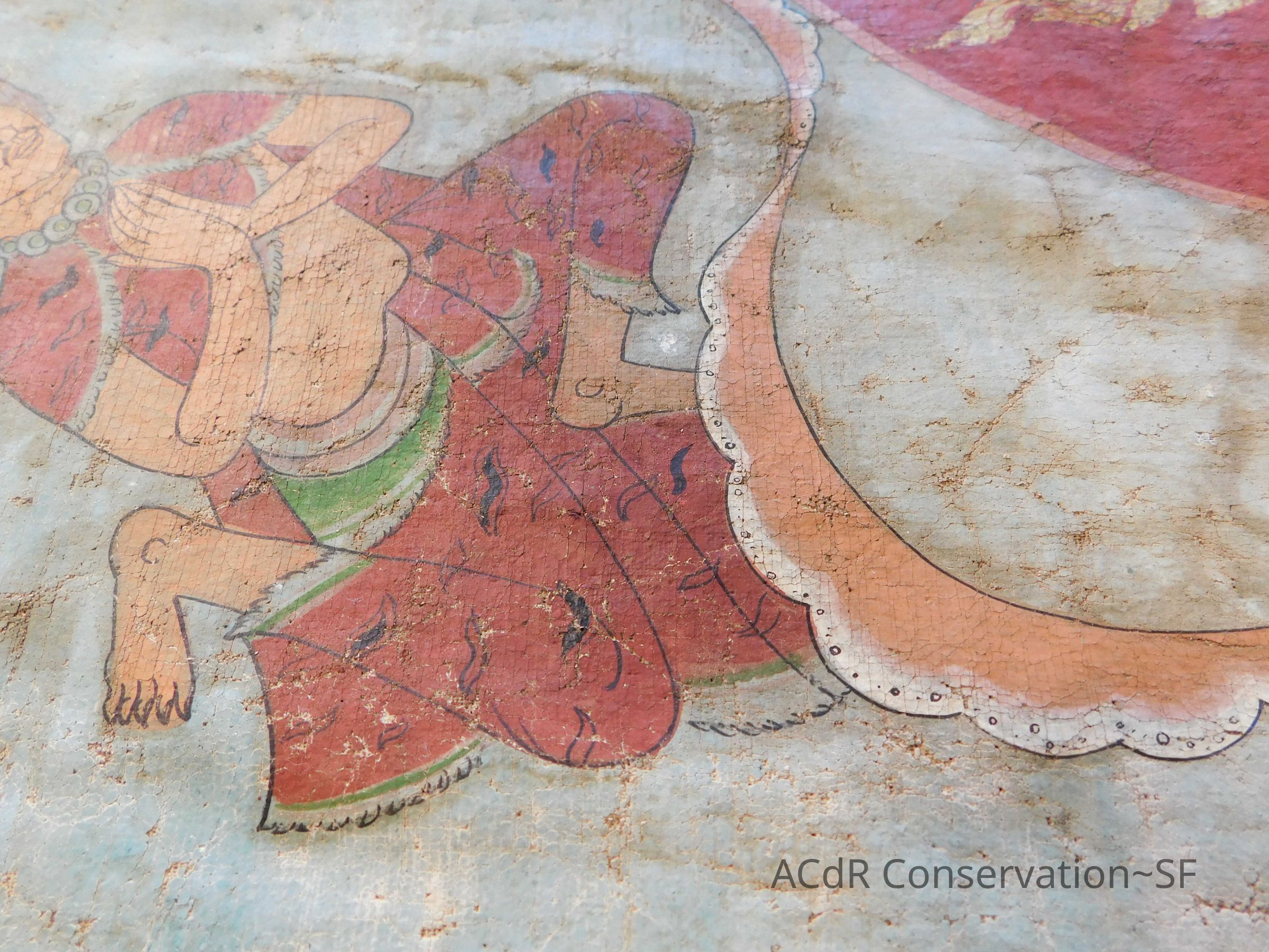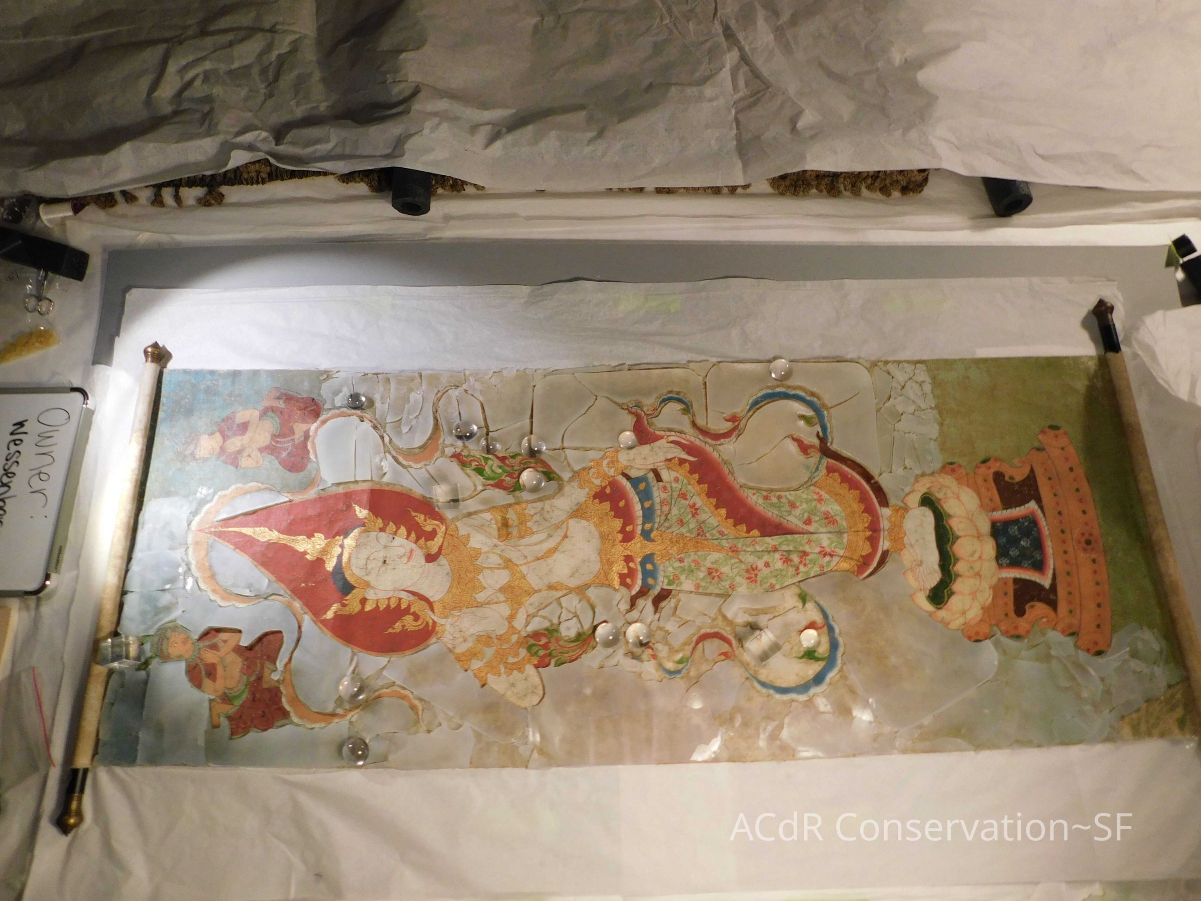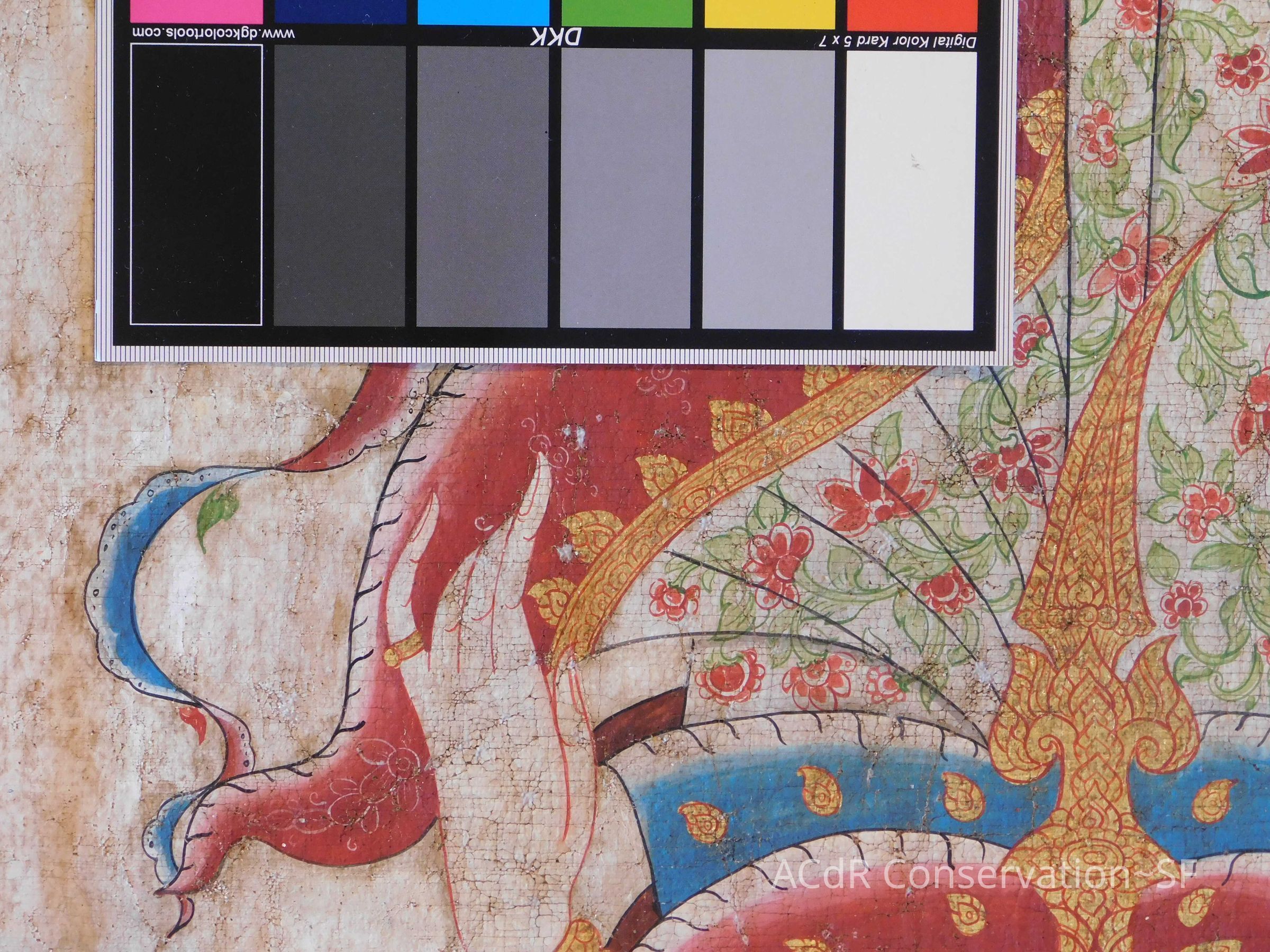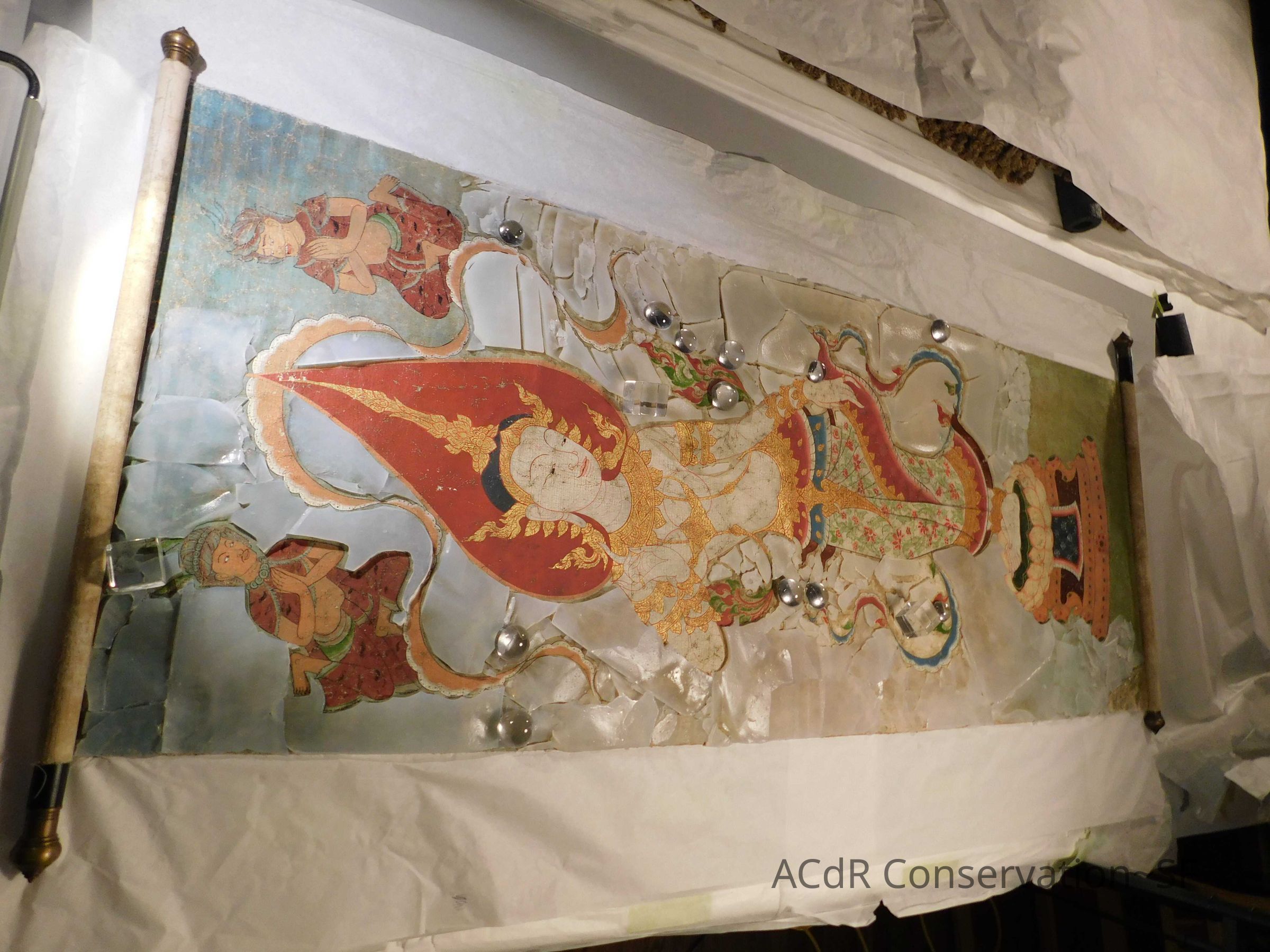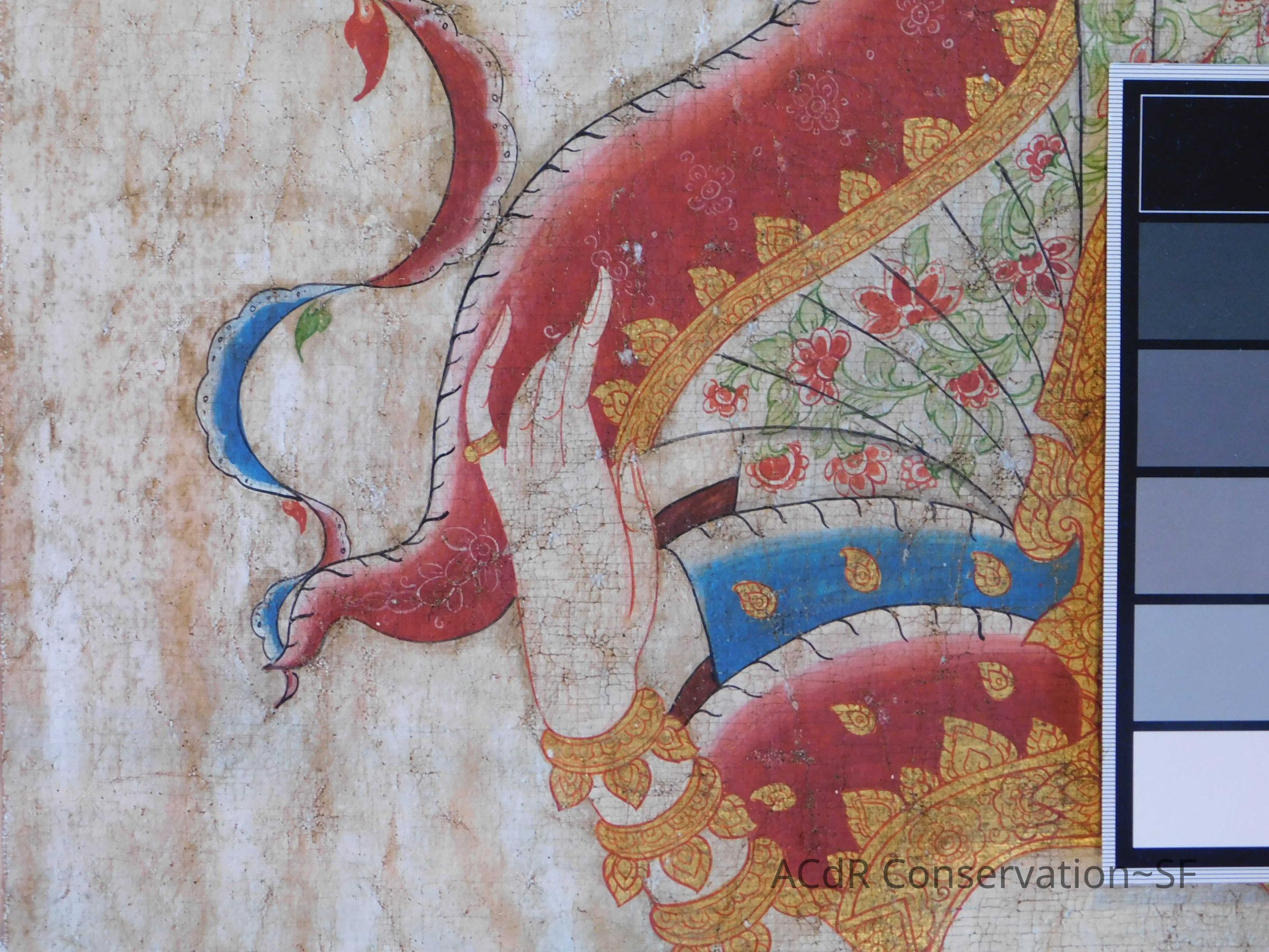 Precise consolidation of the flaking paint with a brush using 4% methylcellulose in water.
