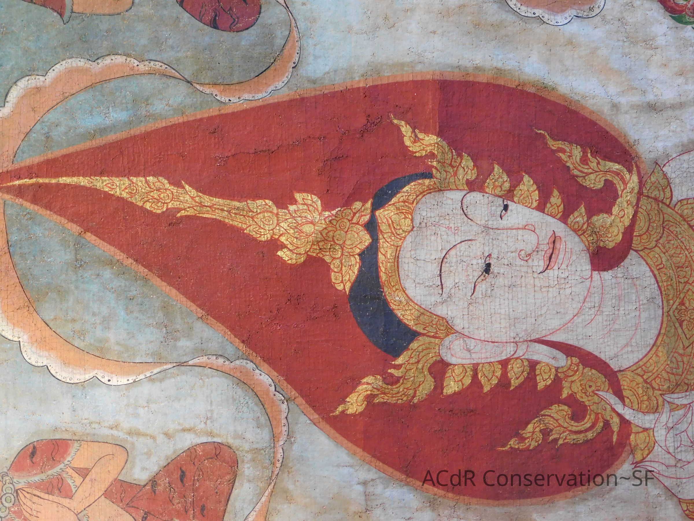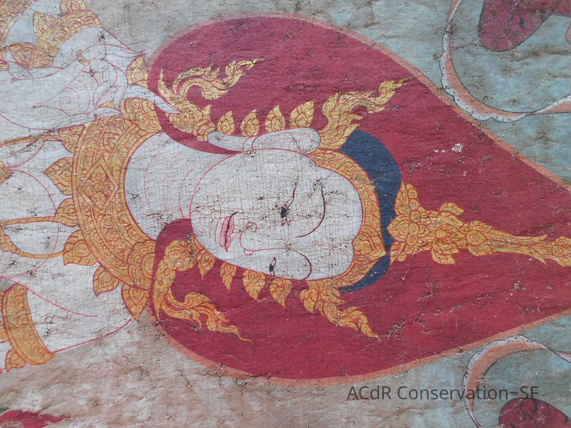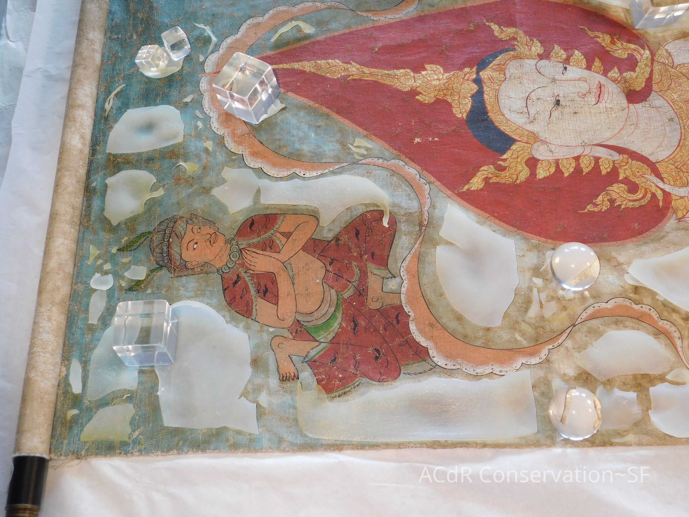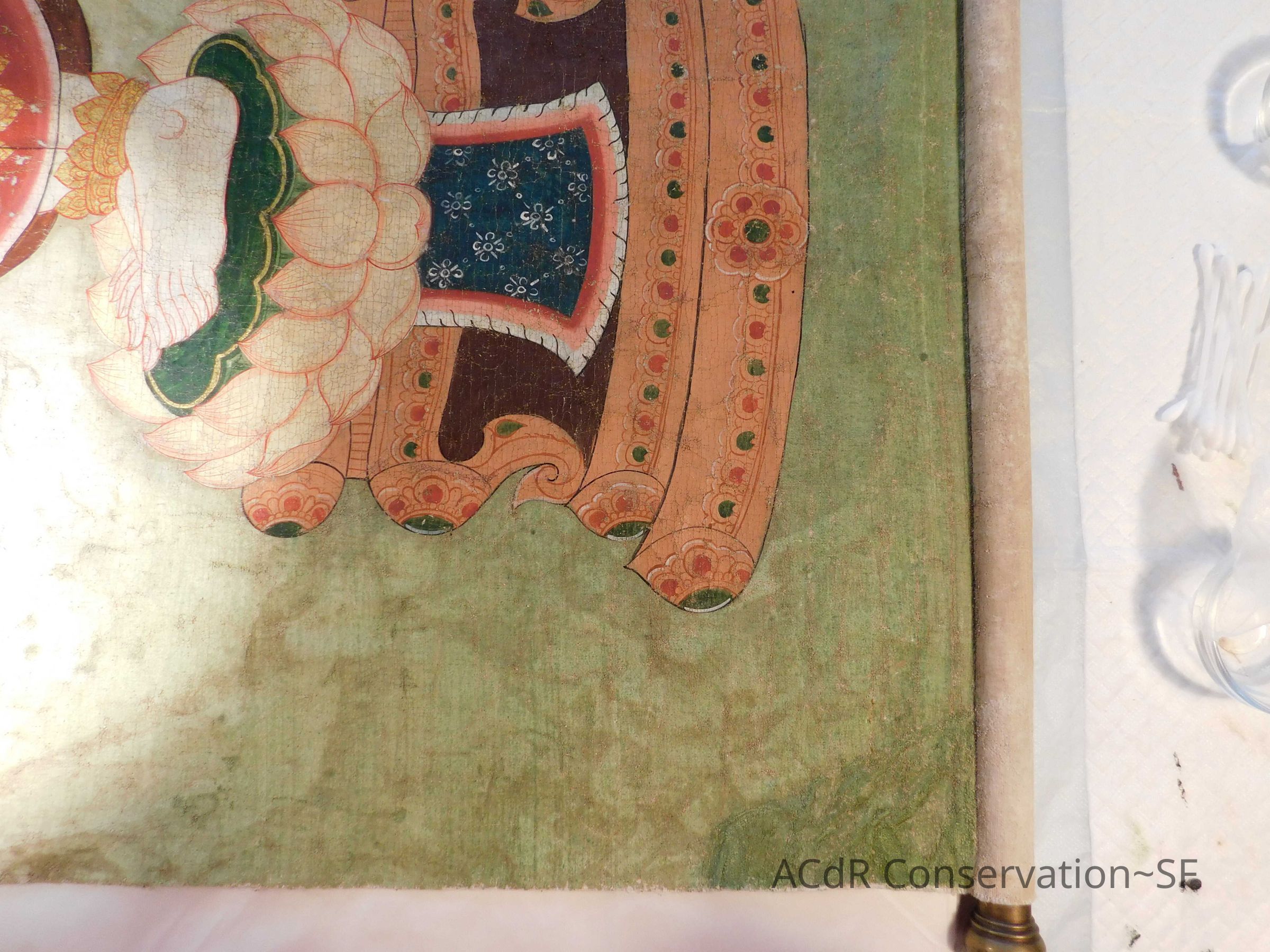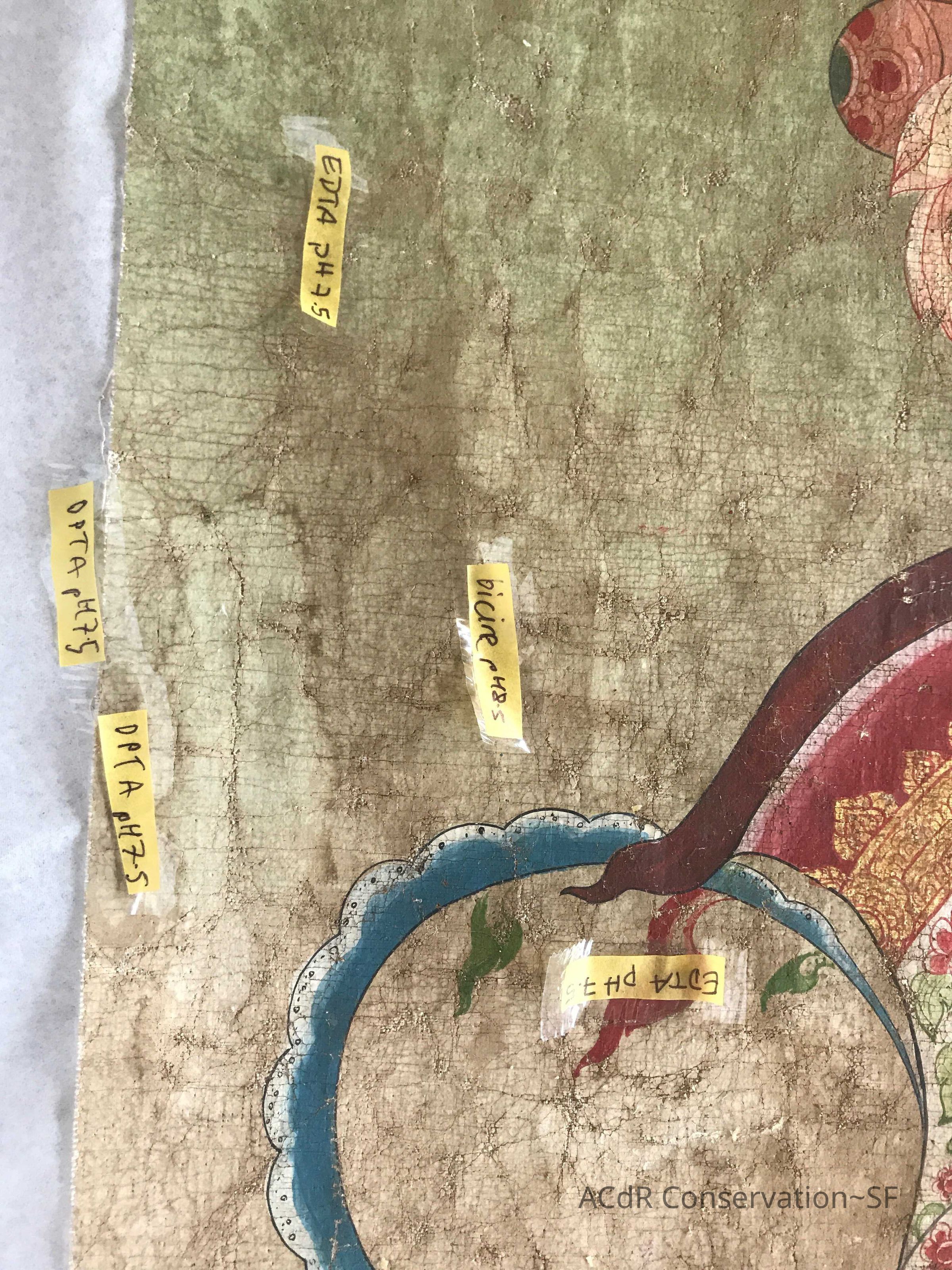 Precise consolidation of the flaking paint with a brush using 4% methylcellulose in water.