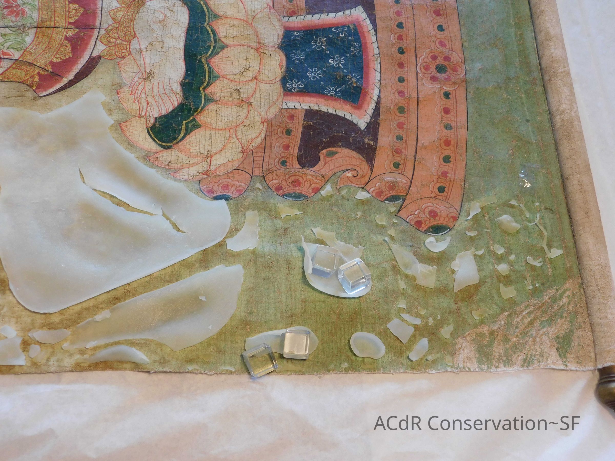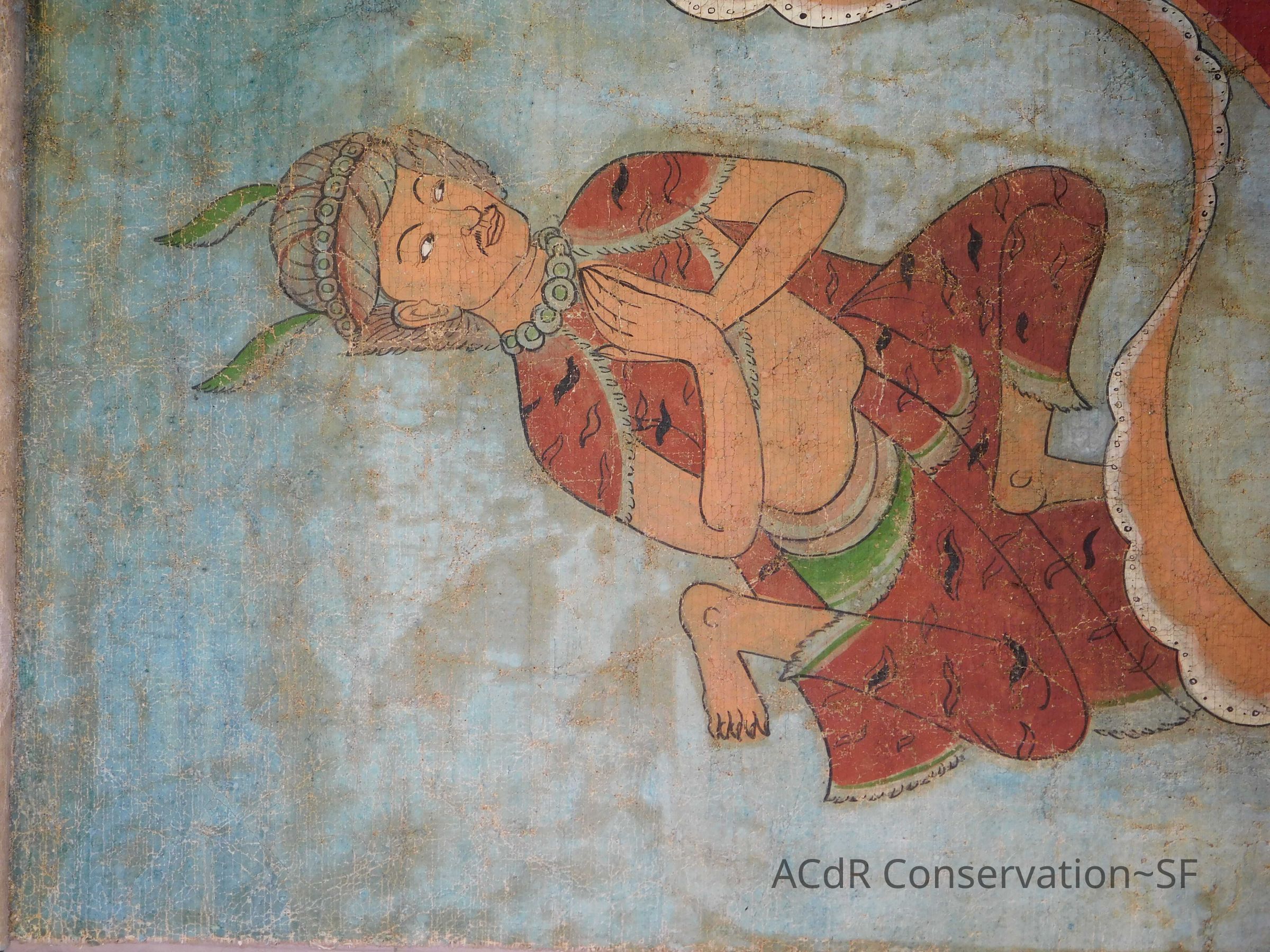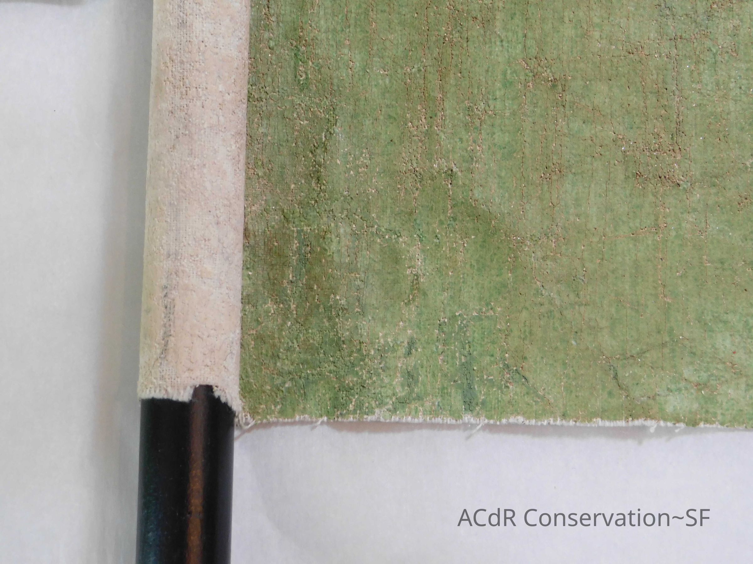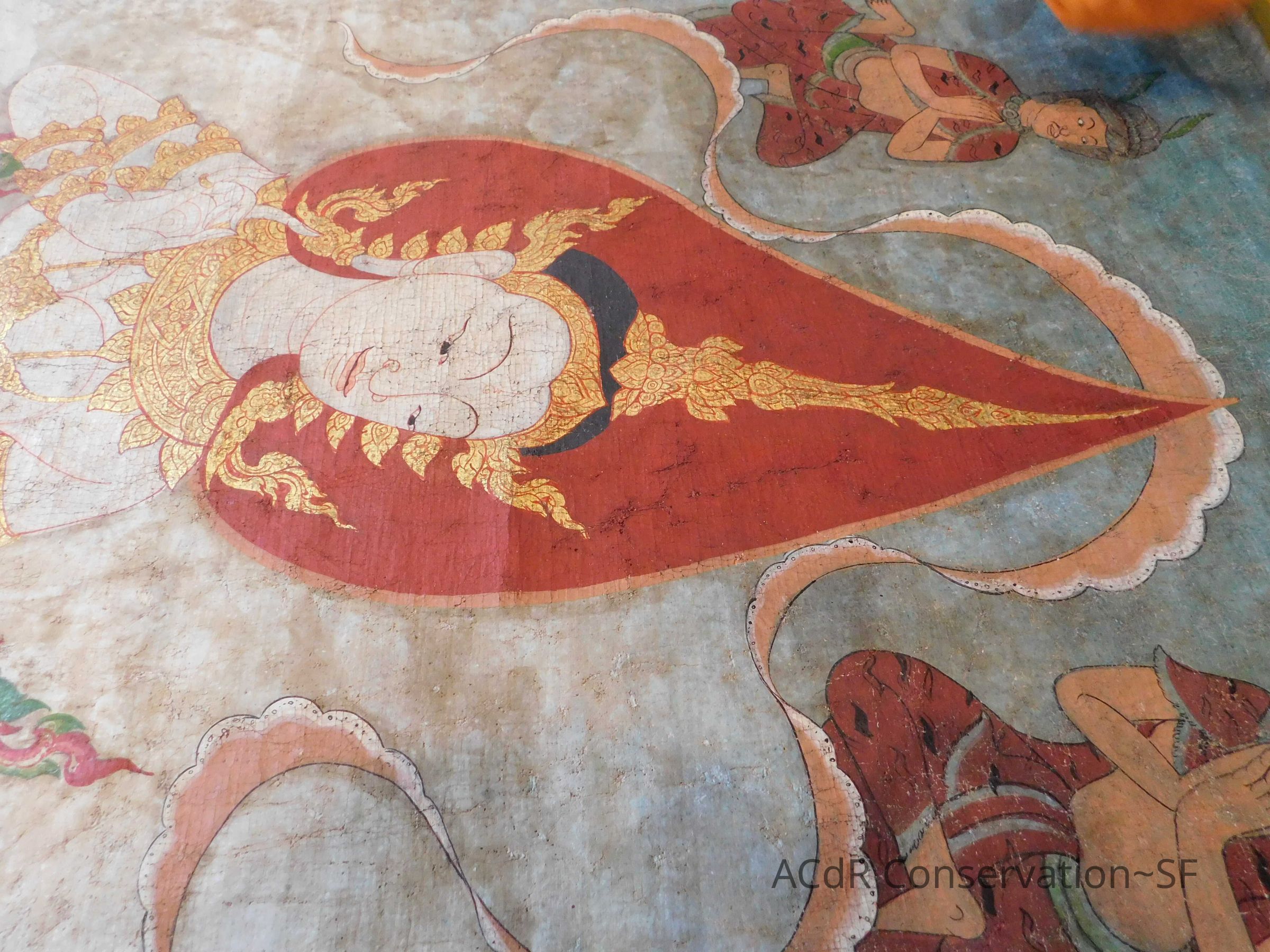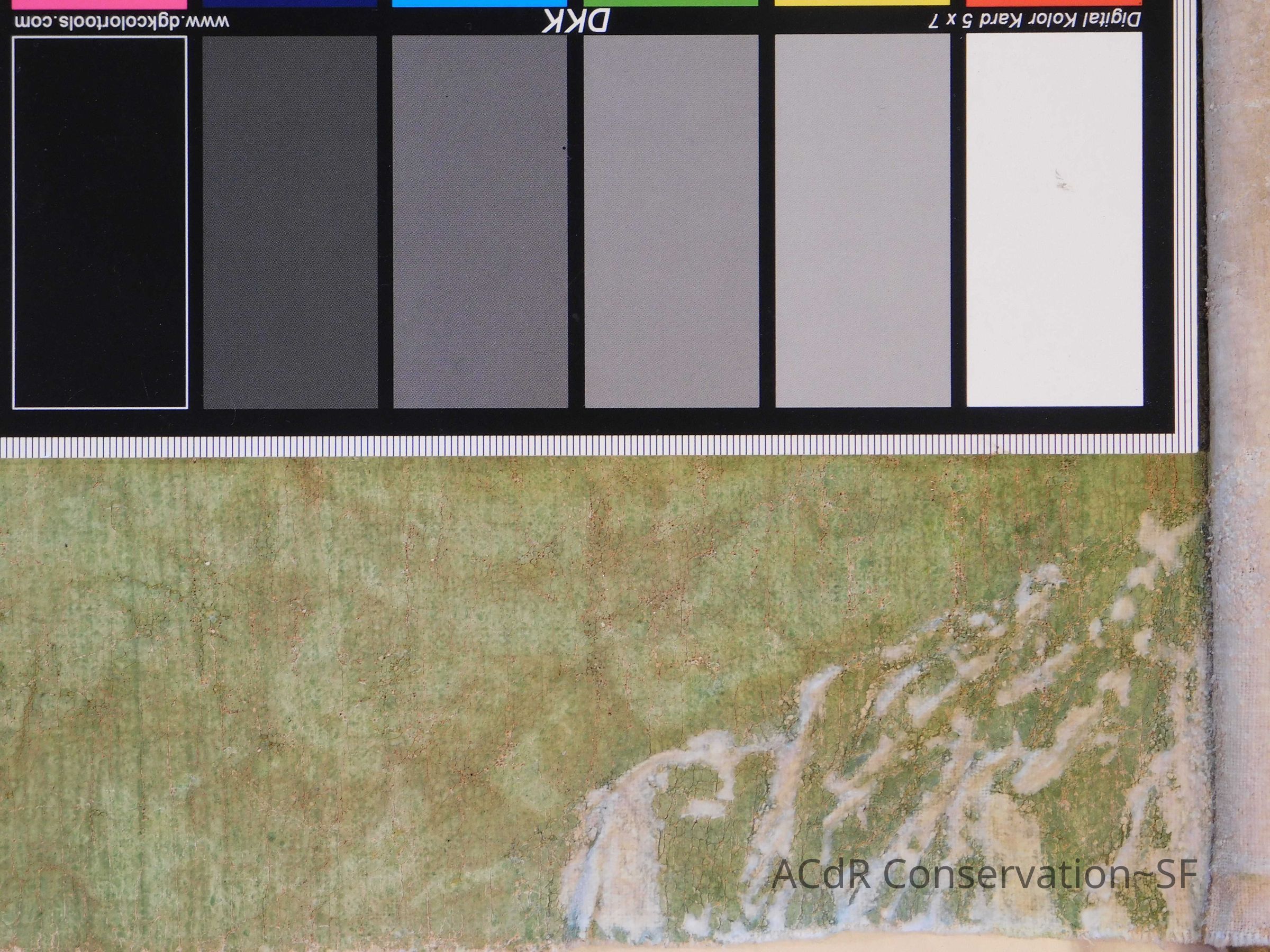 Precise consolidation of the flaking paint with a brush using 4% methylcellulose in water.