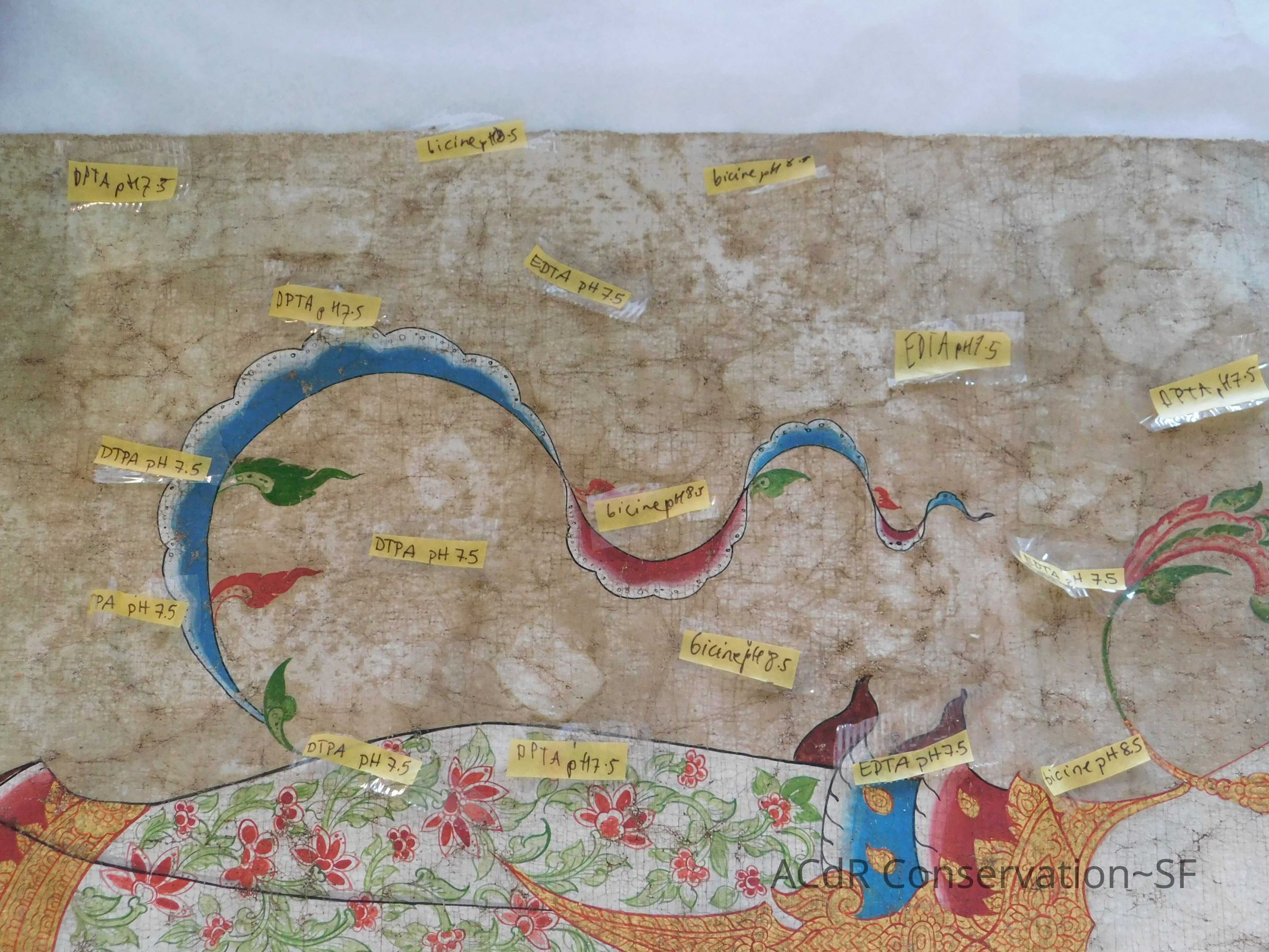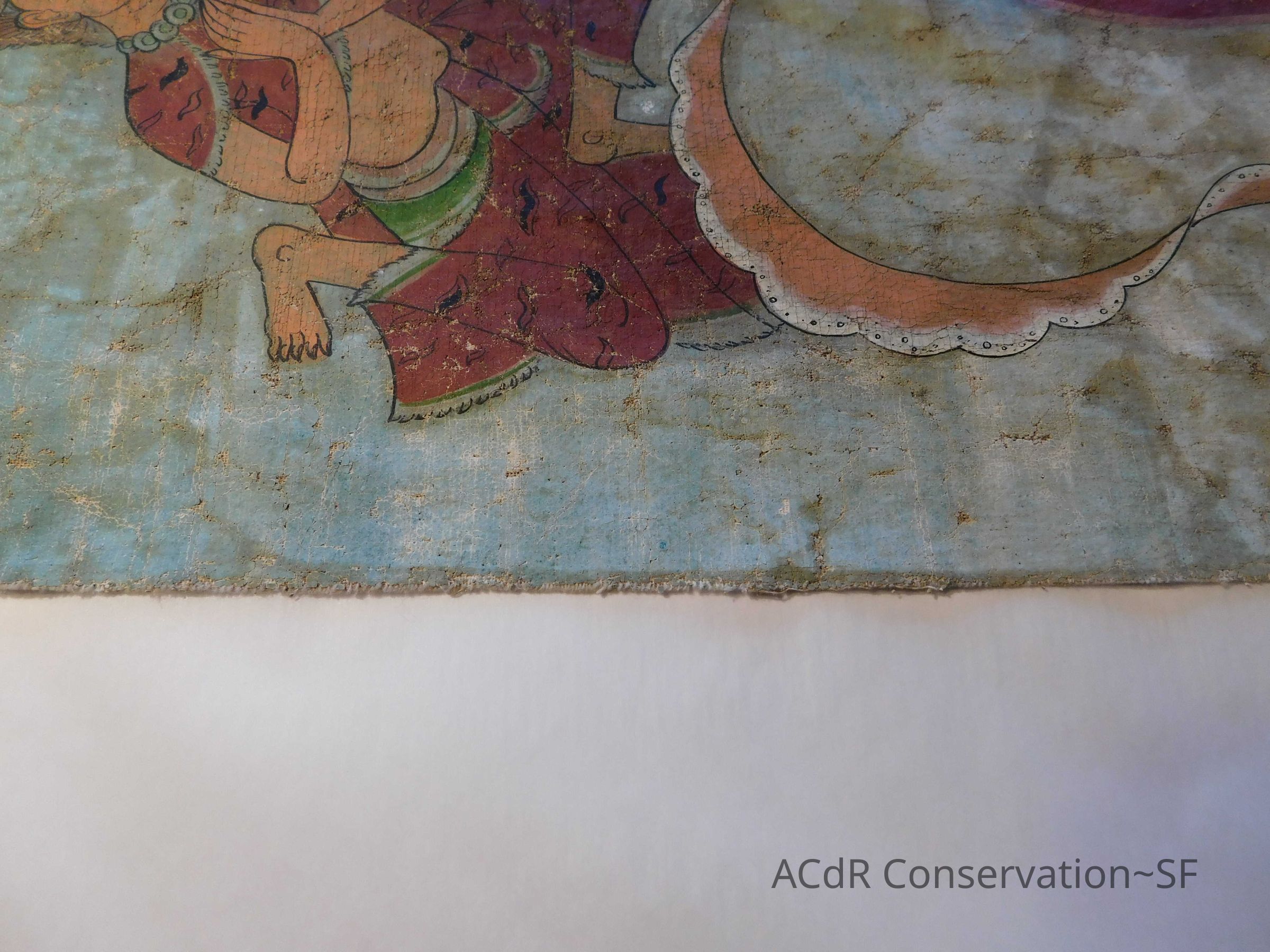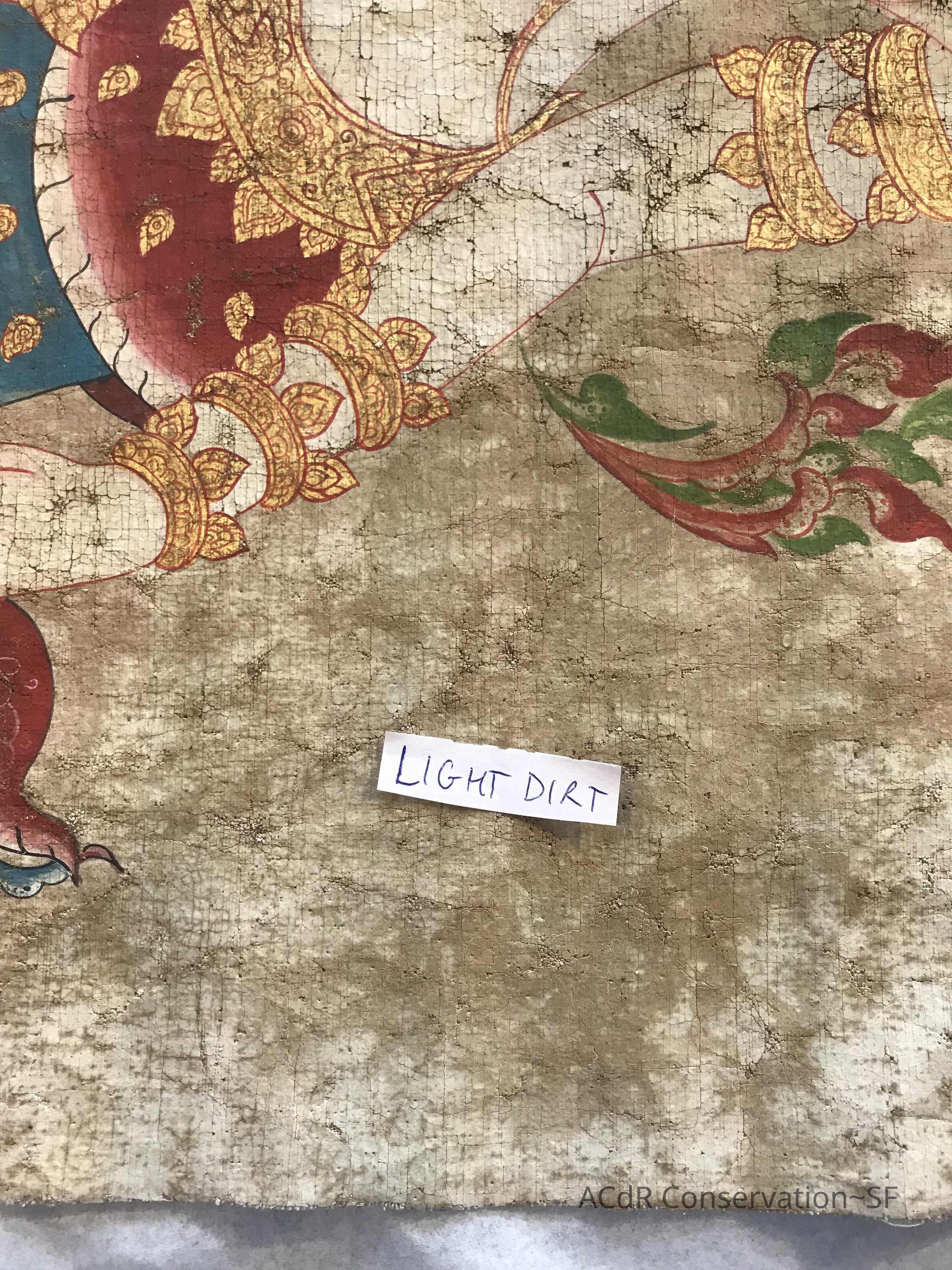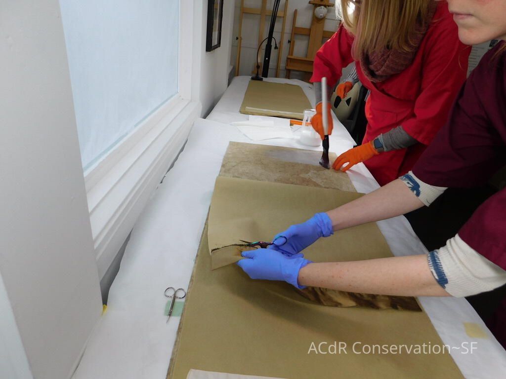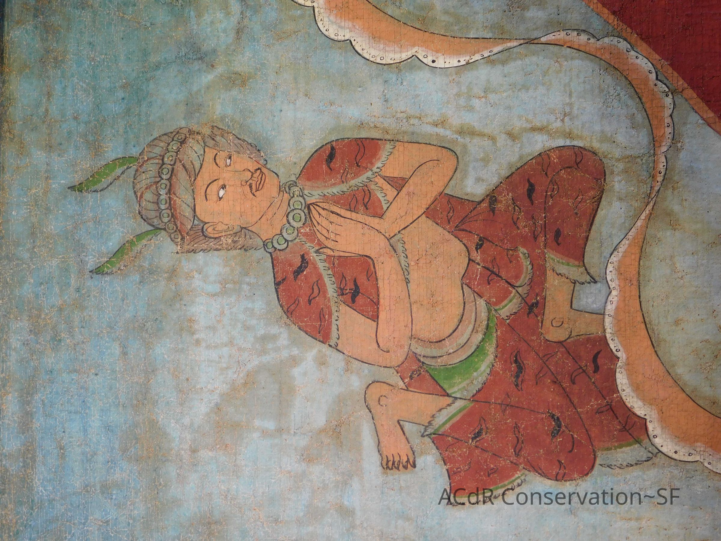 Precise consolidation of the flaking paint with a brush using 4% methylcellulose in water.