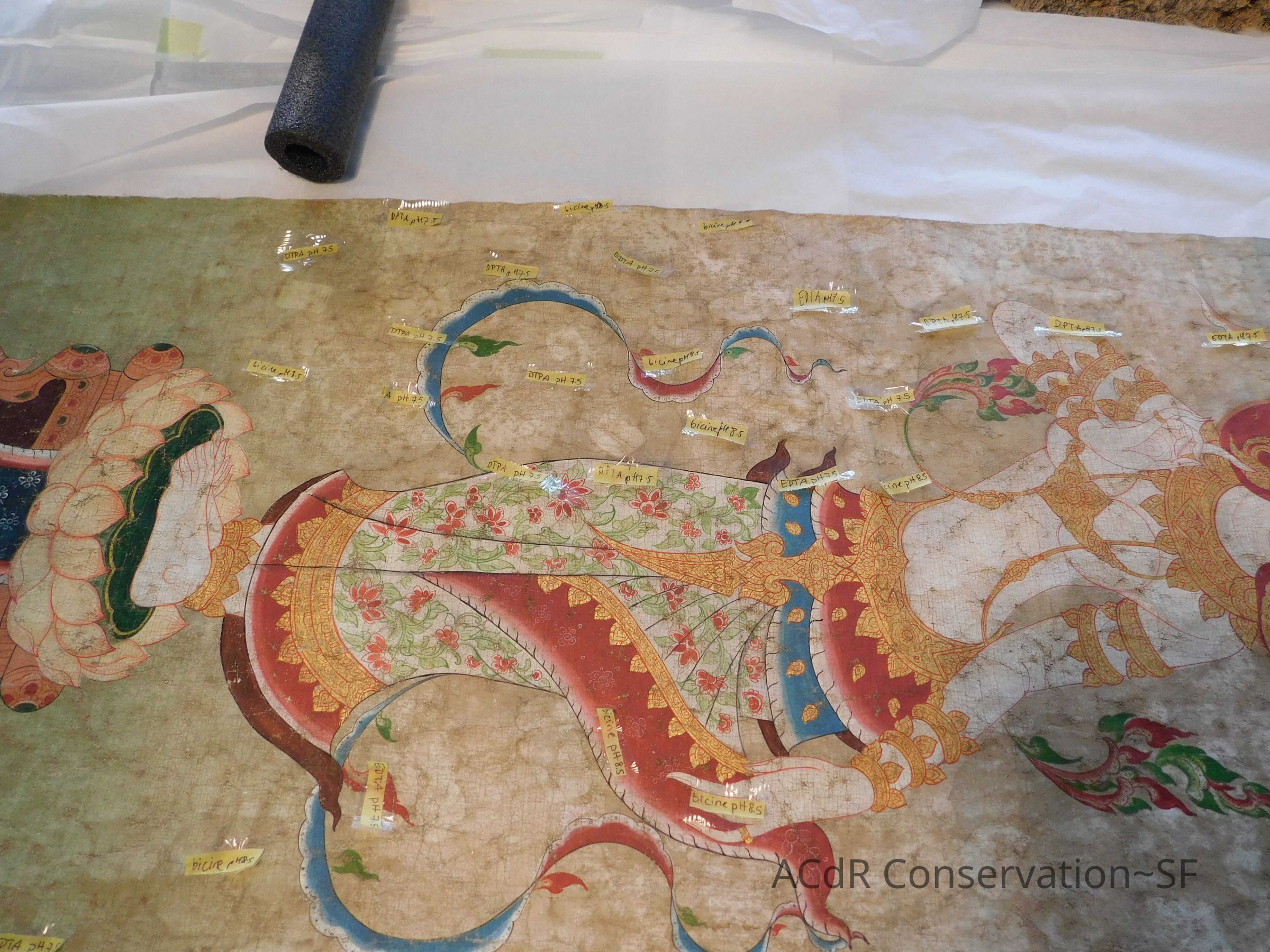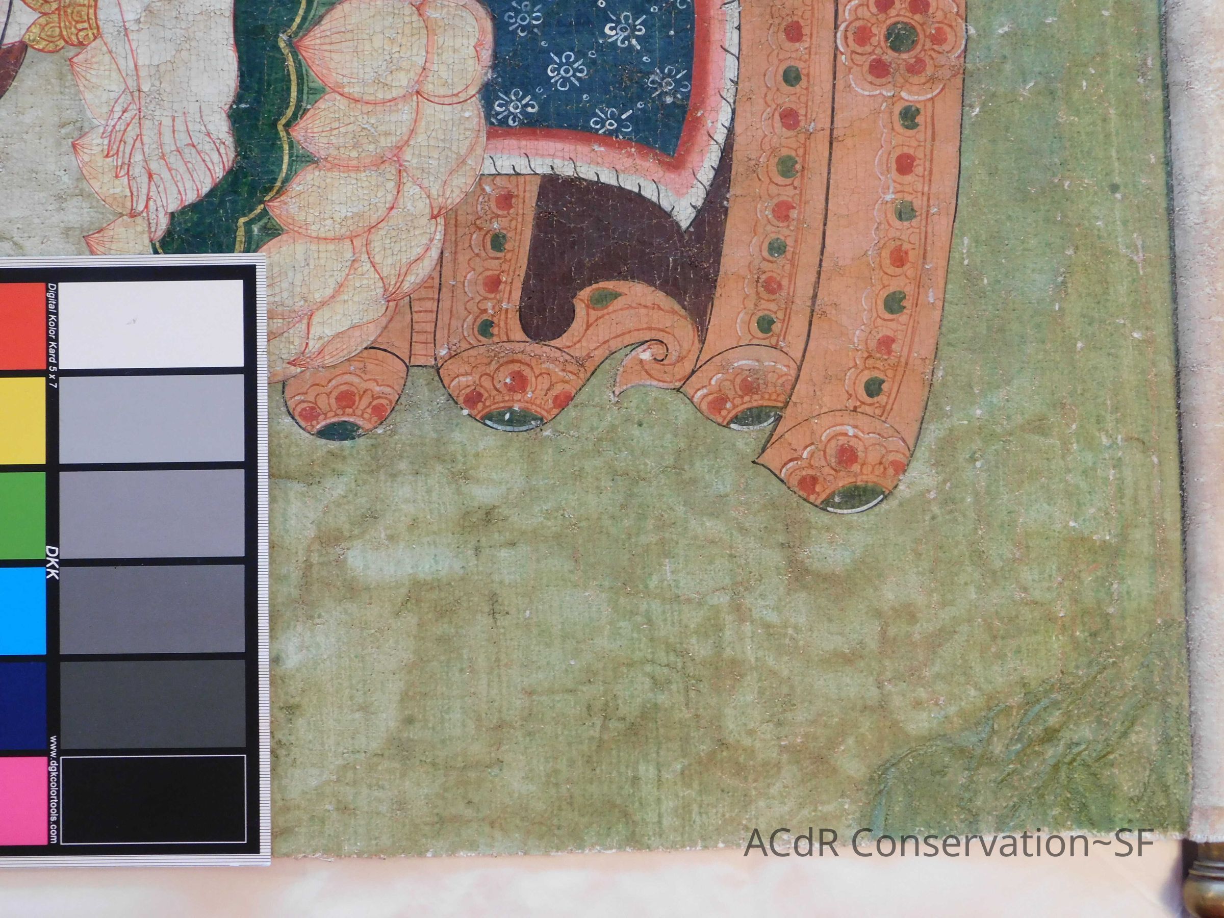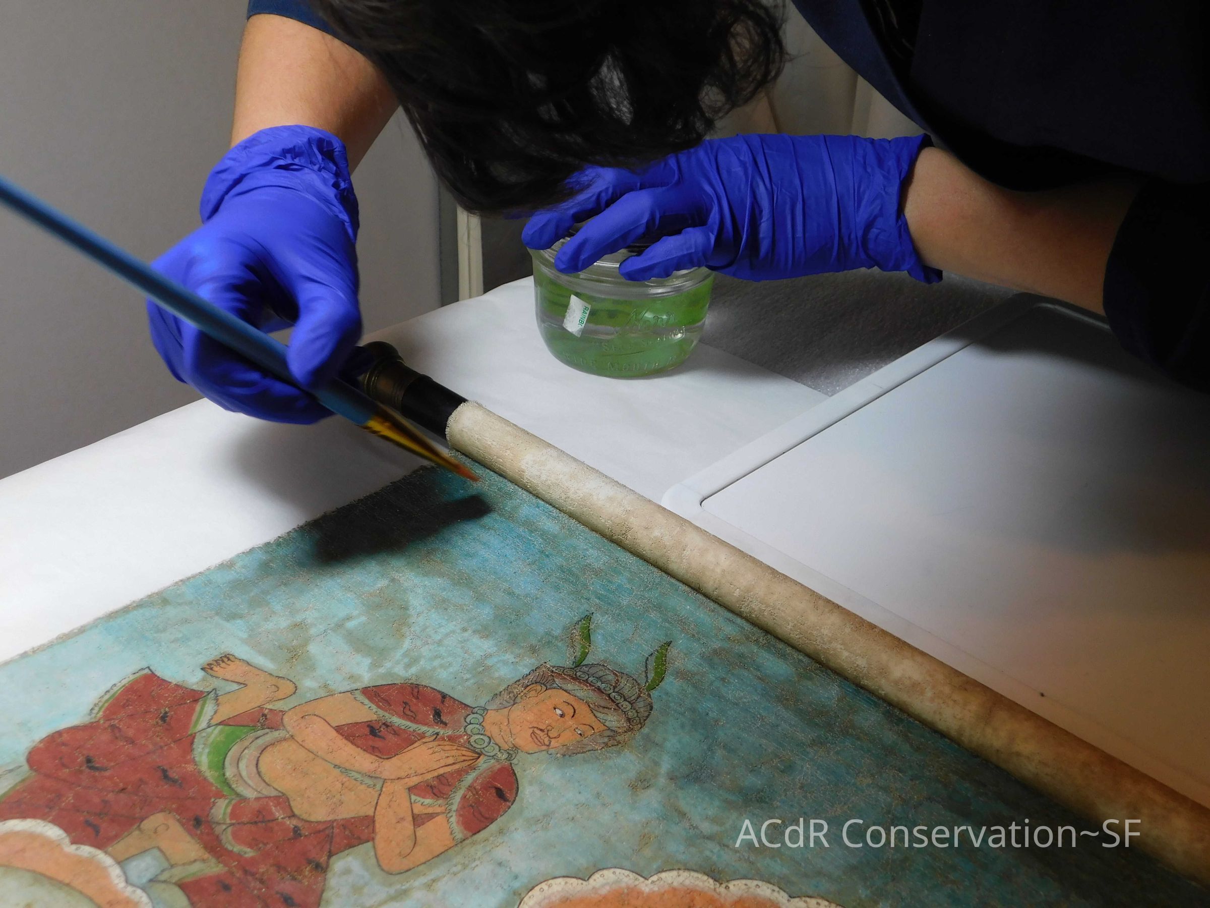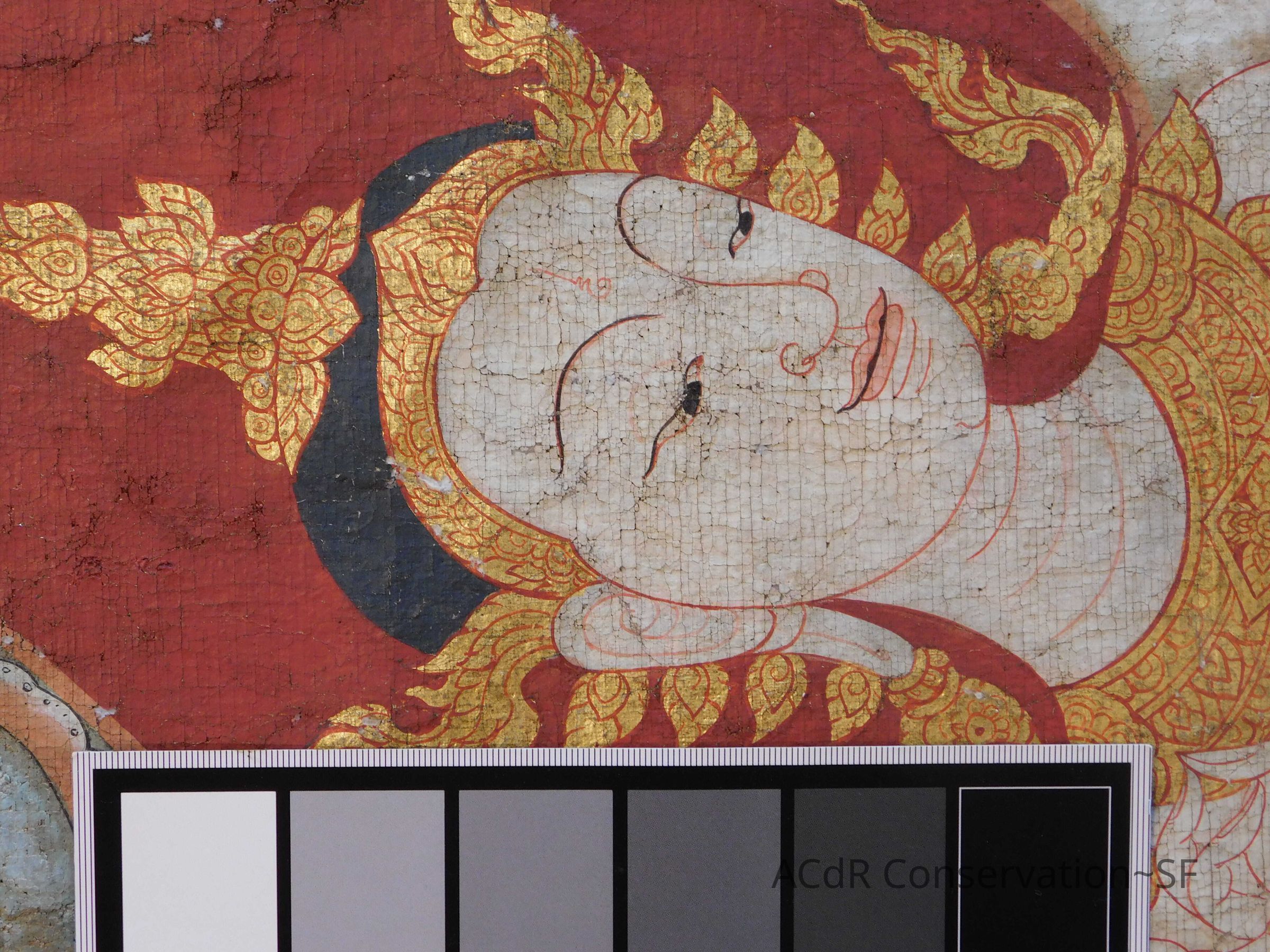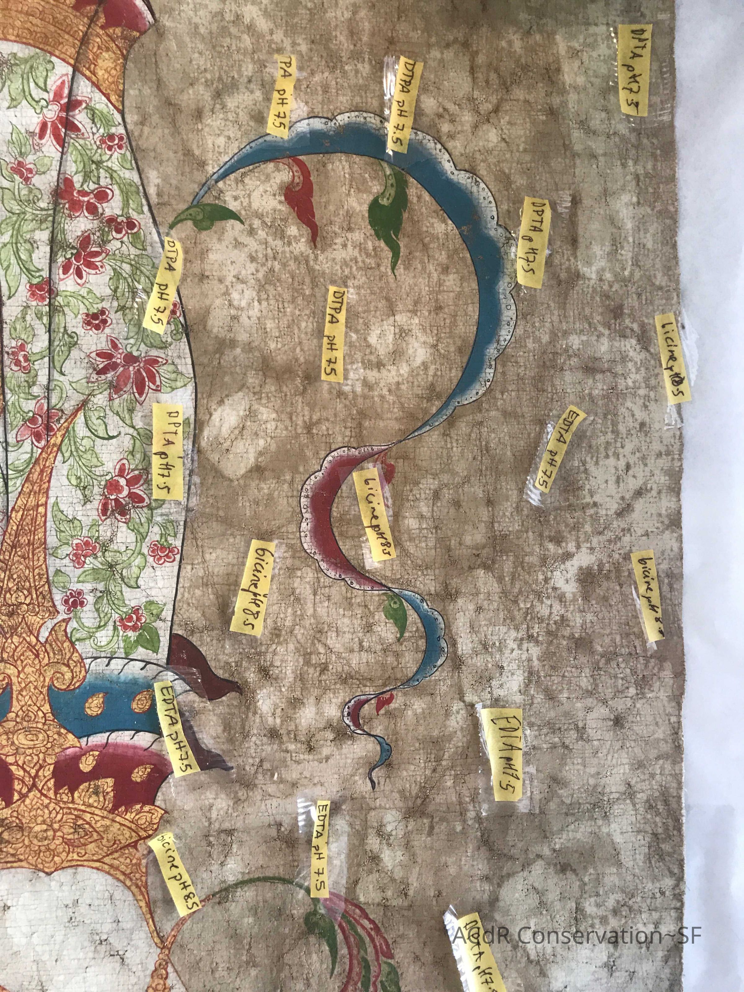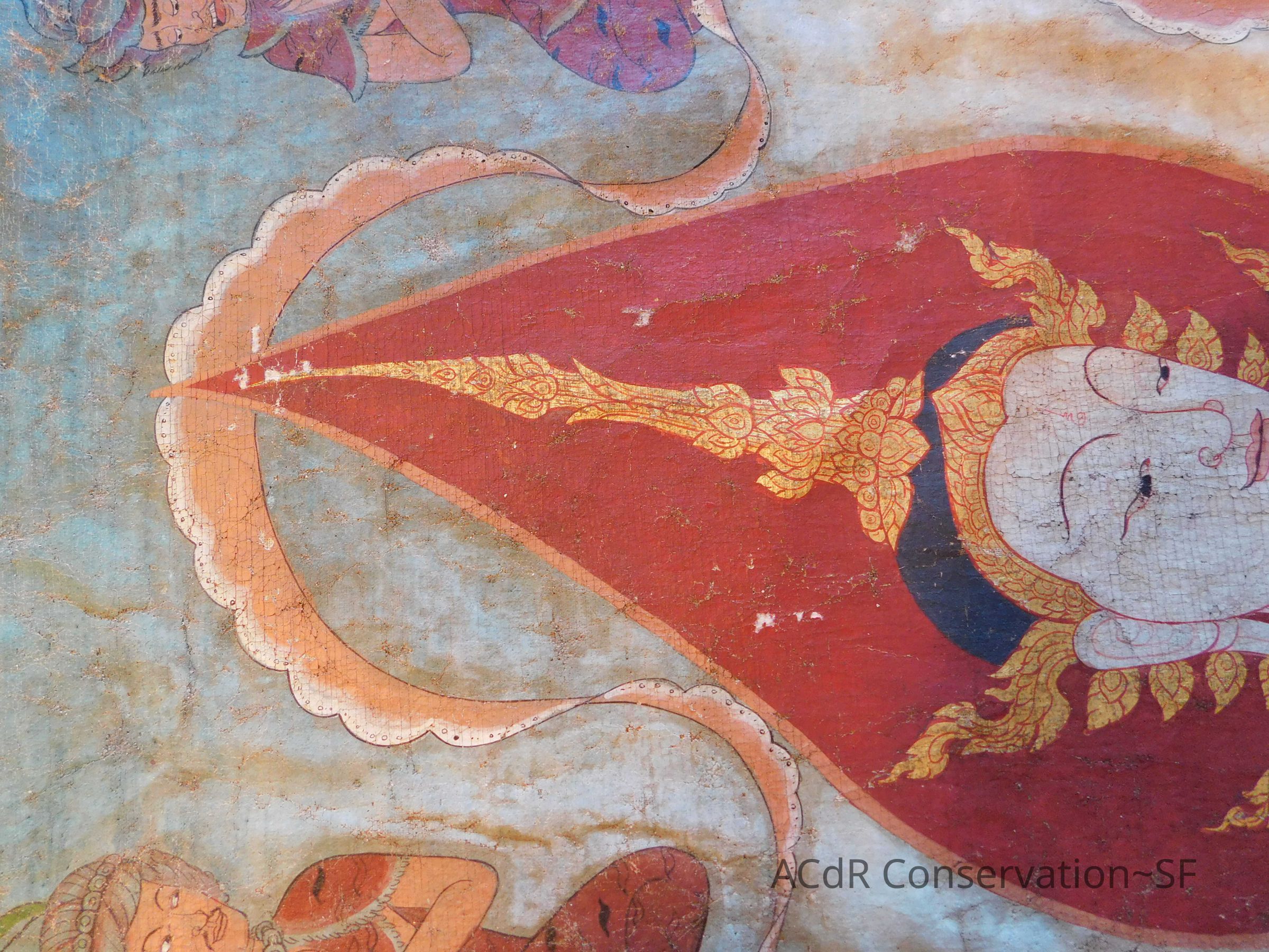 Precise consolidation of the flaking paint with a brush using 4% methylcellulose in water.