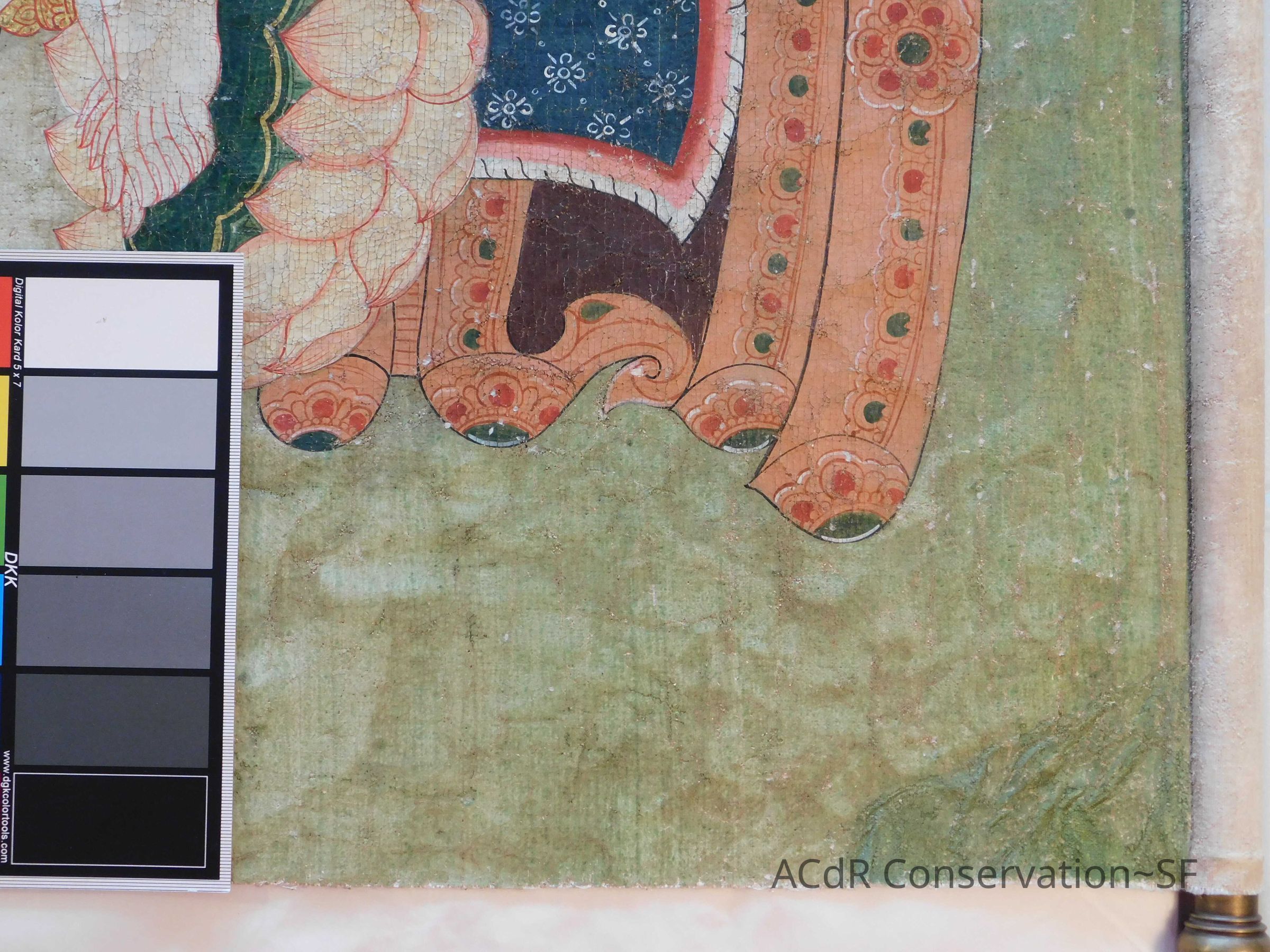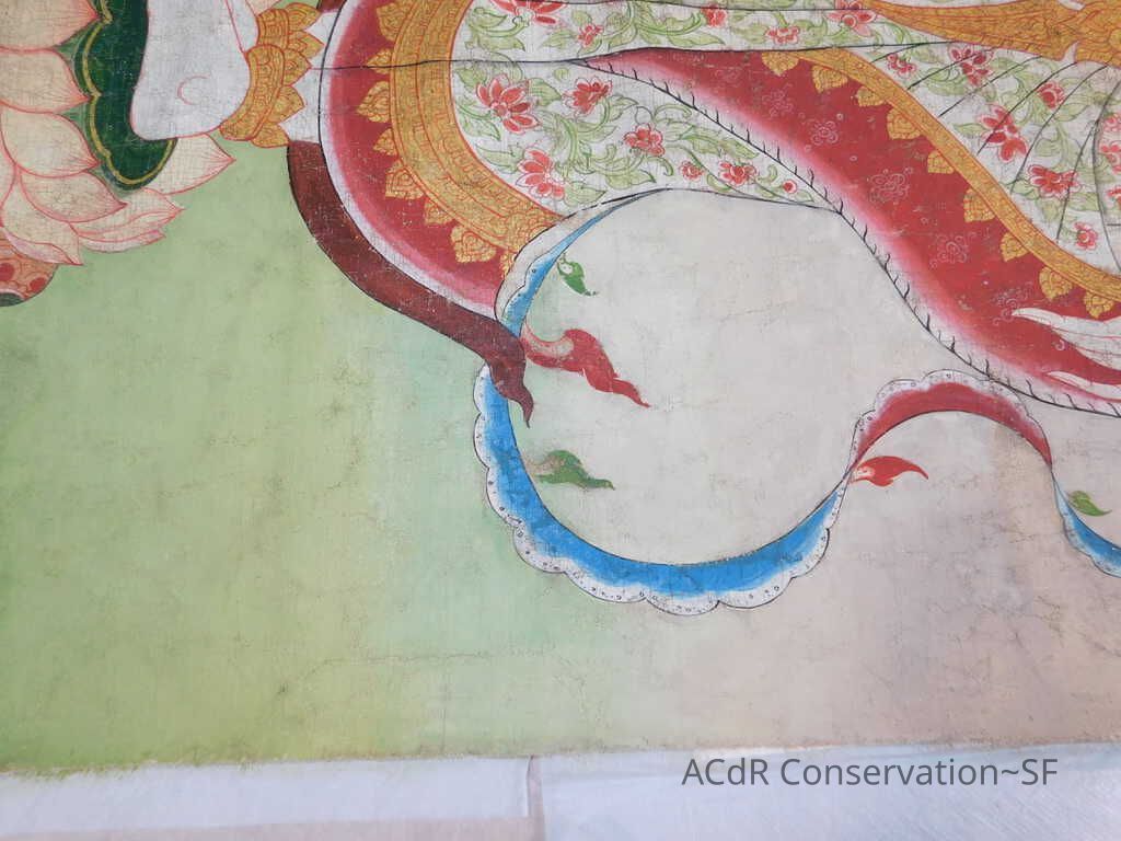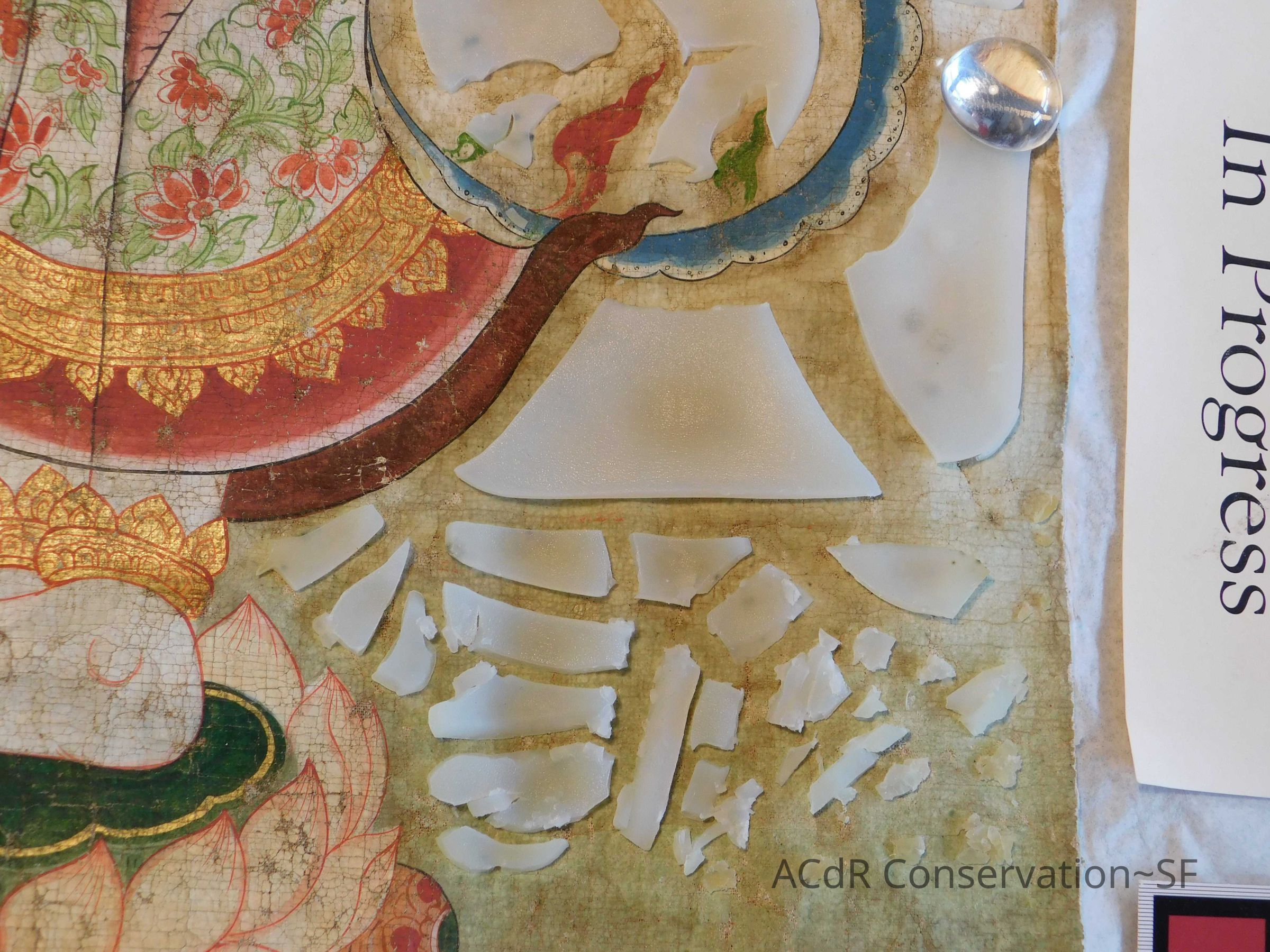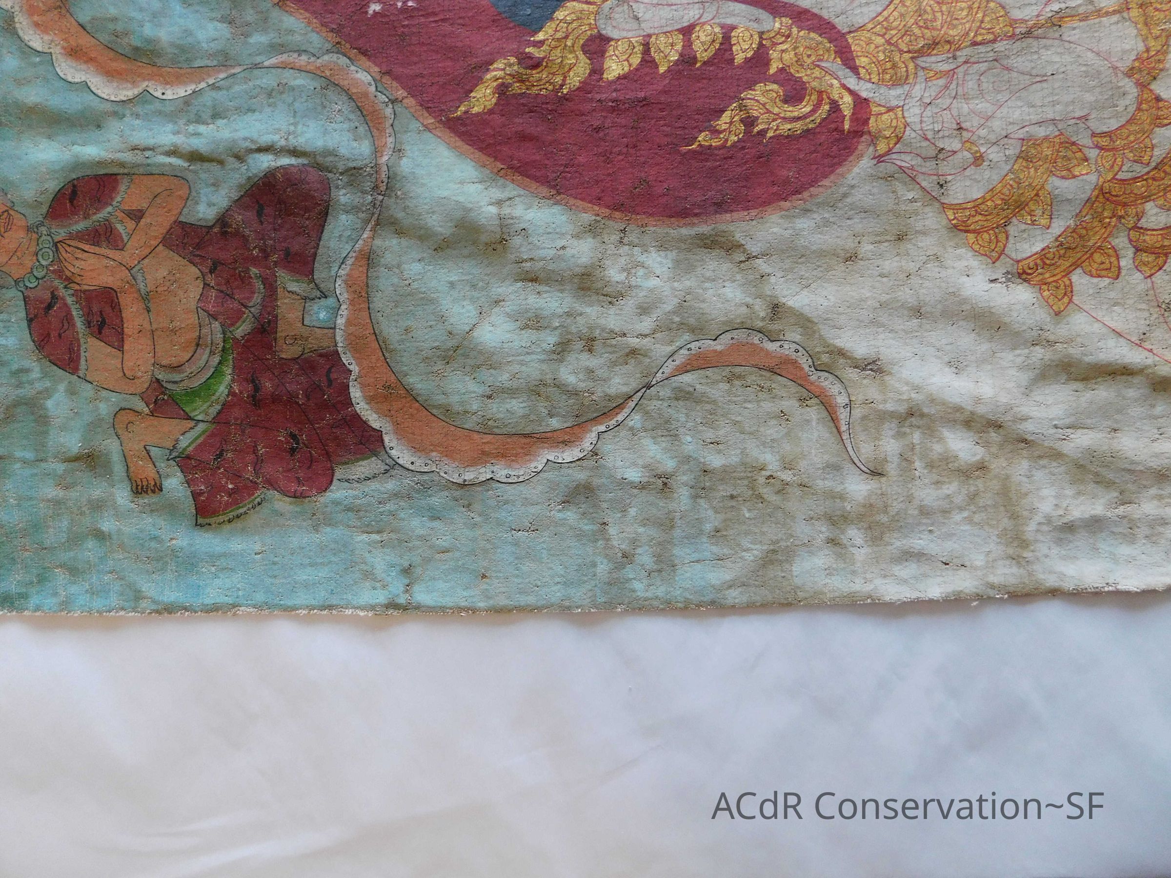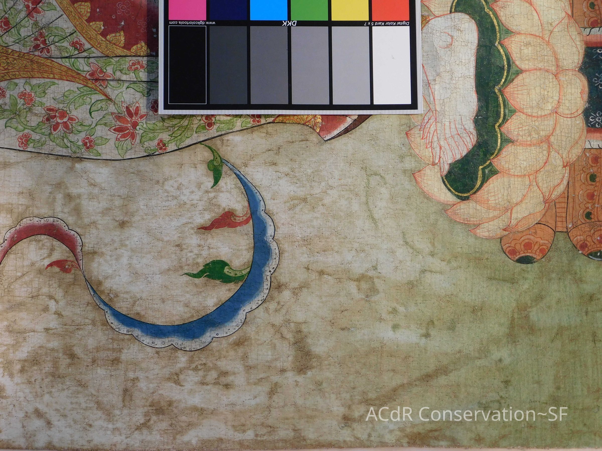 Precise consolidation of the flaking paint with a brush using 4% methylcellulose in water.
