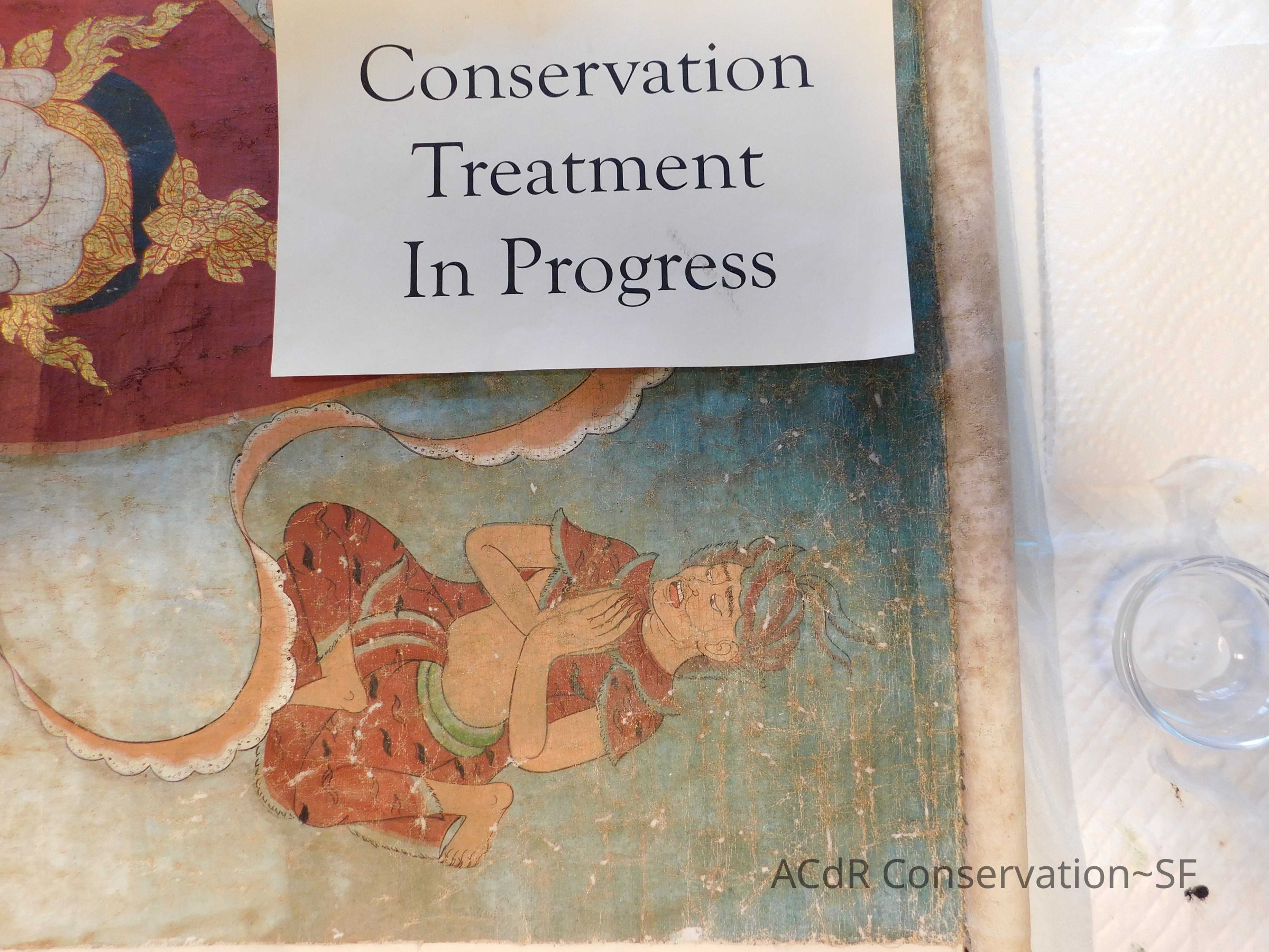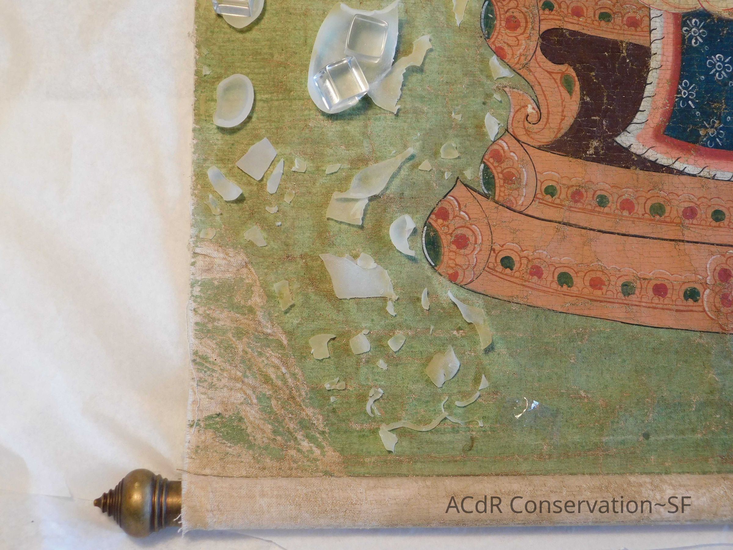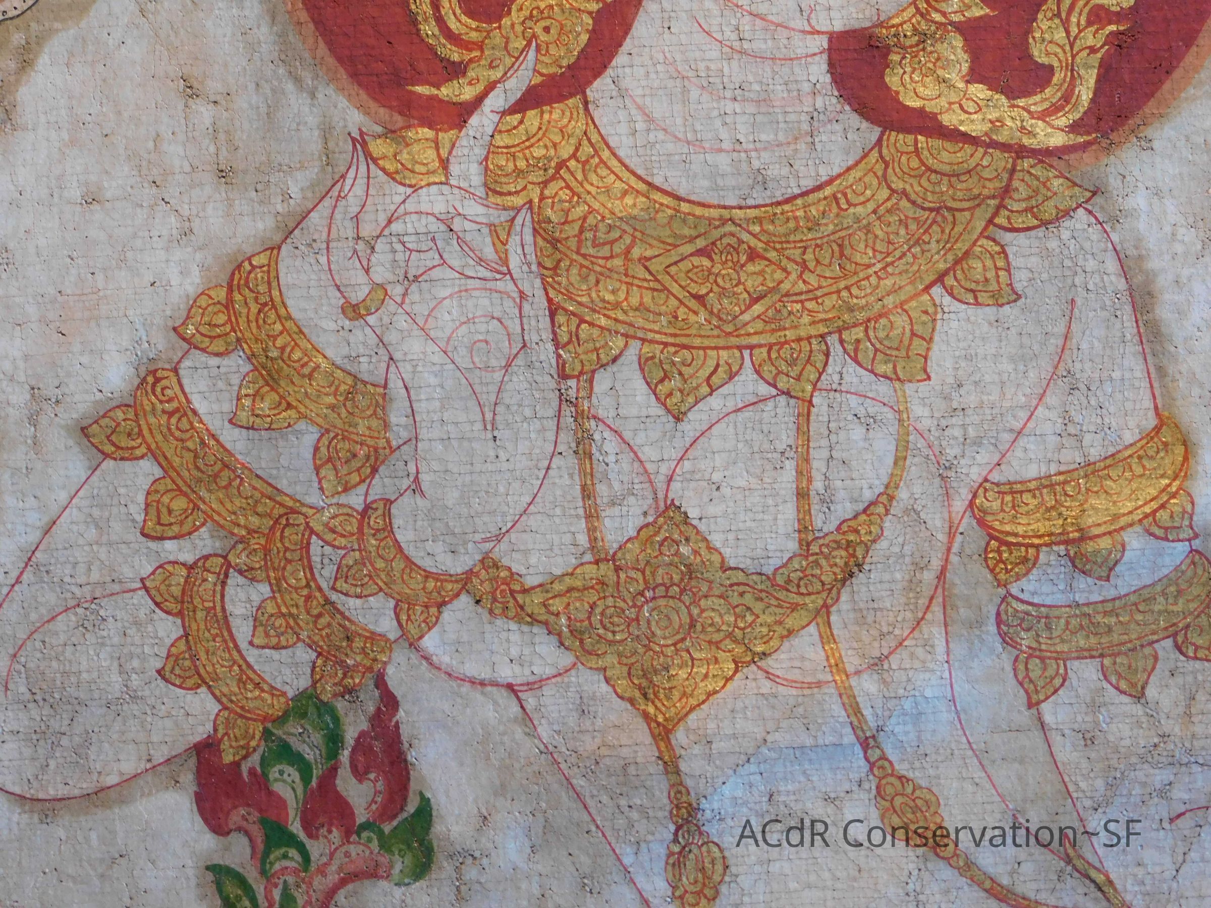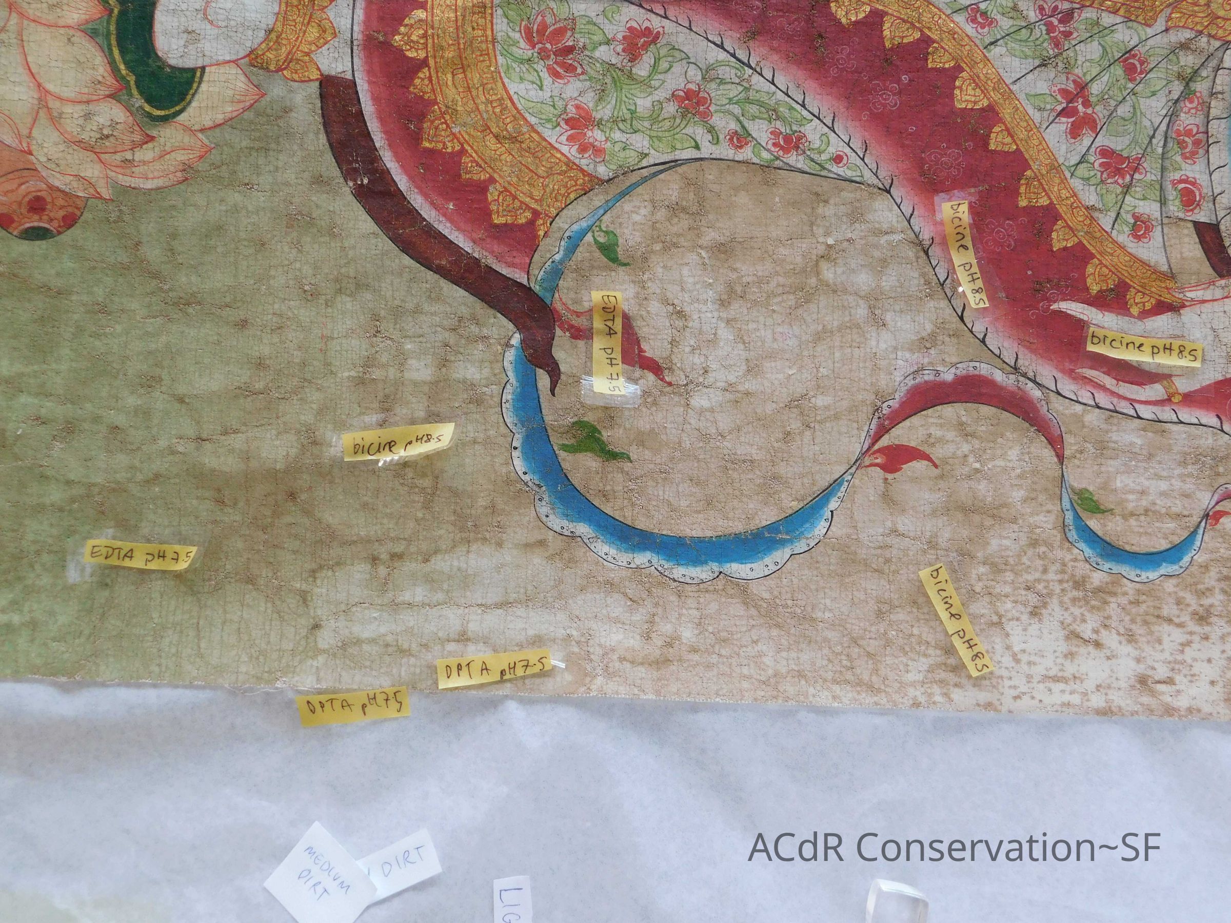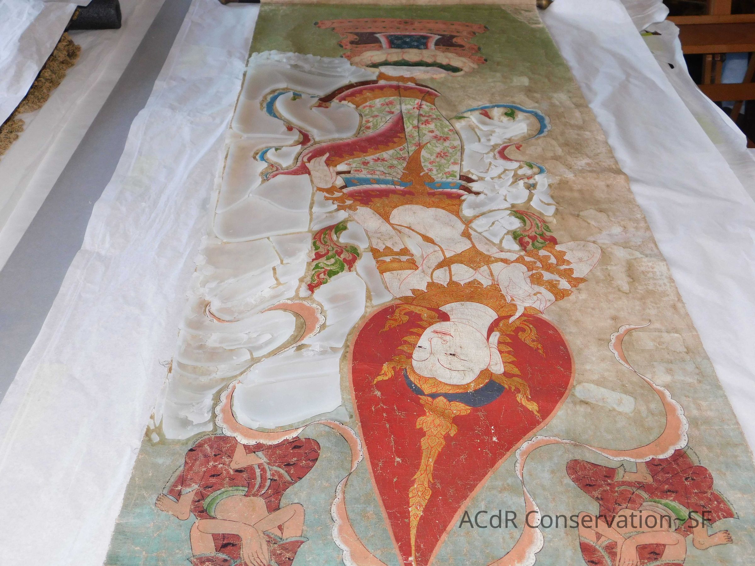Precise consolidation of the flaking paint with a brush using 4% methylcellulose in water.