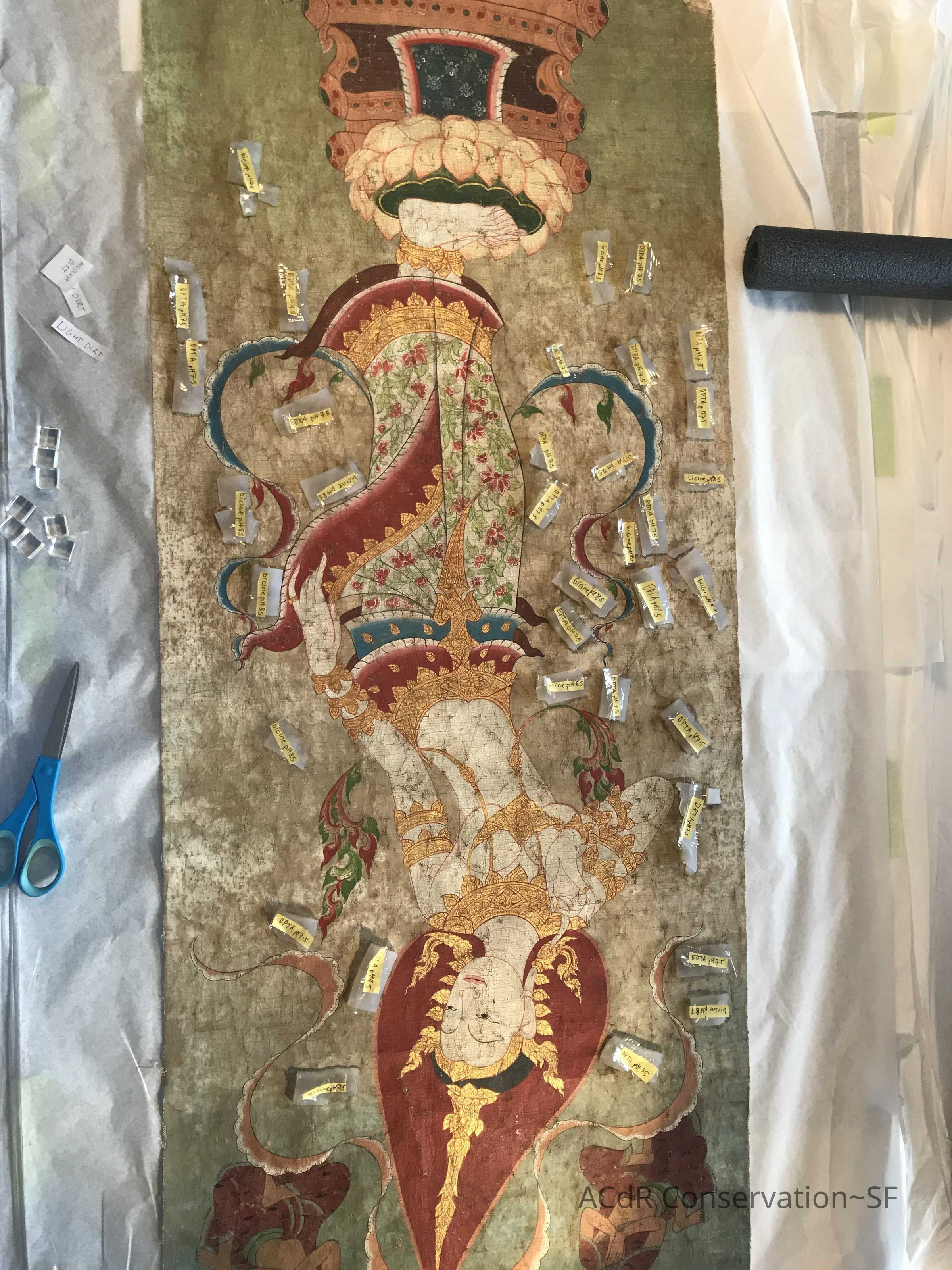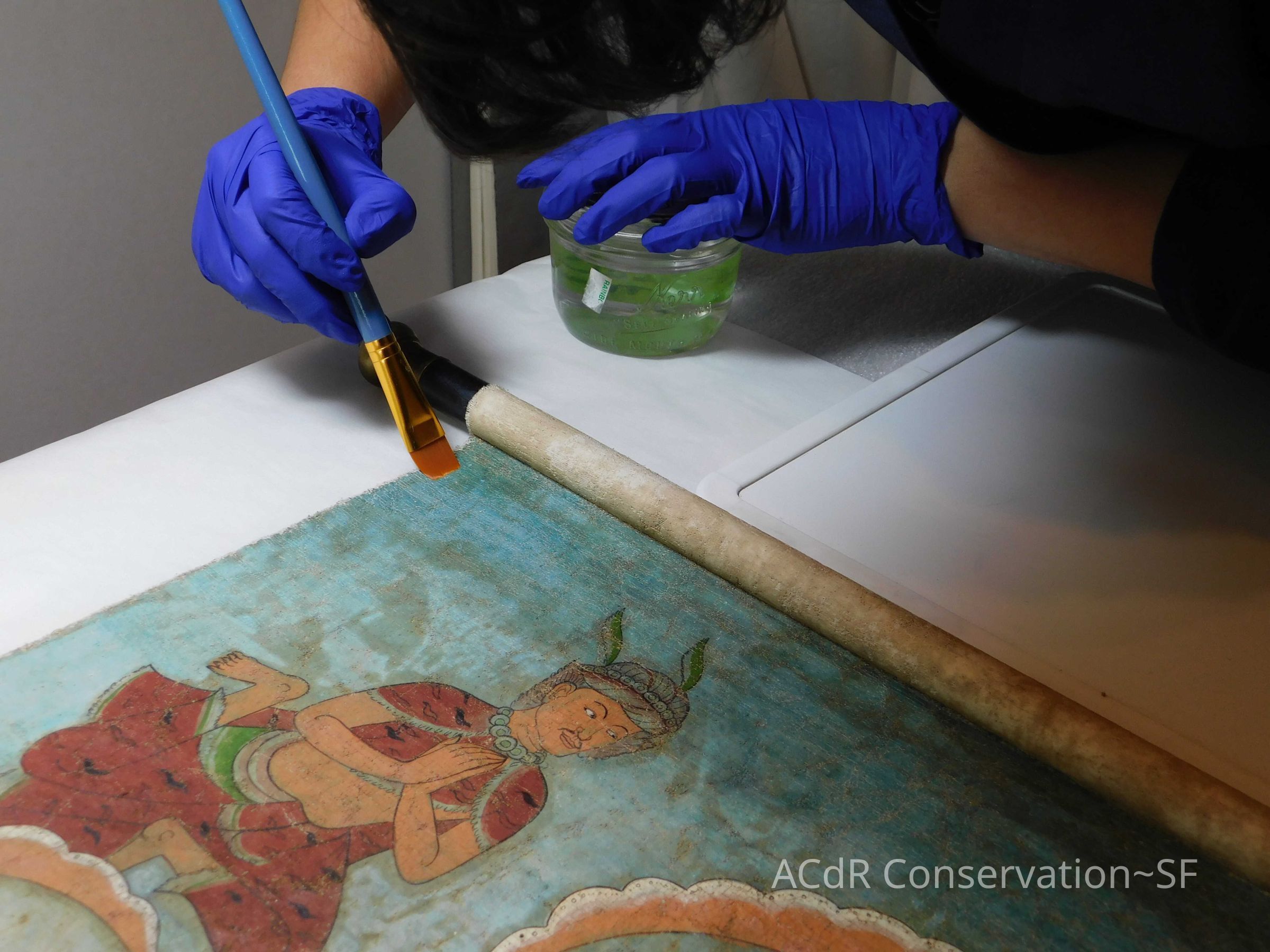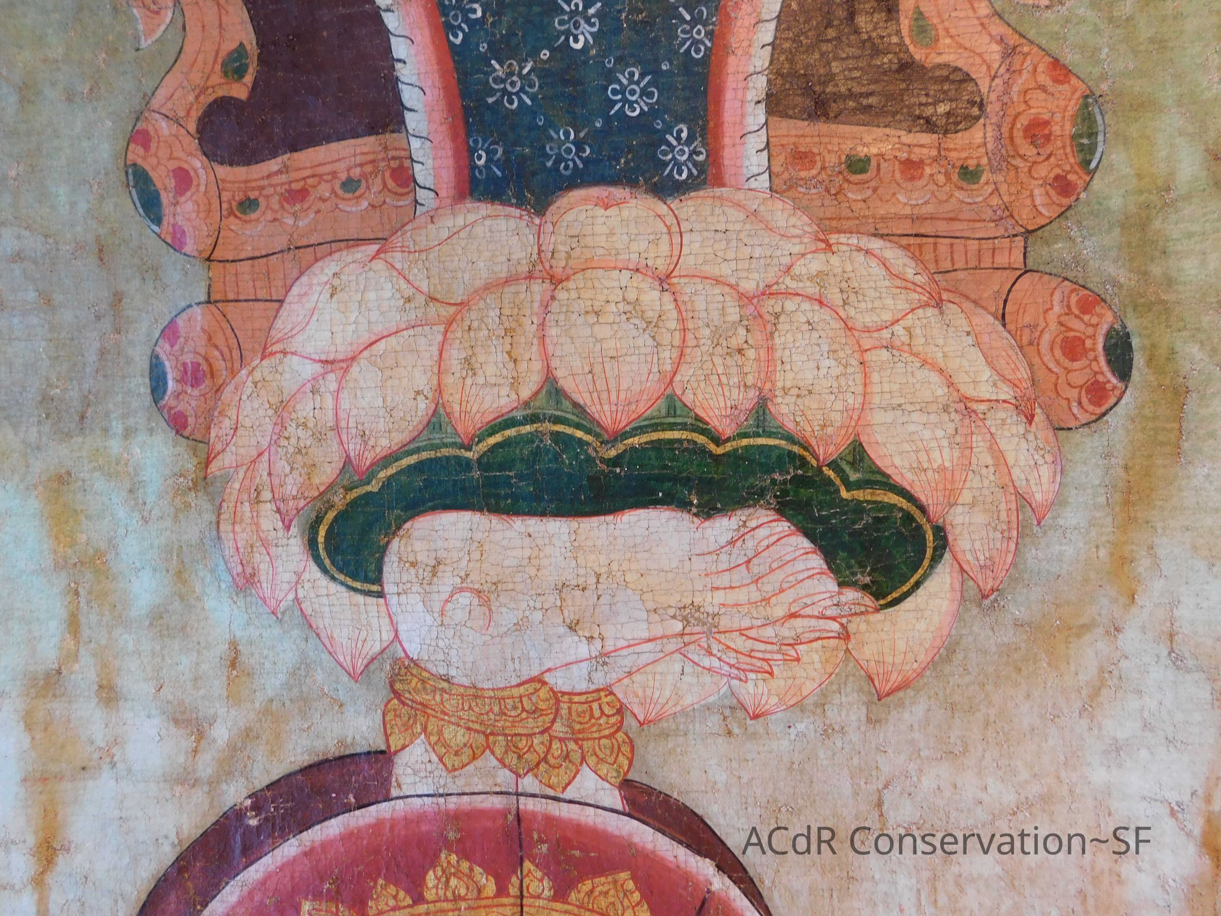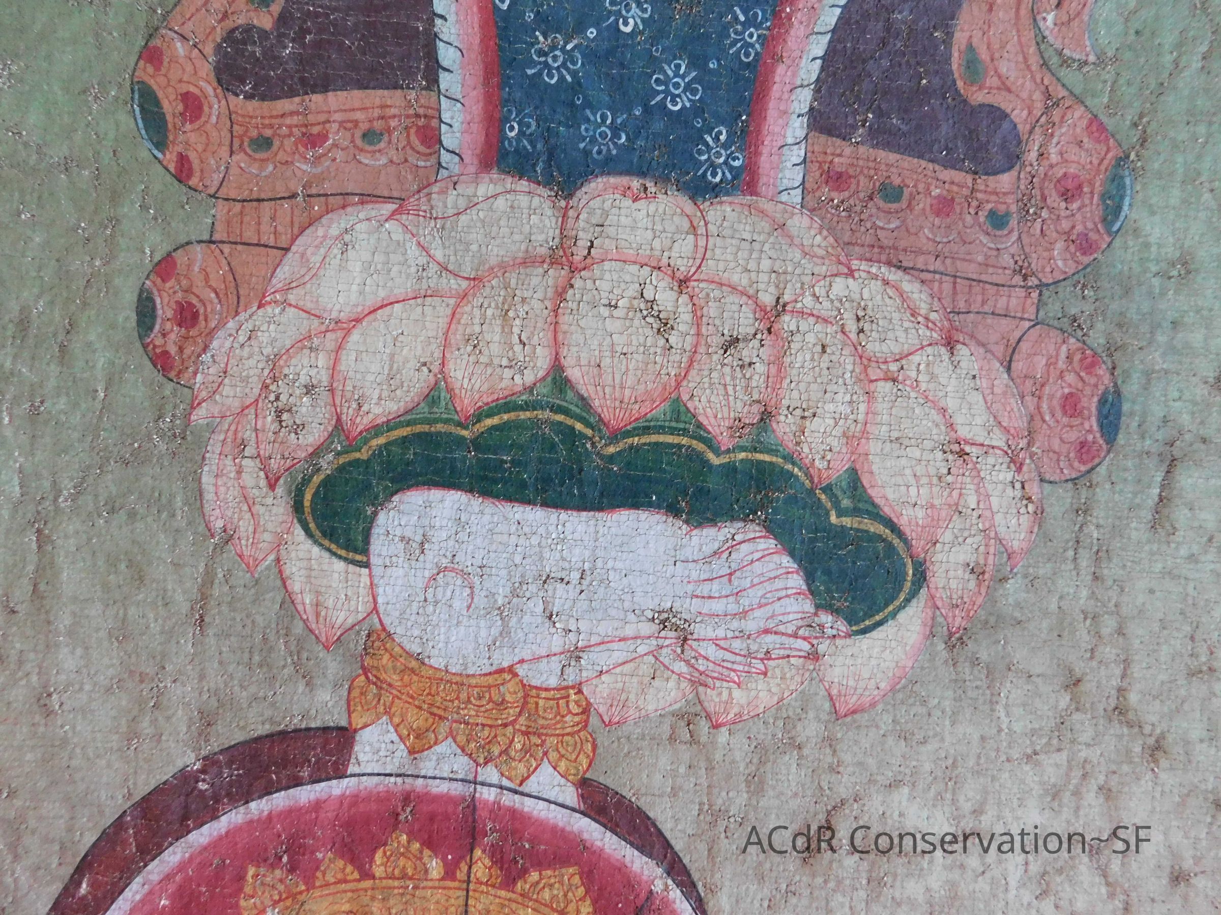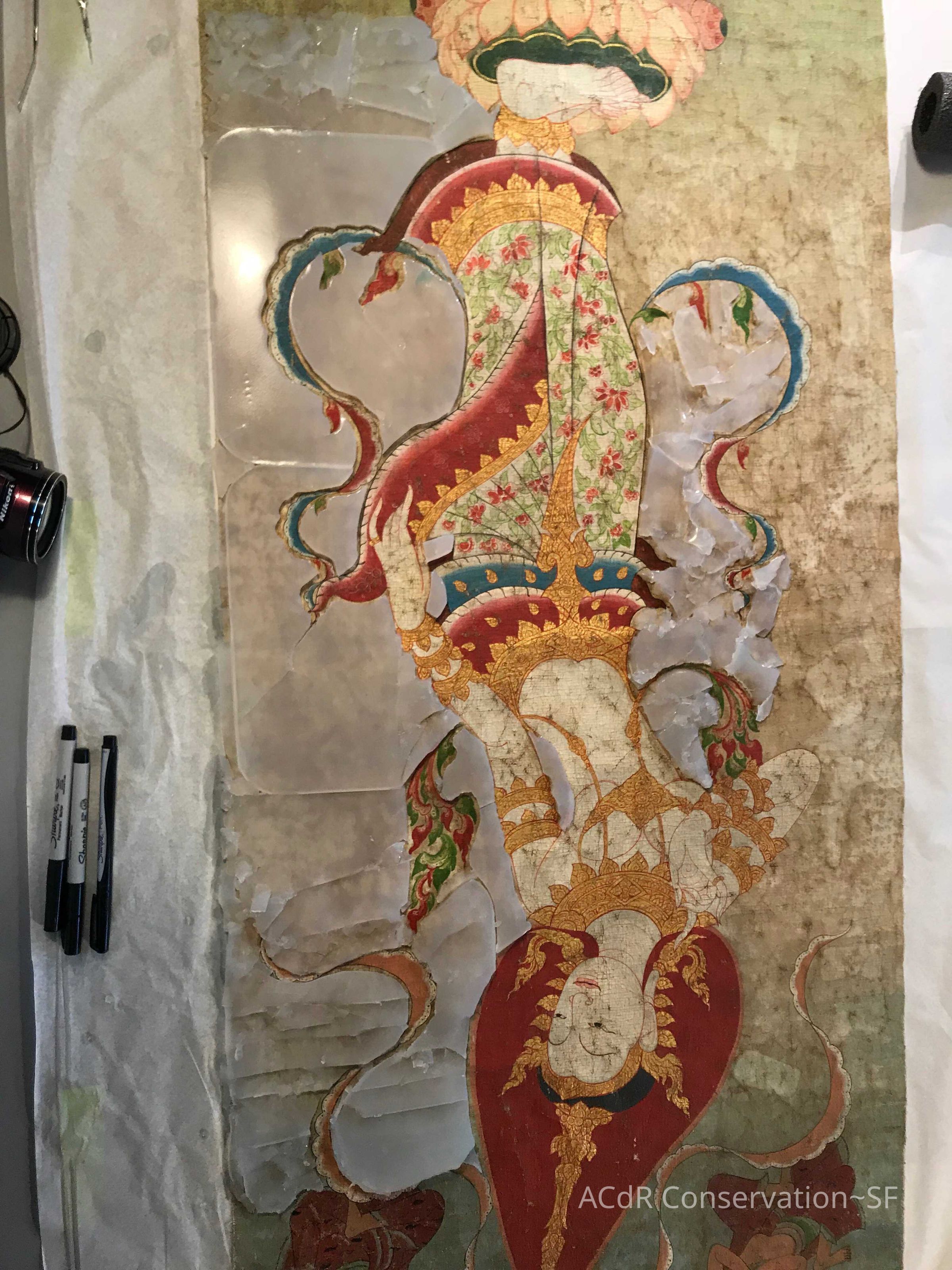 Precise consolidation of the flaking paint with a brush using 4% methylcellulose in water.