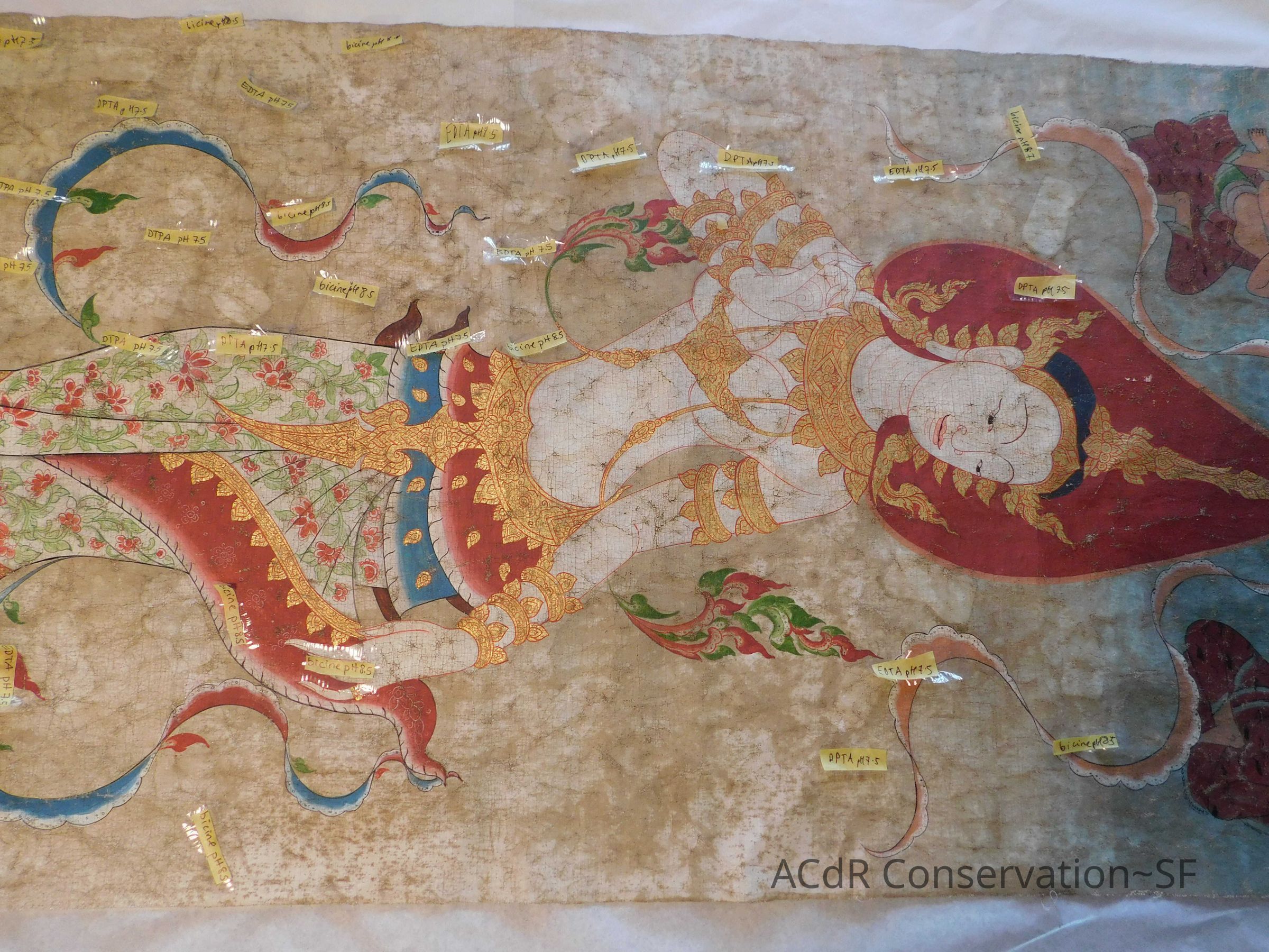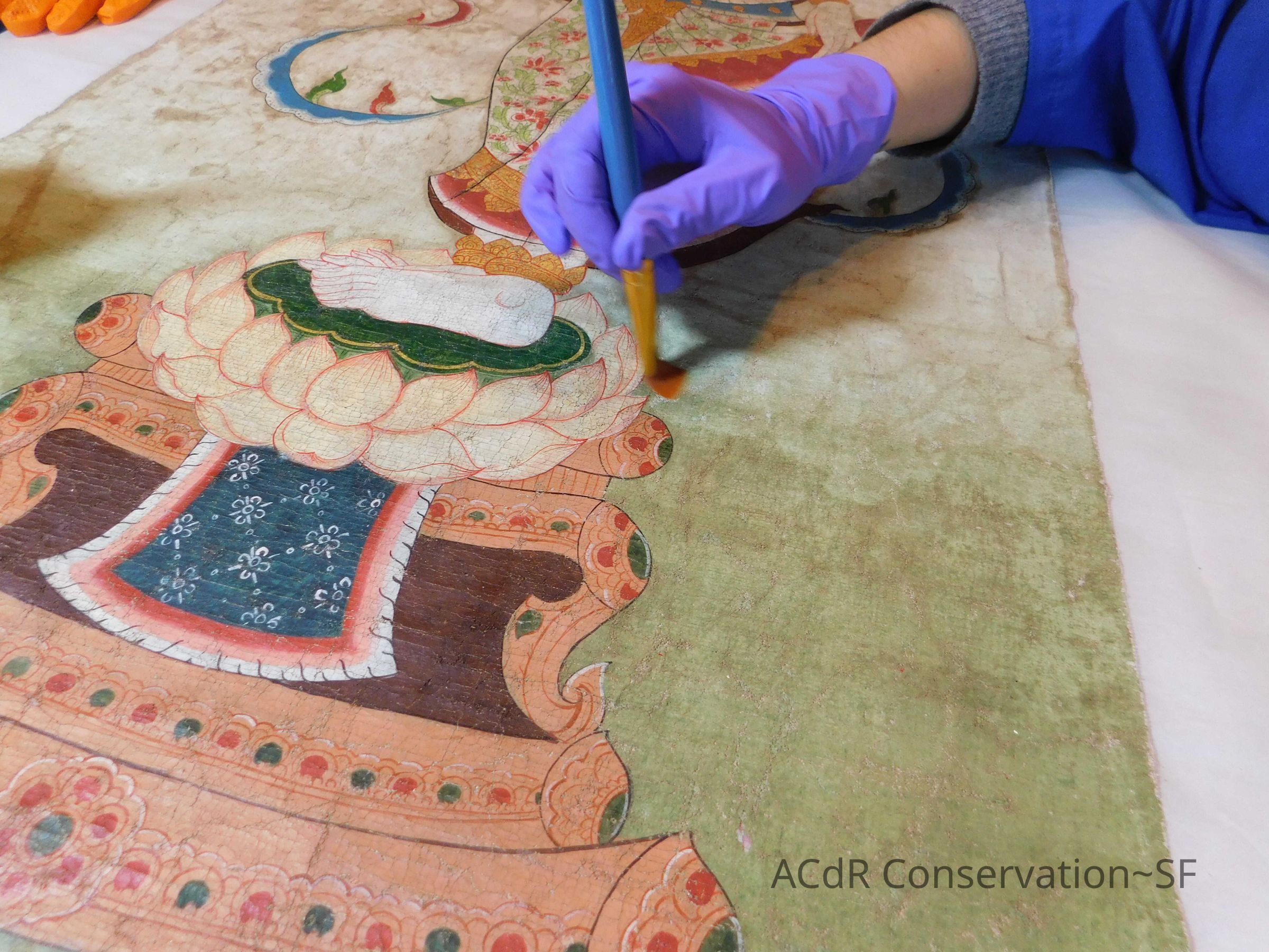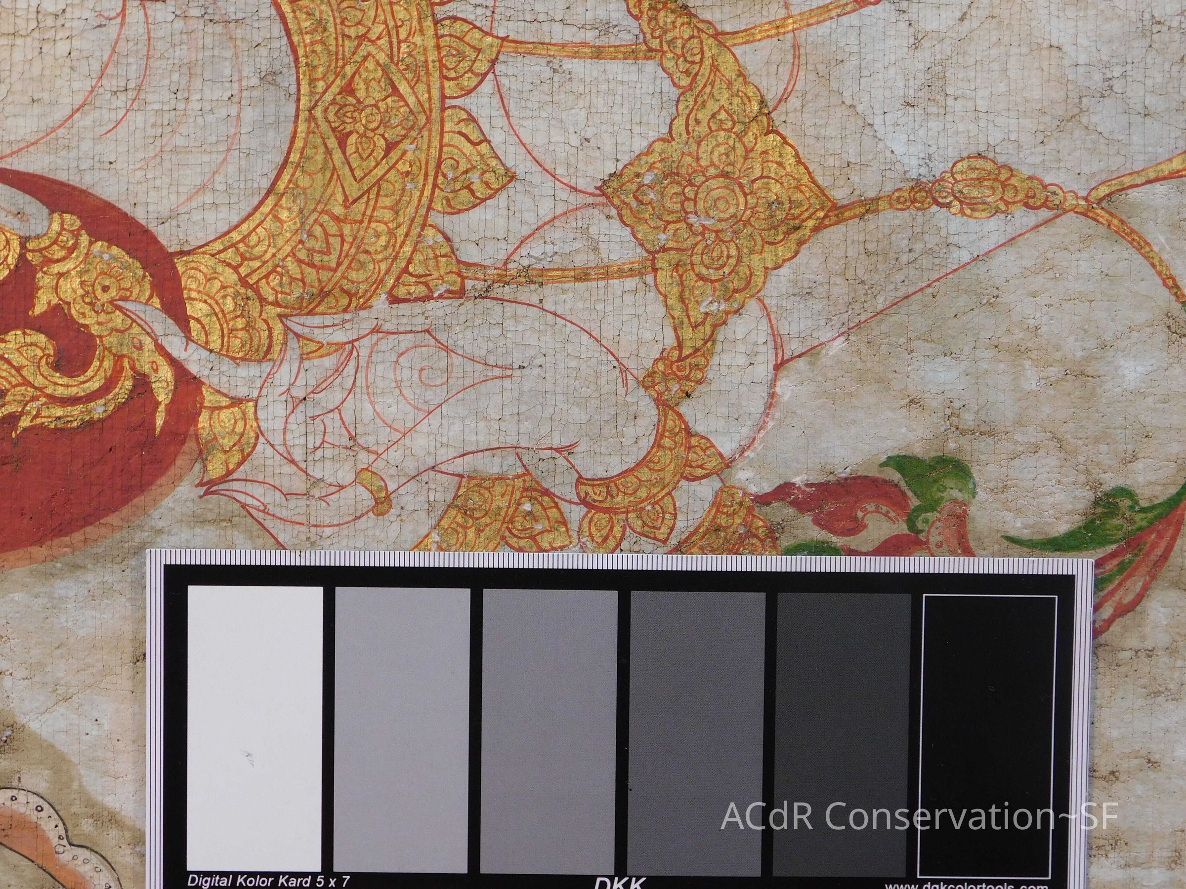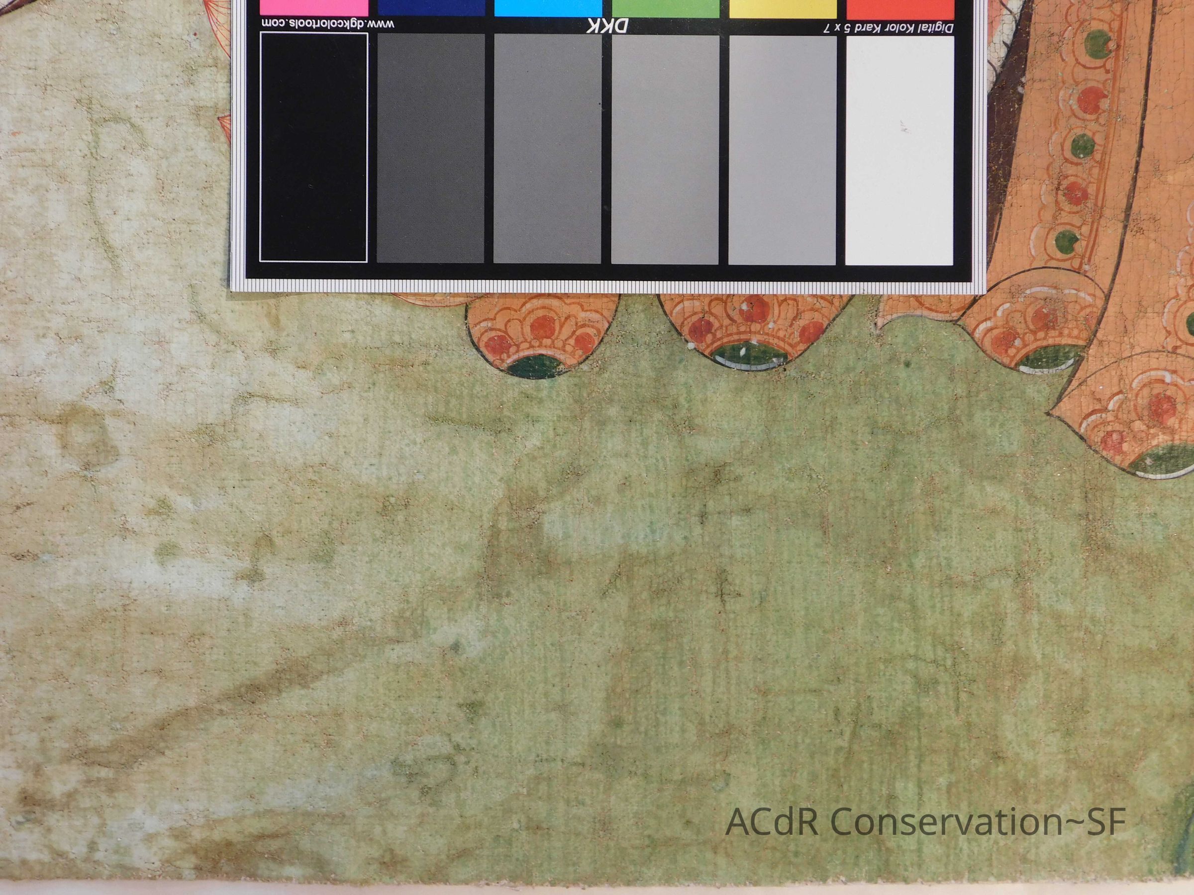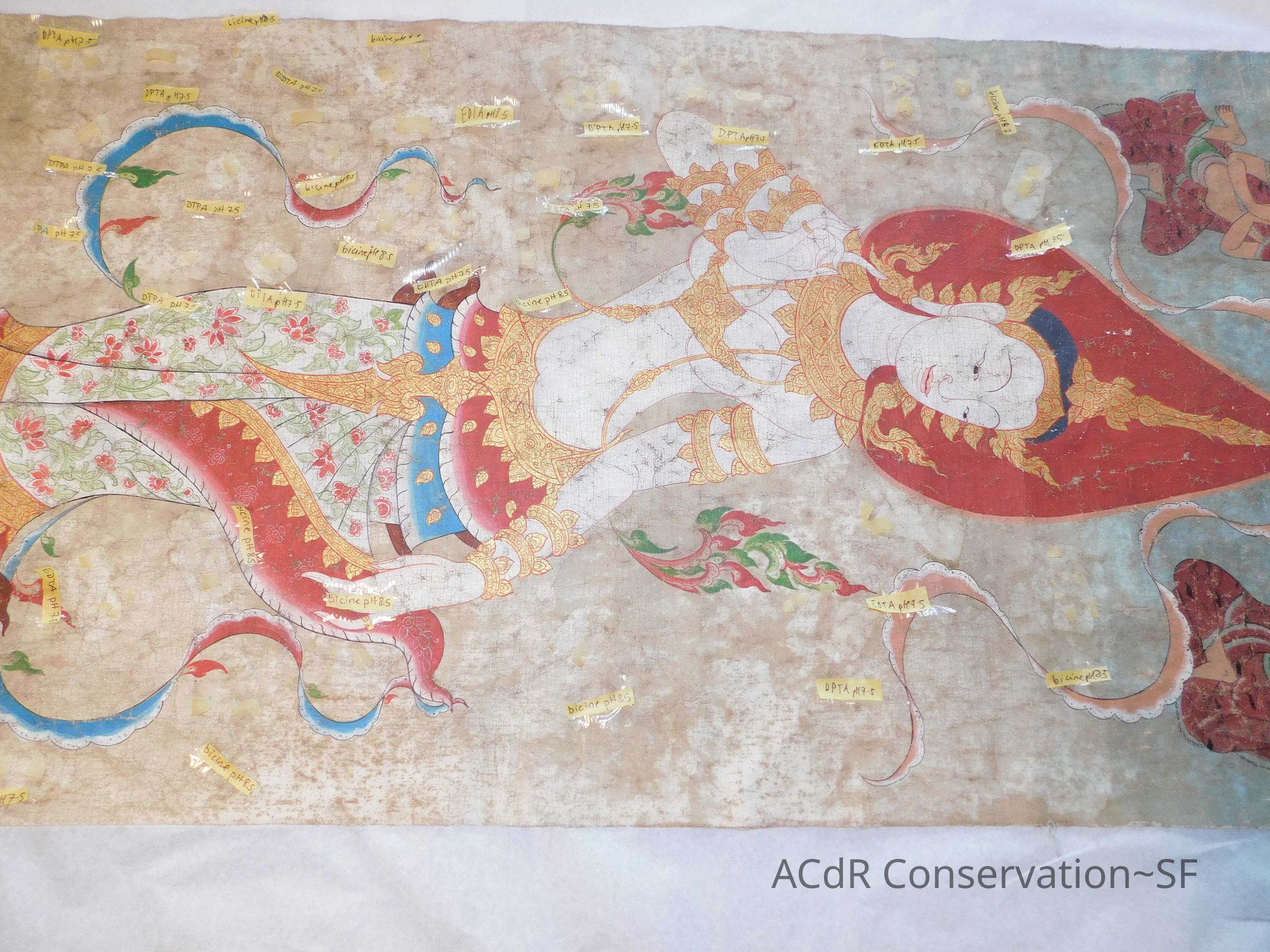 Precise consolidation of the flaking paint with a brush using 4% methylcellulose in water.