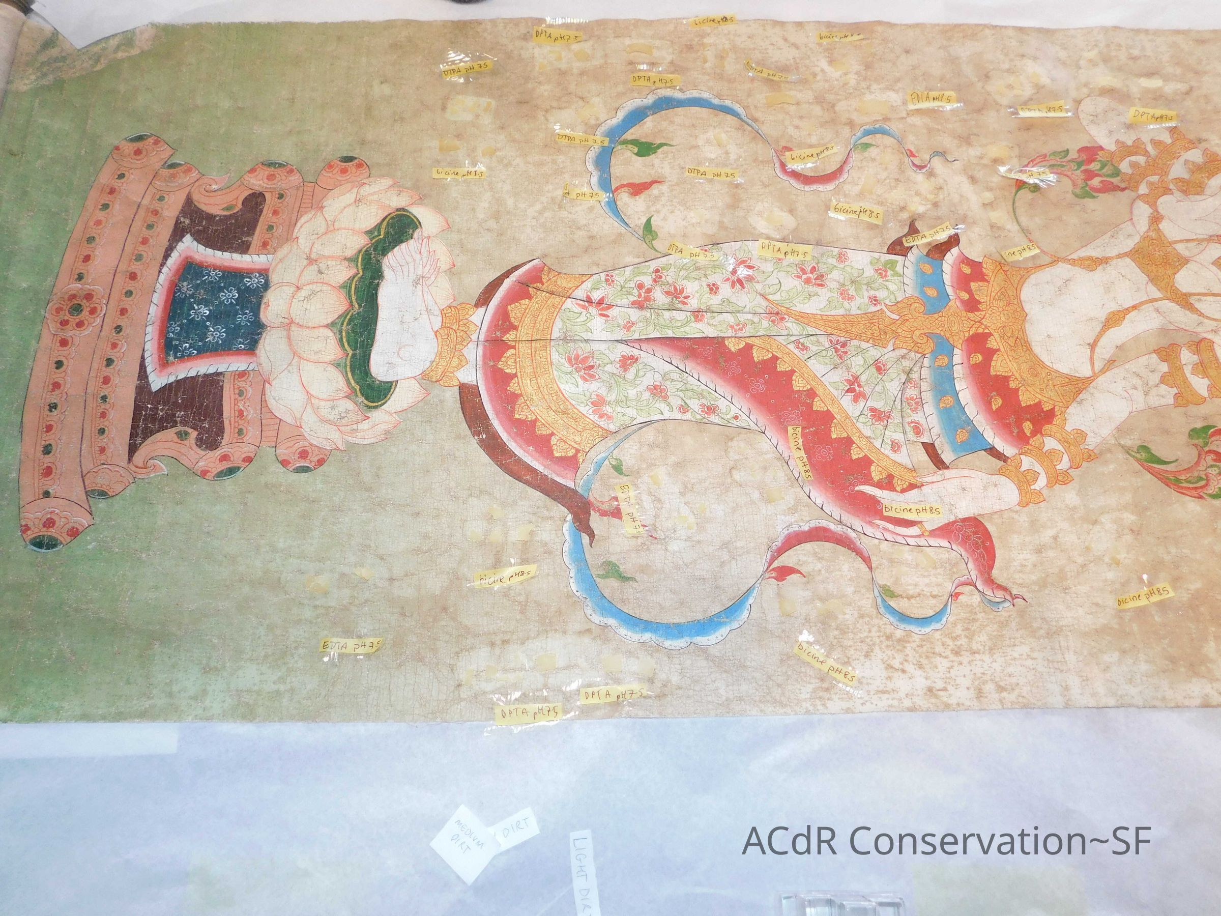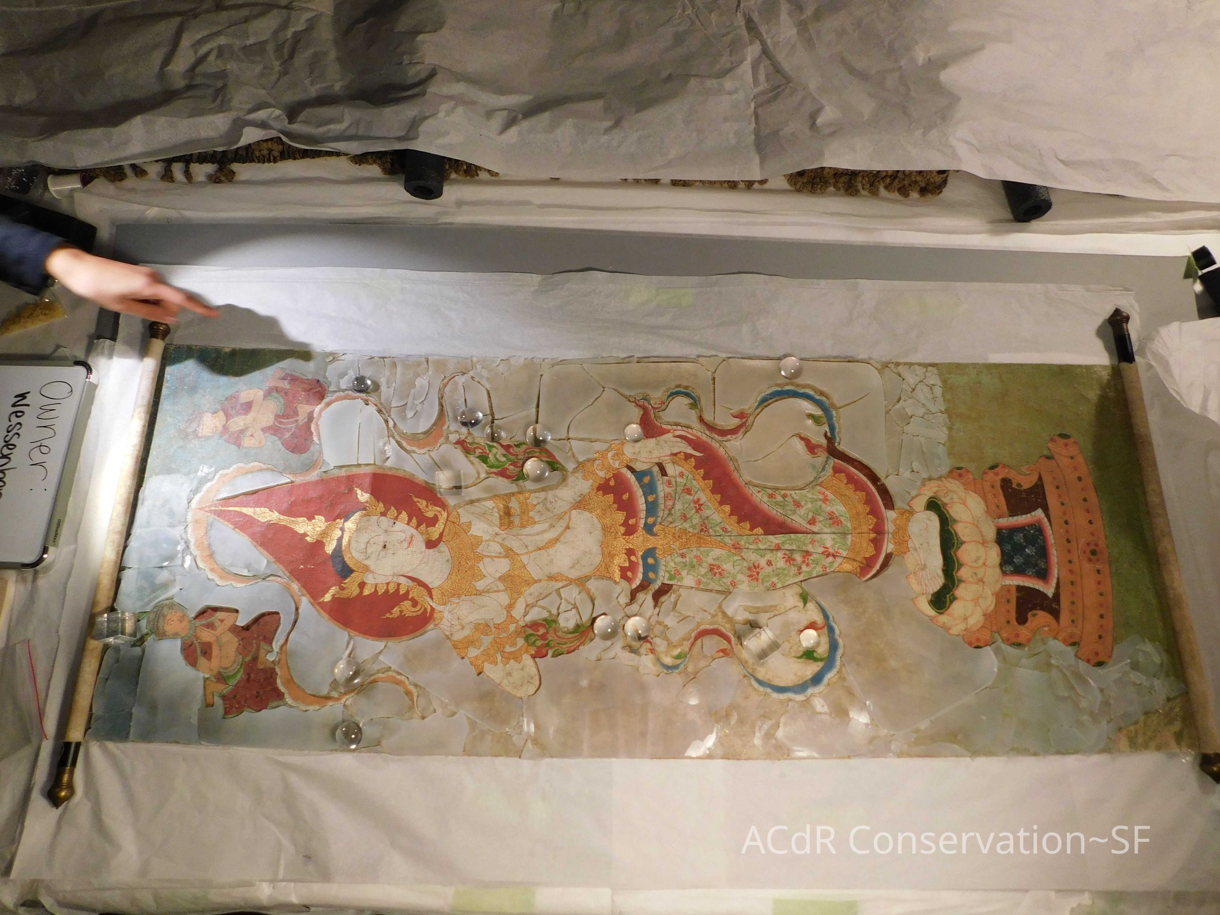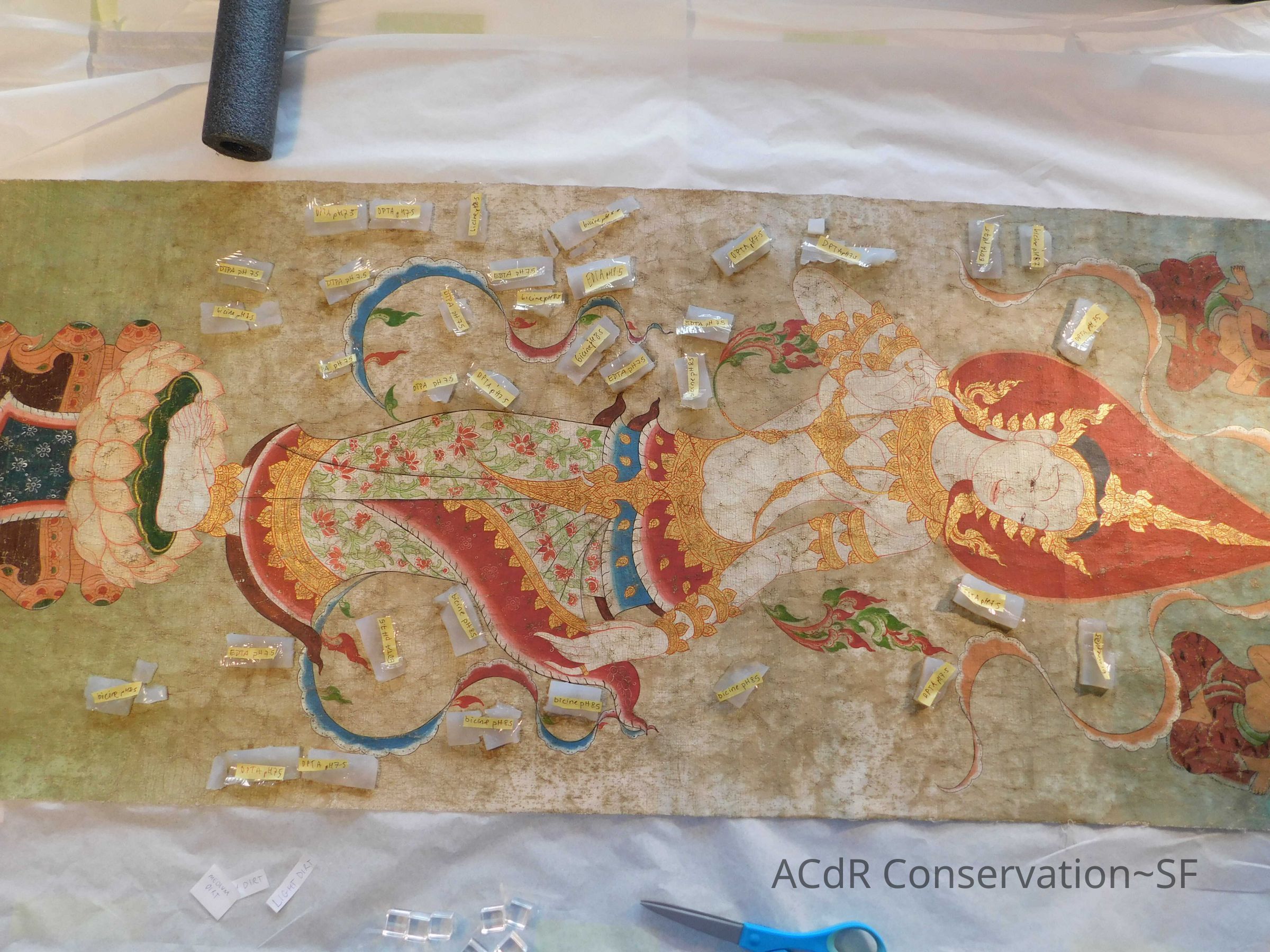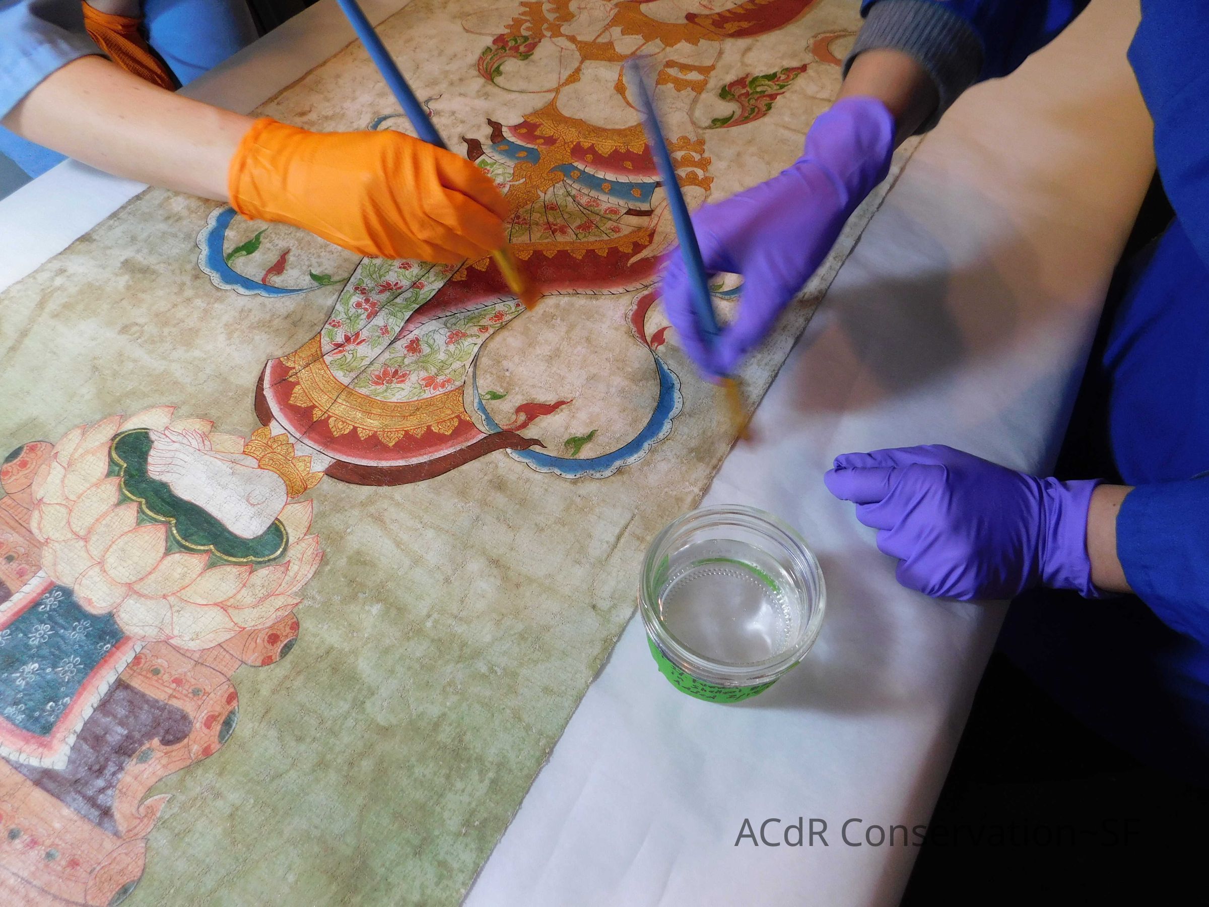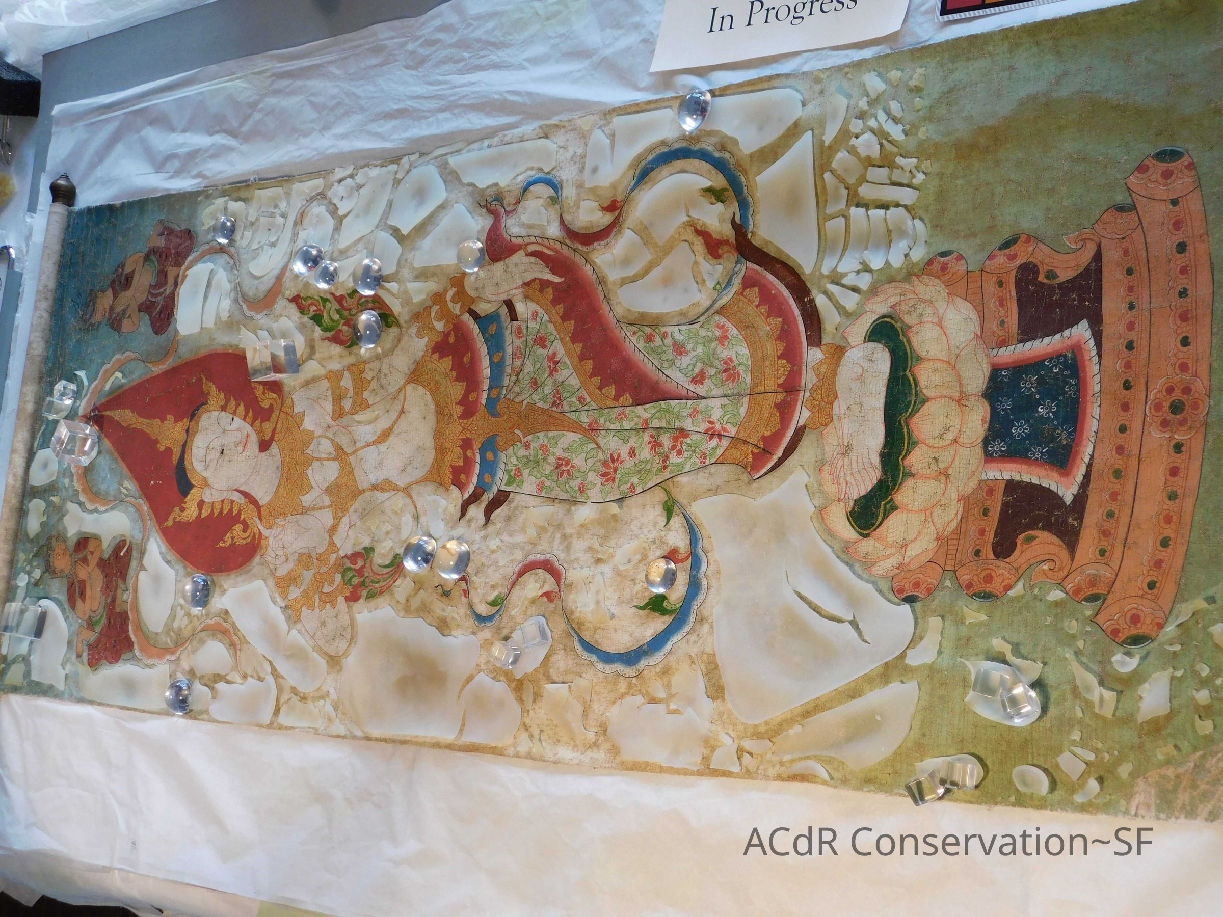 Precise consolidation of the flaking paint with a brush using 4% methylcellulose in water.