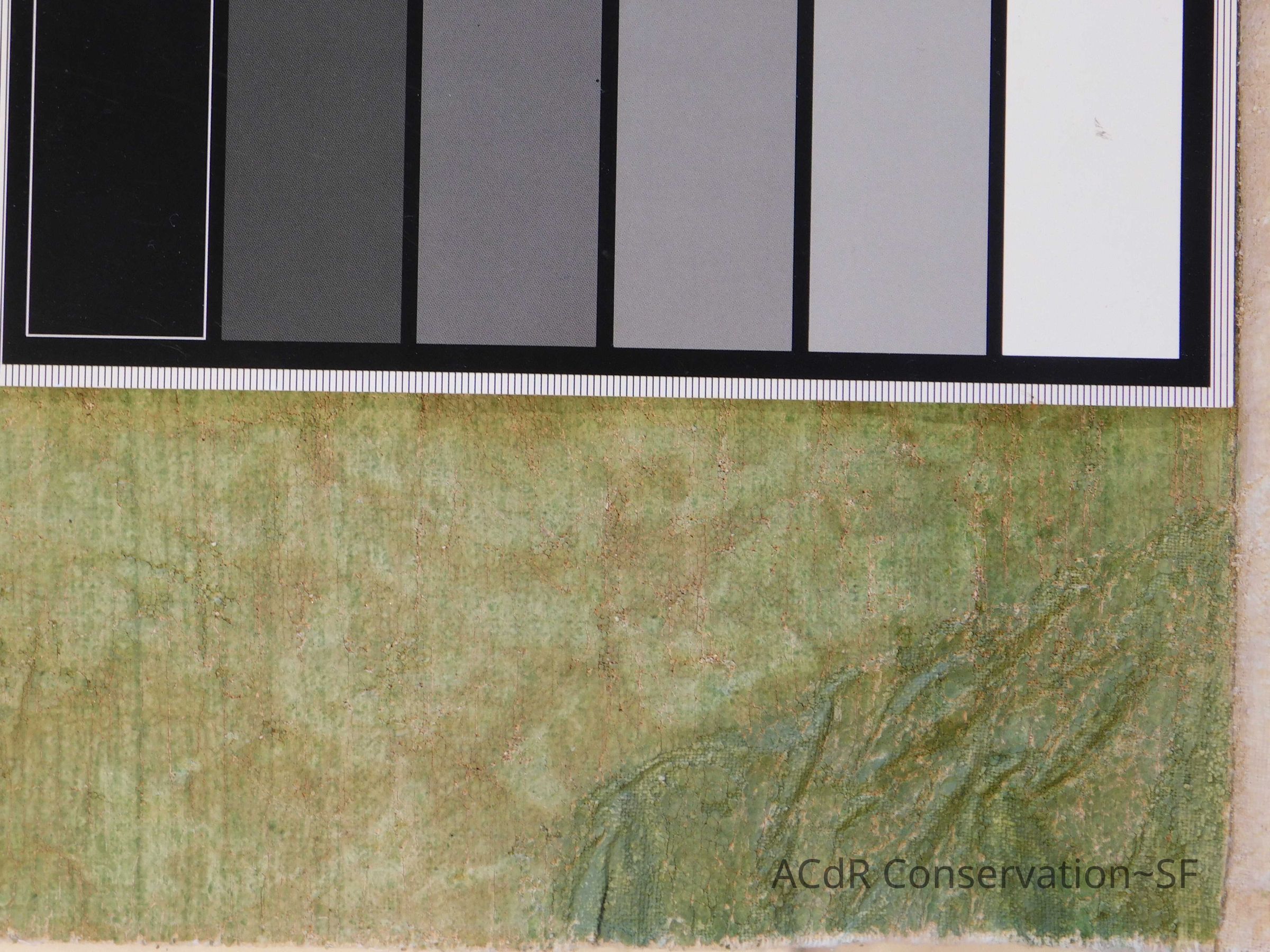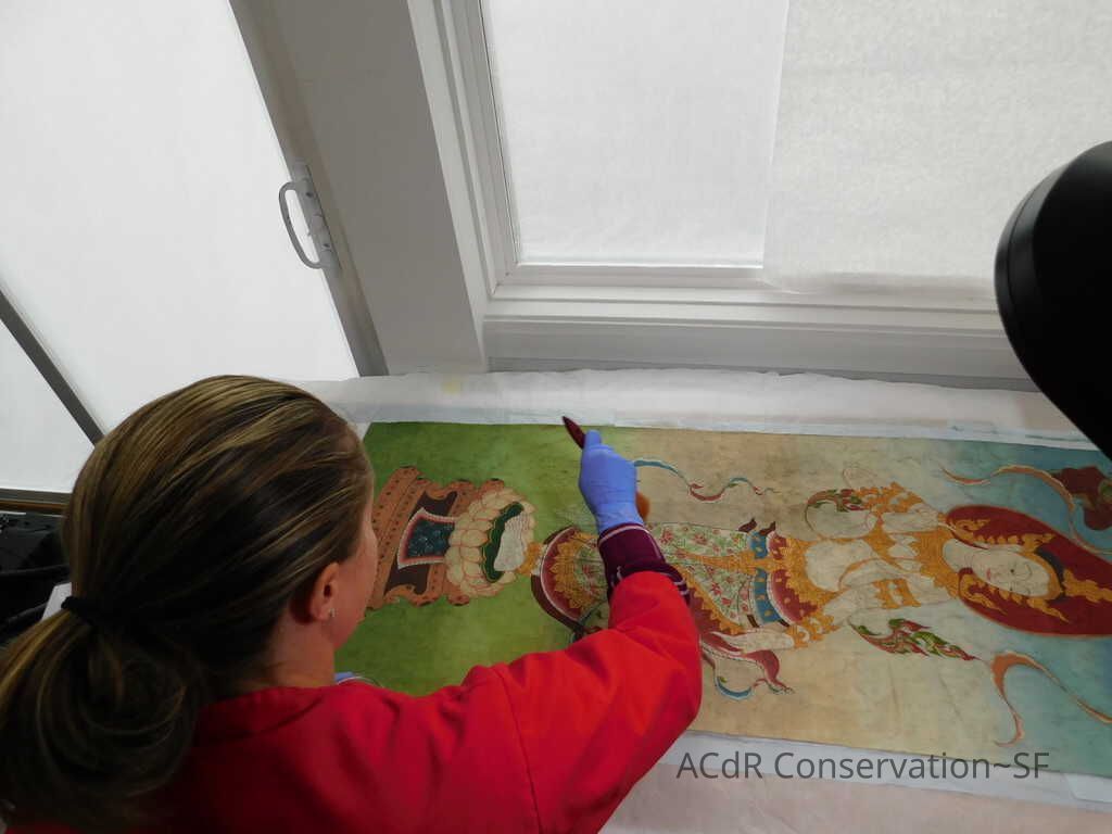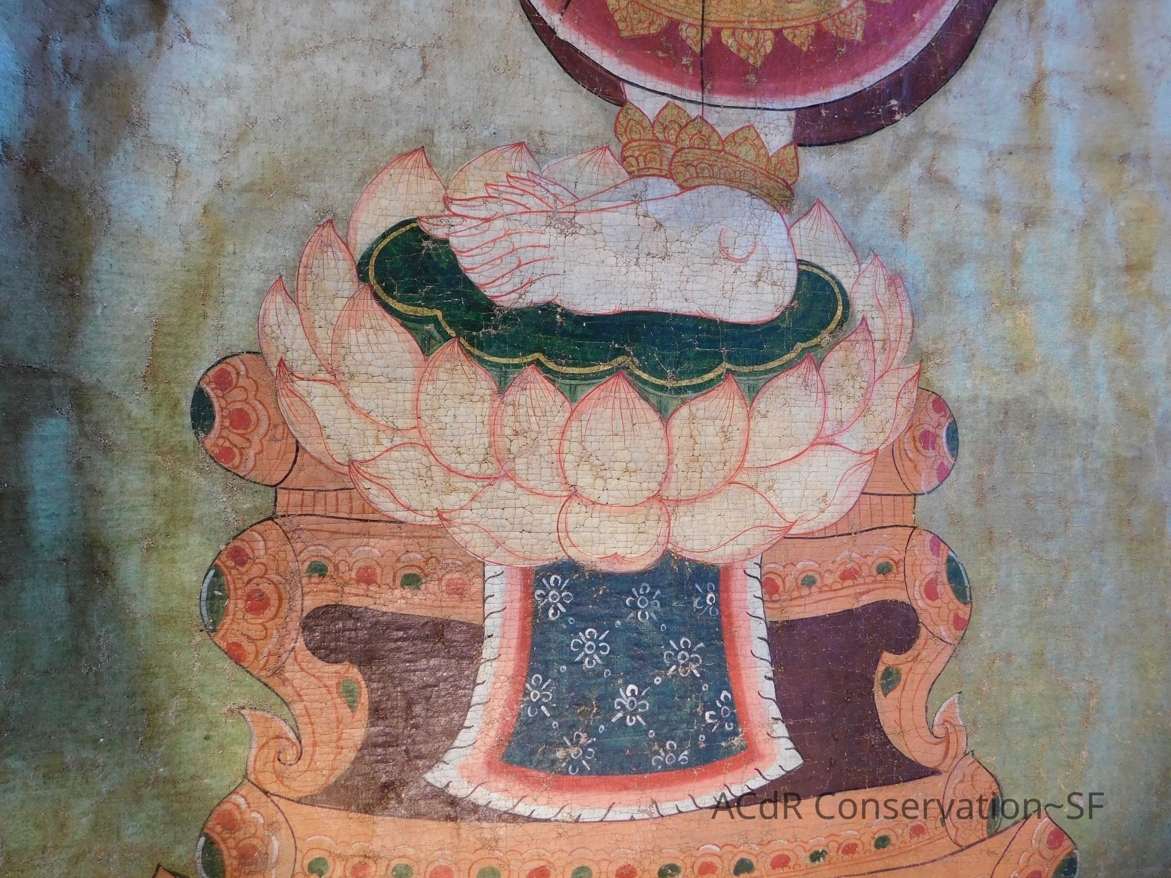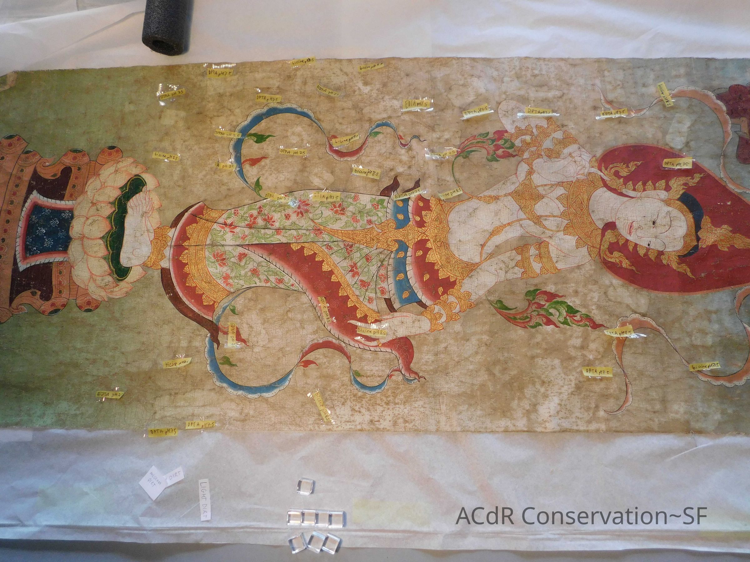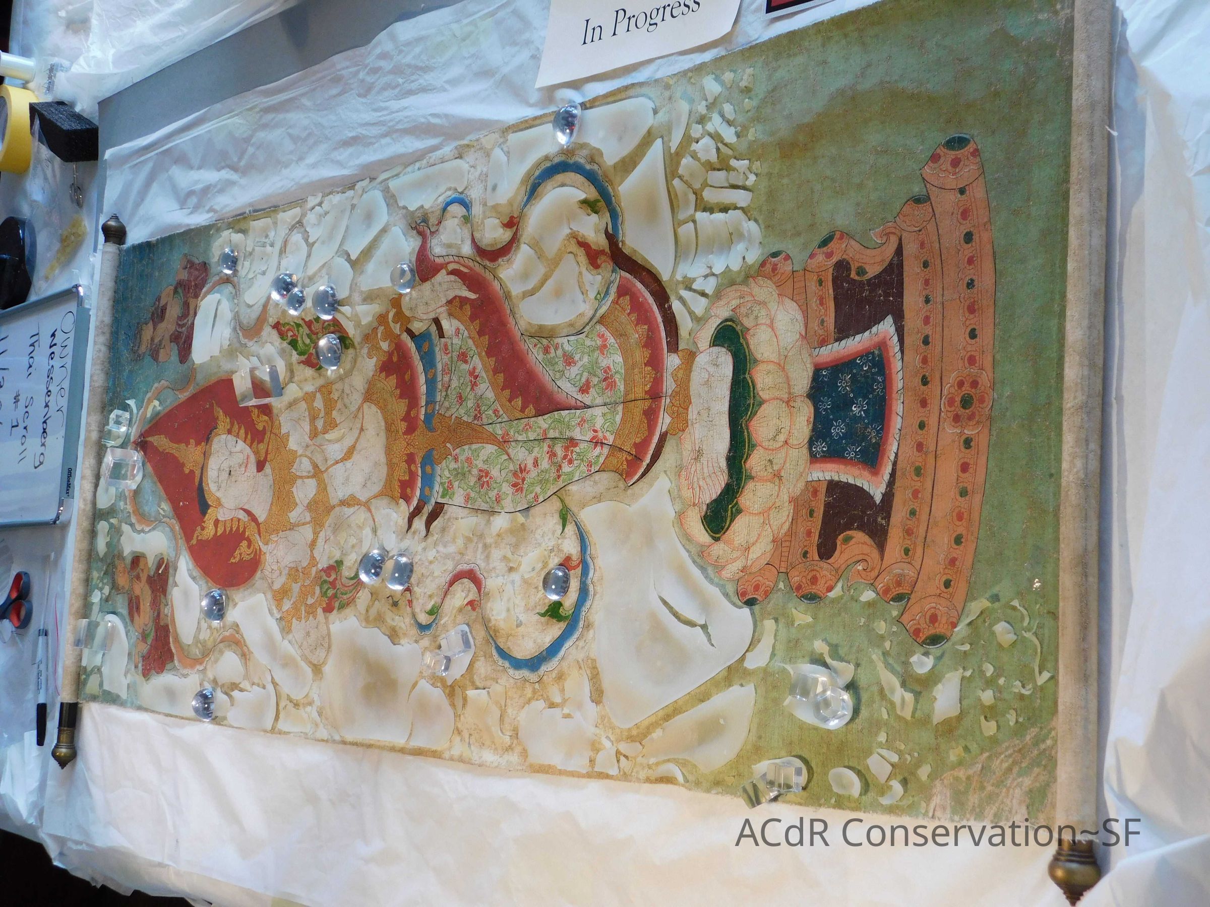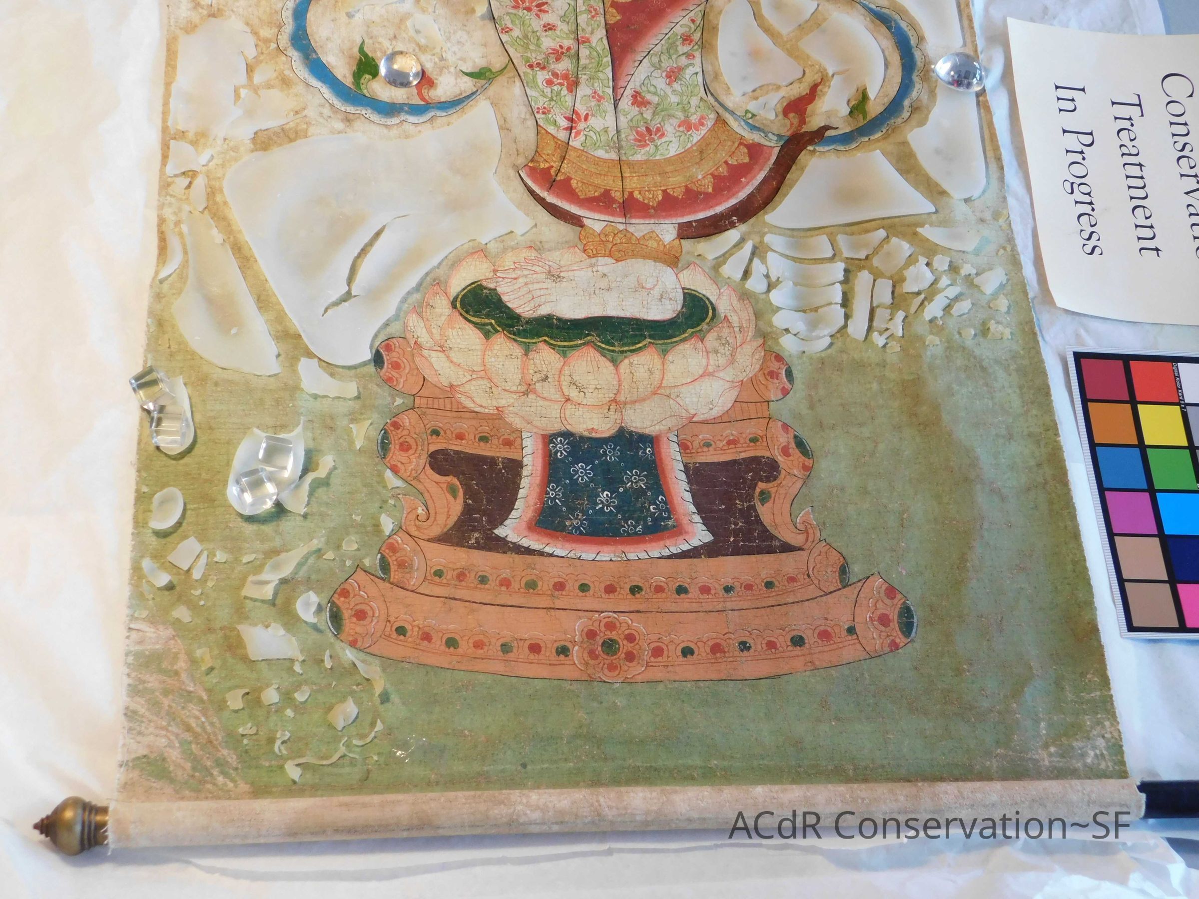 Precise consolidation of the flaking paint with a brush using 4% methylcellulose in water.