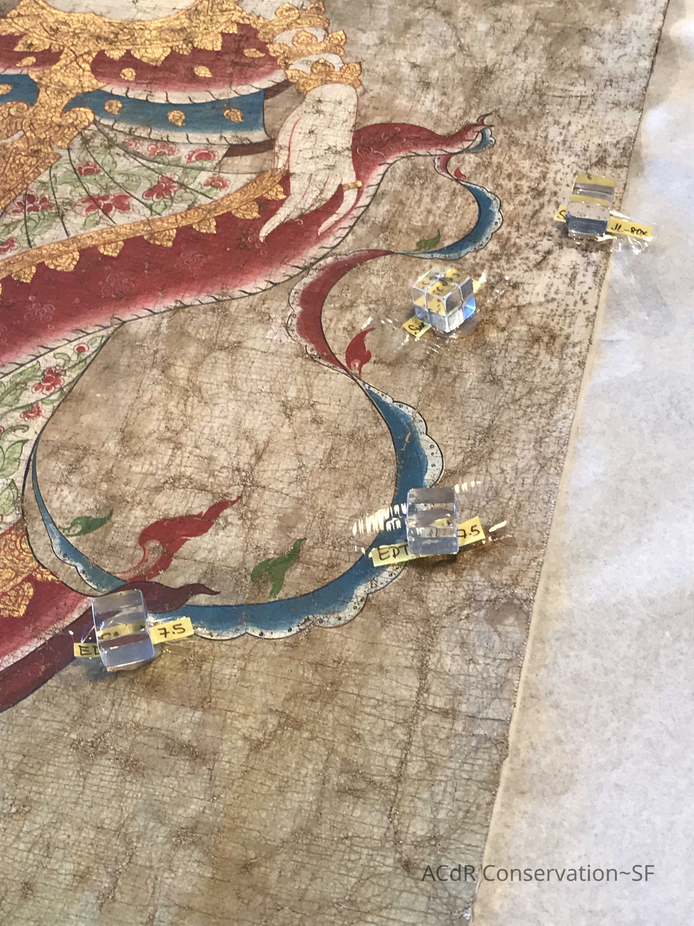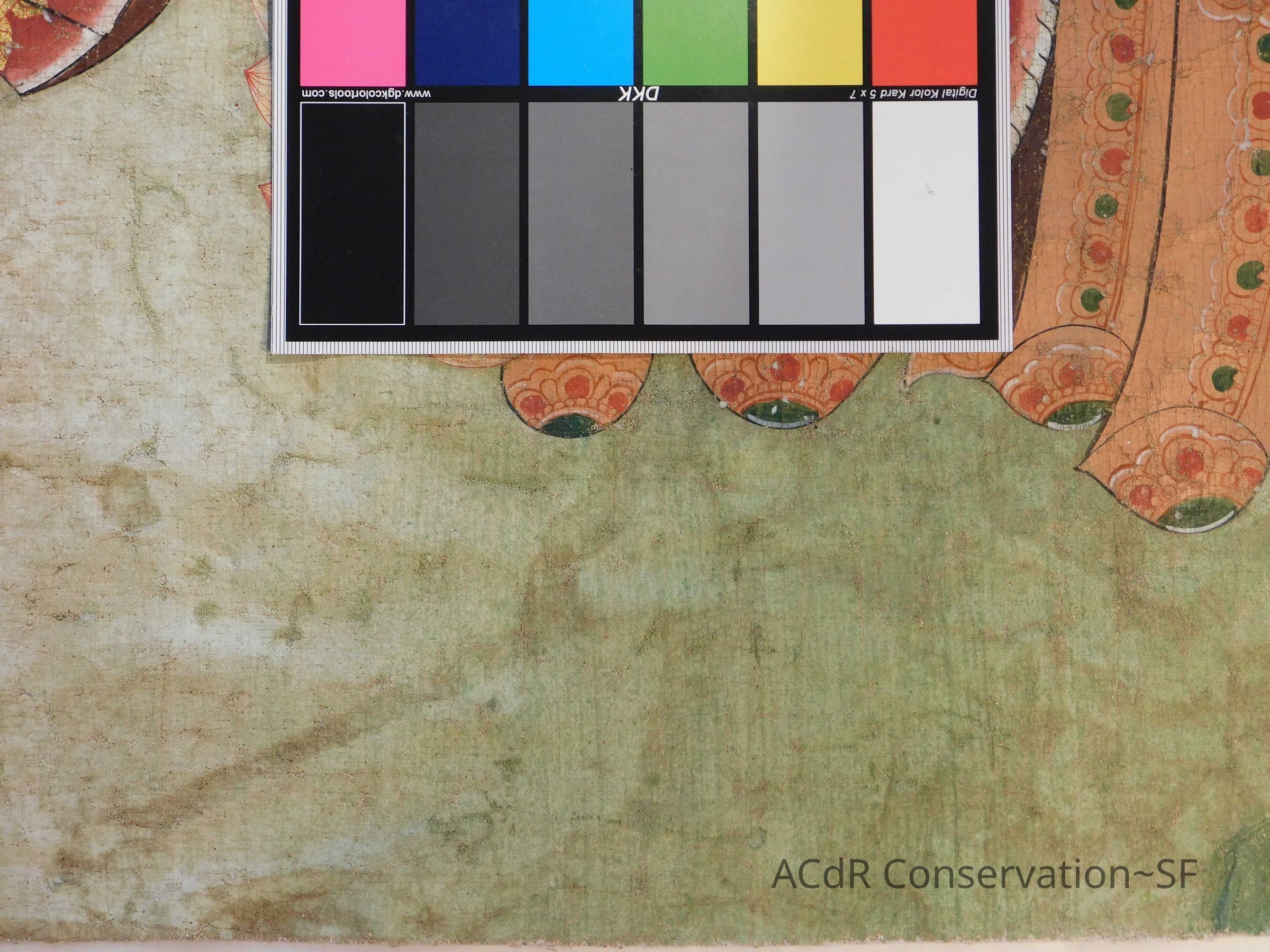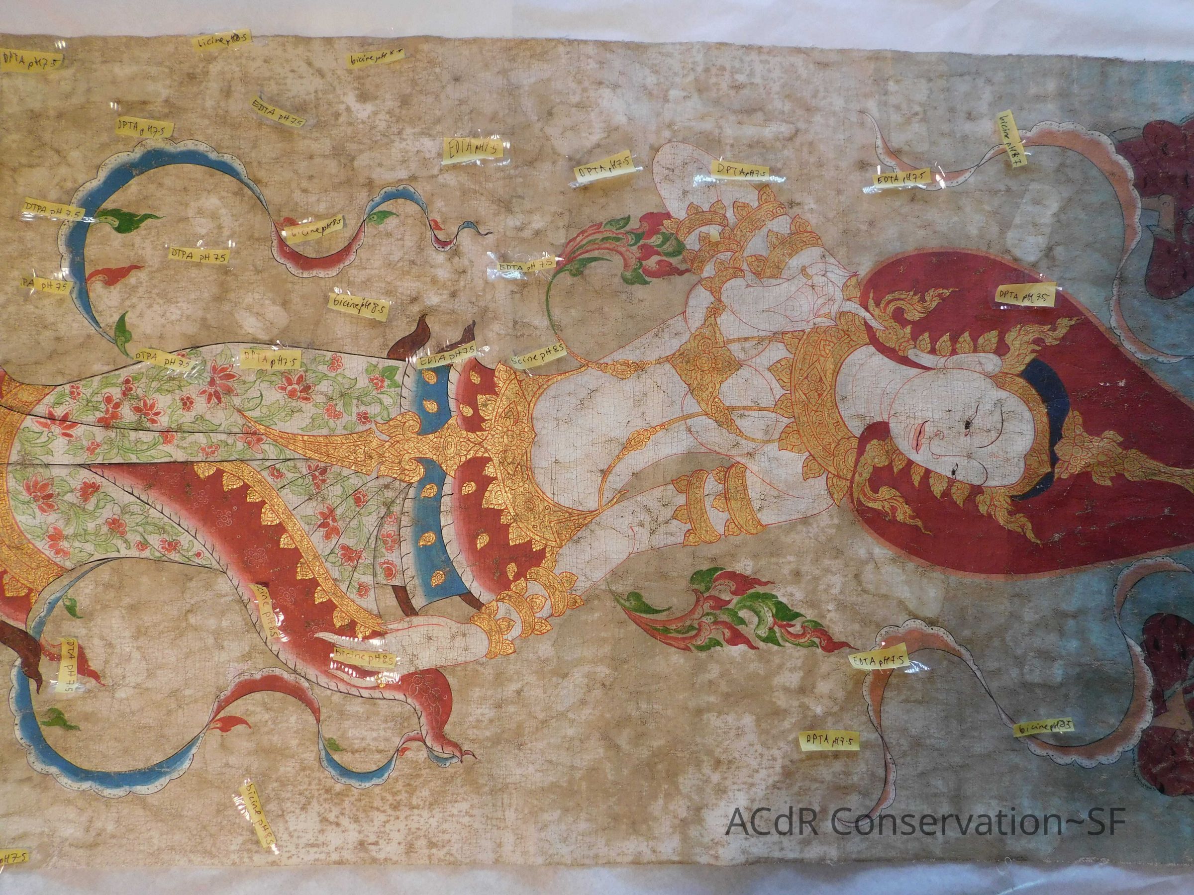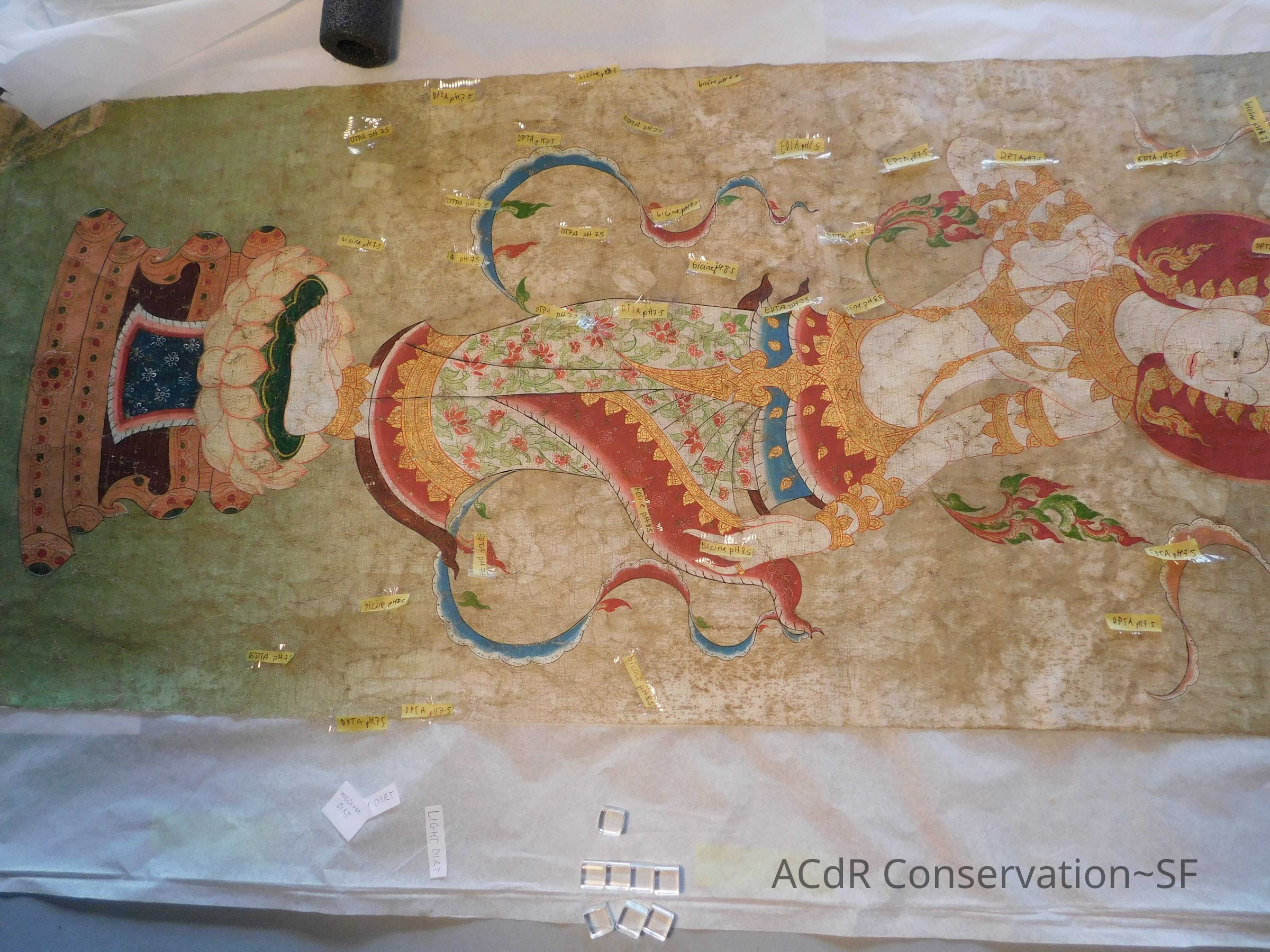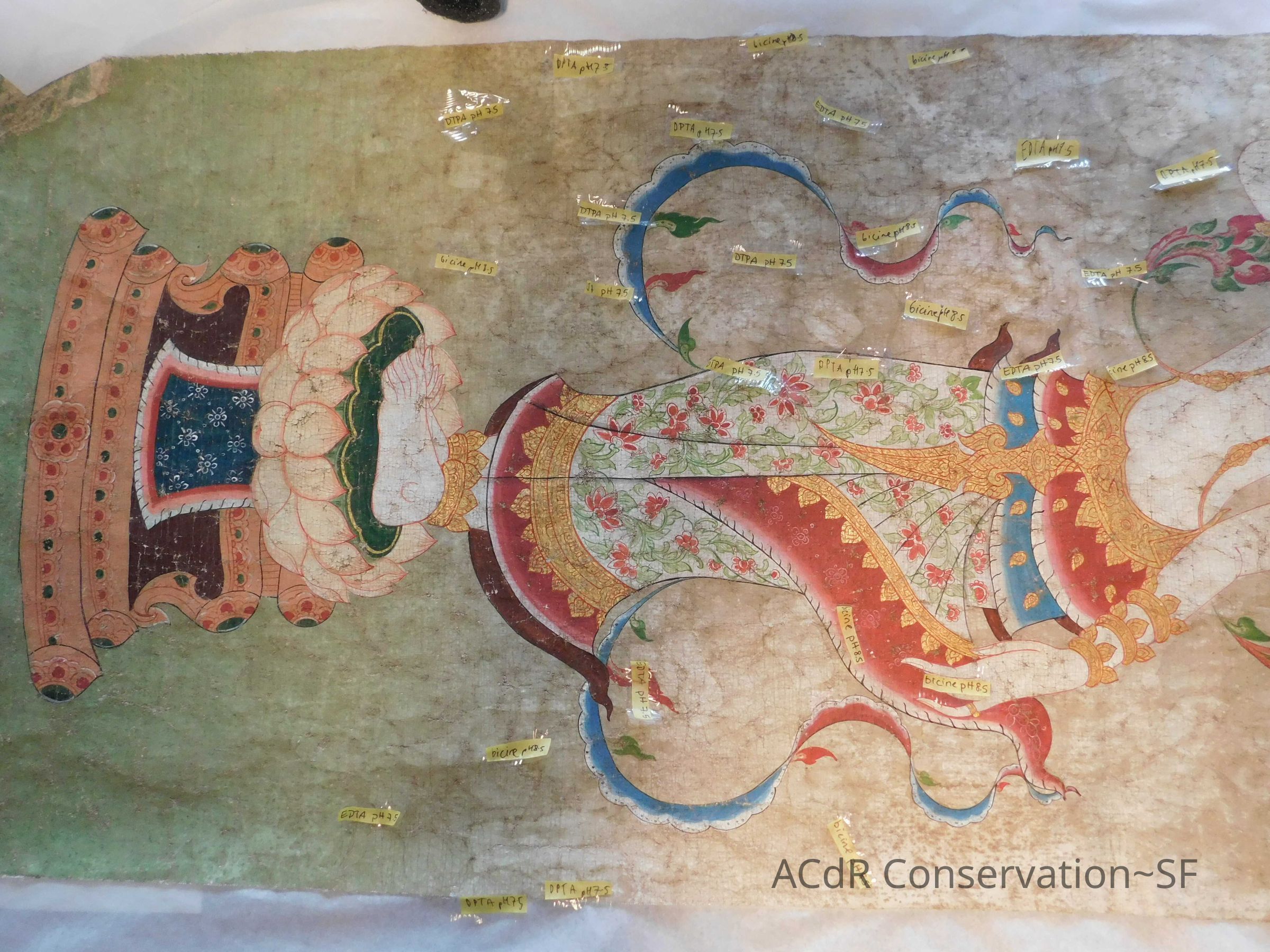 Precise consolidation of the flaking paint with a brush using 4% methylcellulose in water.