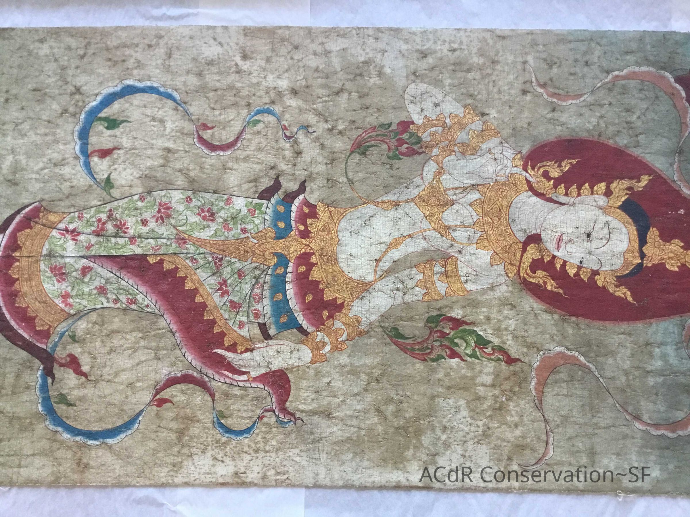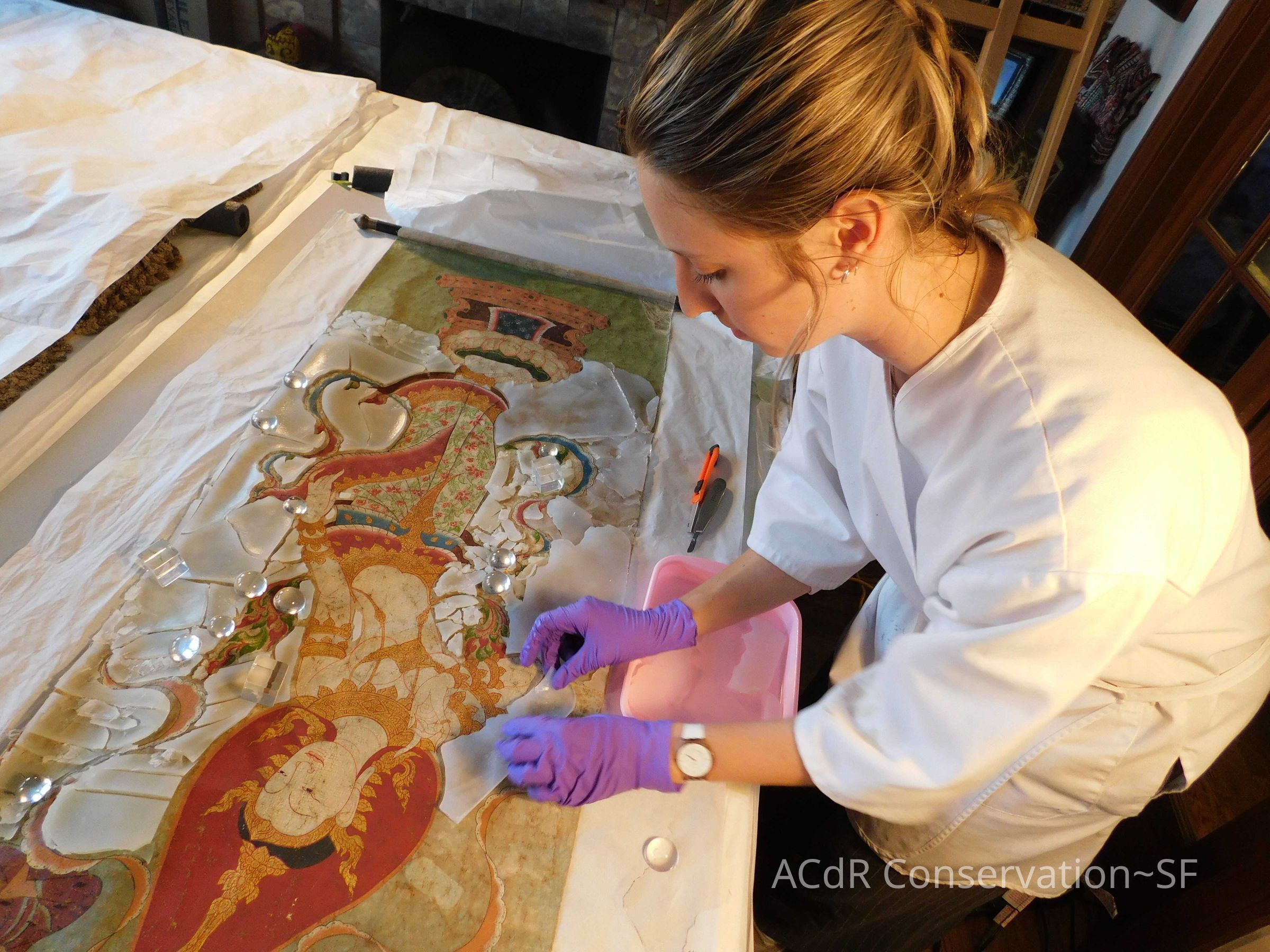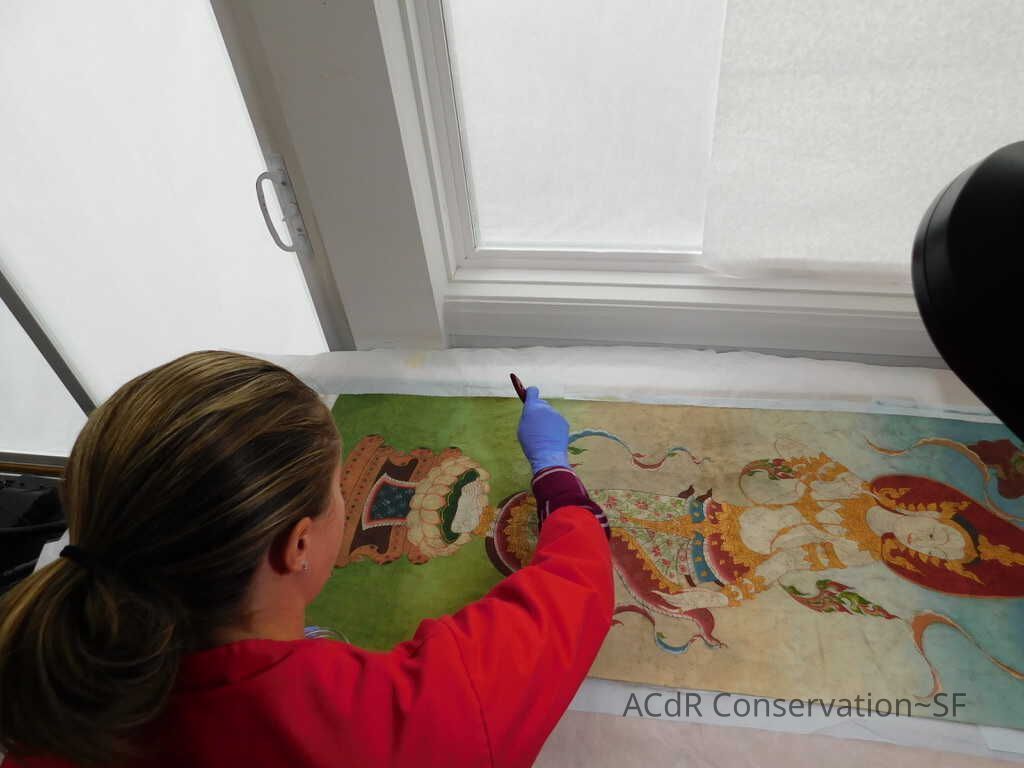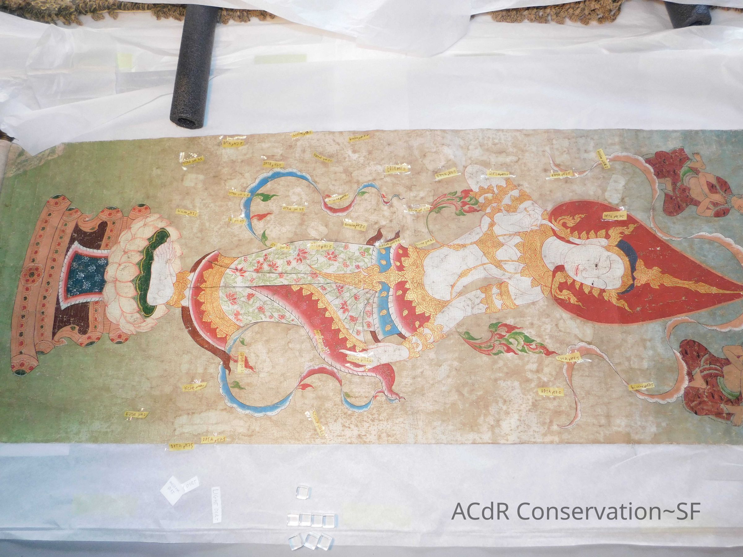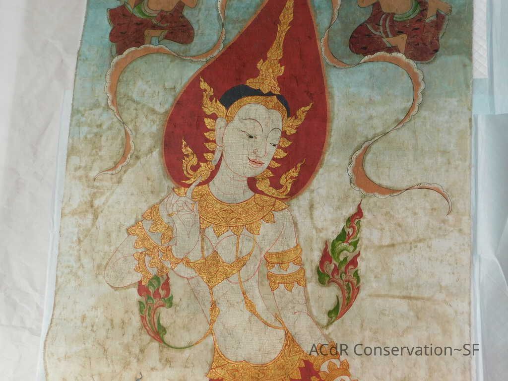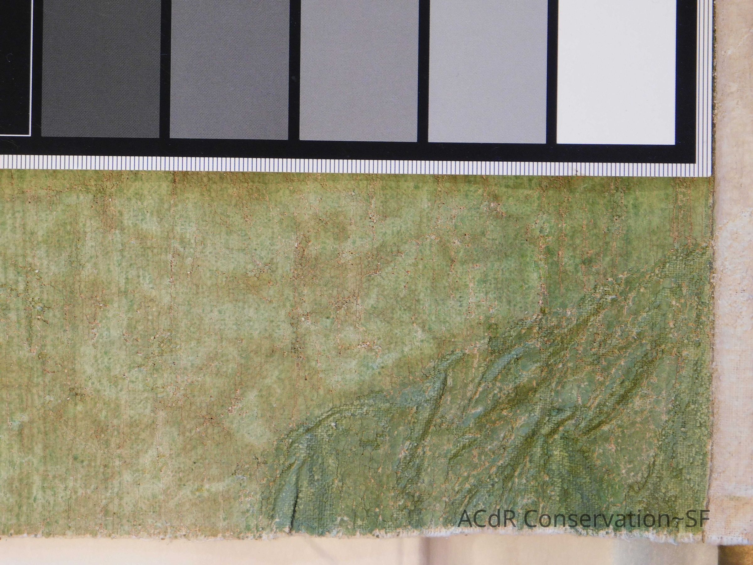 Precise consolidation of the flaking paint with a brush using 4% methylcellulose in water.