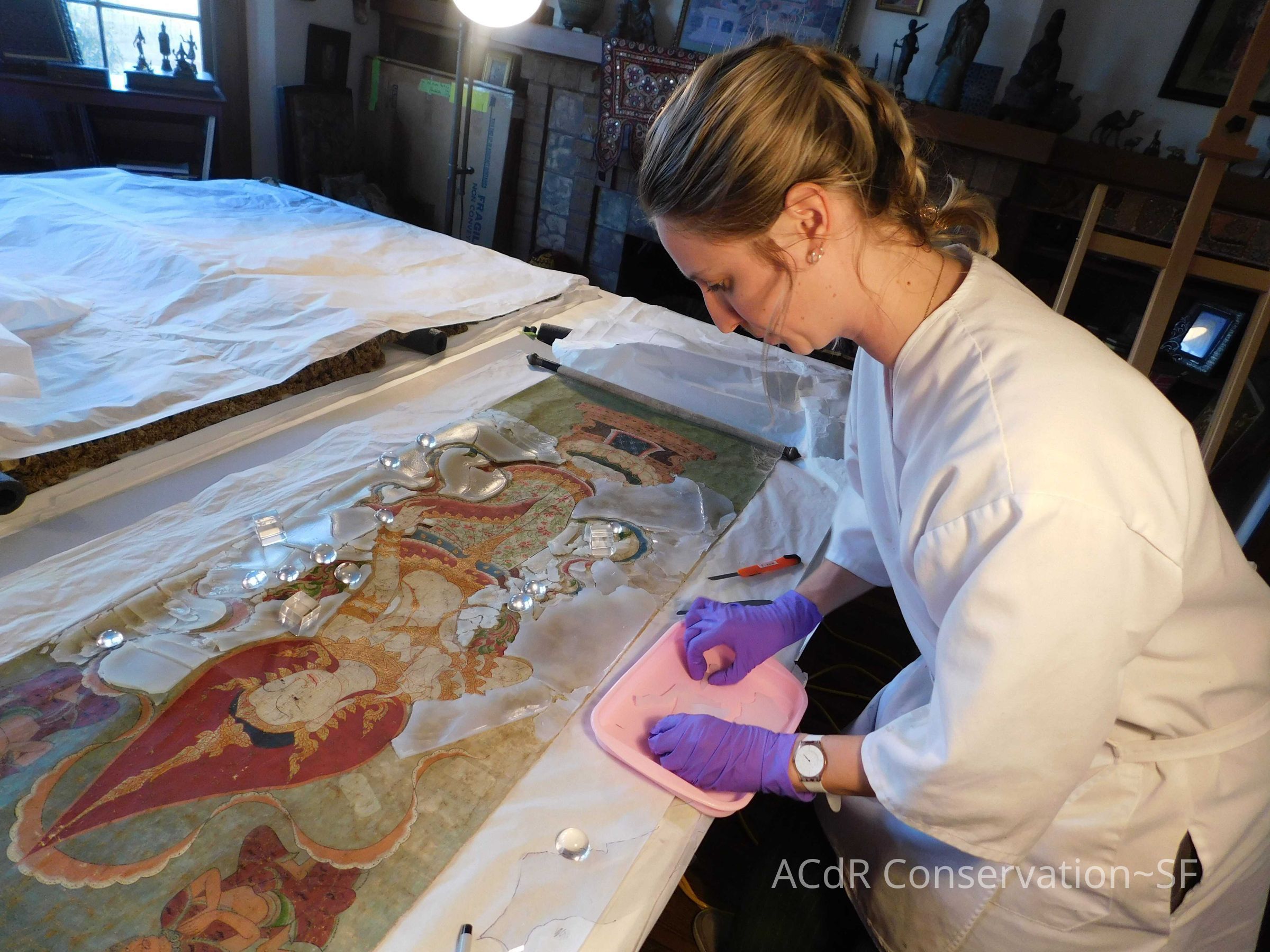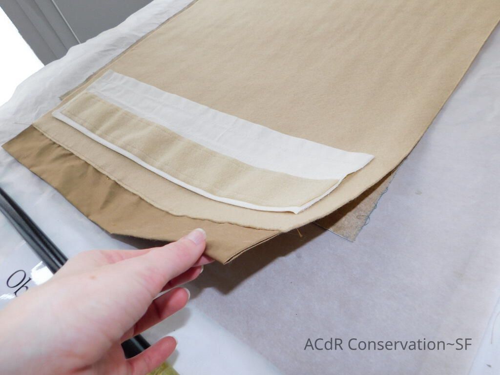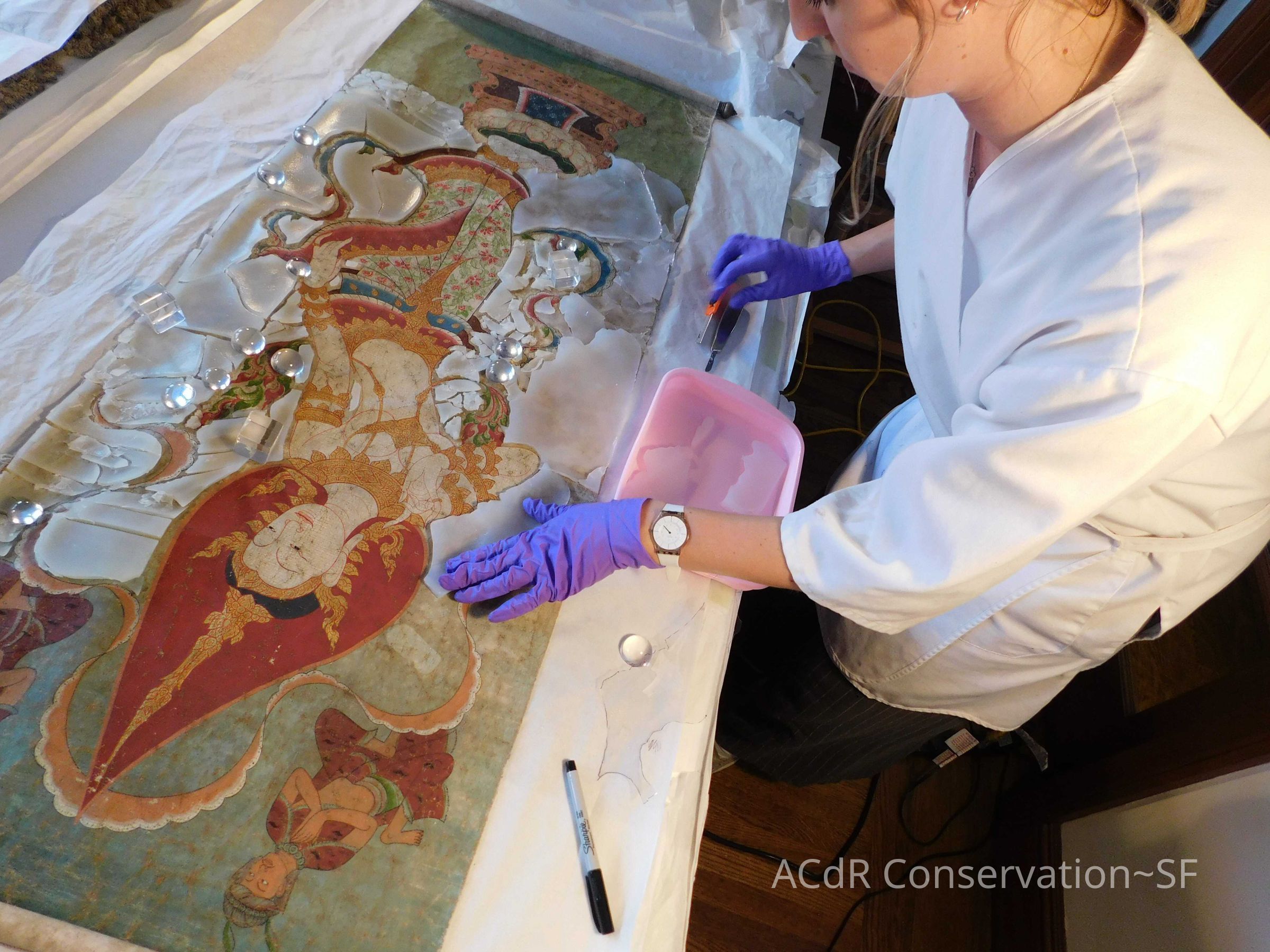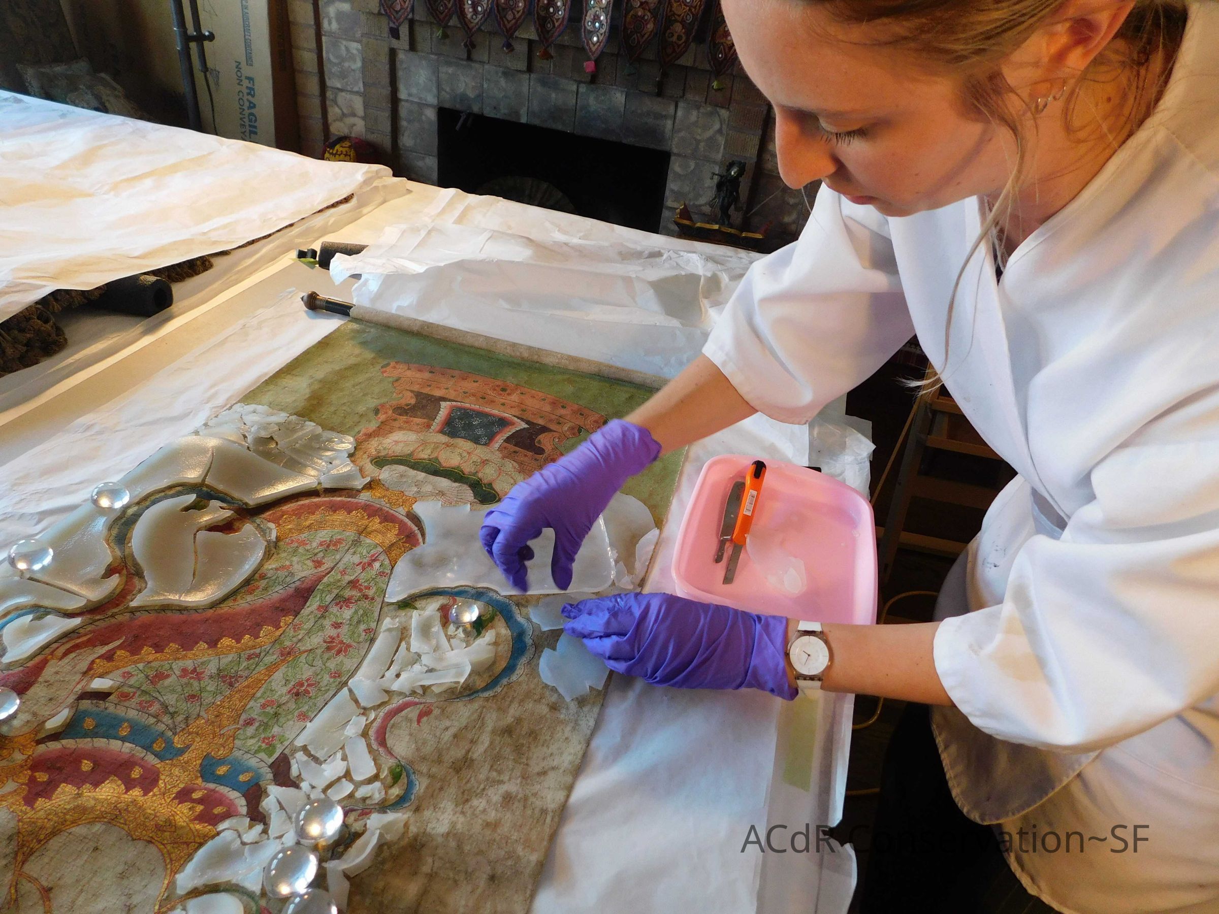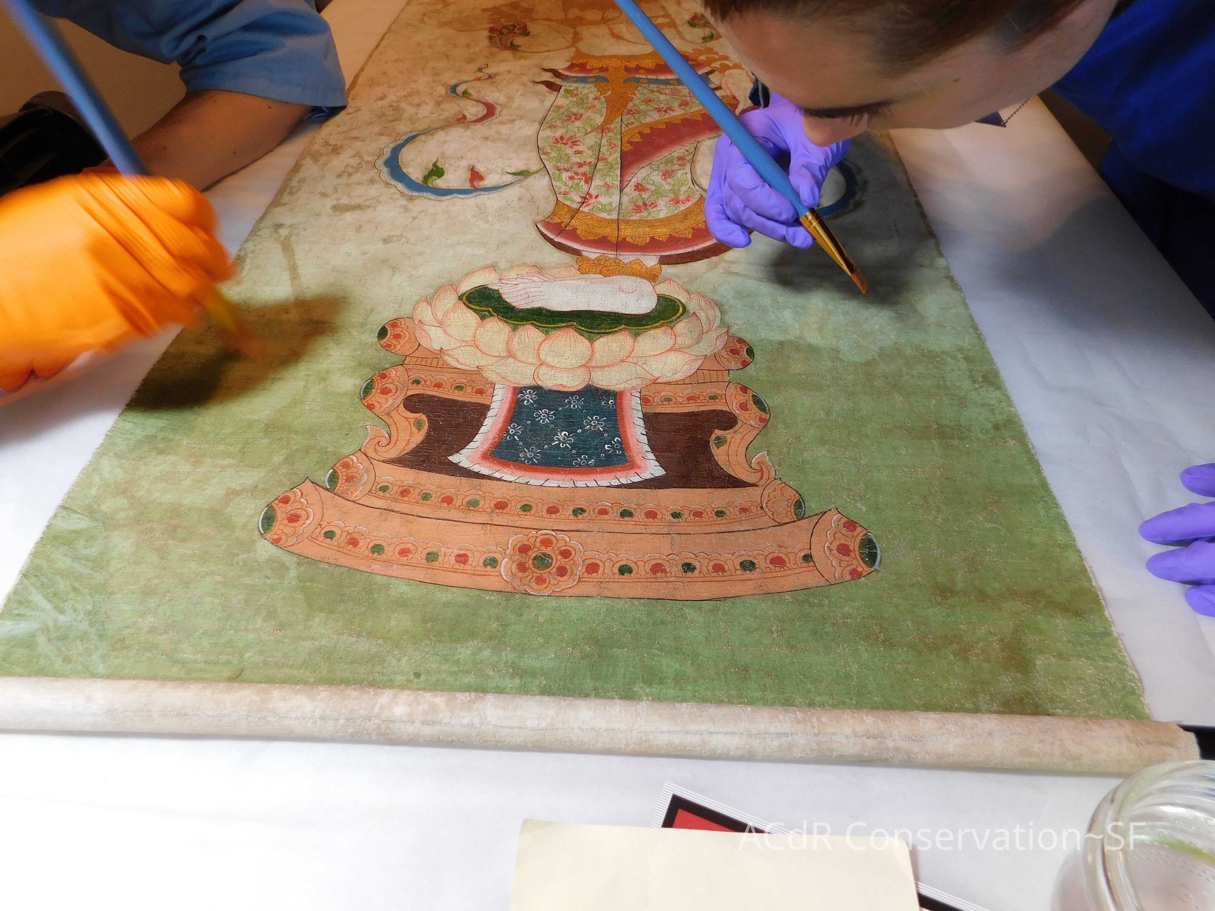 Precise consolidation of the flaking paint with a brush using 4% methylcellulose in water.