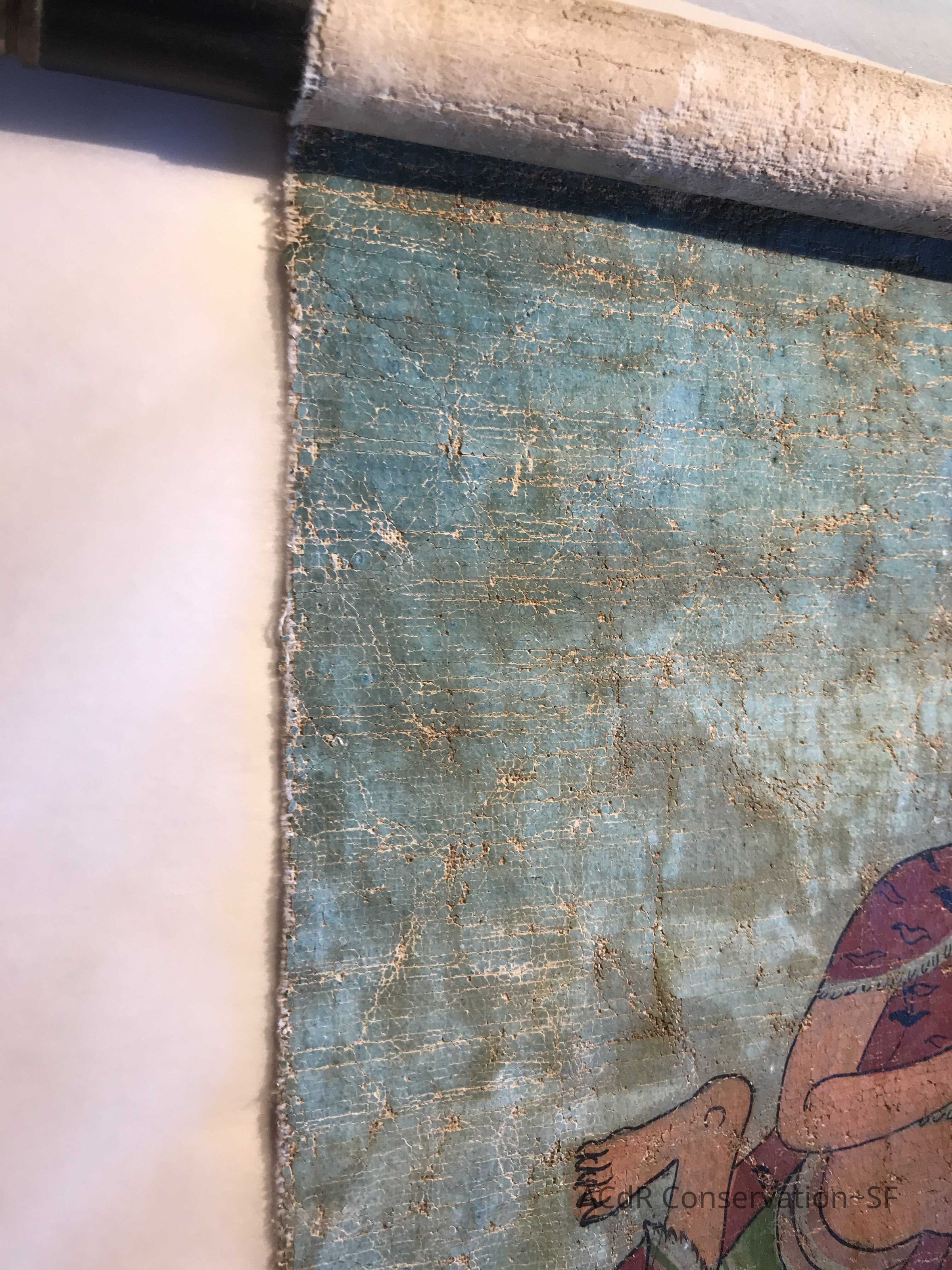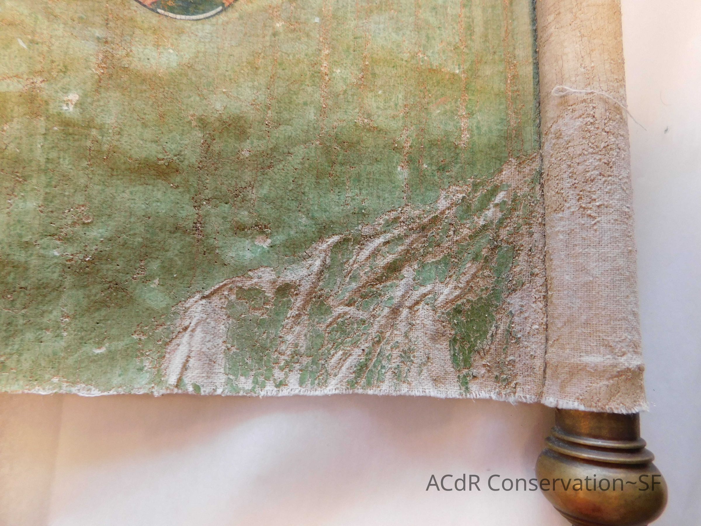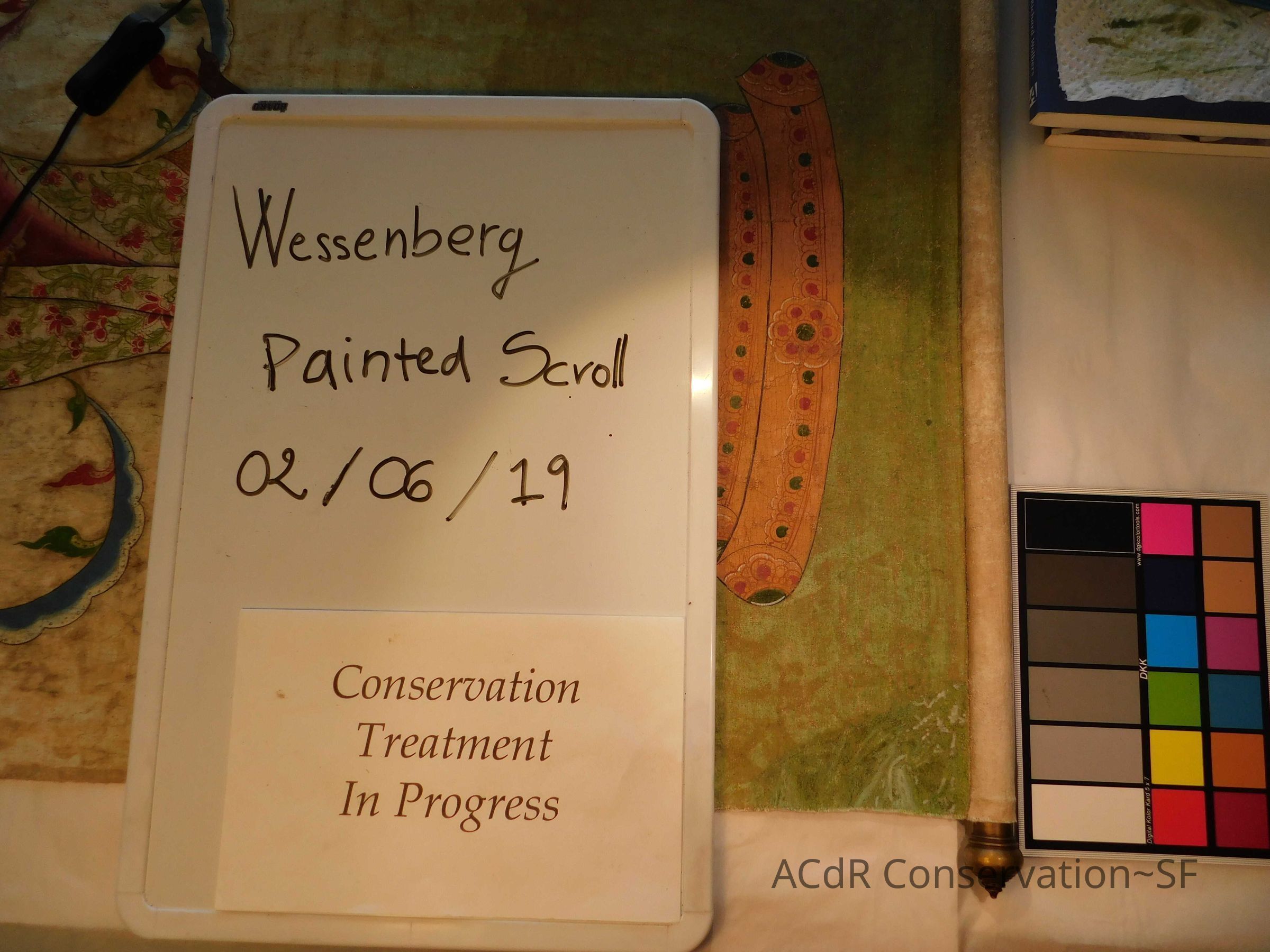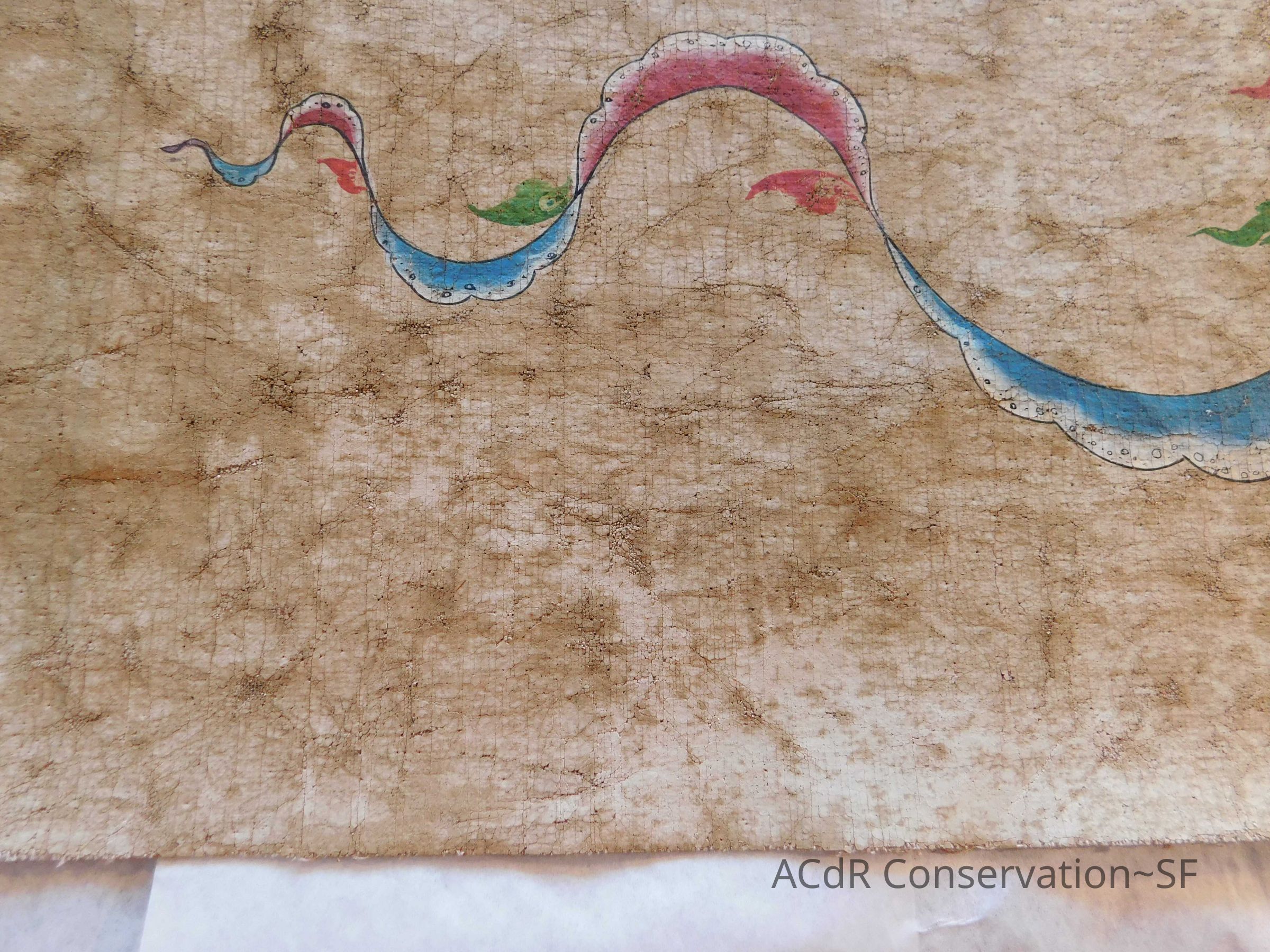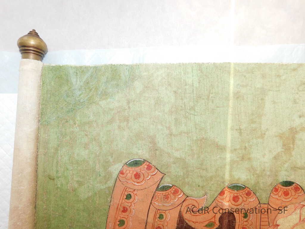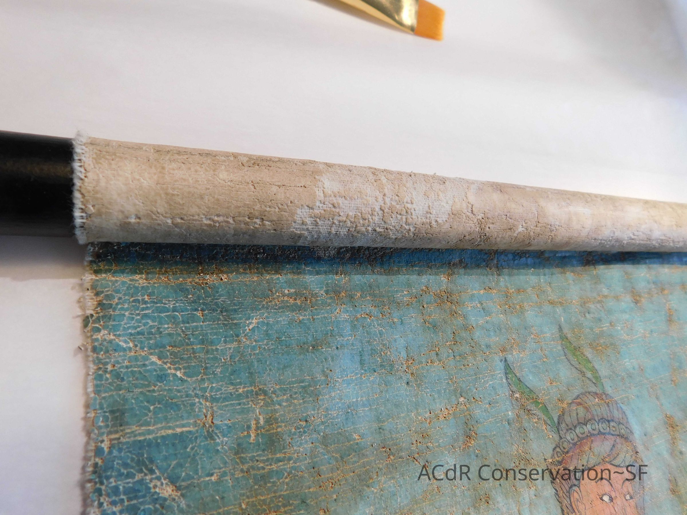 Began smoothing background appearance using wash of thinned watercolors to match what was completed on opposite scroll.