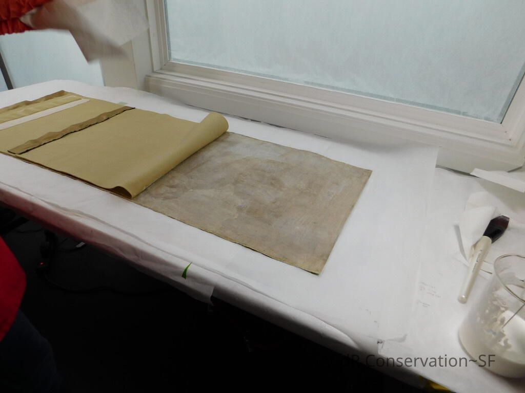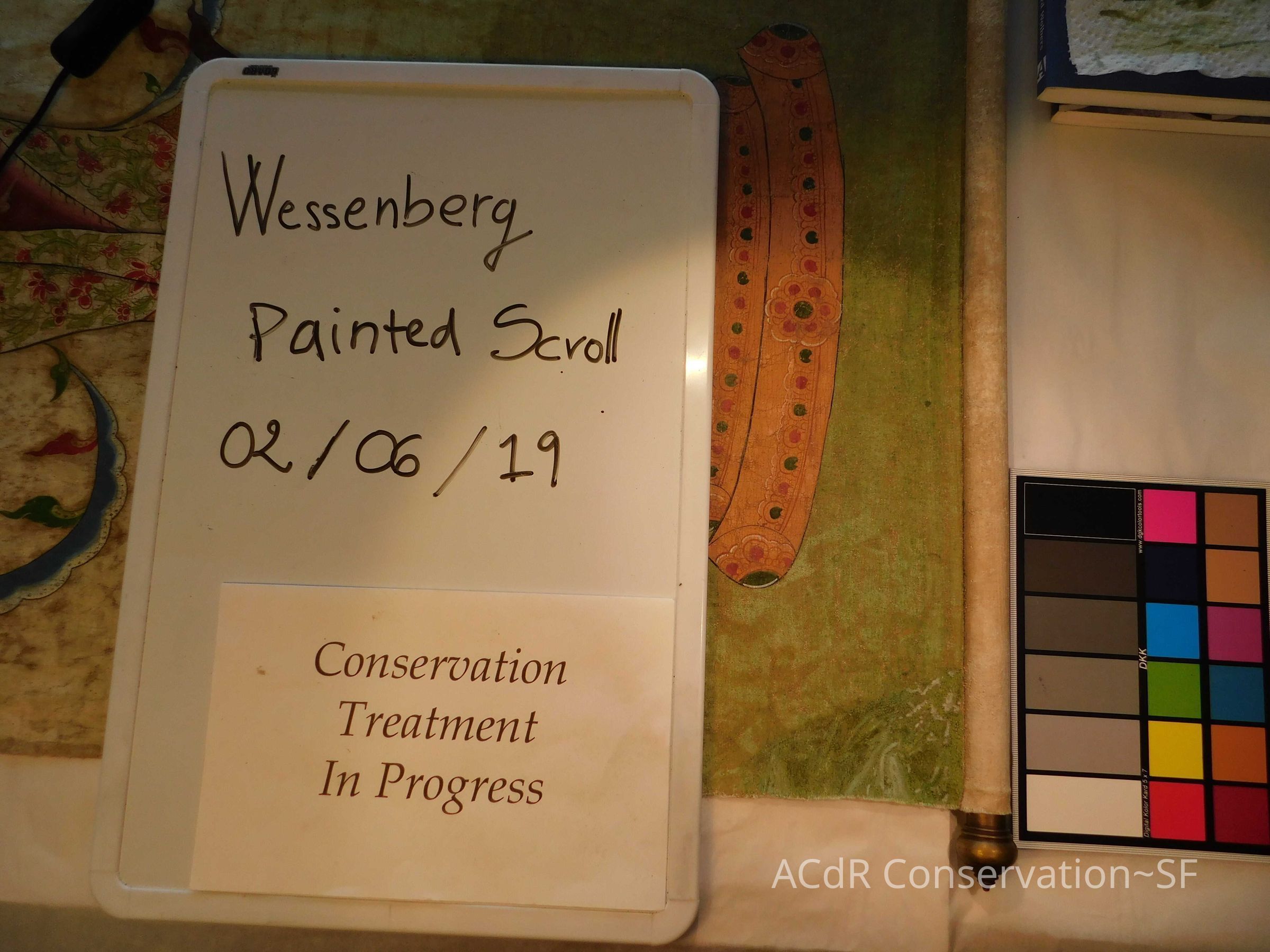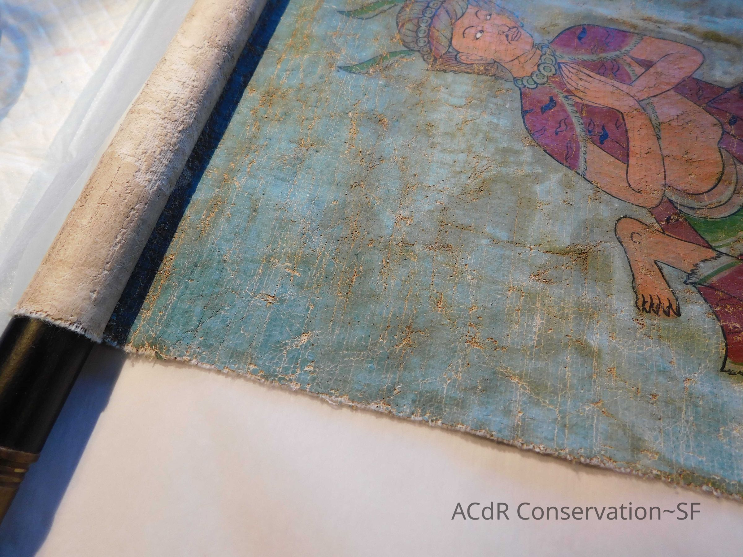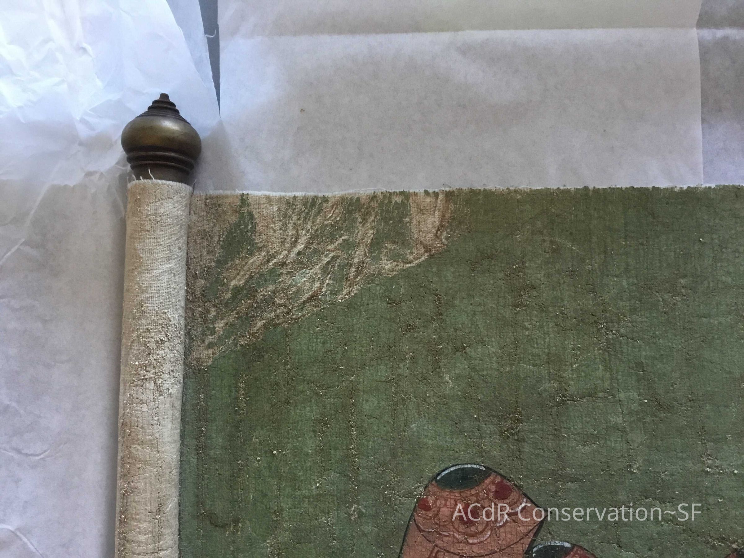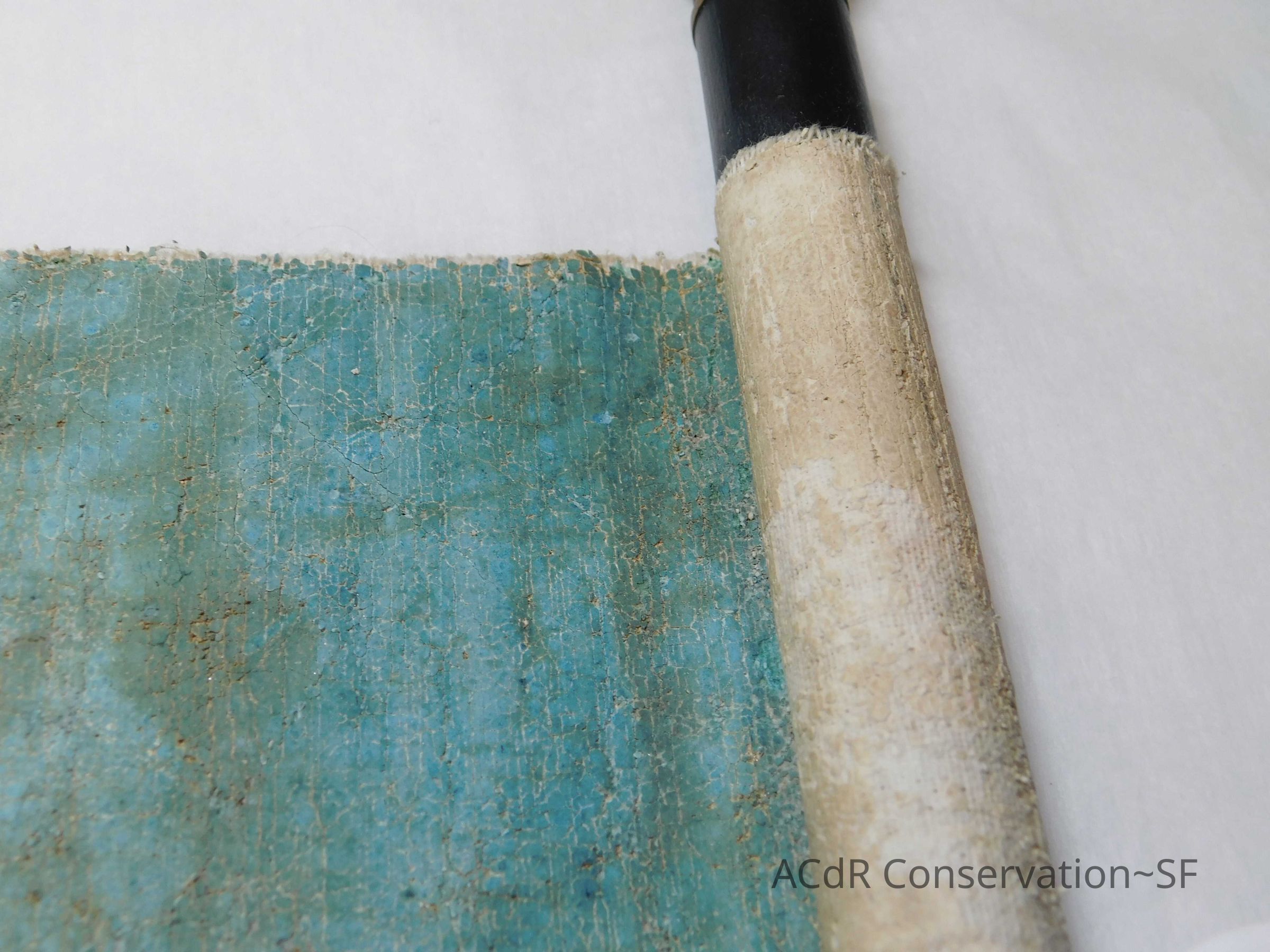 Began smoothing background appearance using wash of thinned watercolors to match what was completed on opposite scroll.