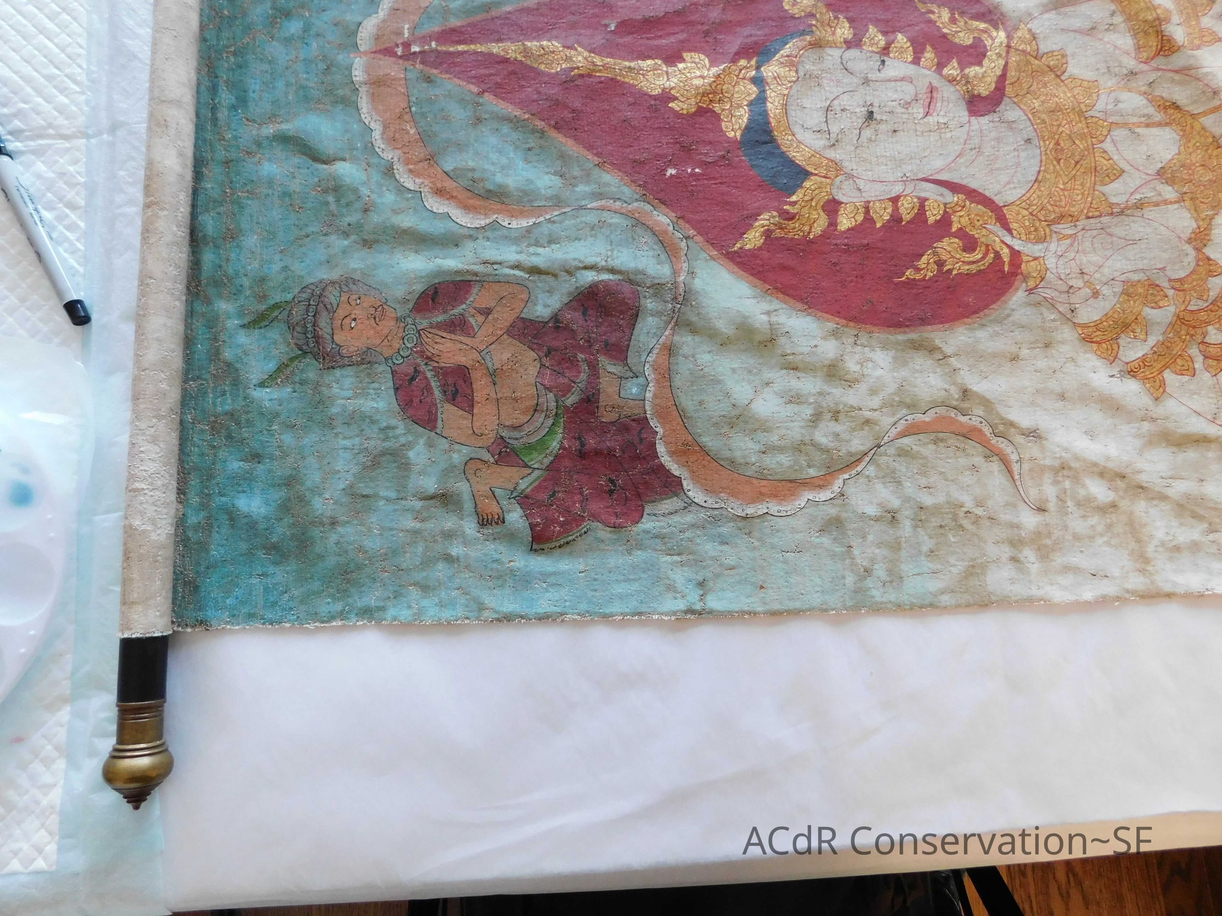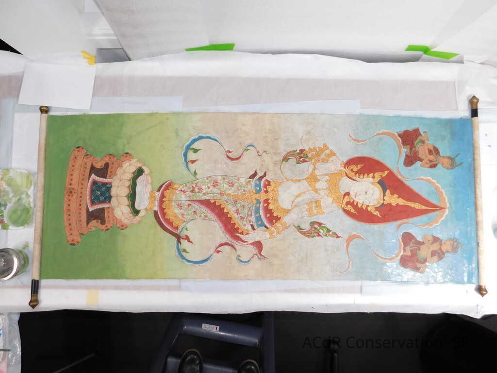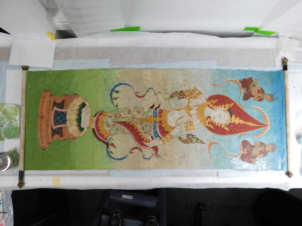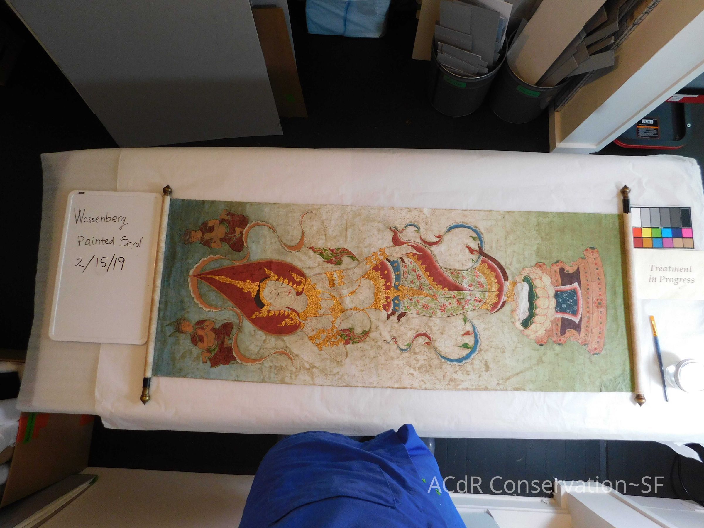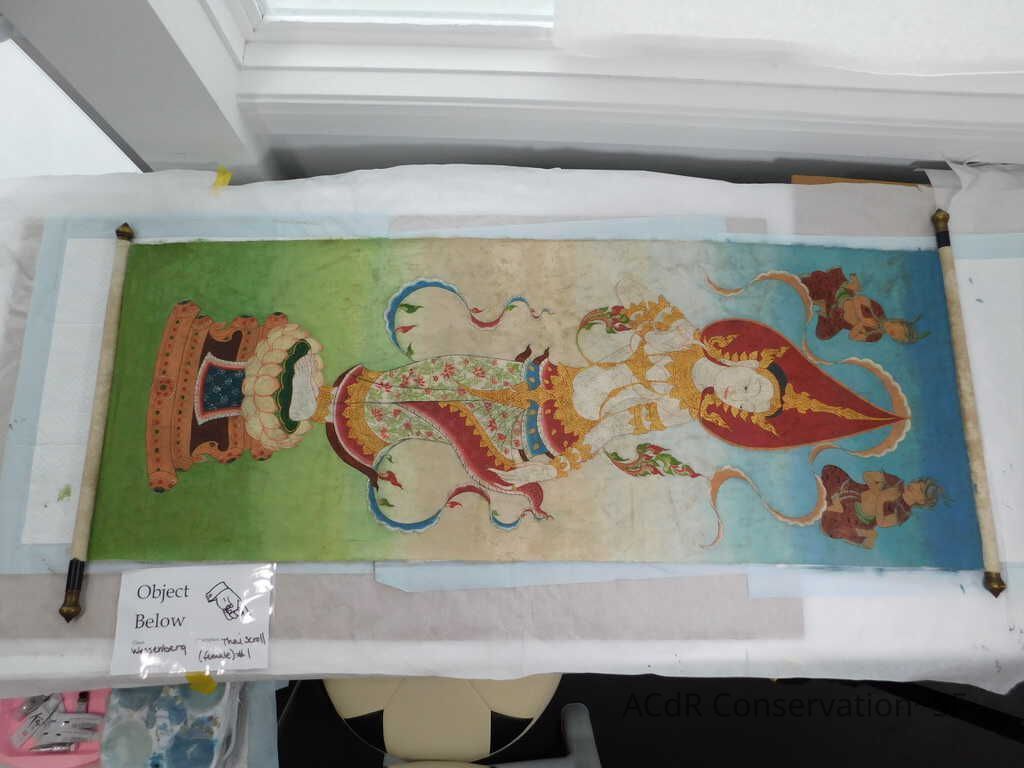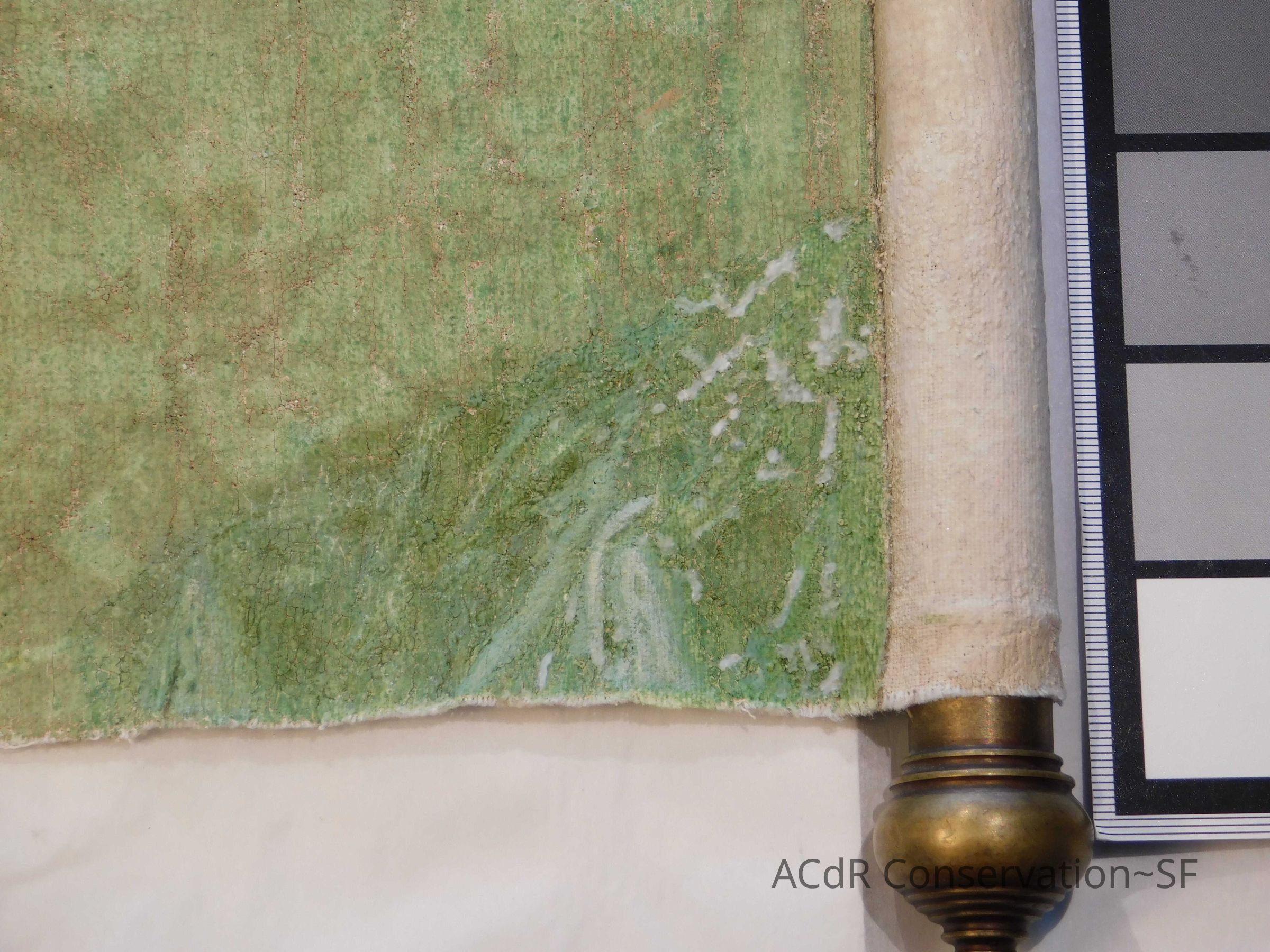 Began smoothing background appearance using wash of thinned watercolors to match what was completed on opposite scroll.