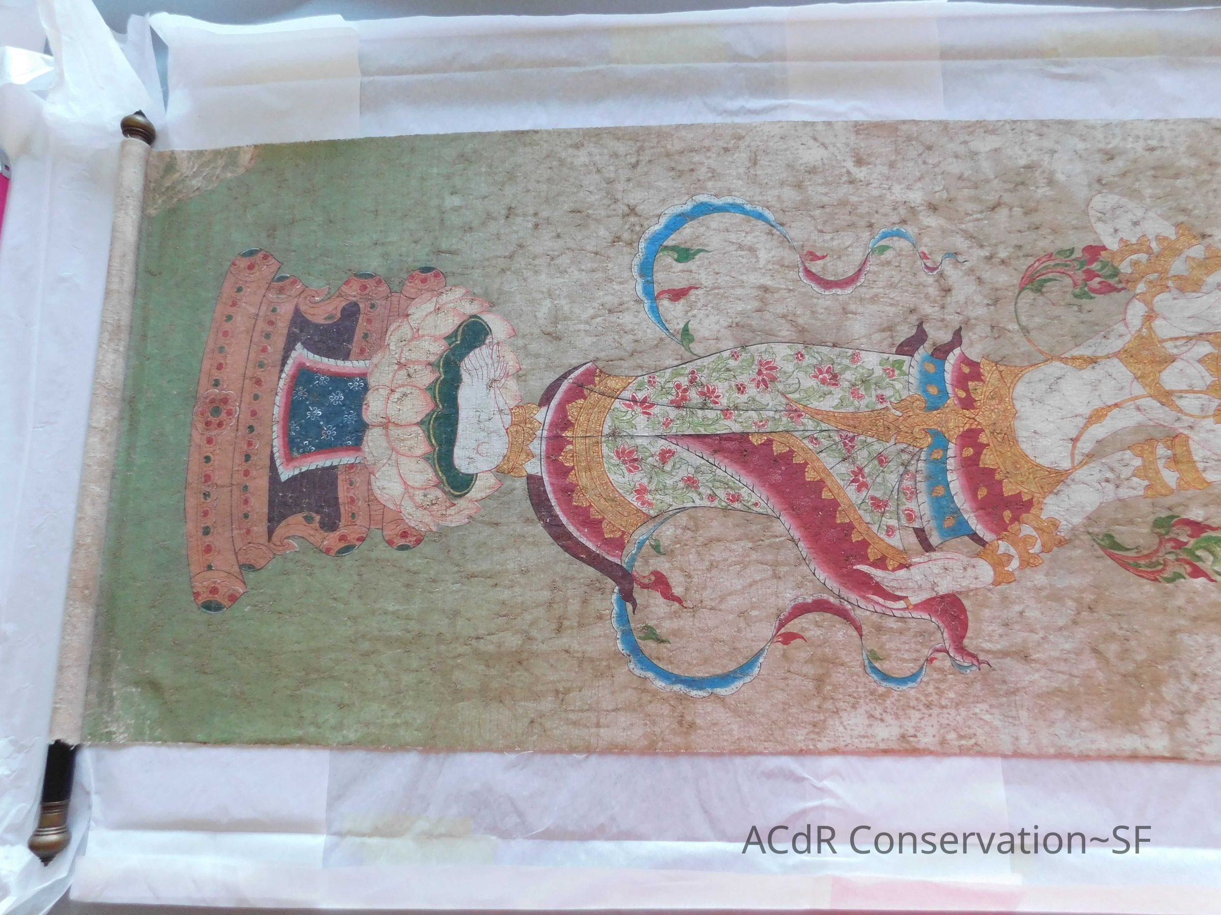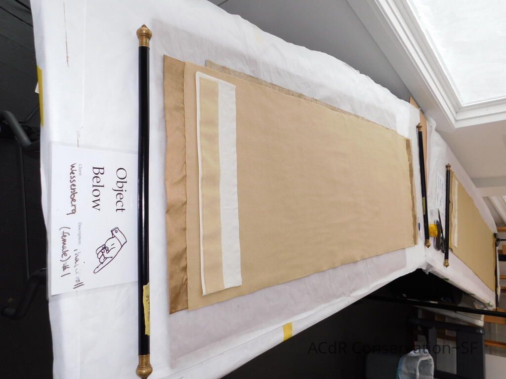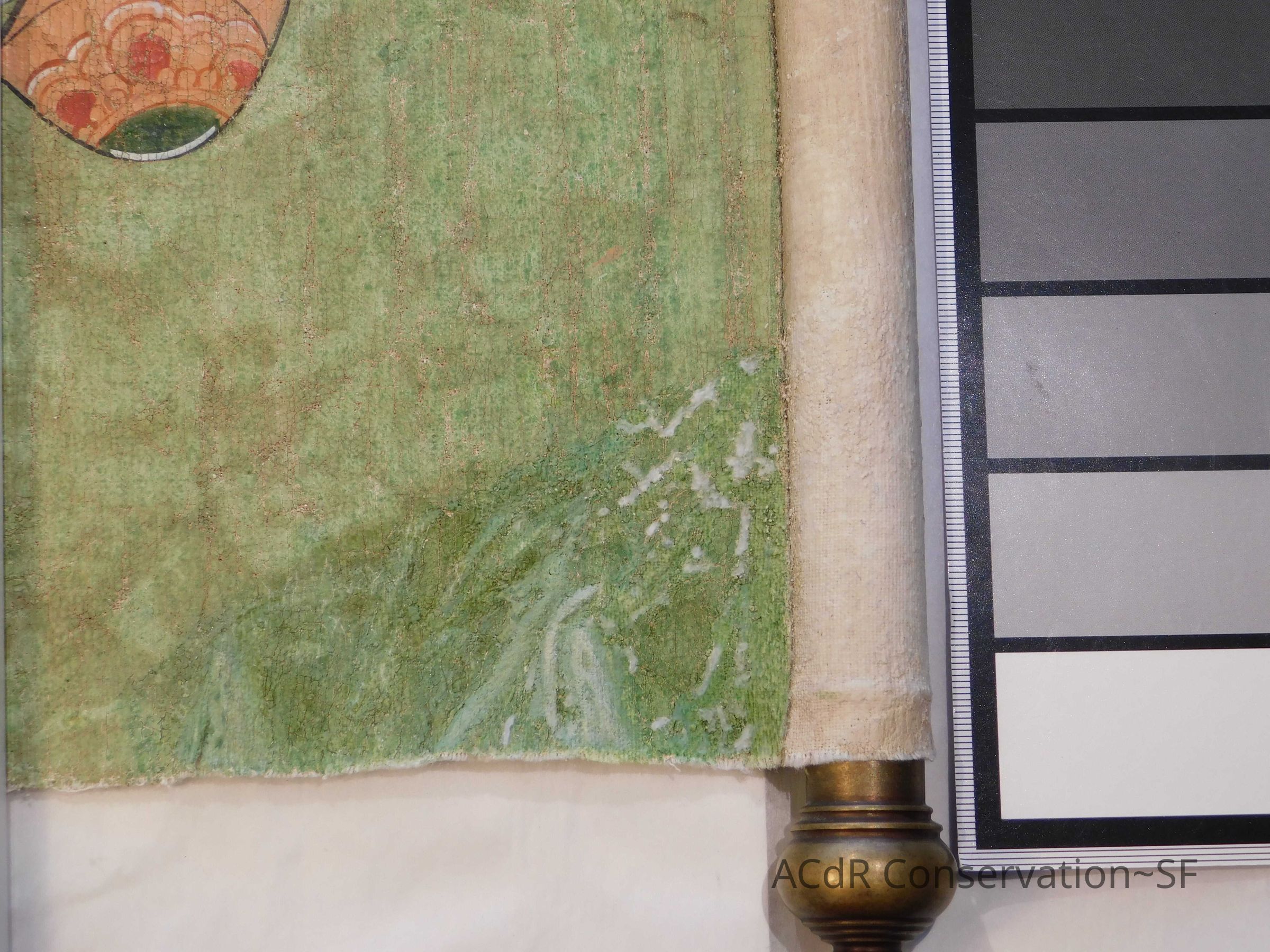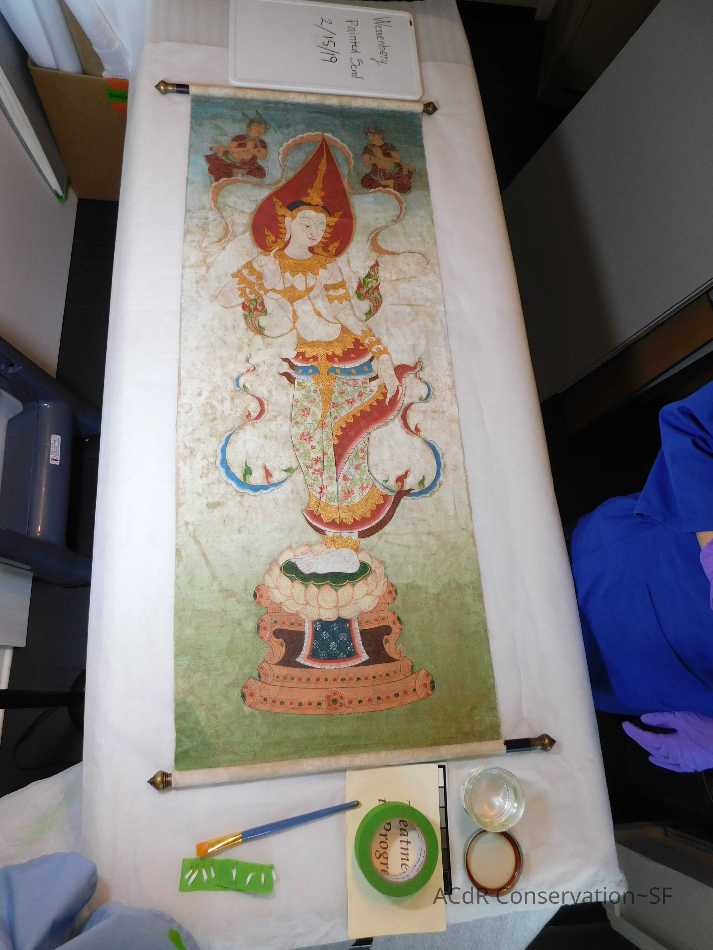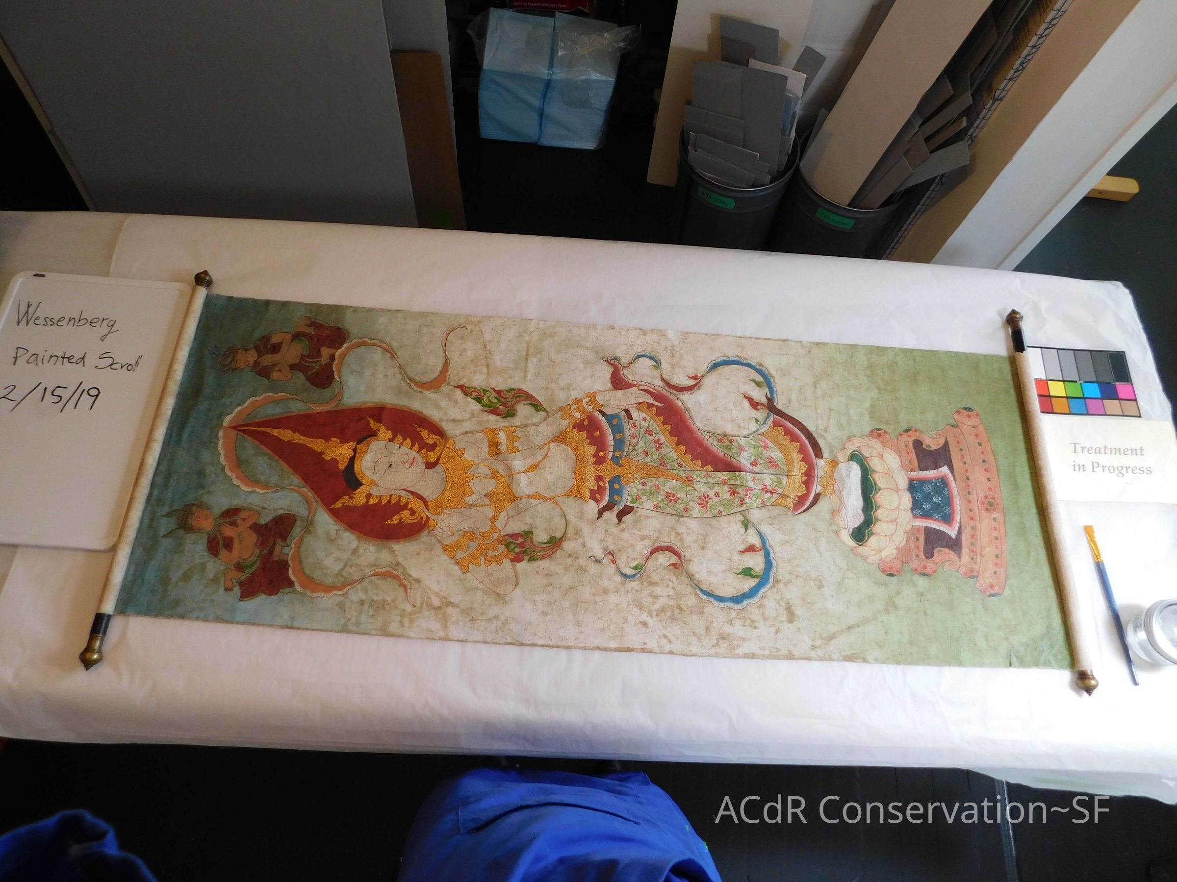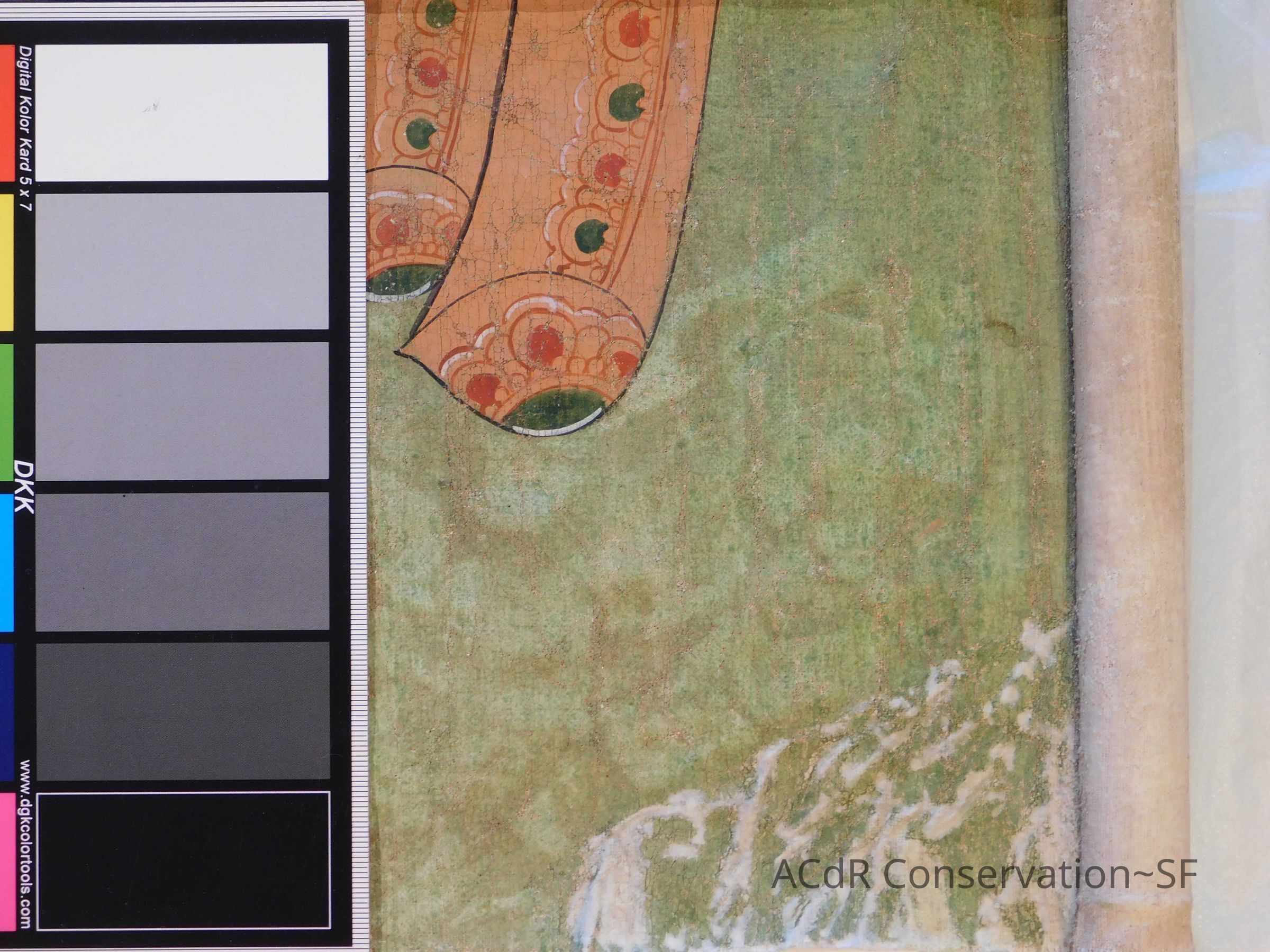 Began smoothing background appearance using wash of thinned watercolors to match what was completed on opposite scroll.
