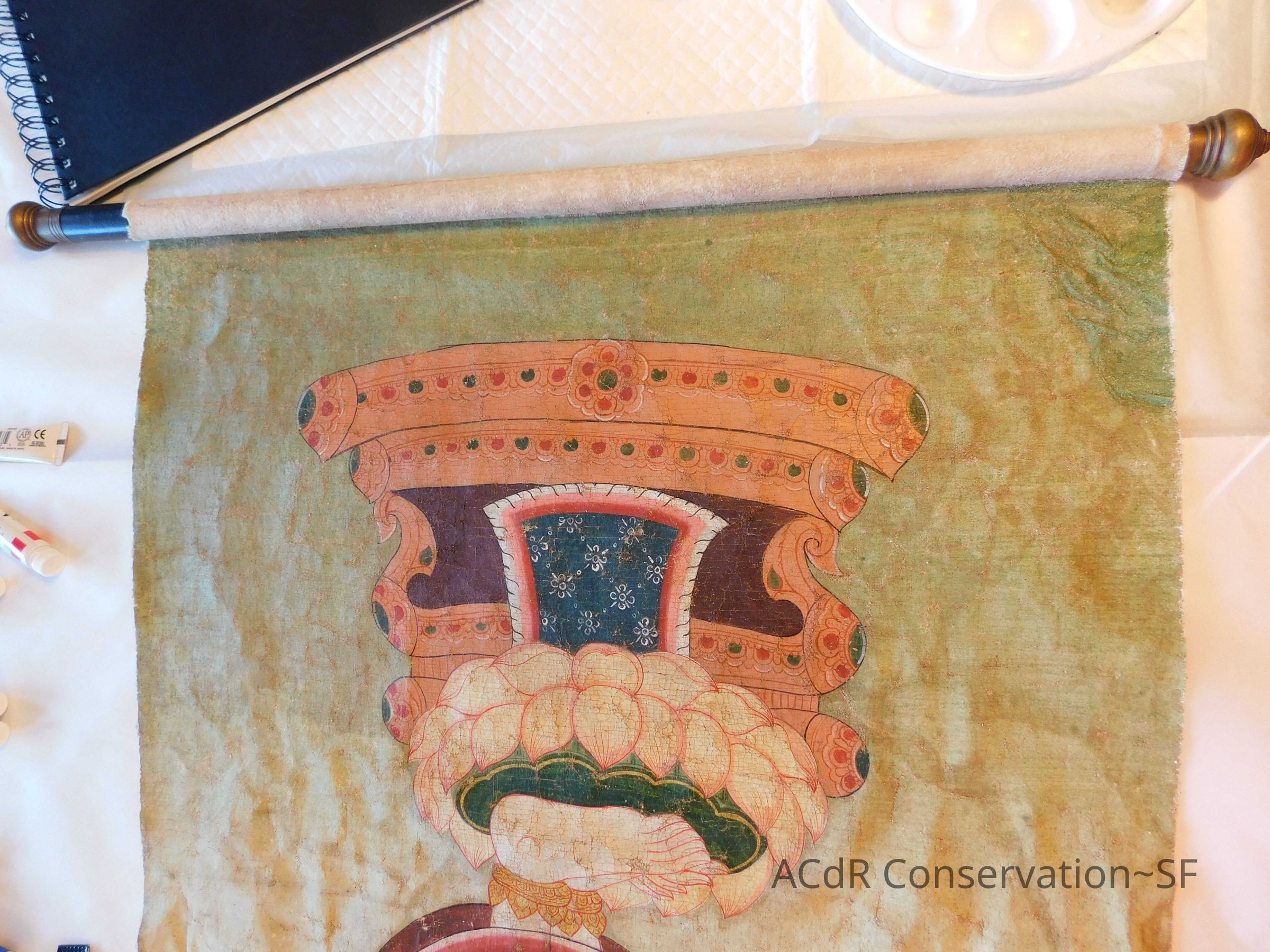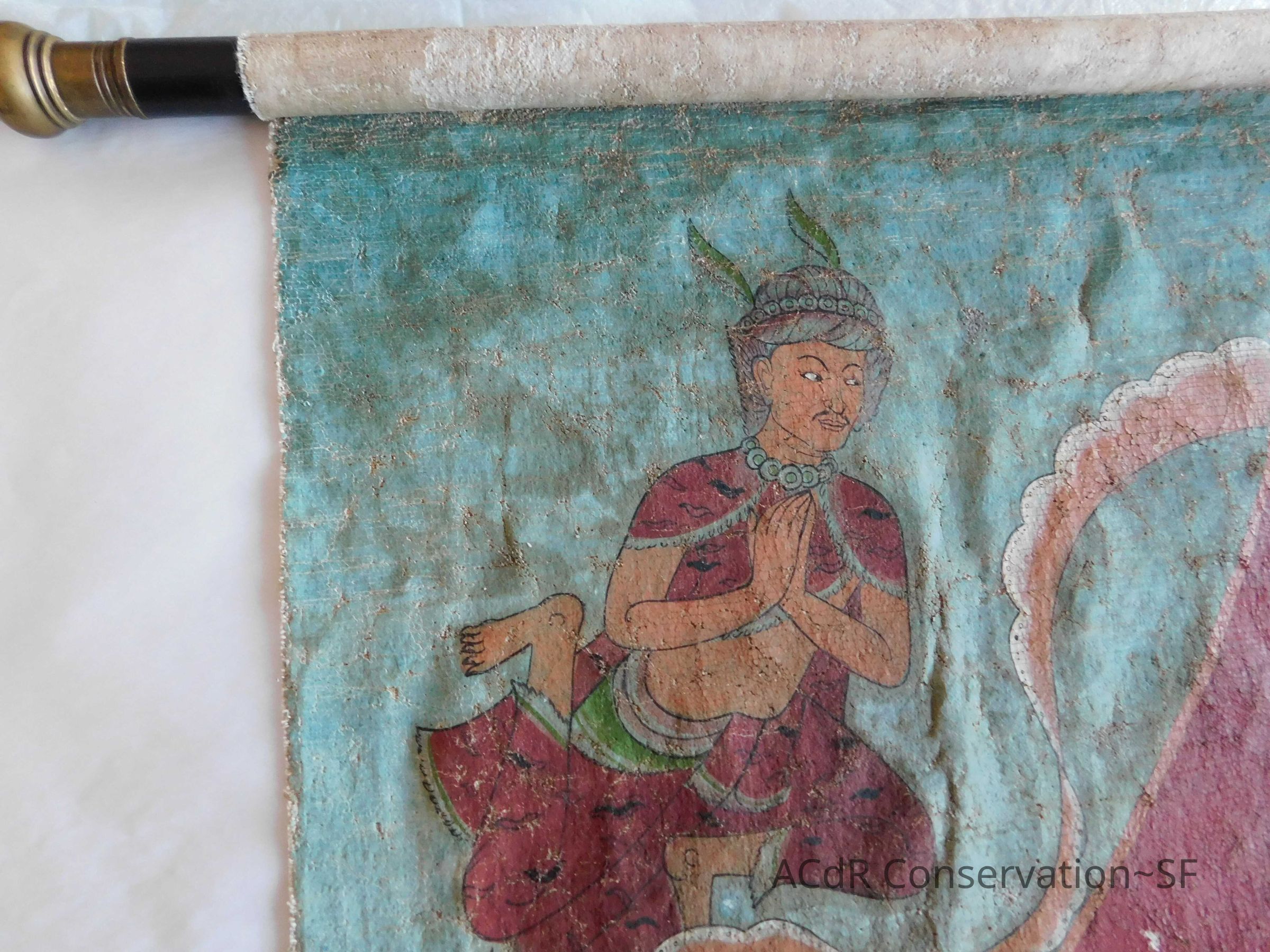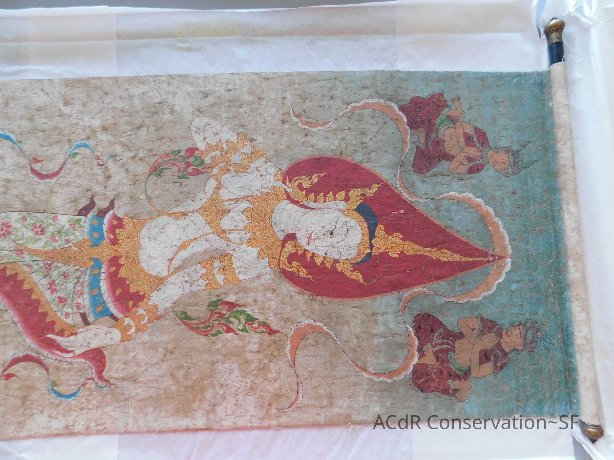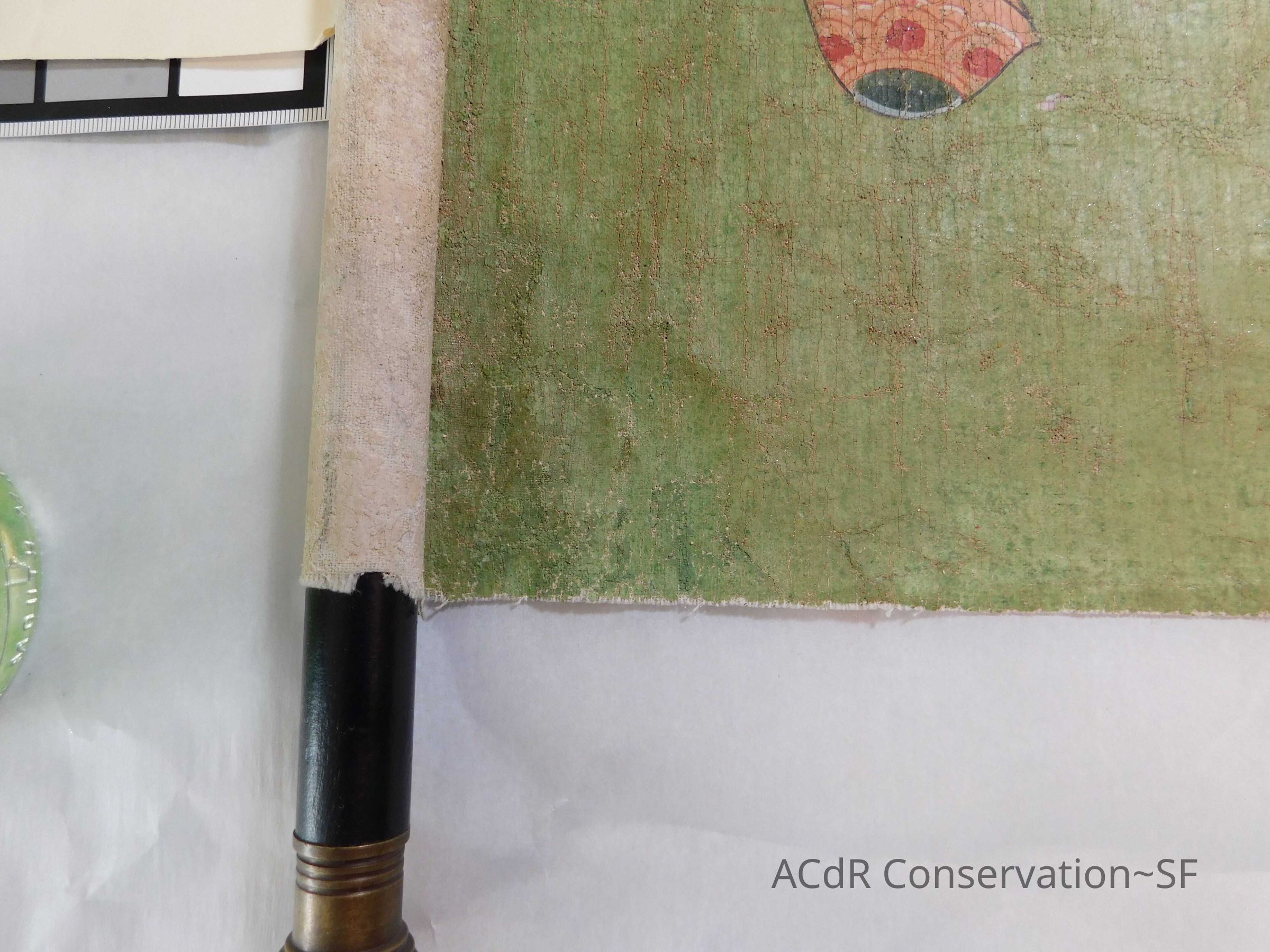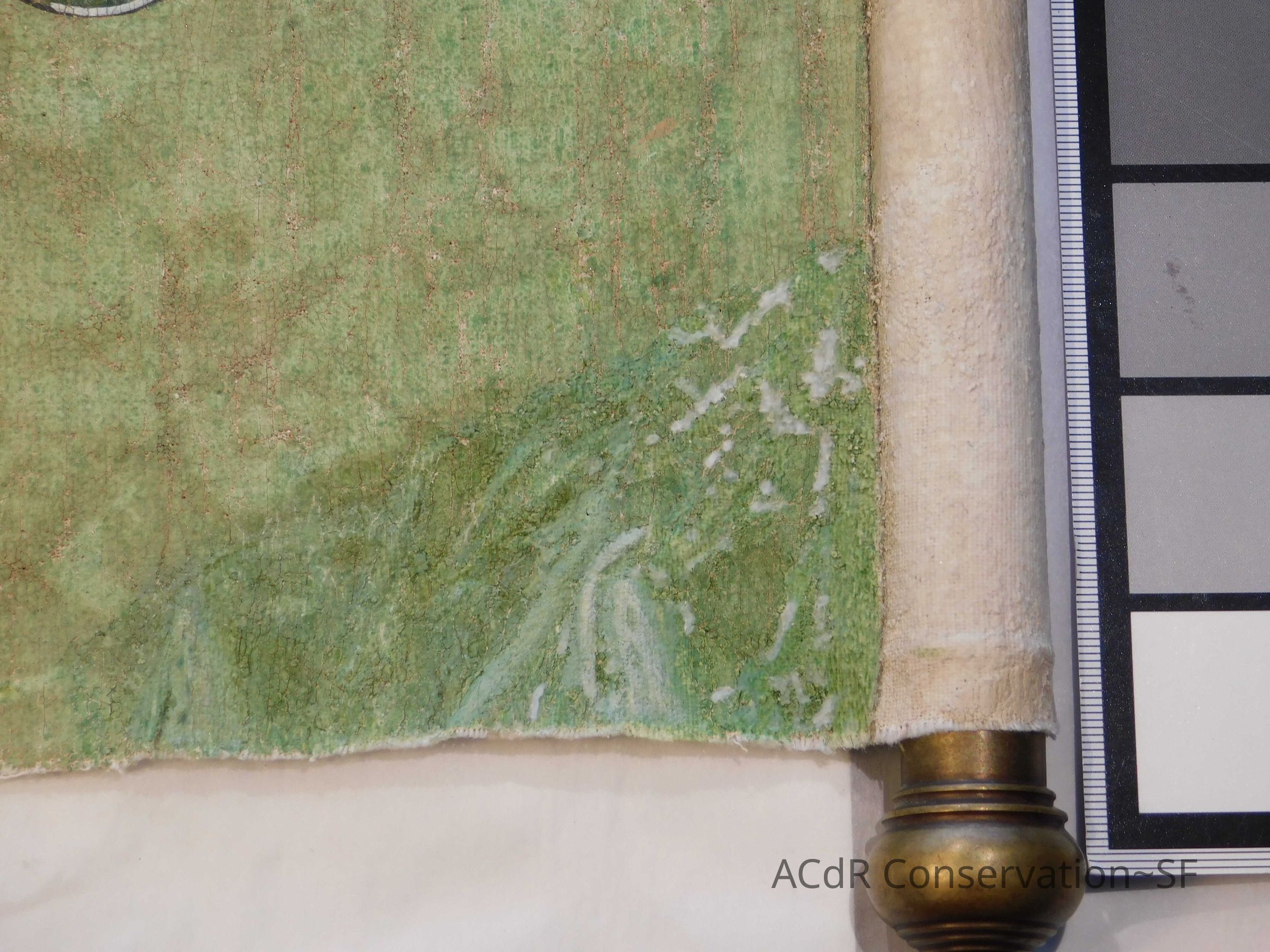 Began smoothing background appearance using wash of thinned watercolors to match what was completed on opposite scroll.