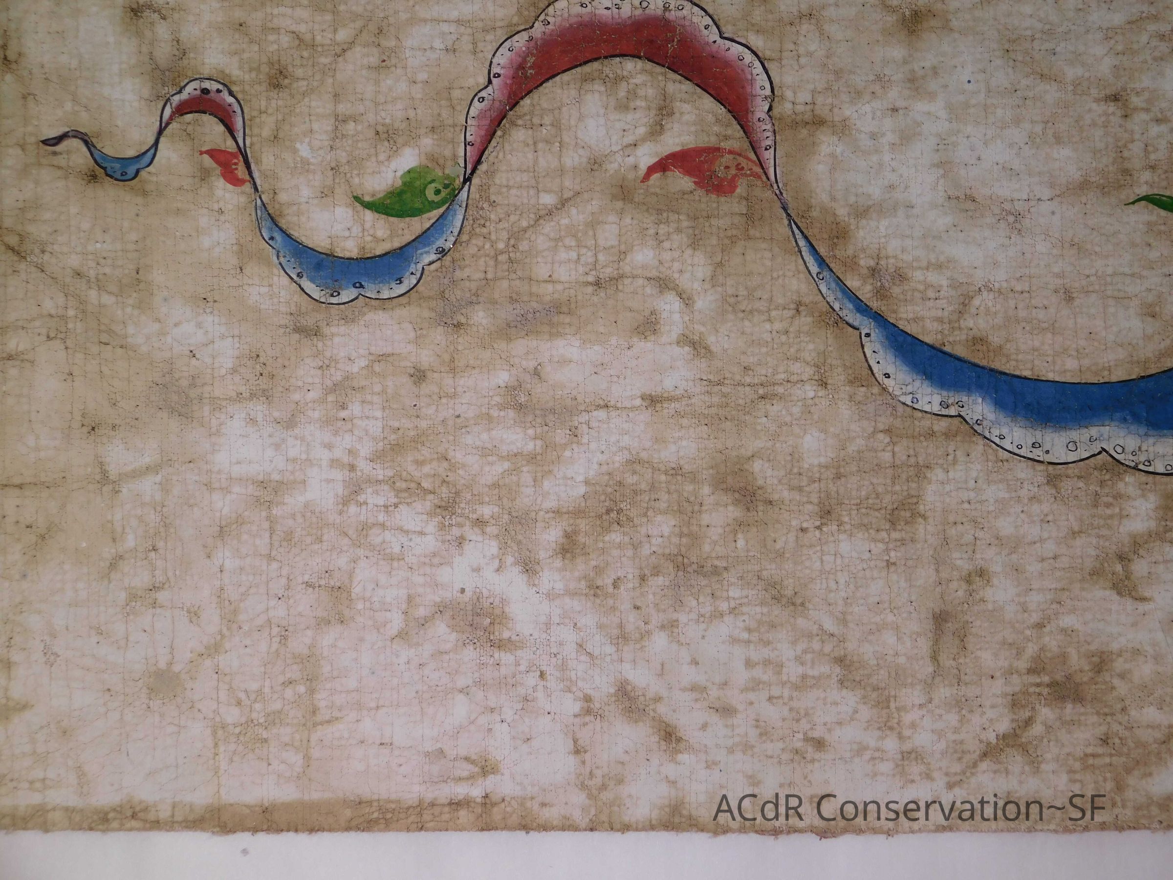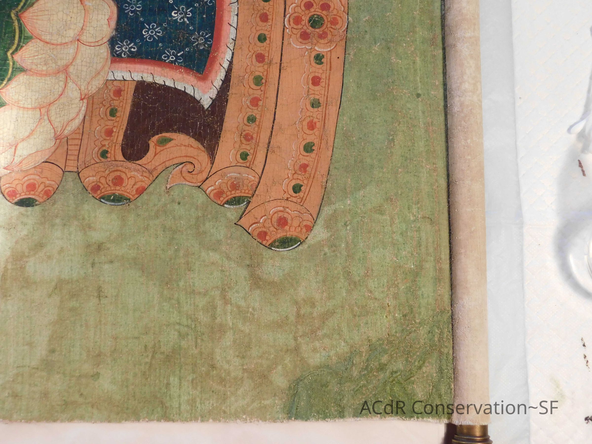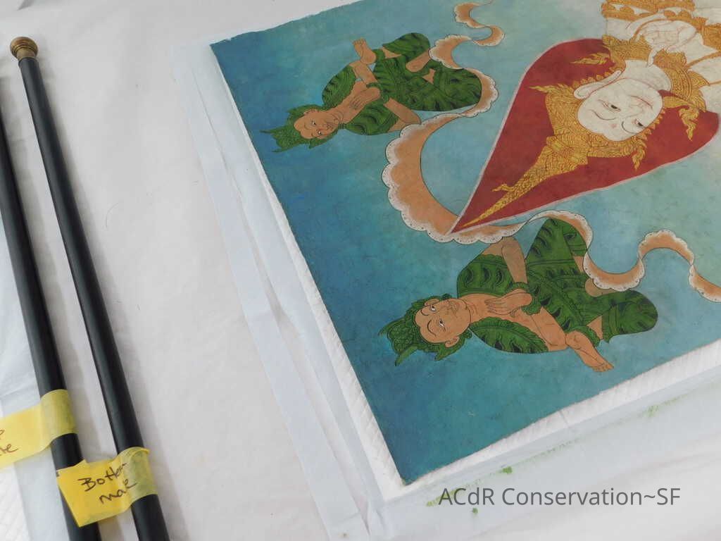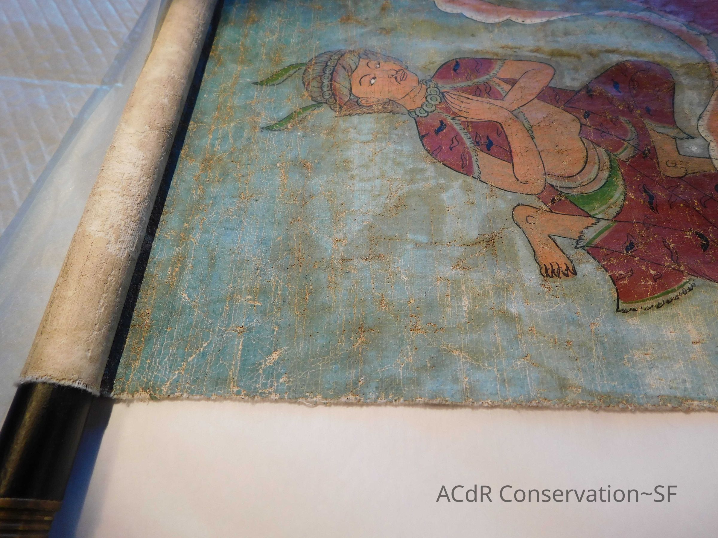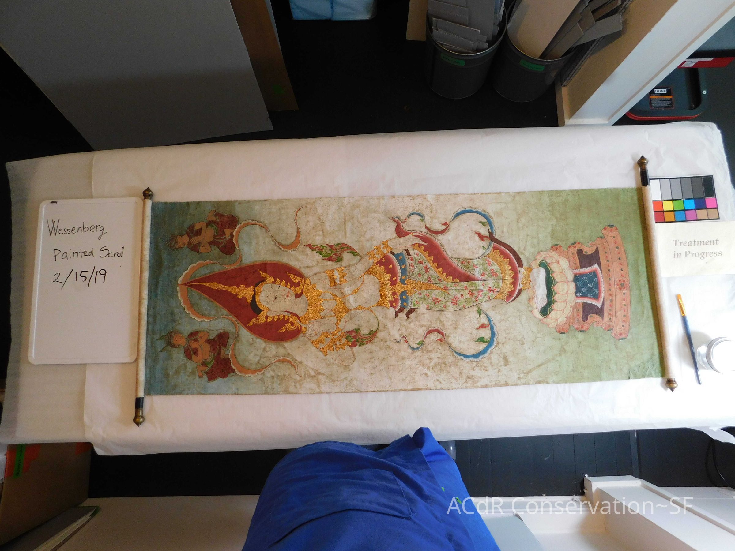 Began smoothing background appearance using wash of thinned watercolors to match what was completed on opposite scroll.
