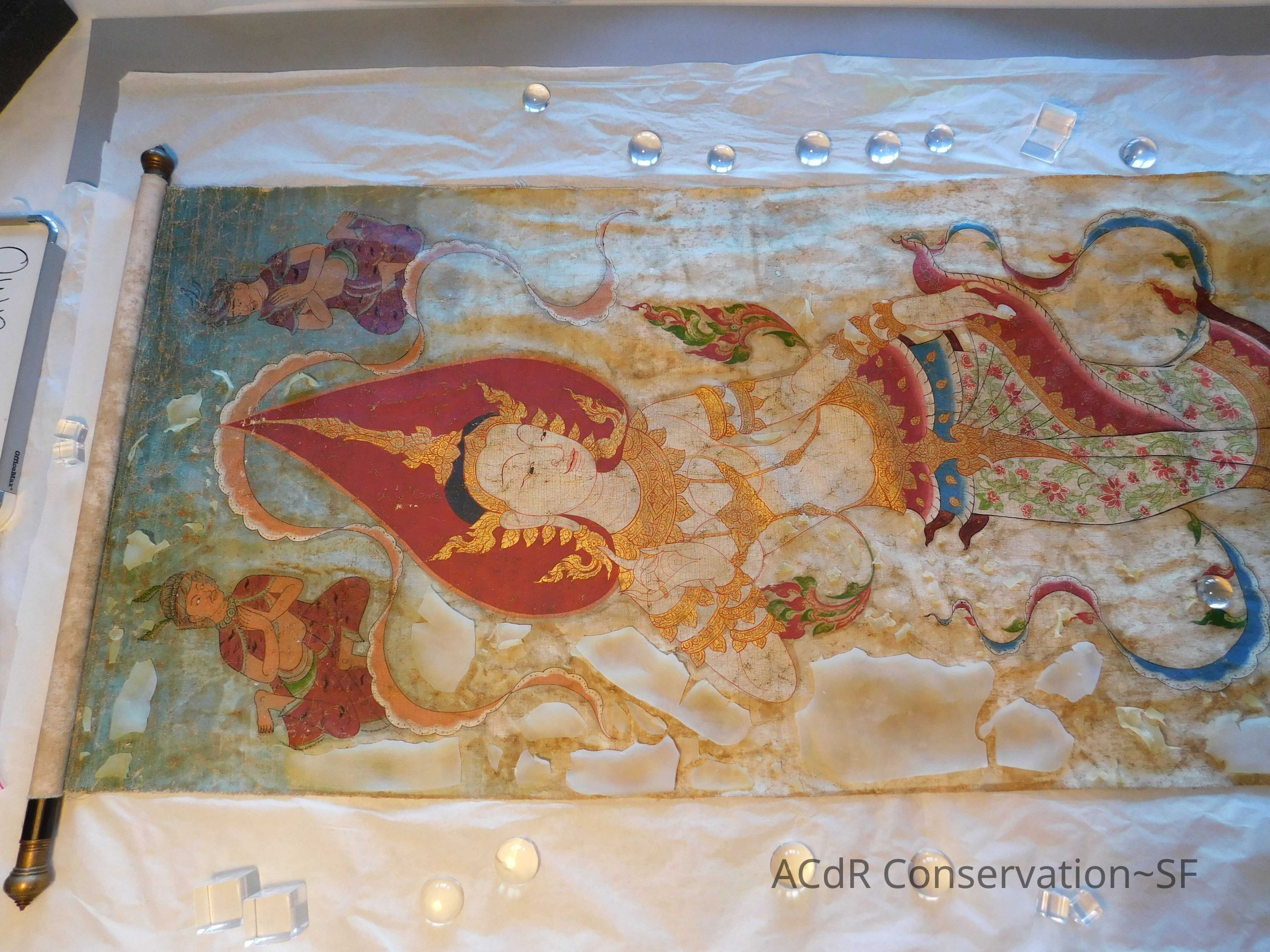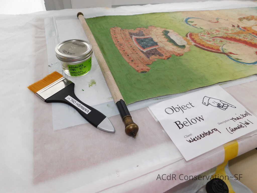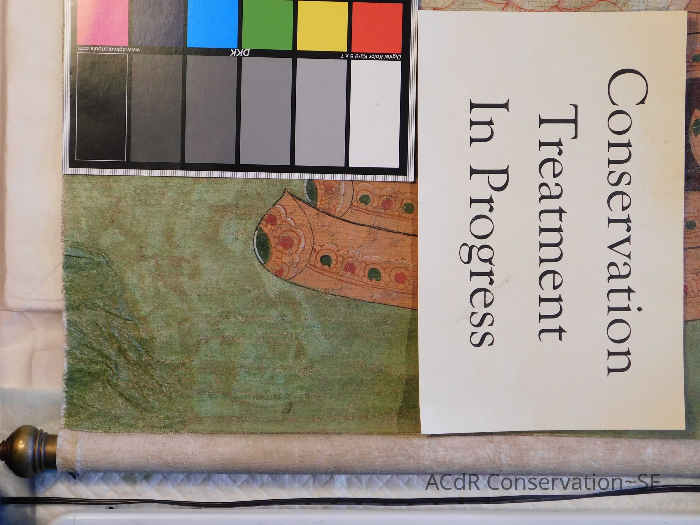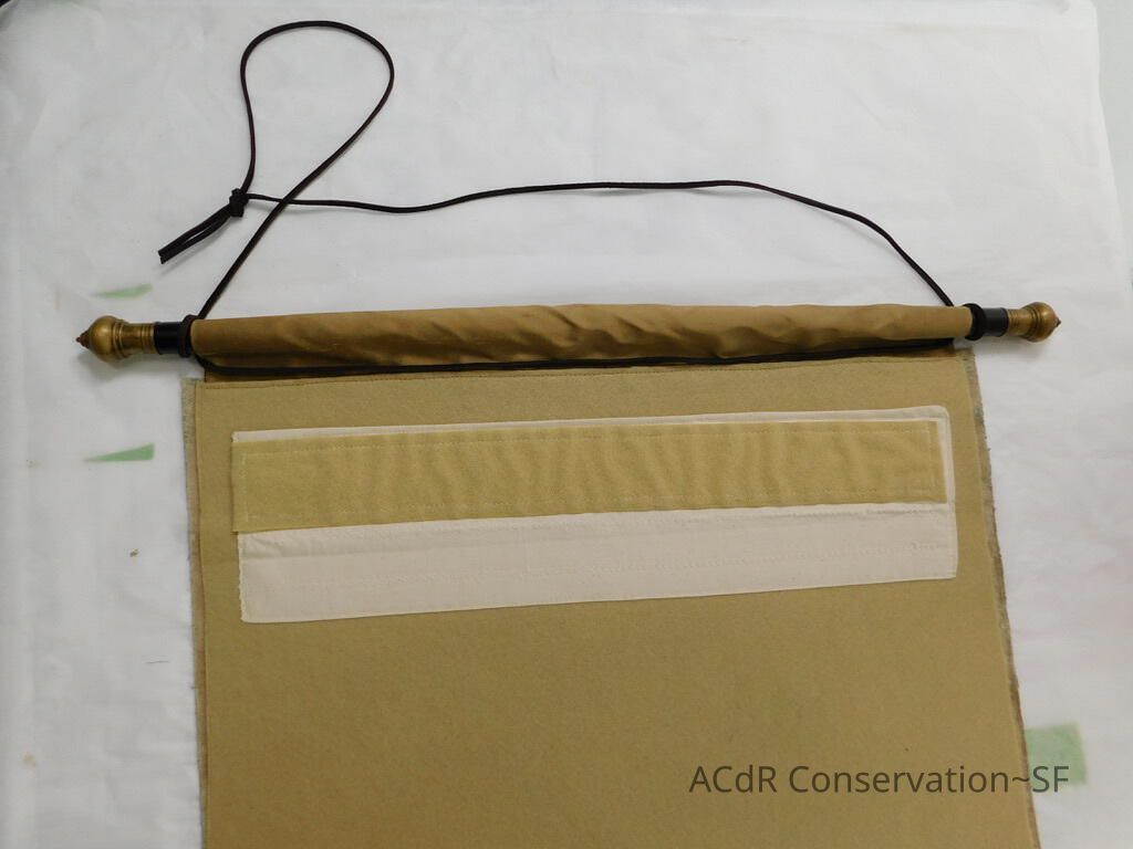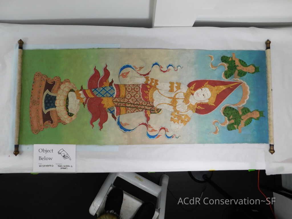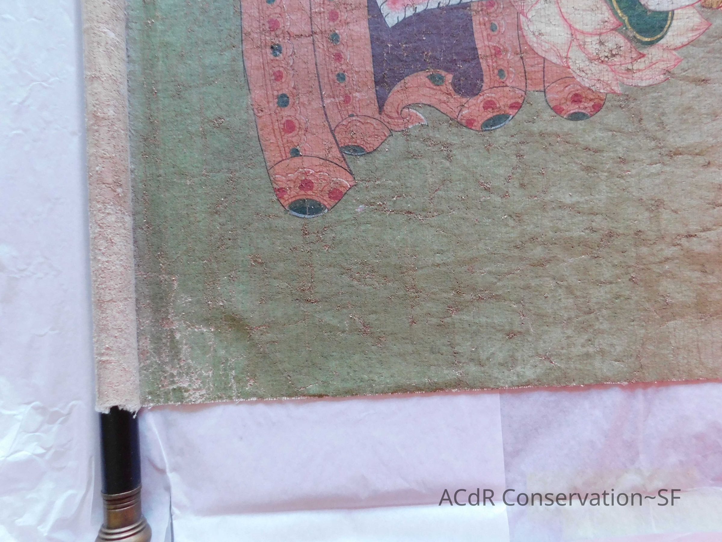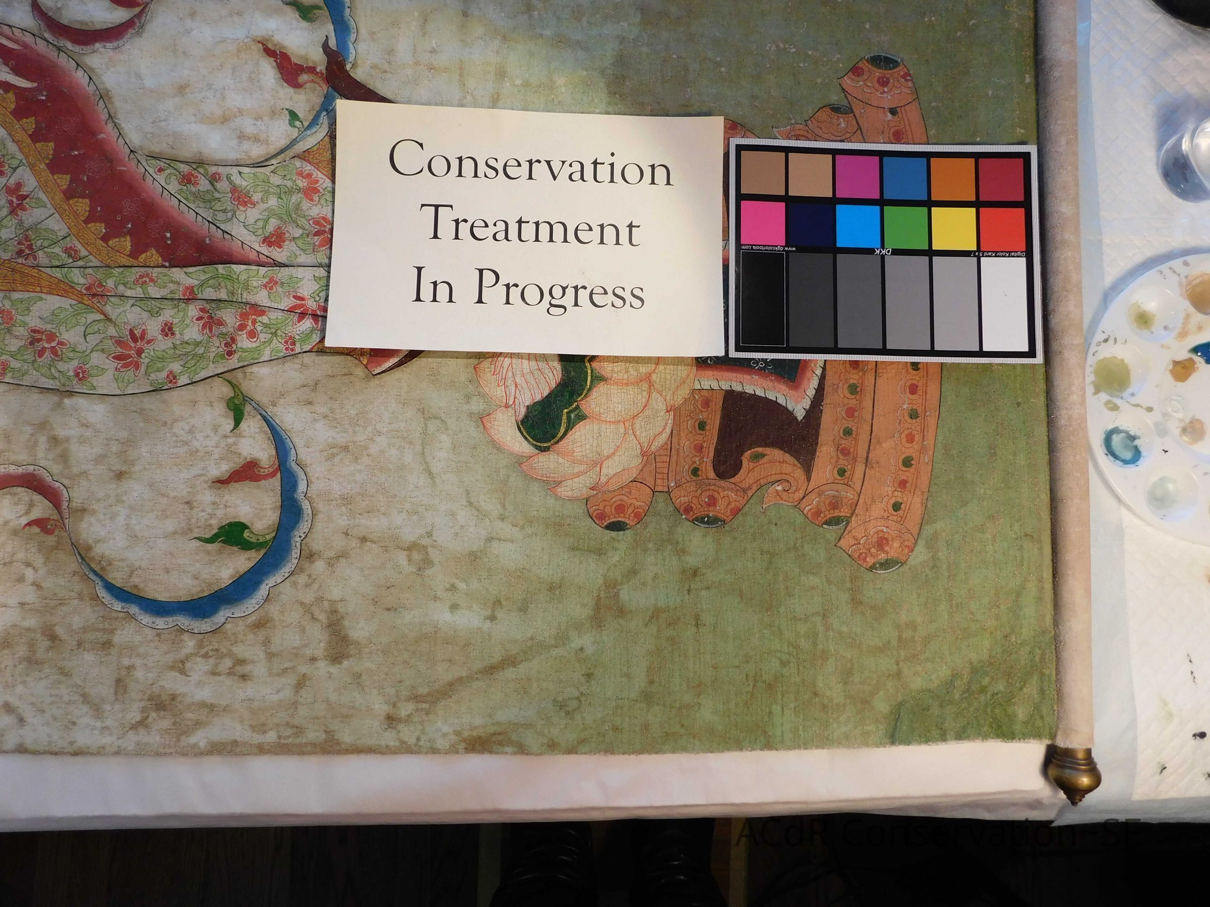 Began smoothing background appearance using wash of thinned watercolors to match what was completed on opposite scroll.