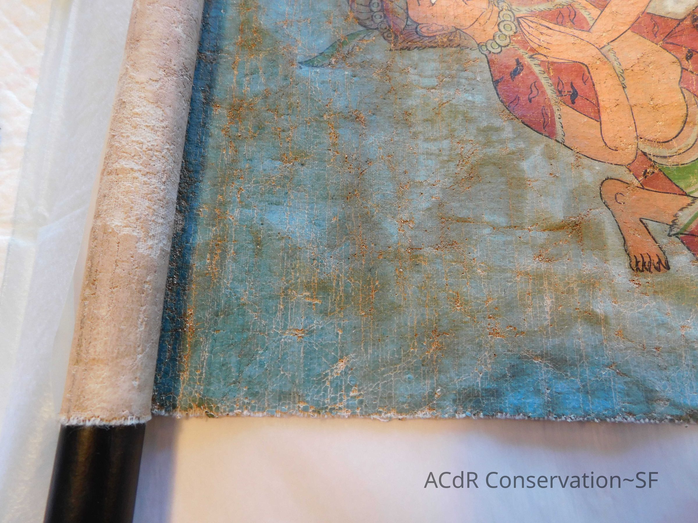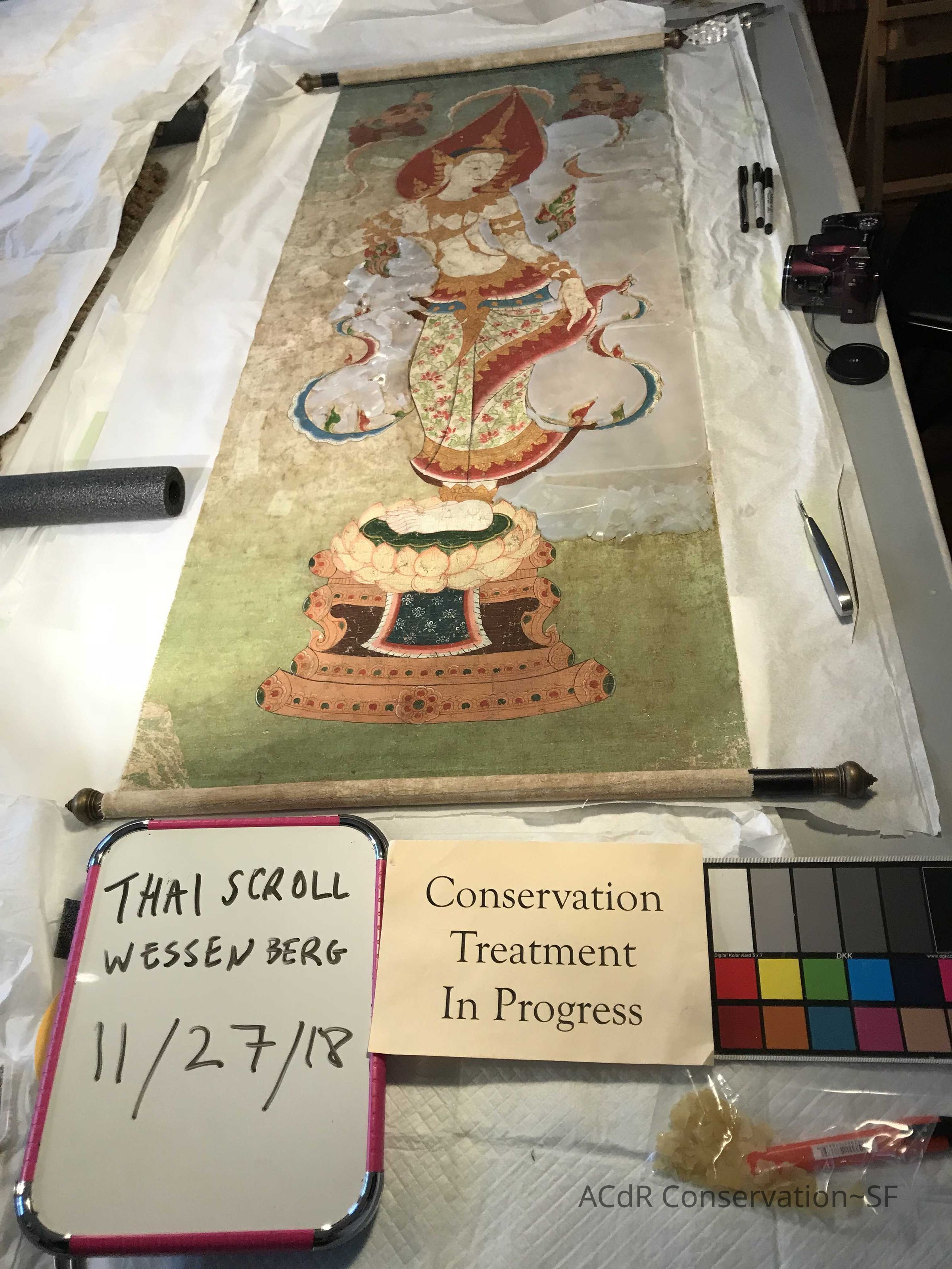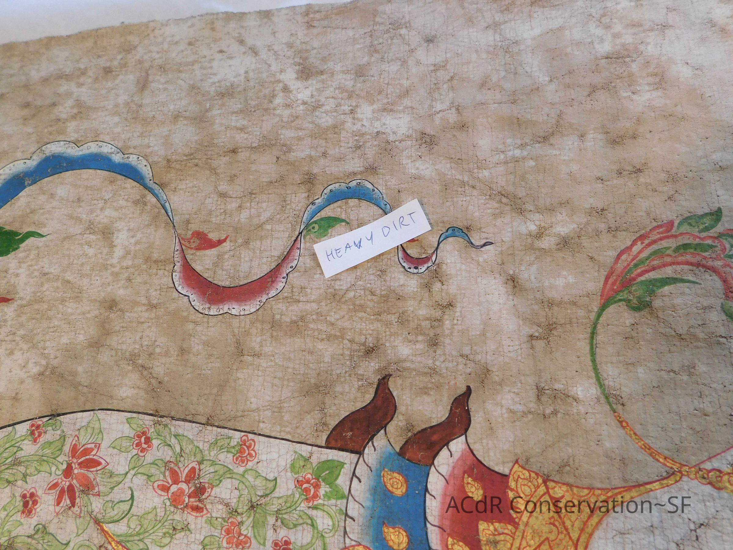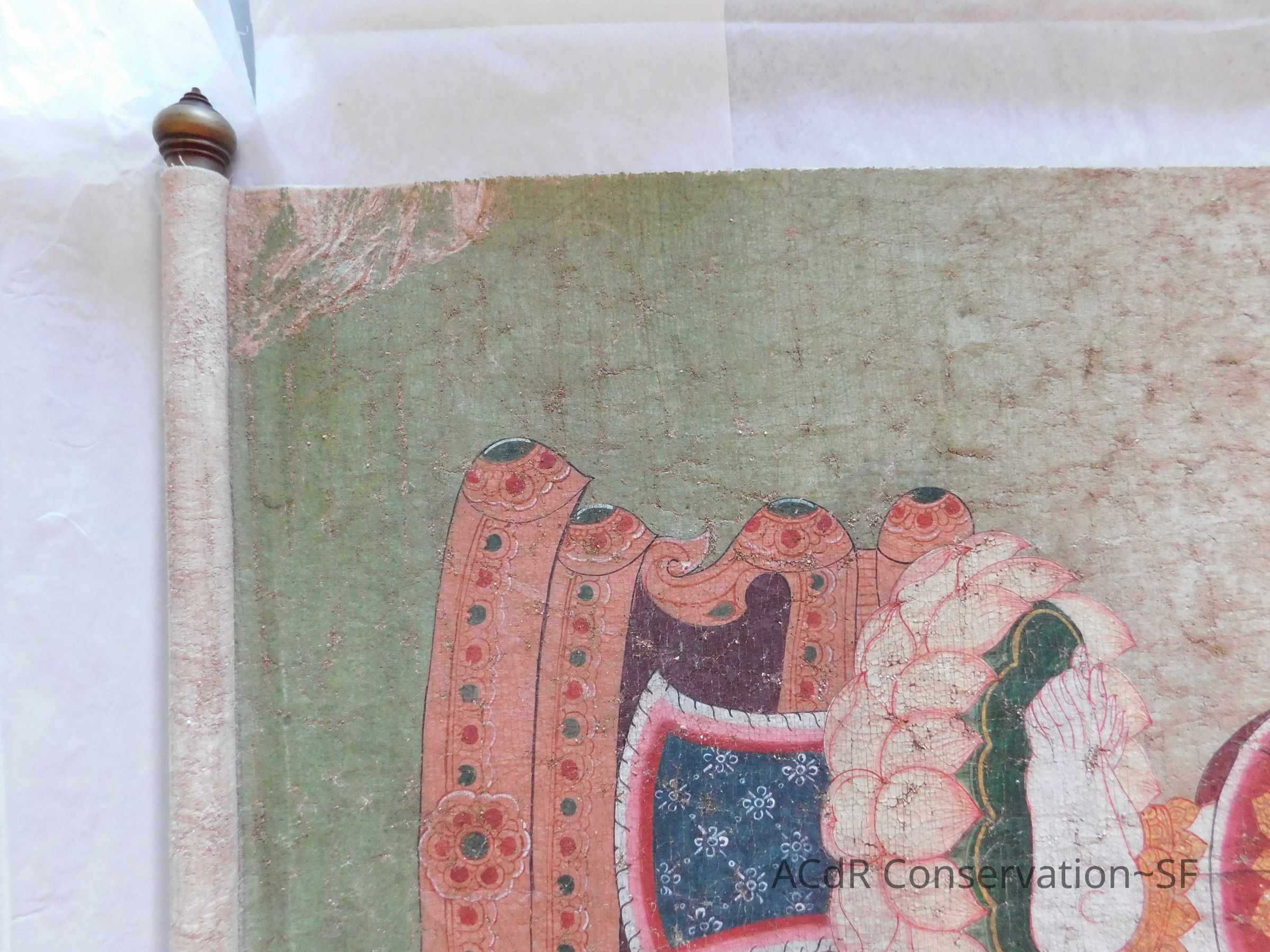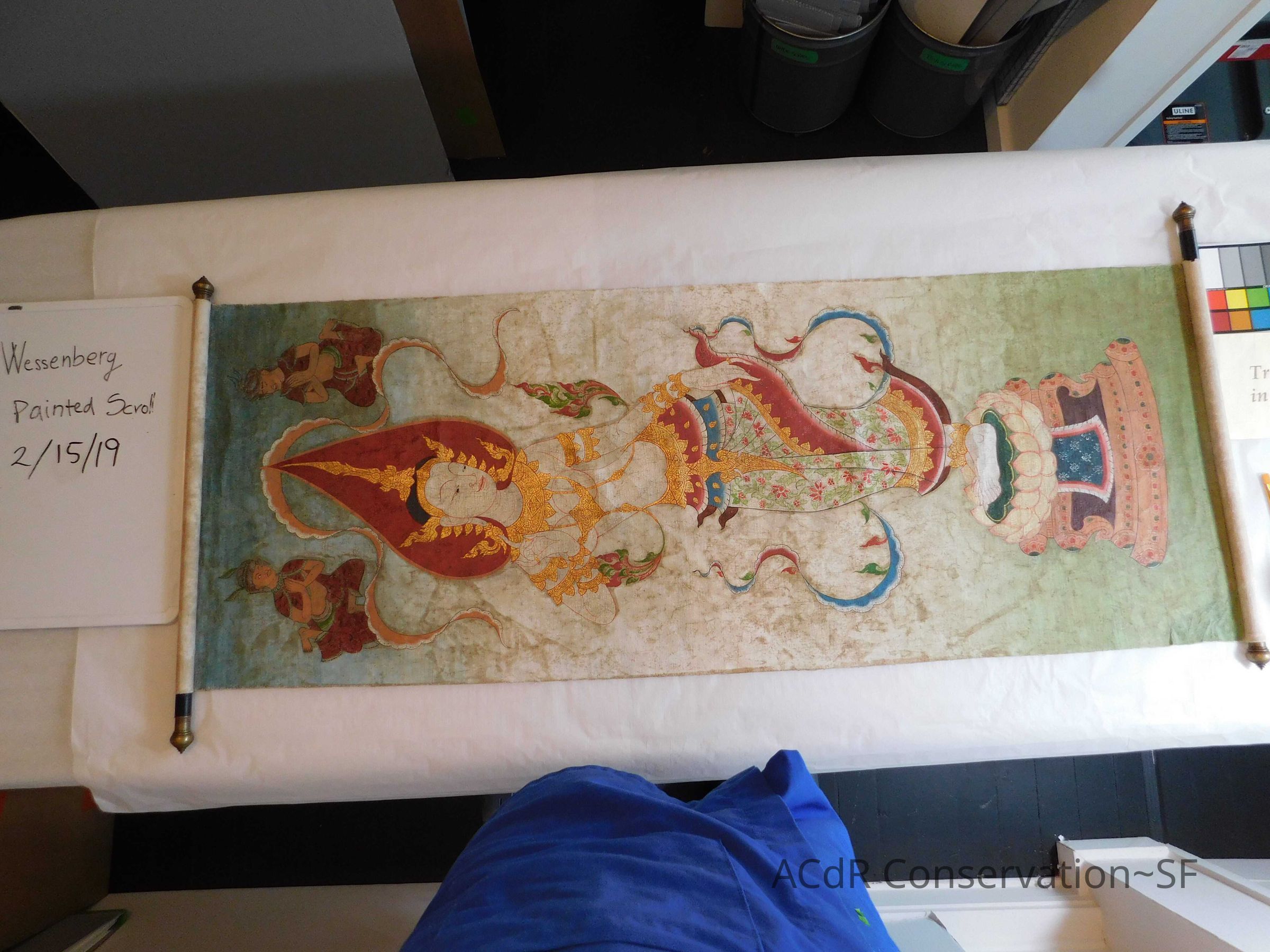 Began smoothing background appearance using wash of thinned watercolors to match what was completed on opposite scroll.