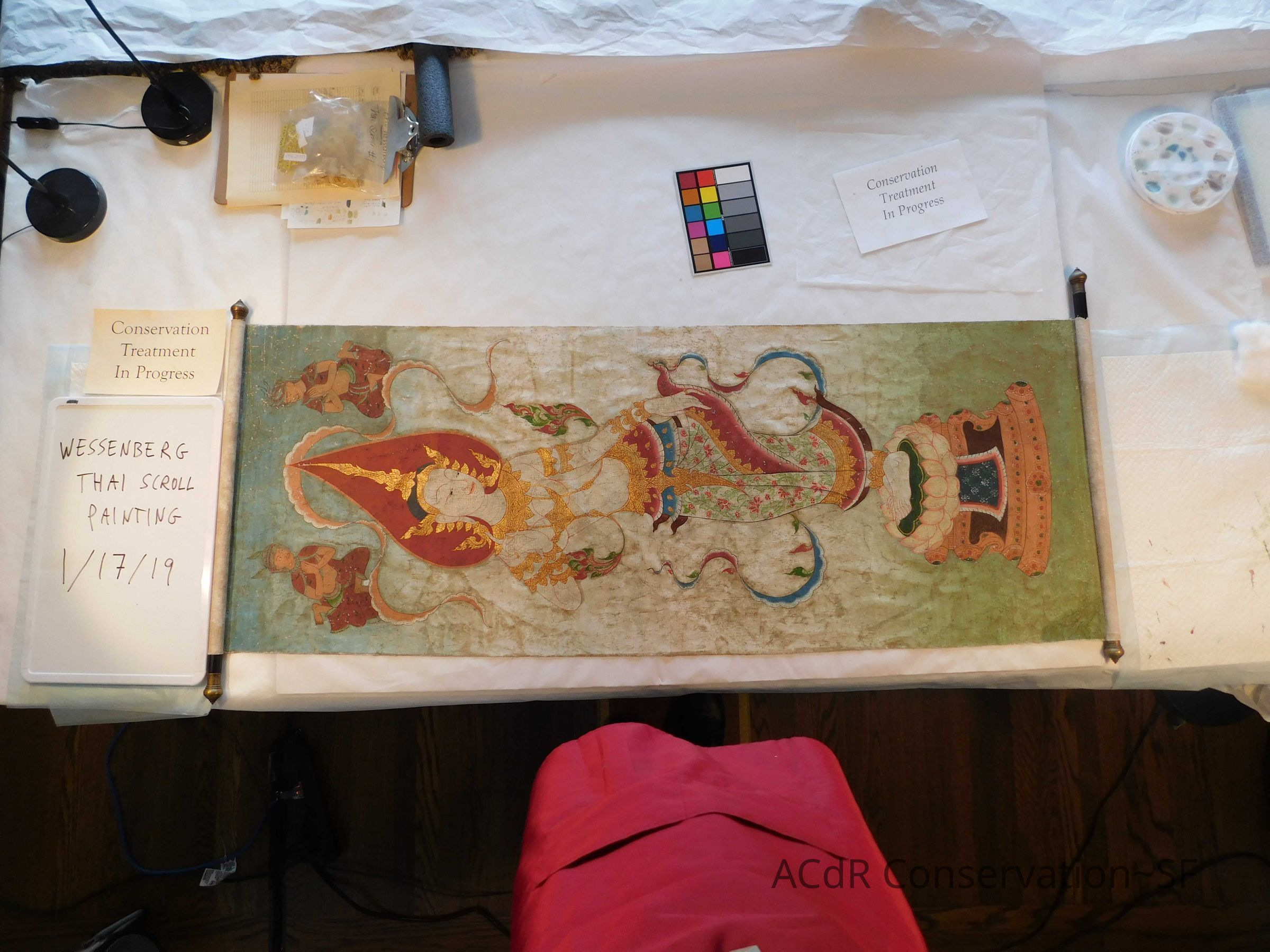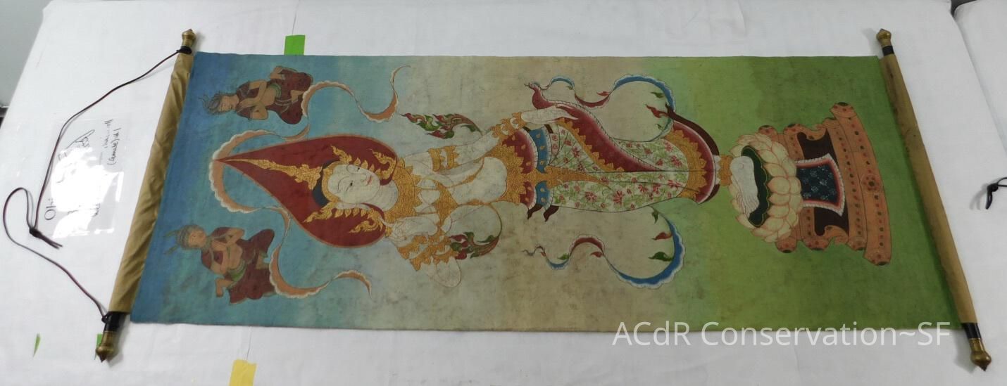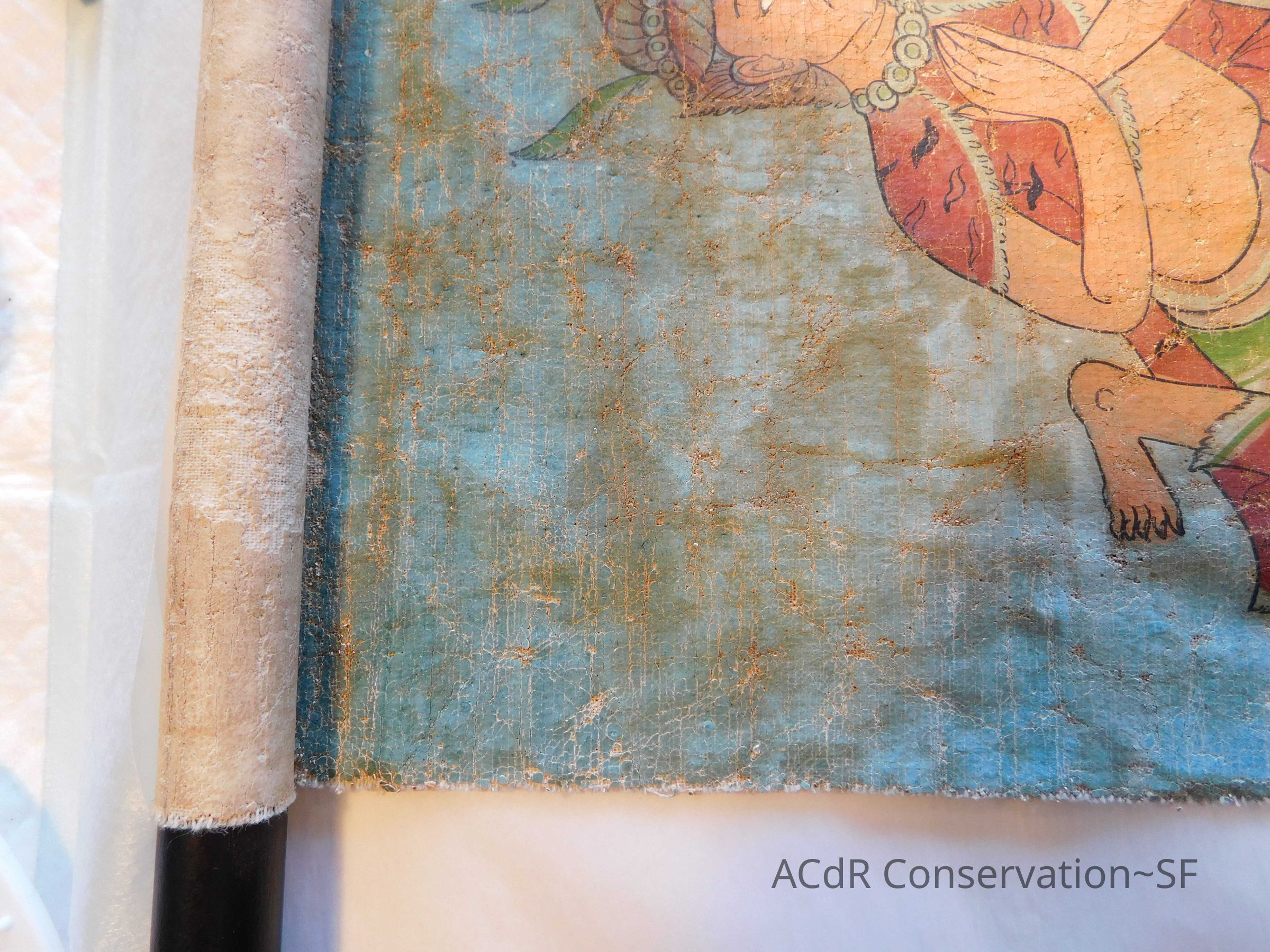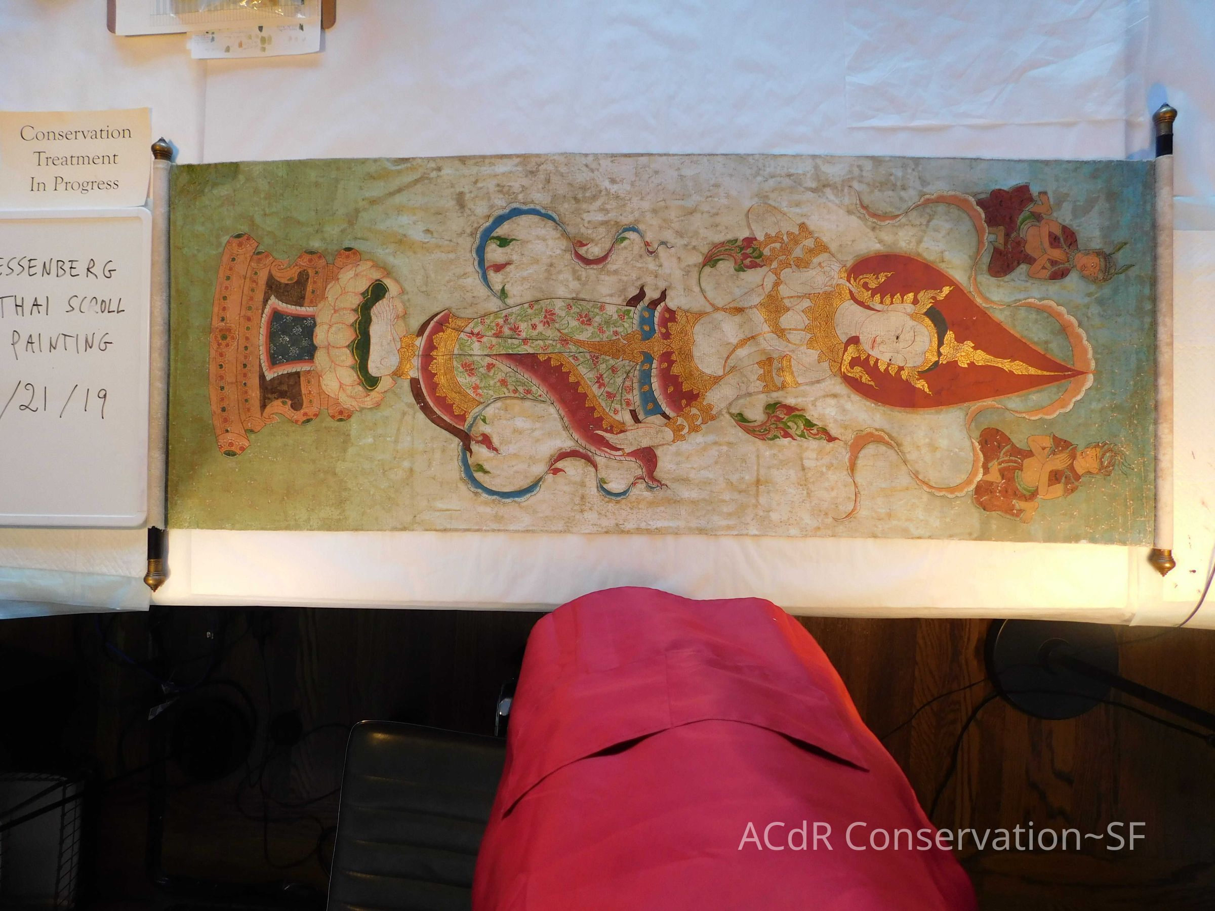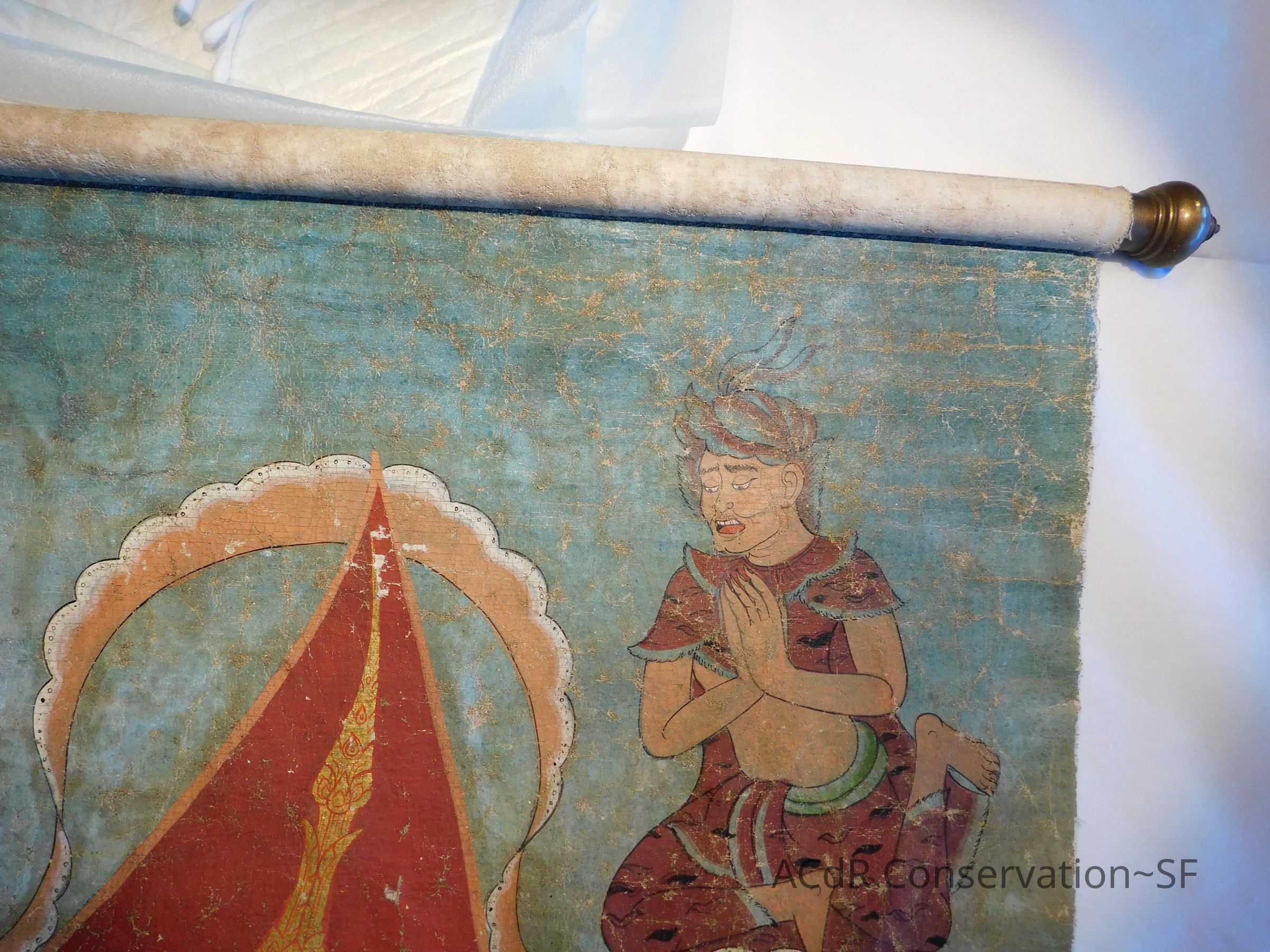 Began smoothing background appearance using wash of thinned watercolors to match what was completed on opposite scroll.