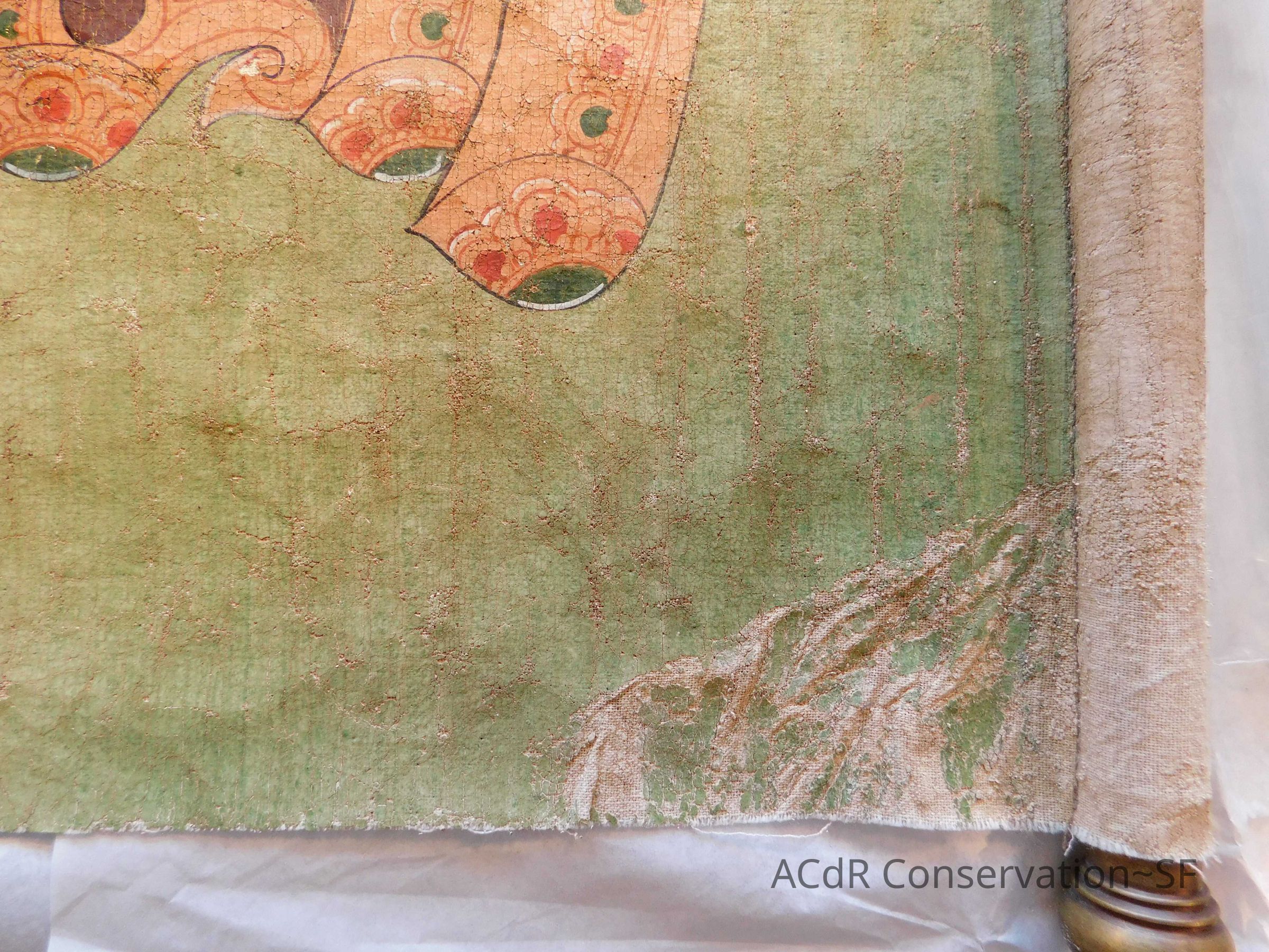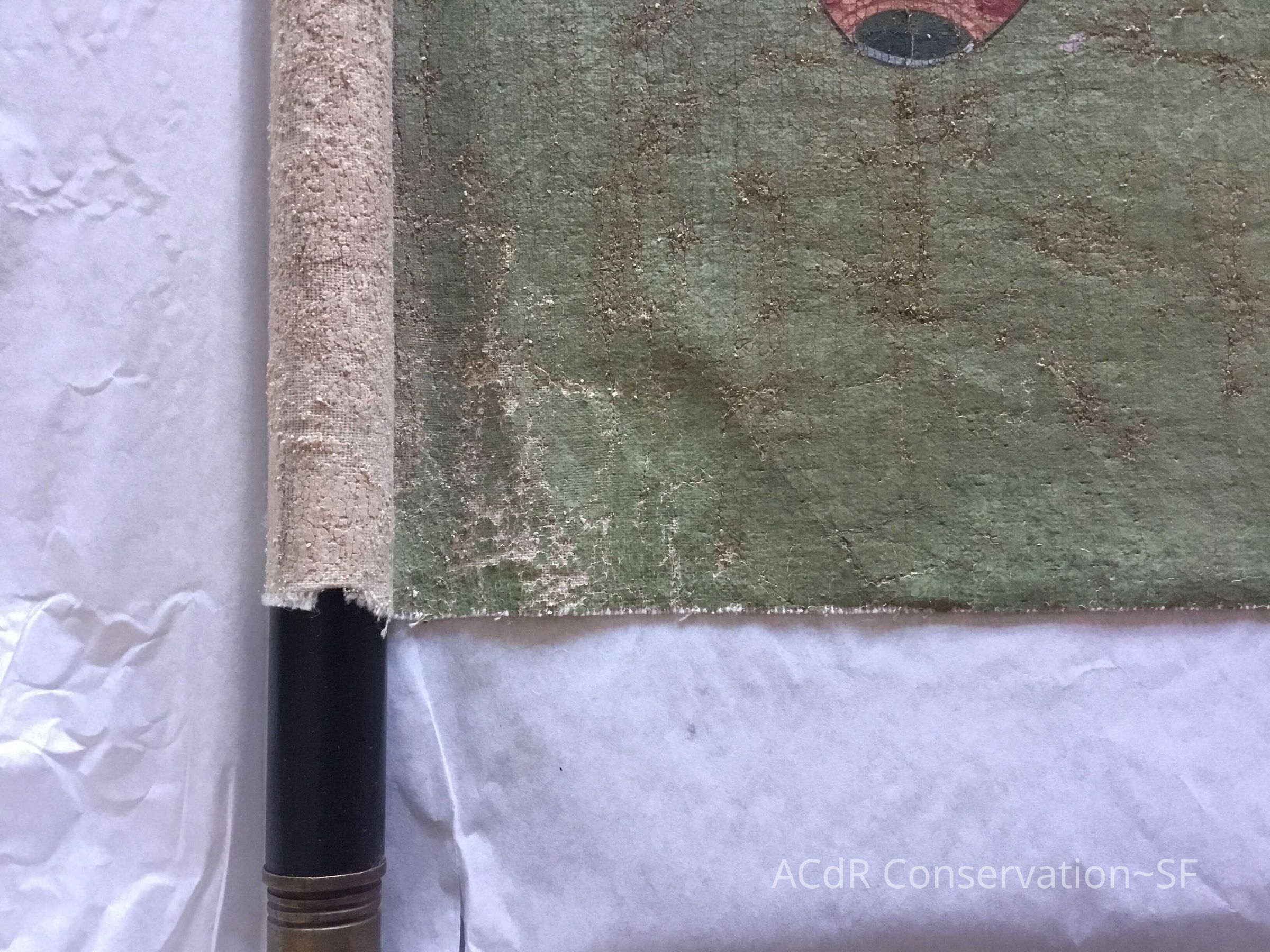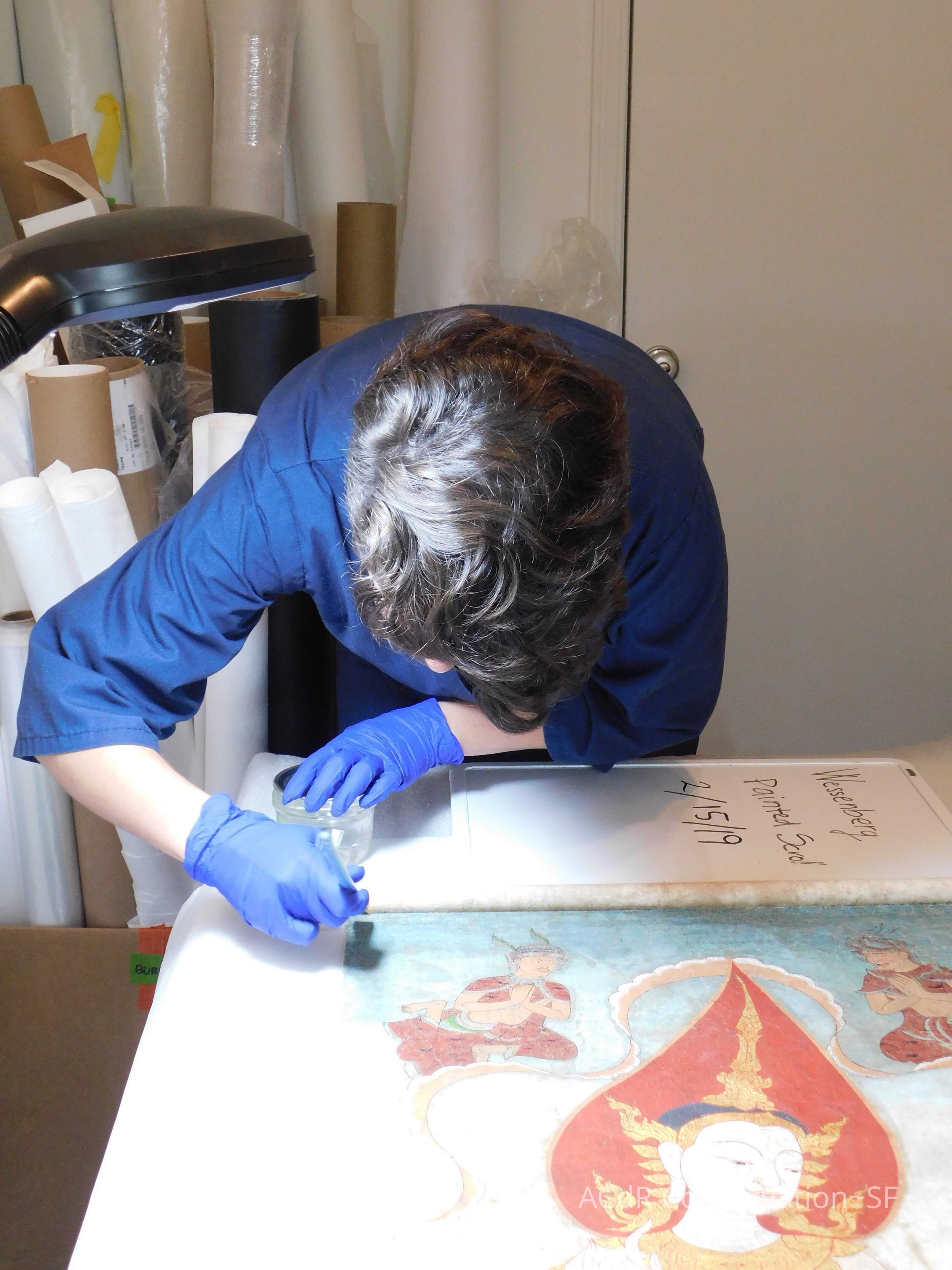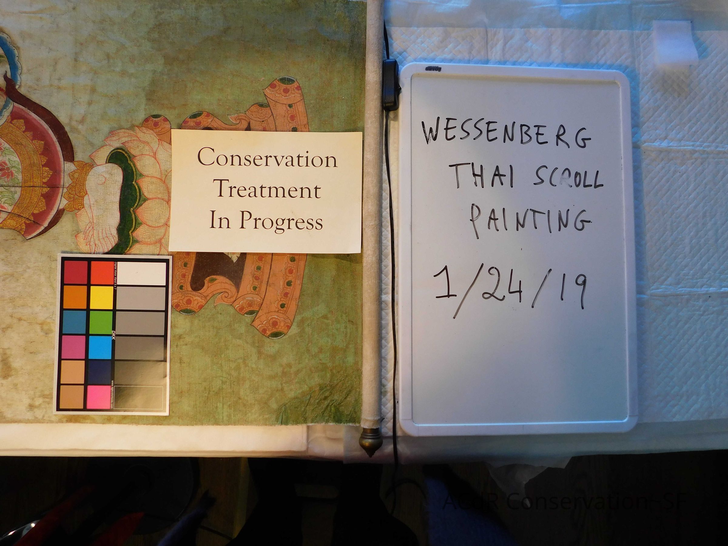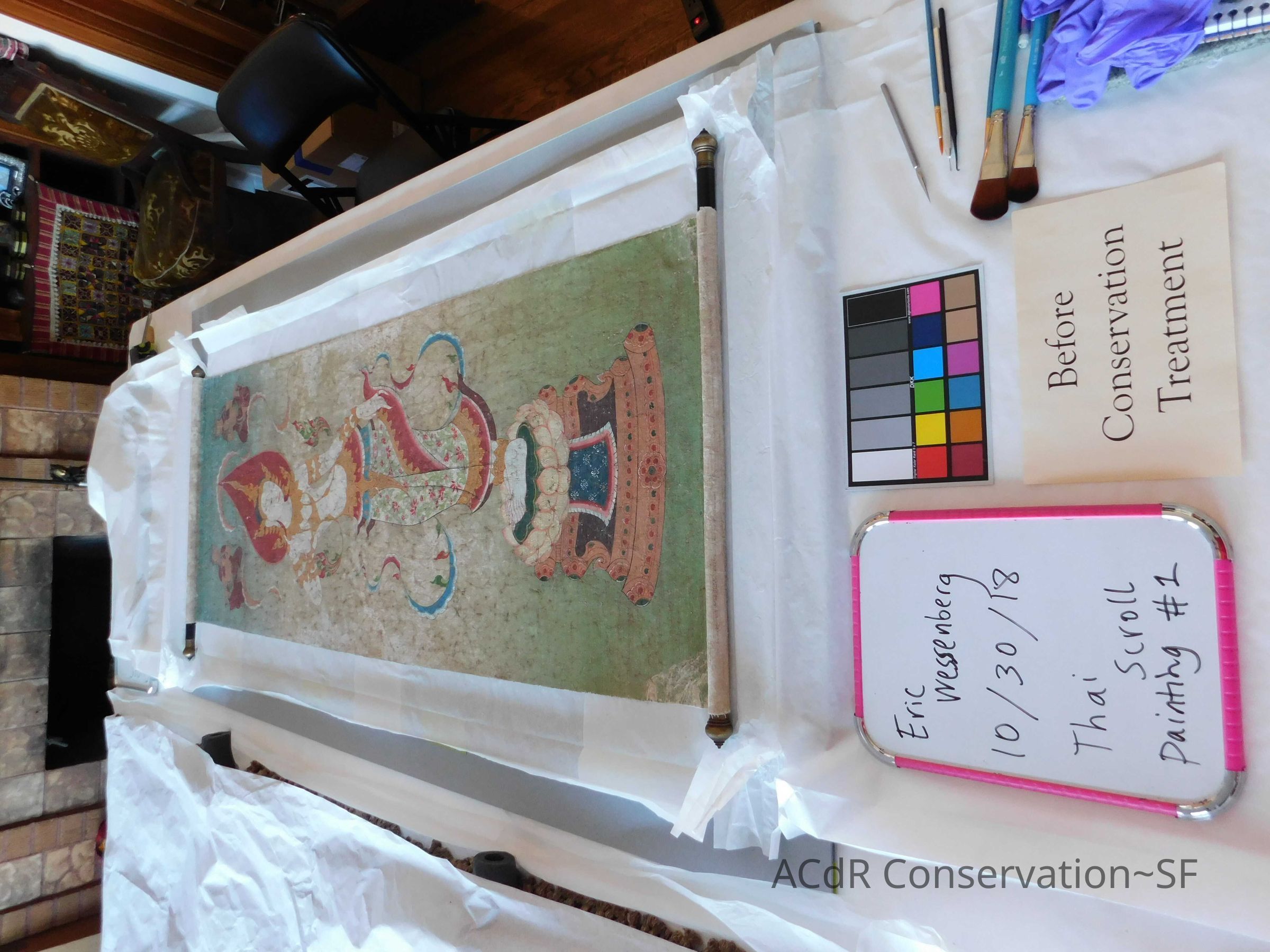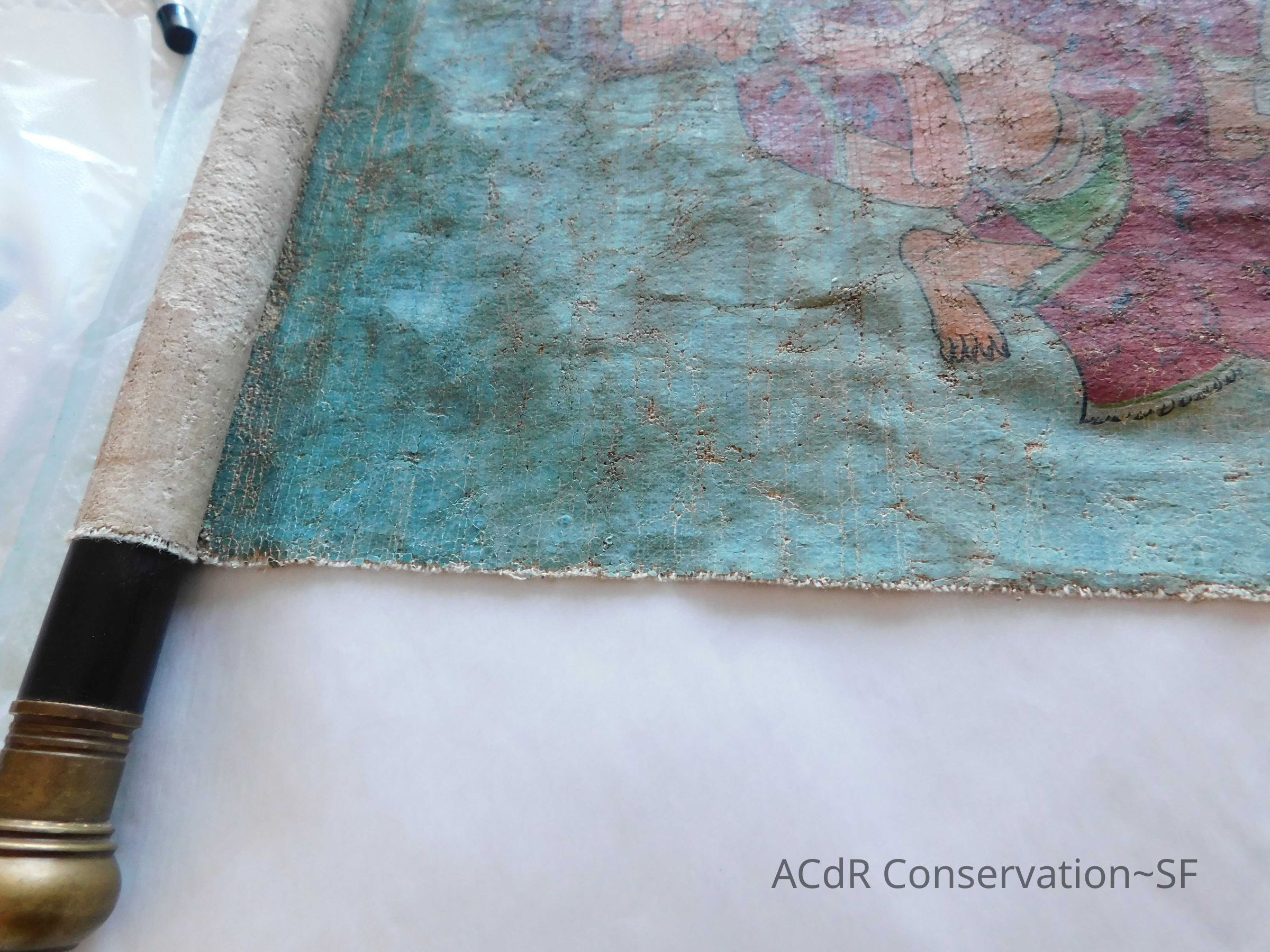 Began smoothing background appearance using wash of thinned watercolors to match what was completed on opposite scroll.