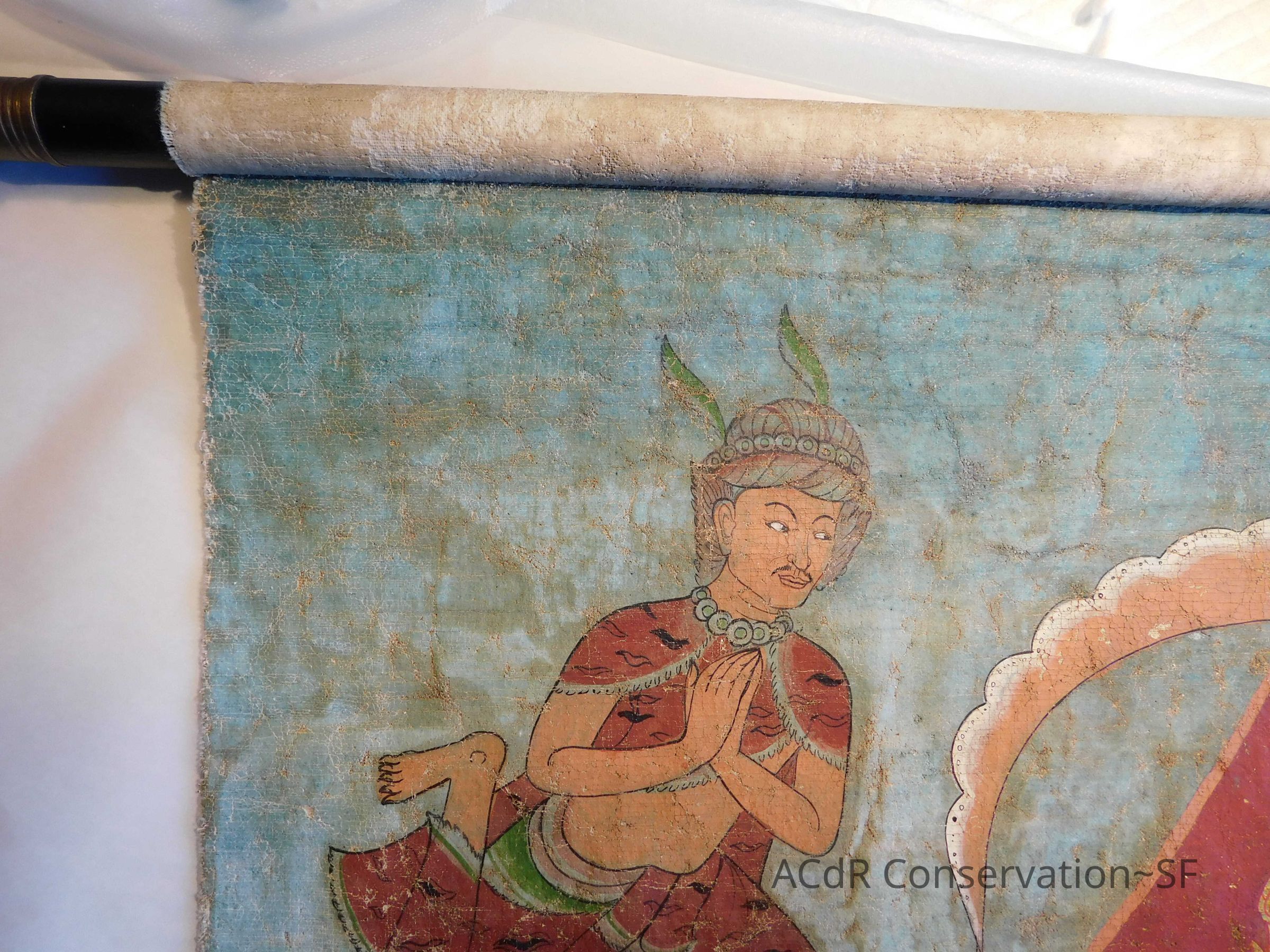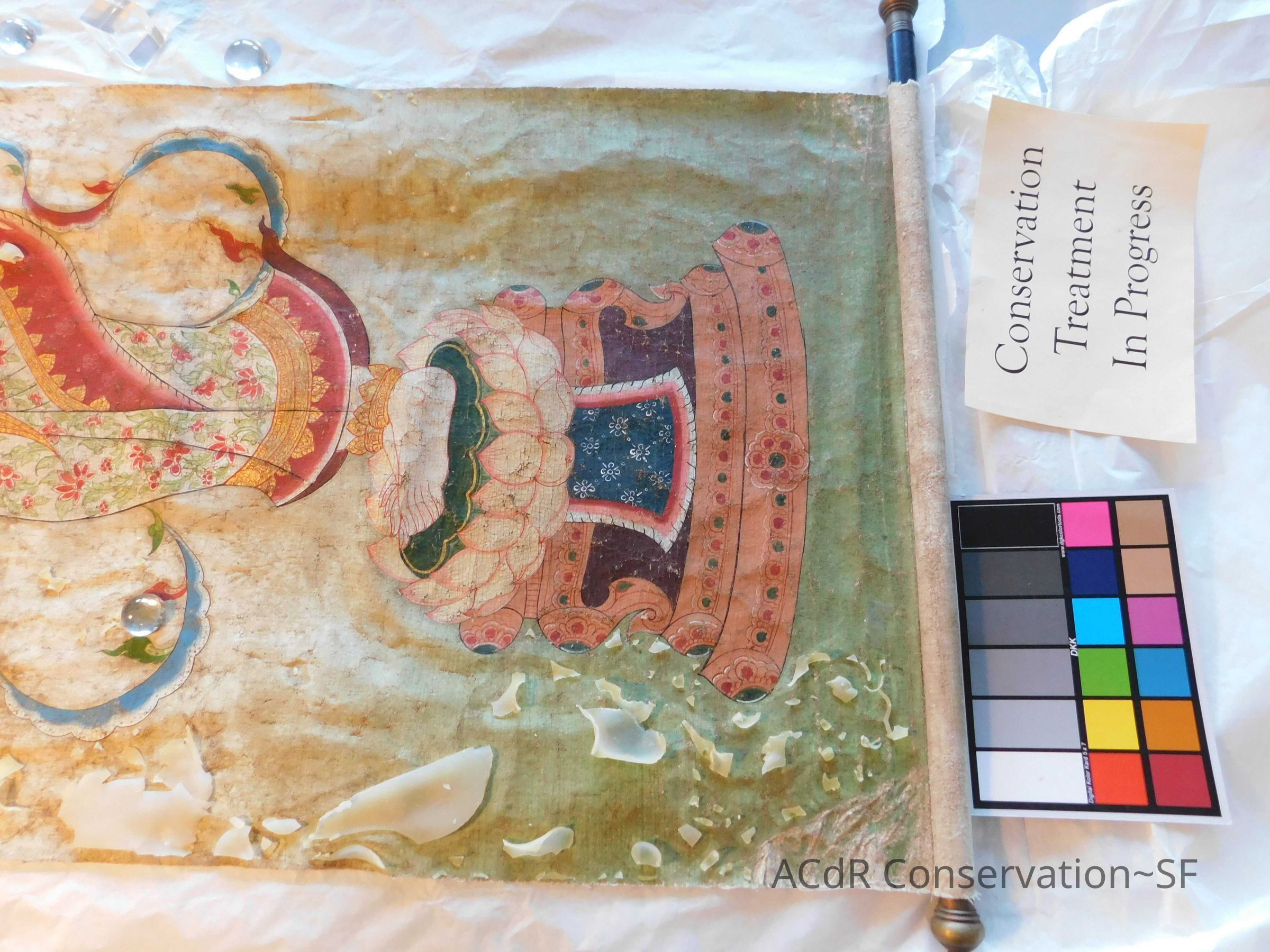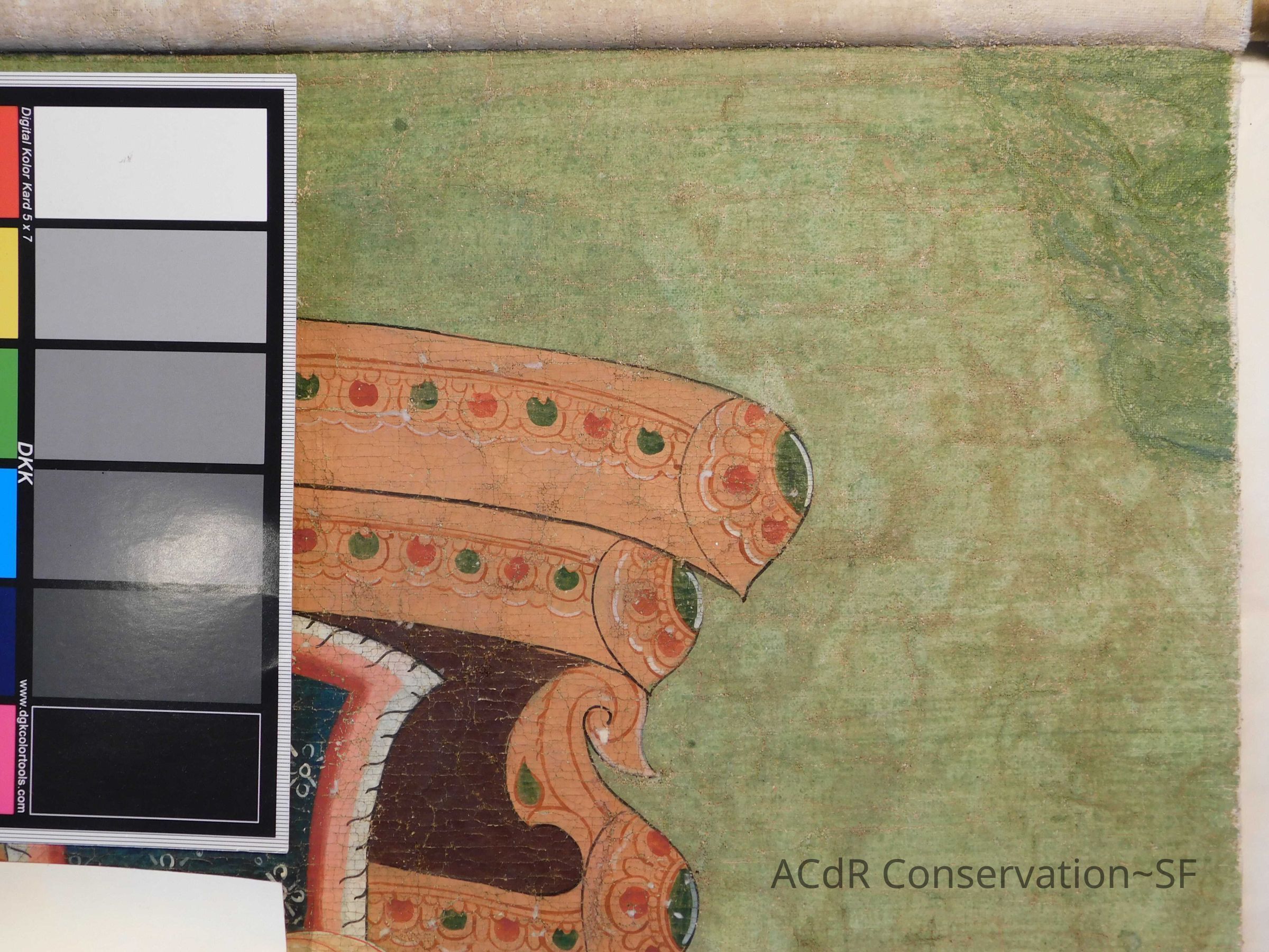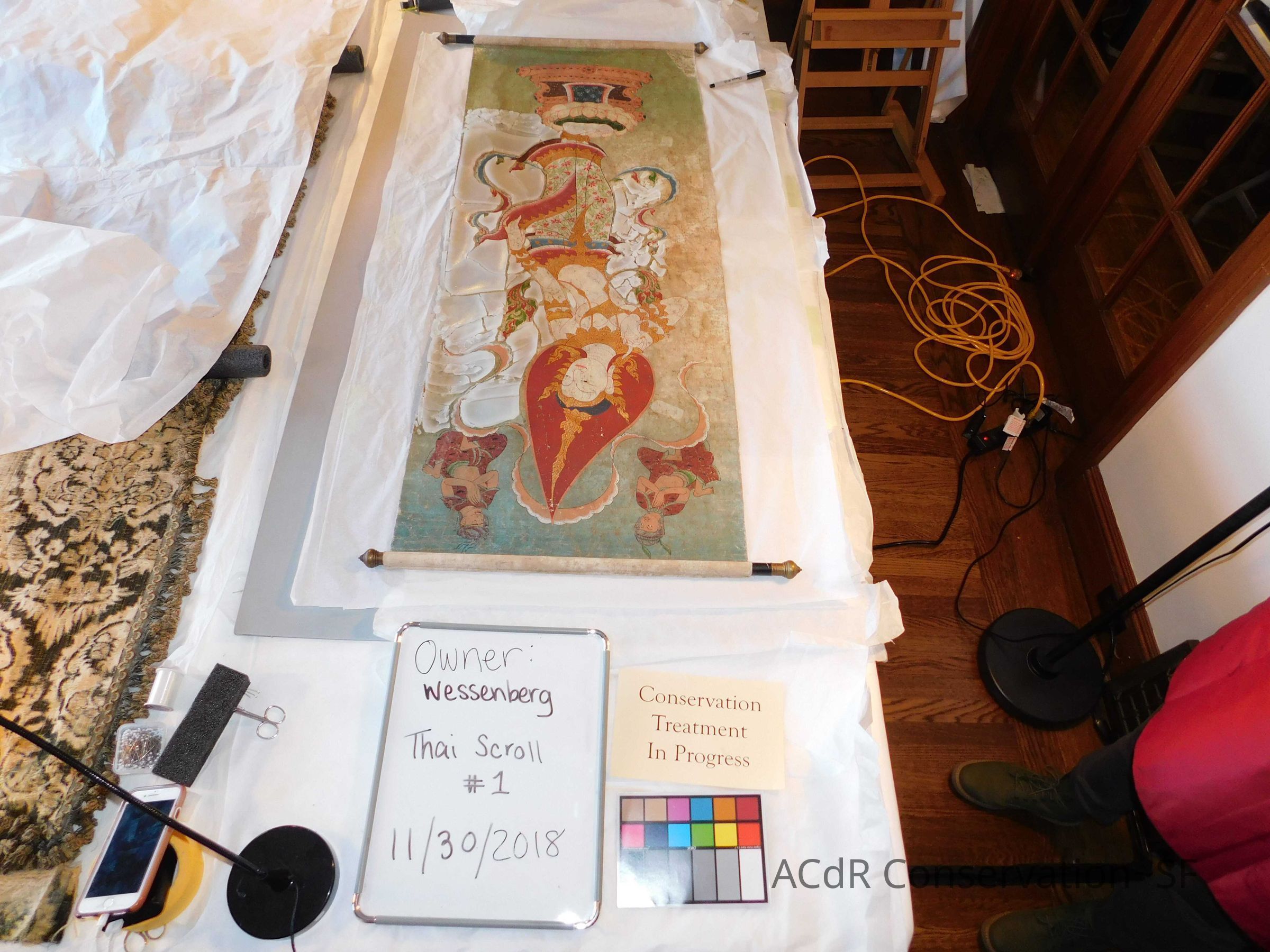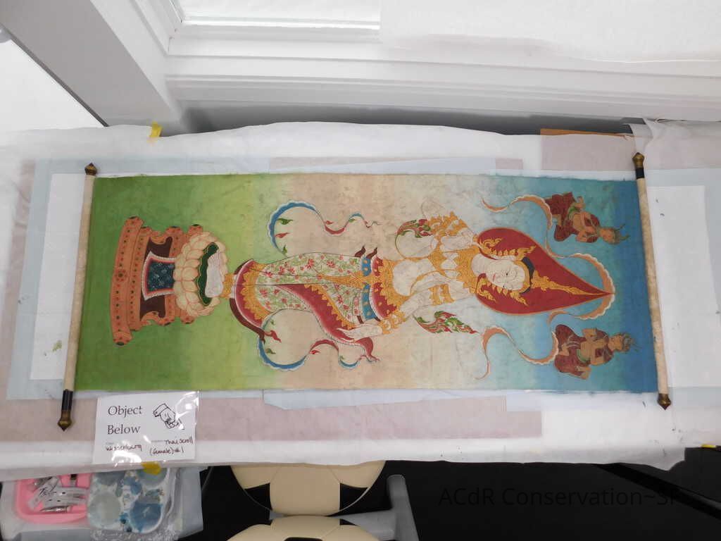Began smoothing background appearance using wash of thinned watercolors to match what was completed on opposite scroll.