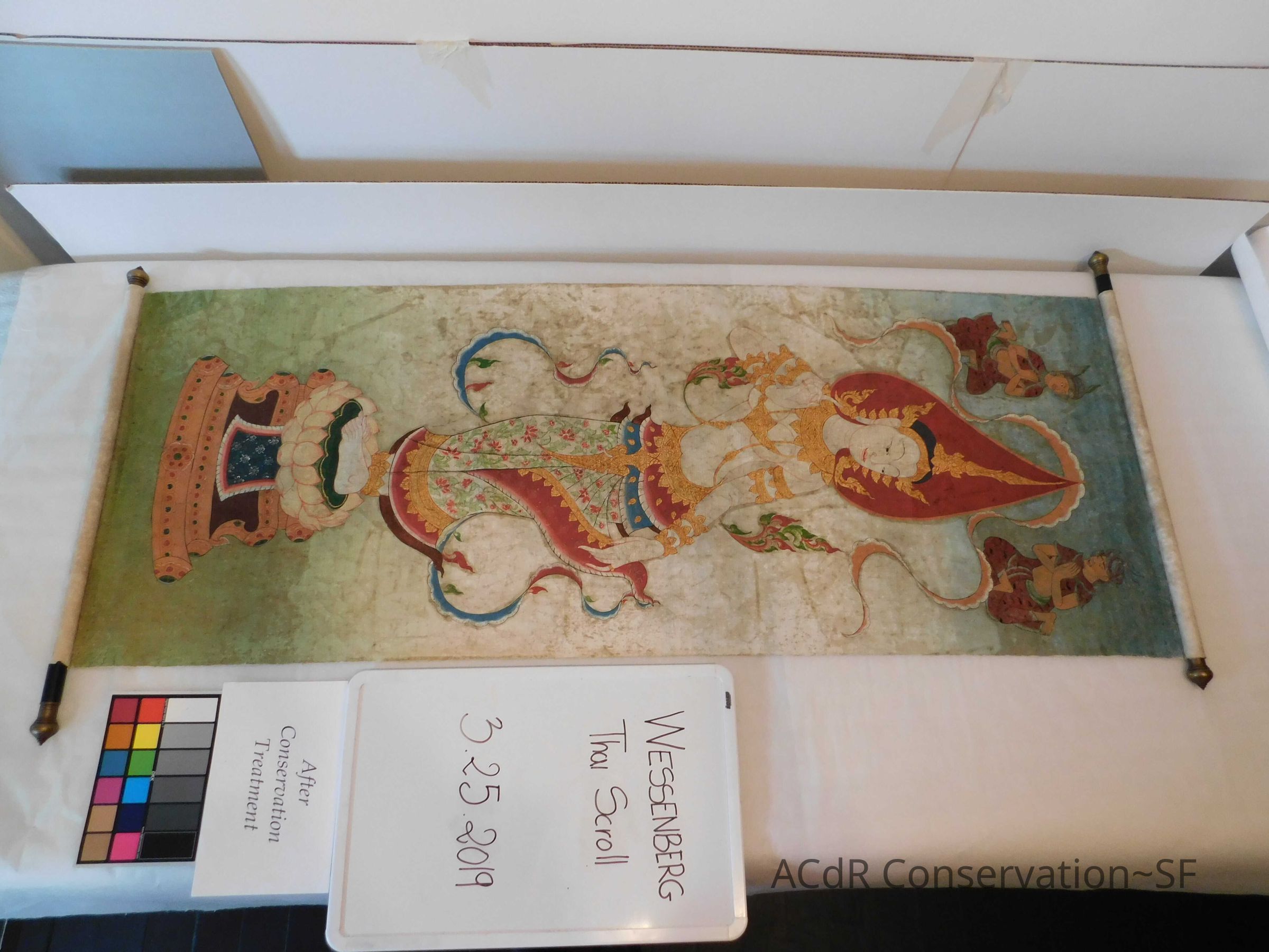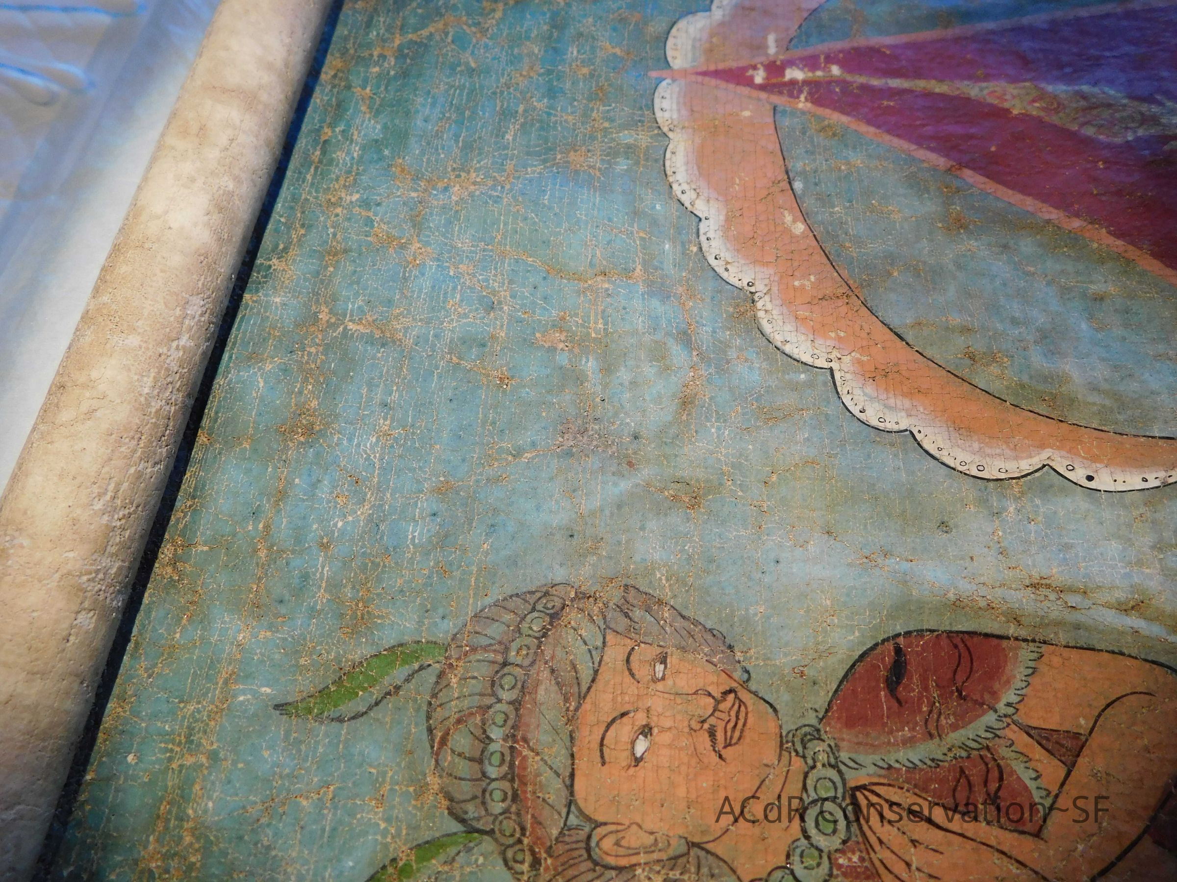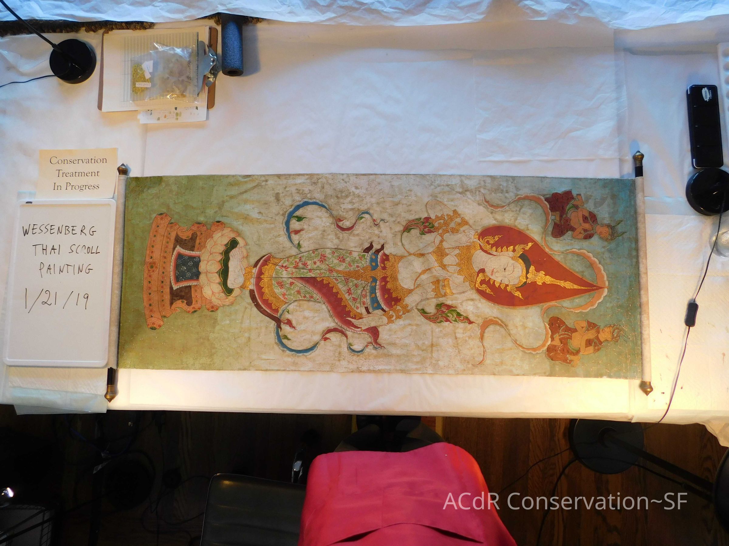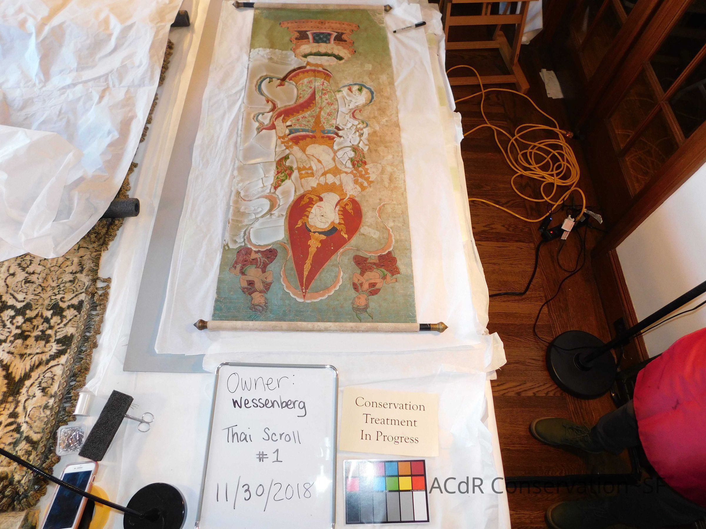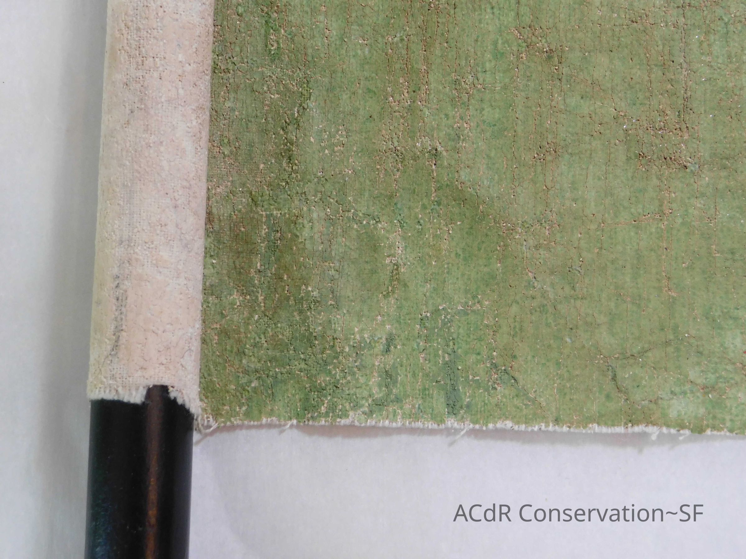 Began smoothing background appearance using wash of thinned watercolors to match what was completed on opposite scroll.