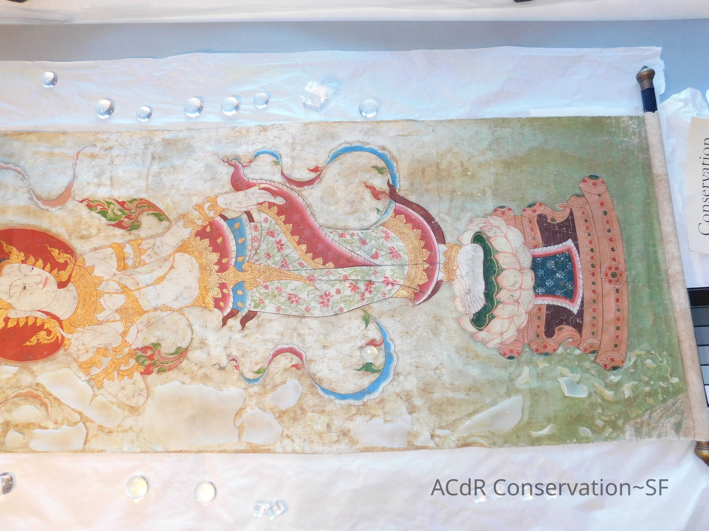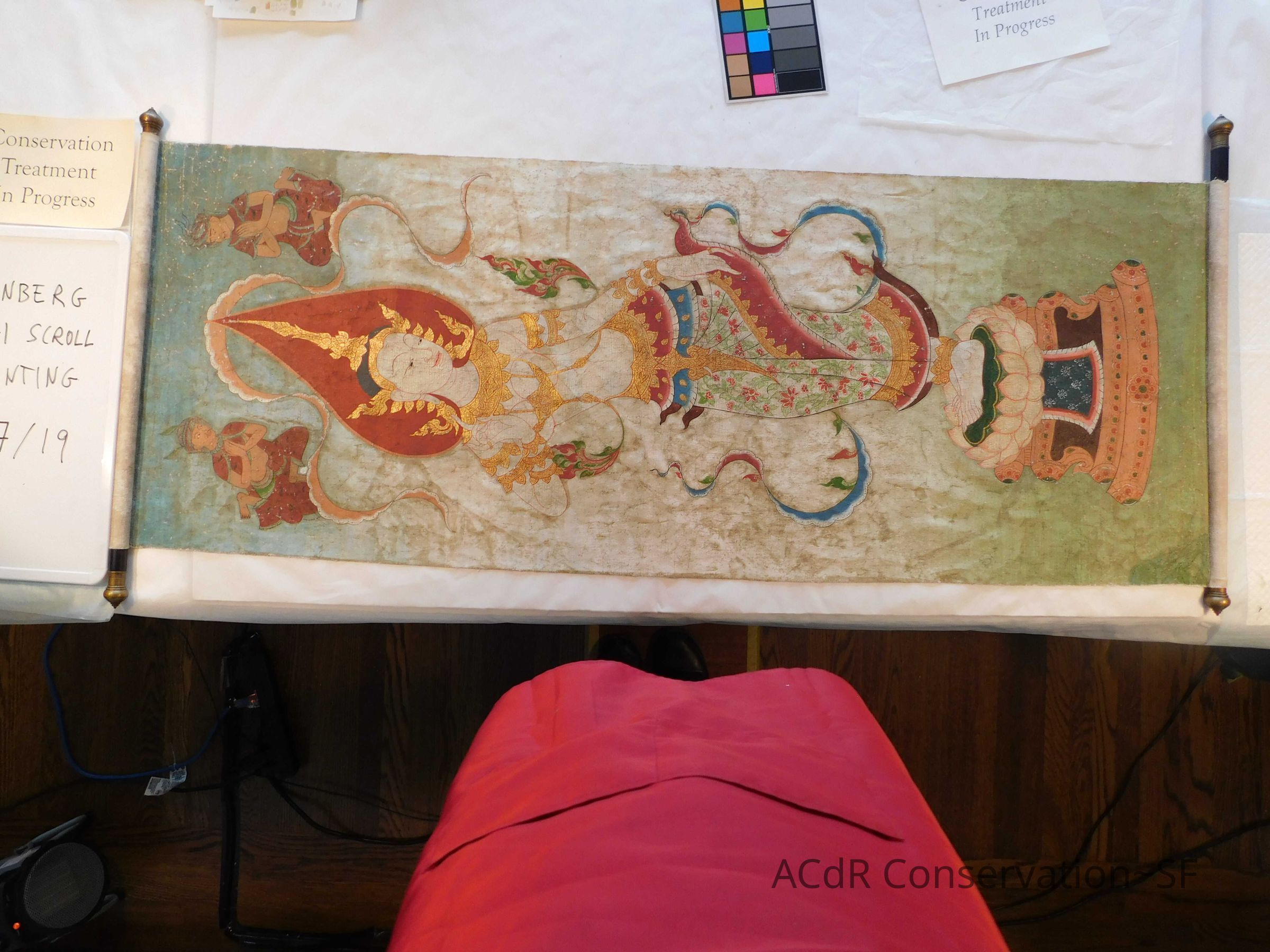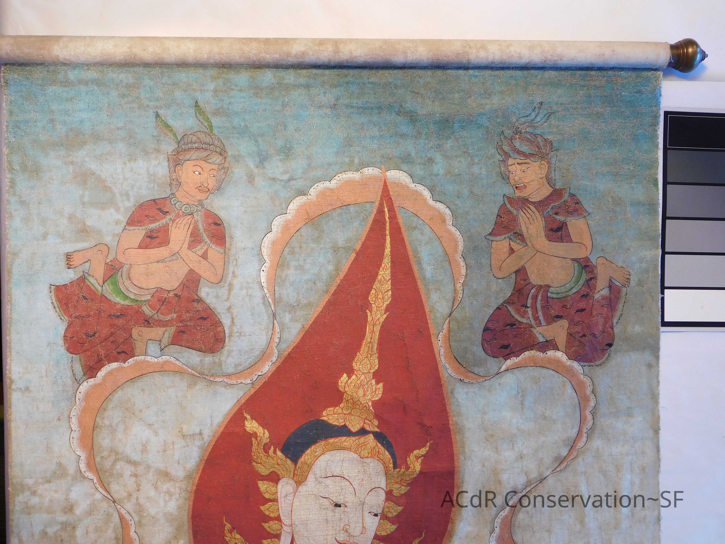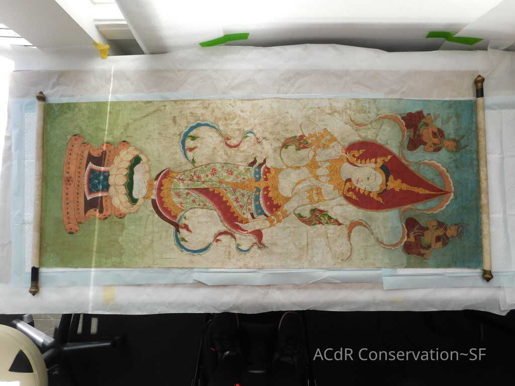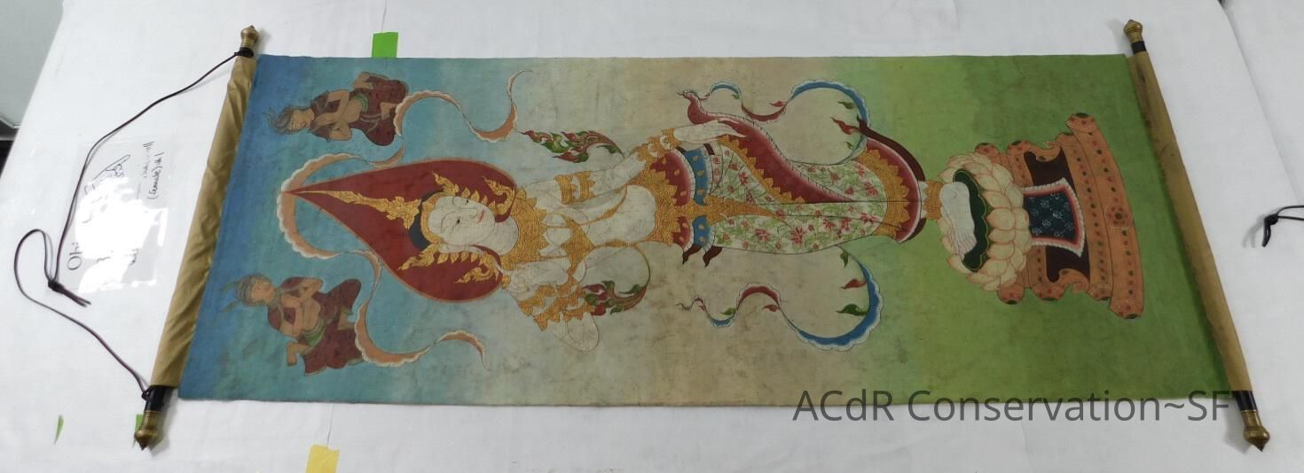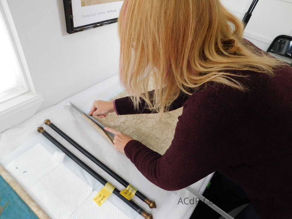 Began smoothing background appearance using wash of thinned watercolors to match what was completed on opposite scroll.