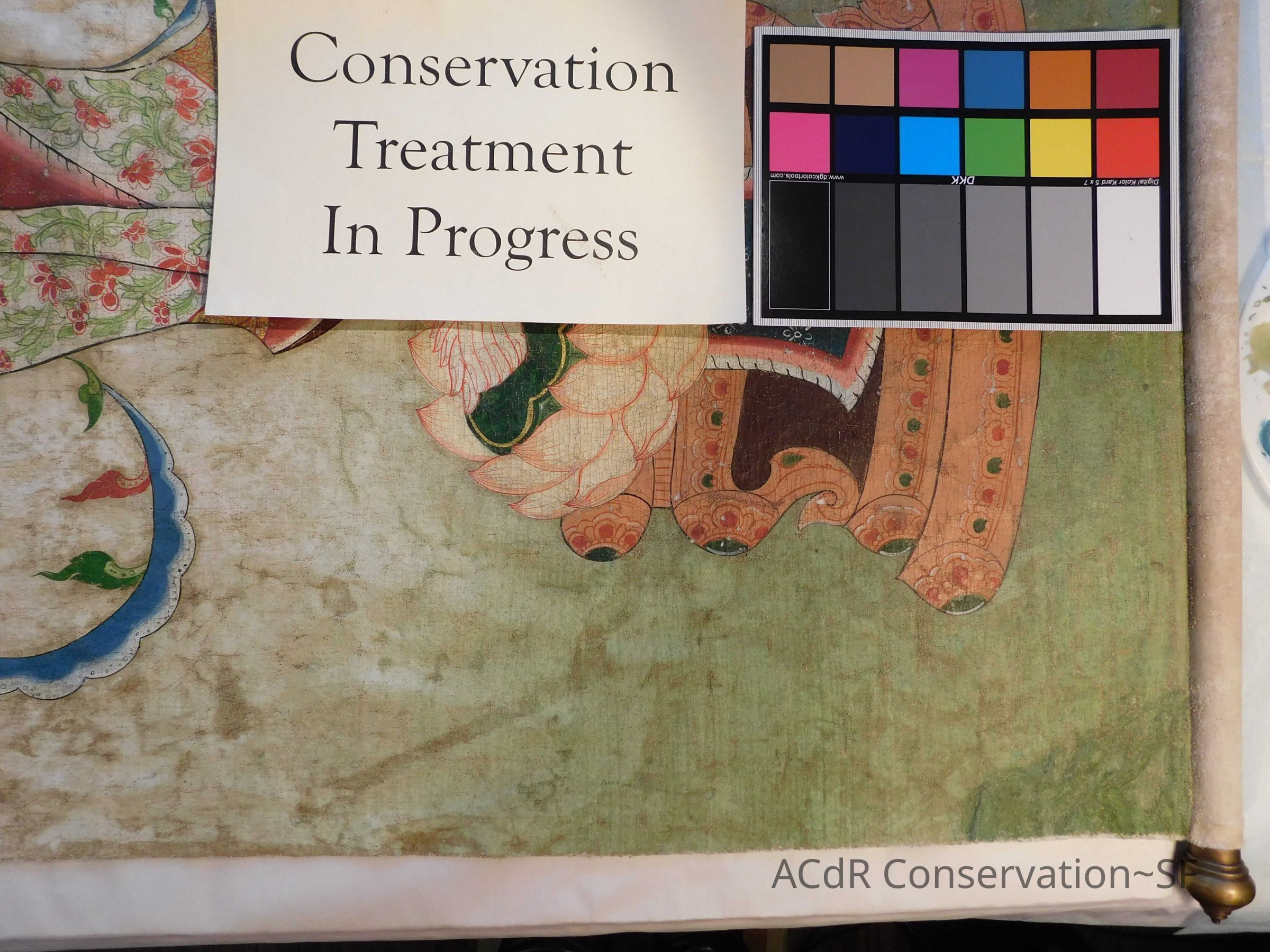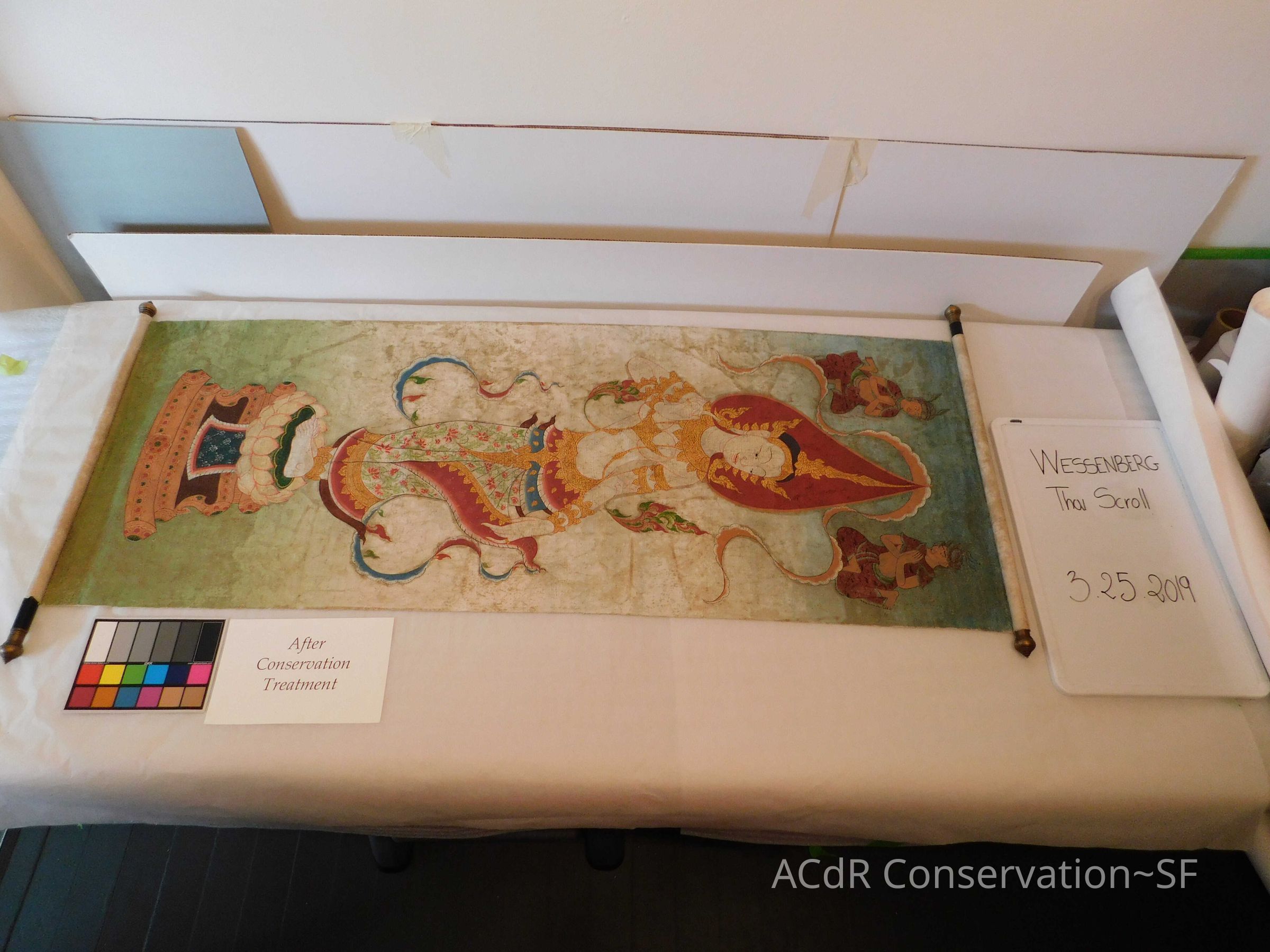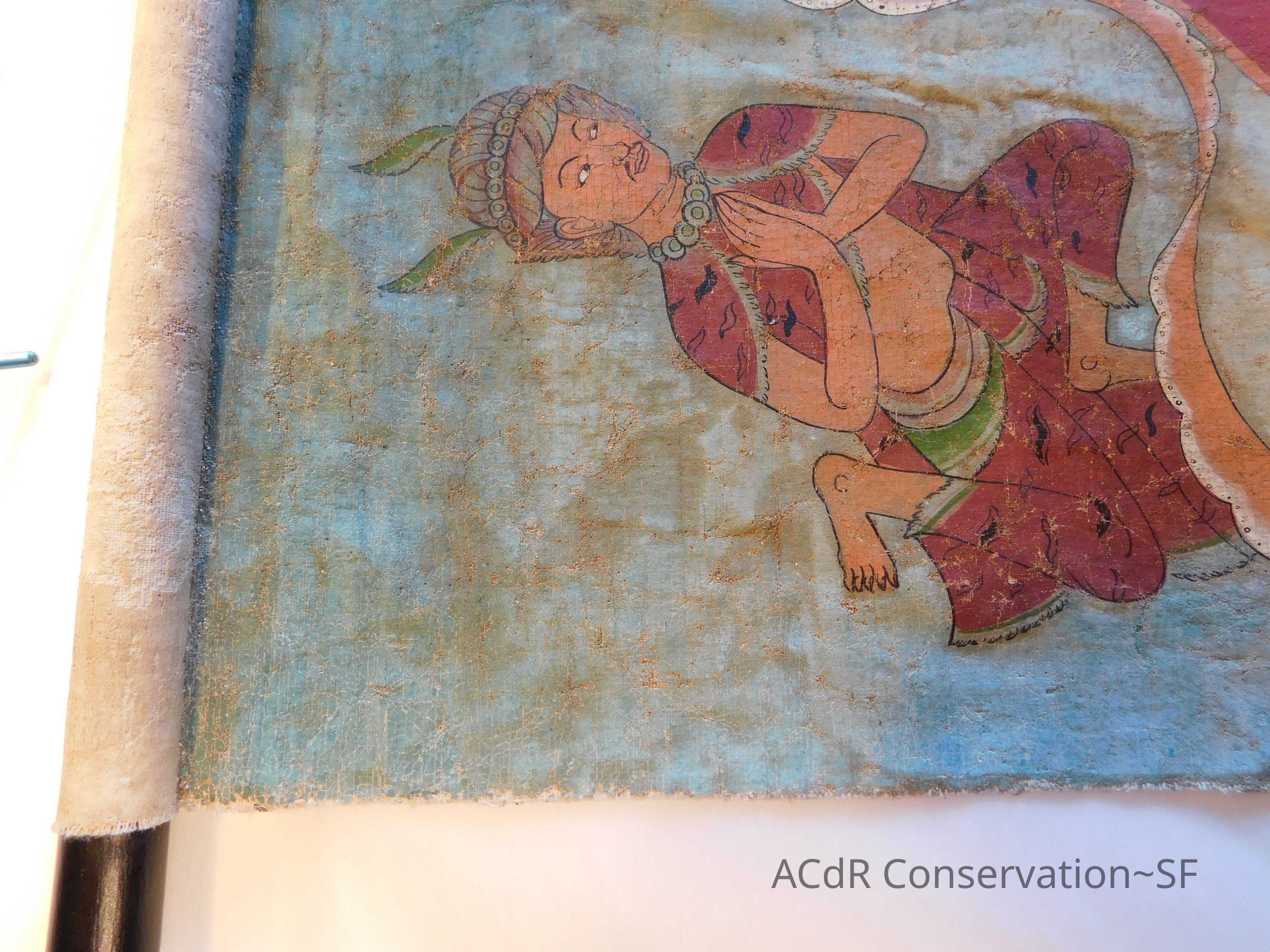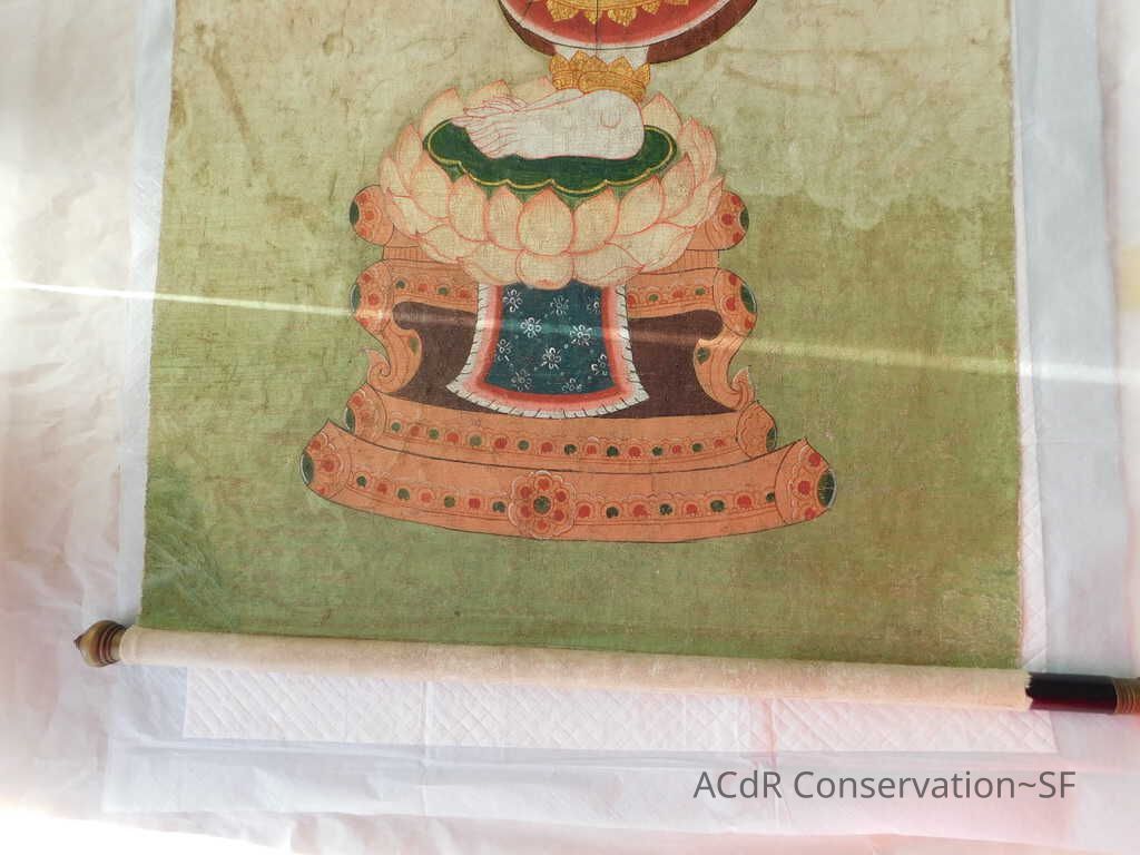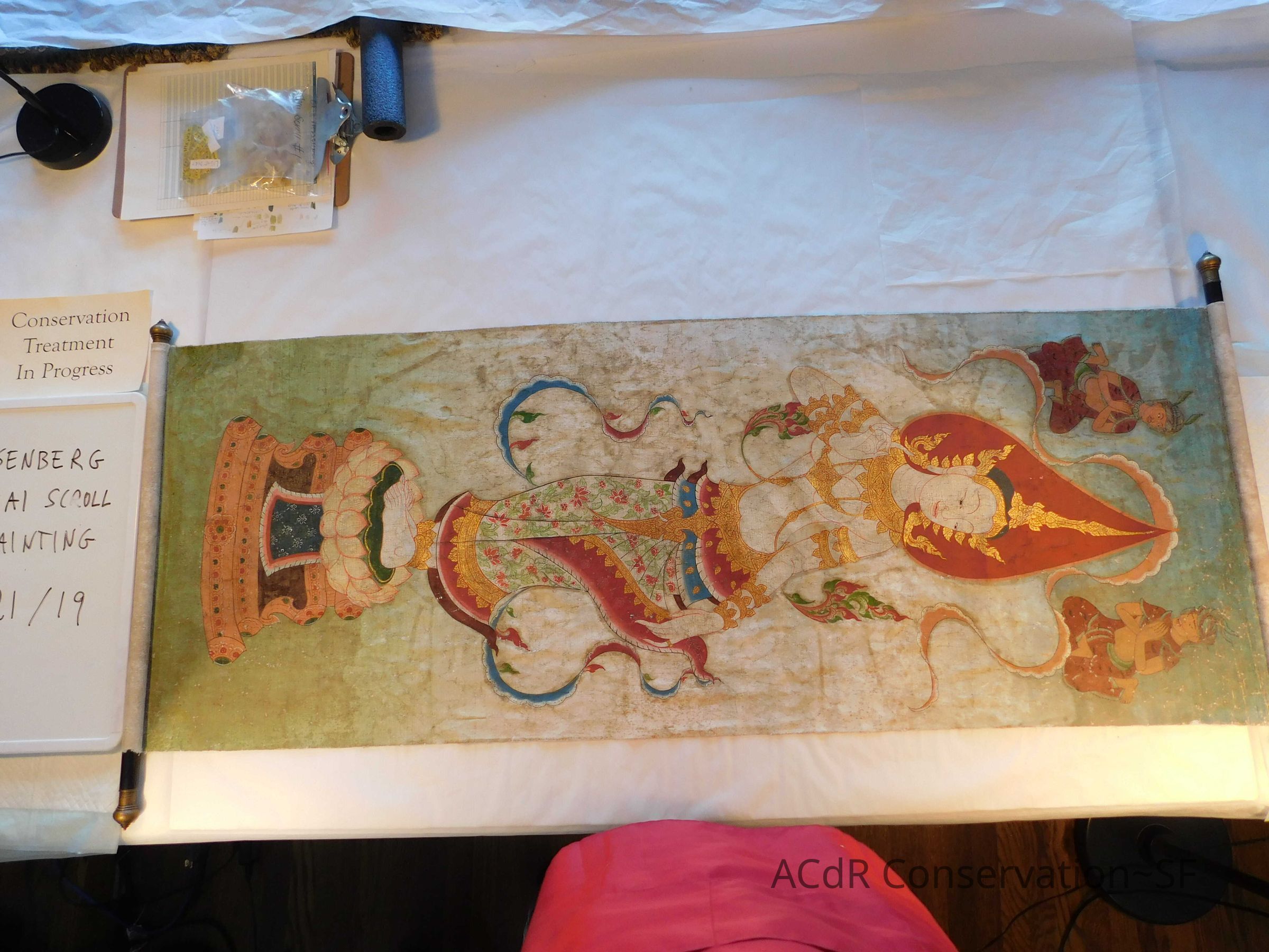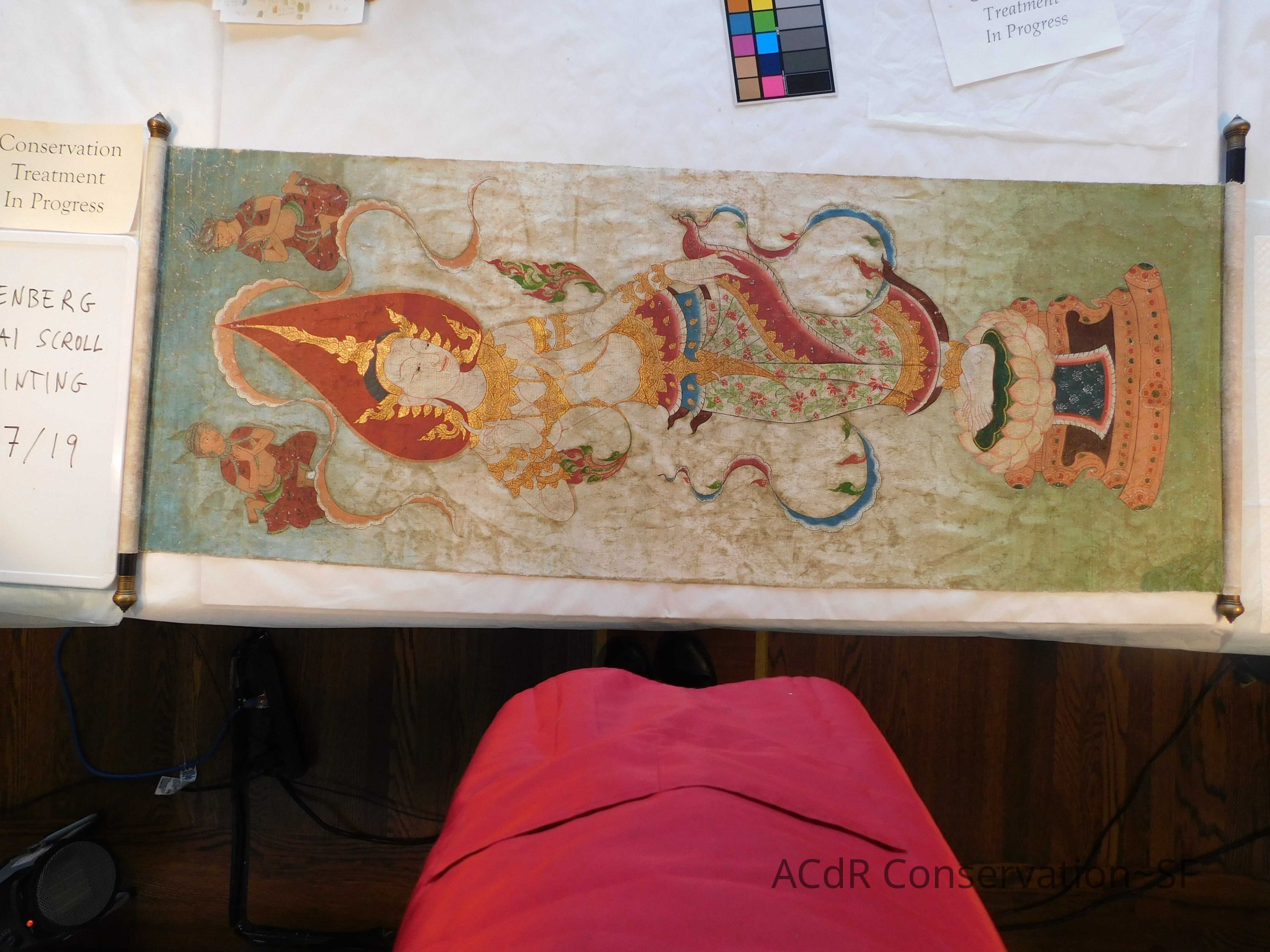 Began smoothing background appearance using wash of thinned watercolors to match what was completed on opposite scroll.