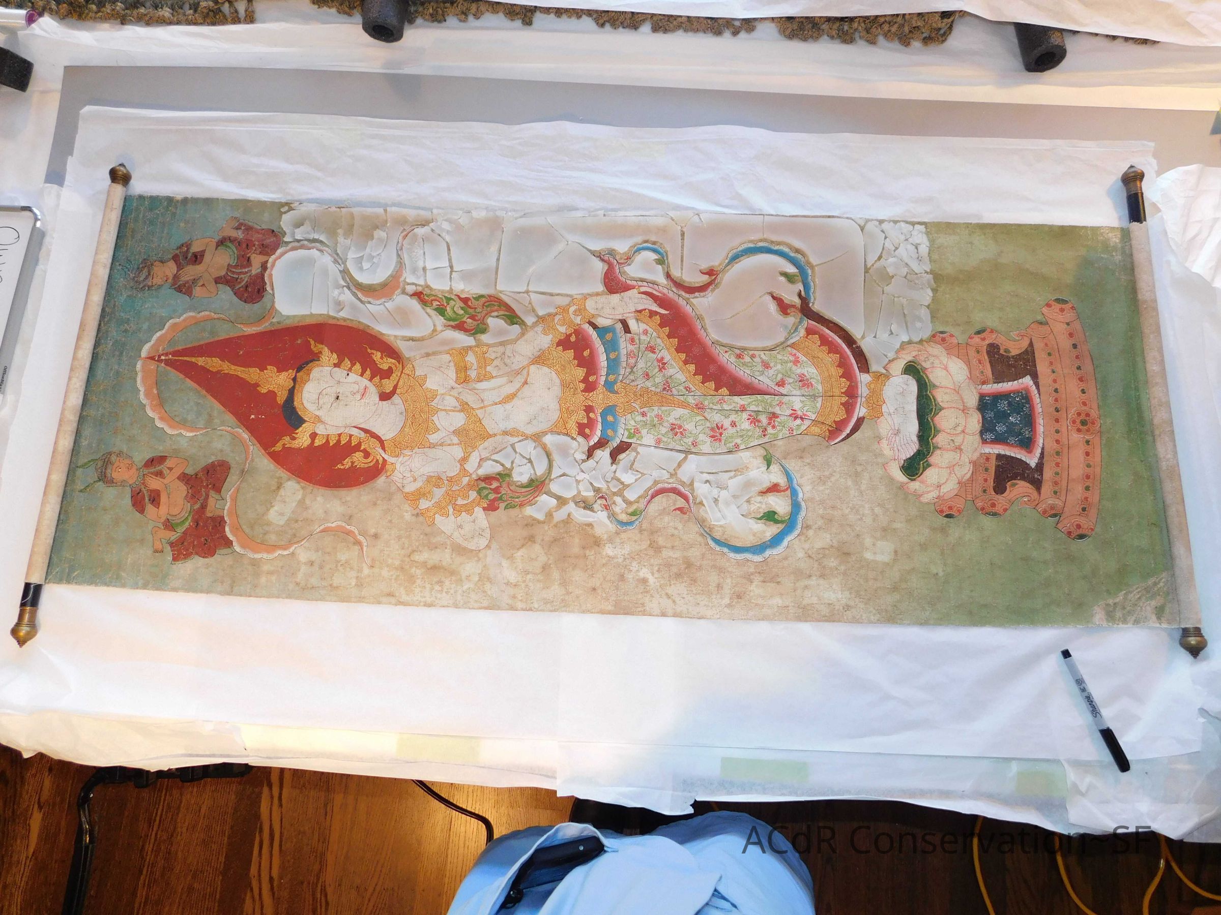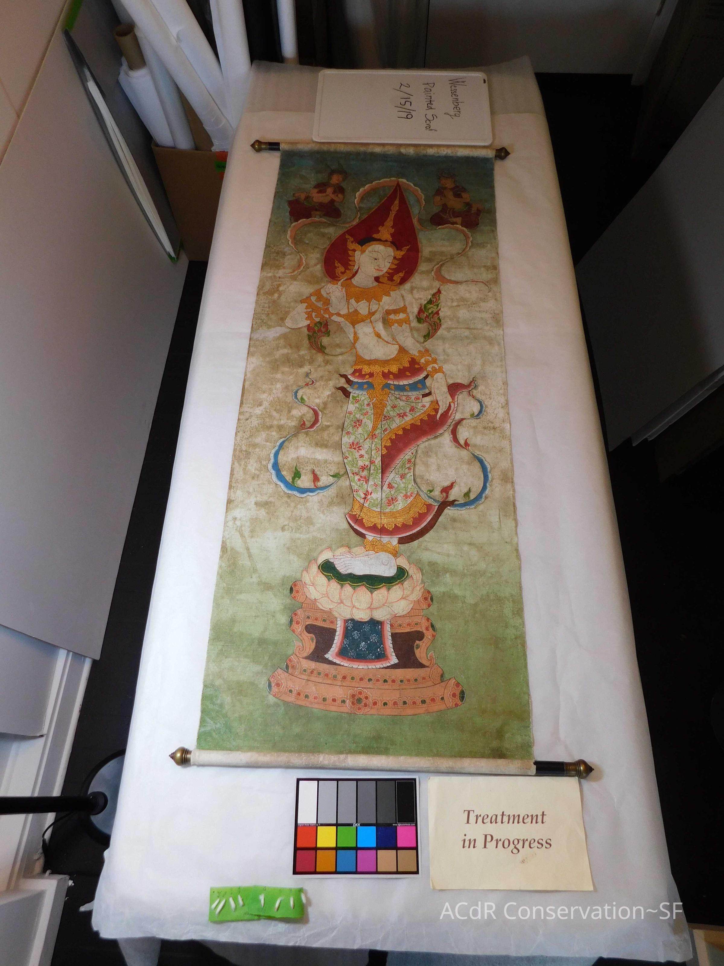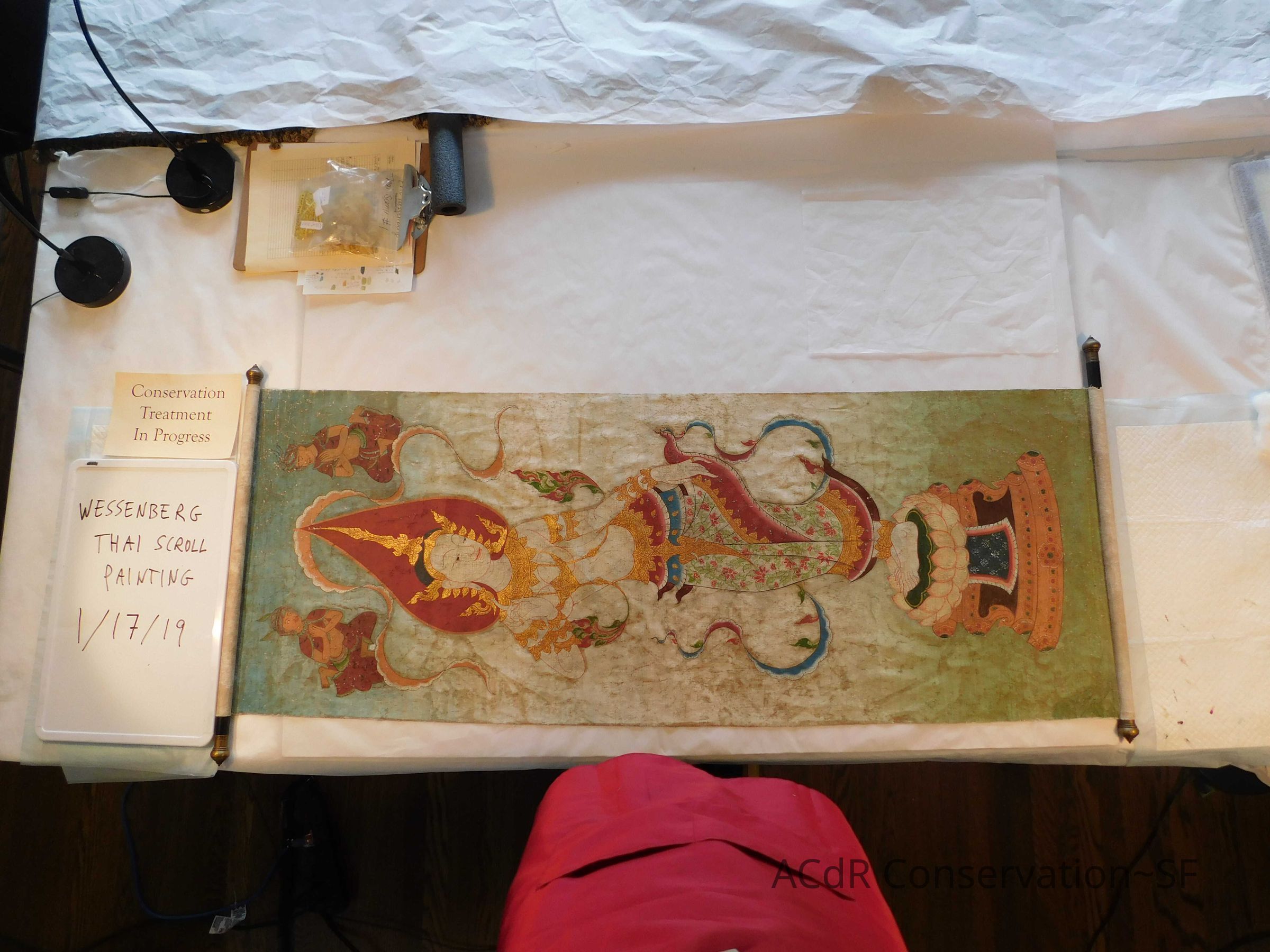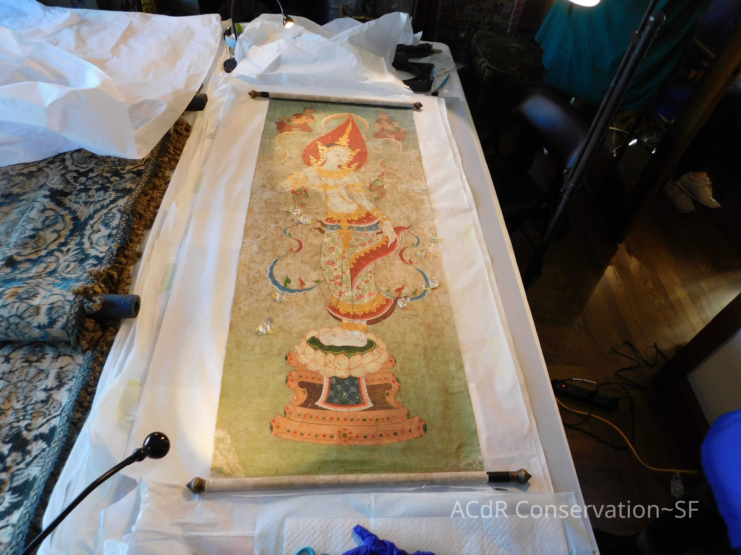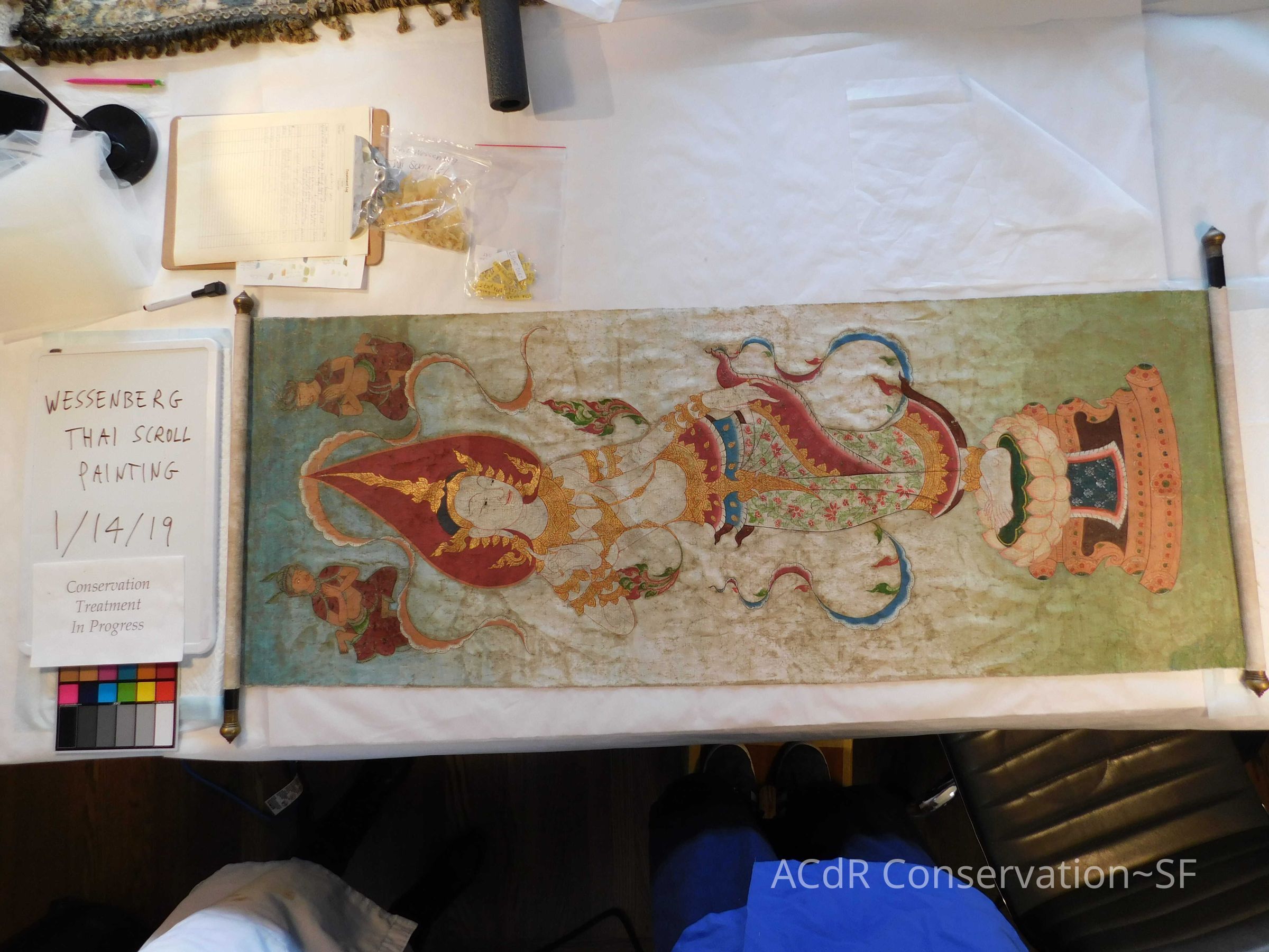 Began smoothing background appearance using wash of thinned watercolors to match what was completed on opposite scroll.